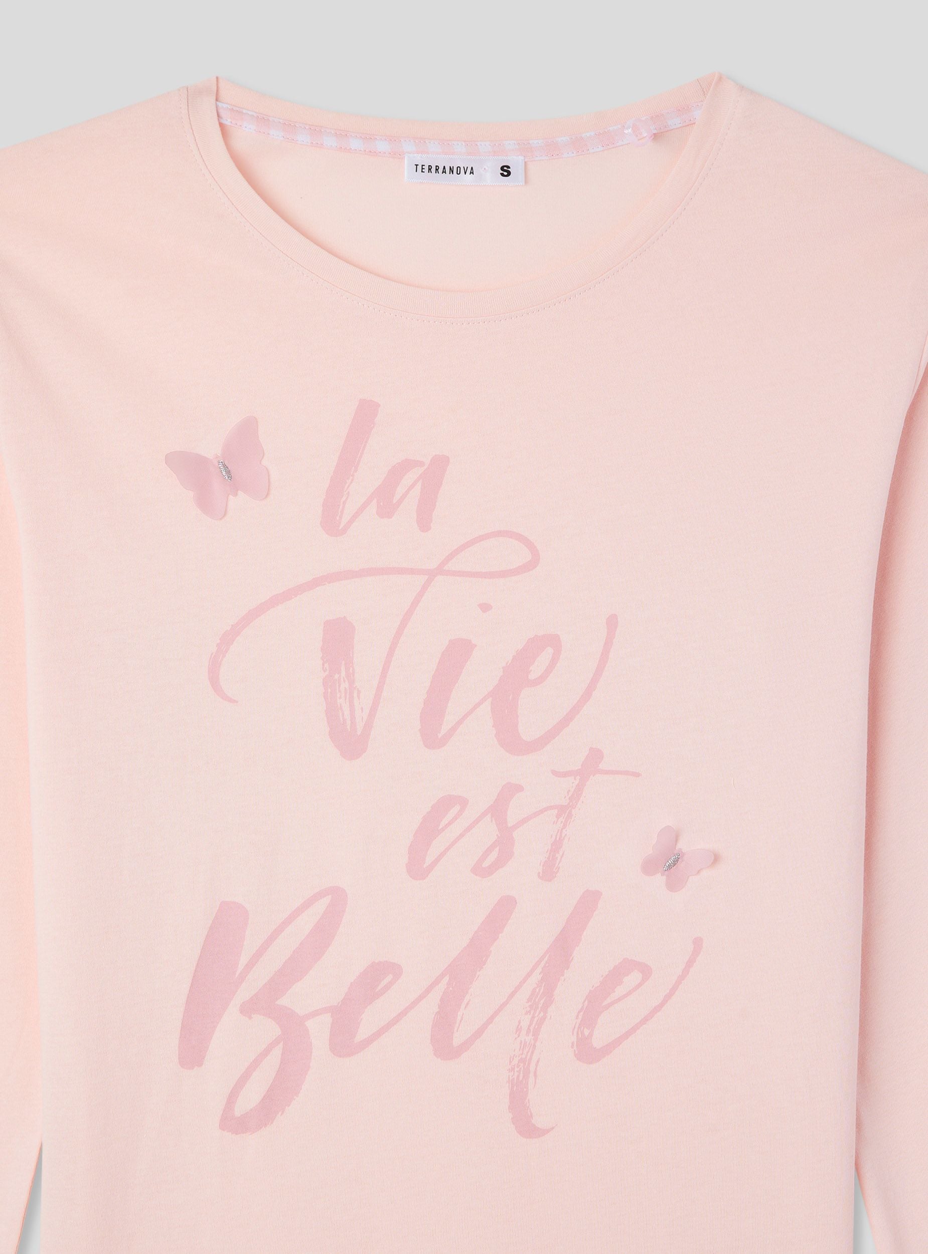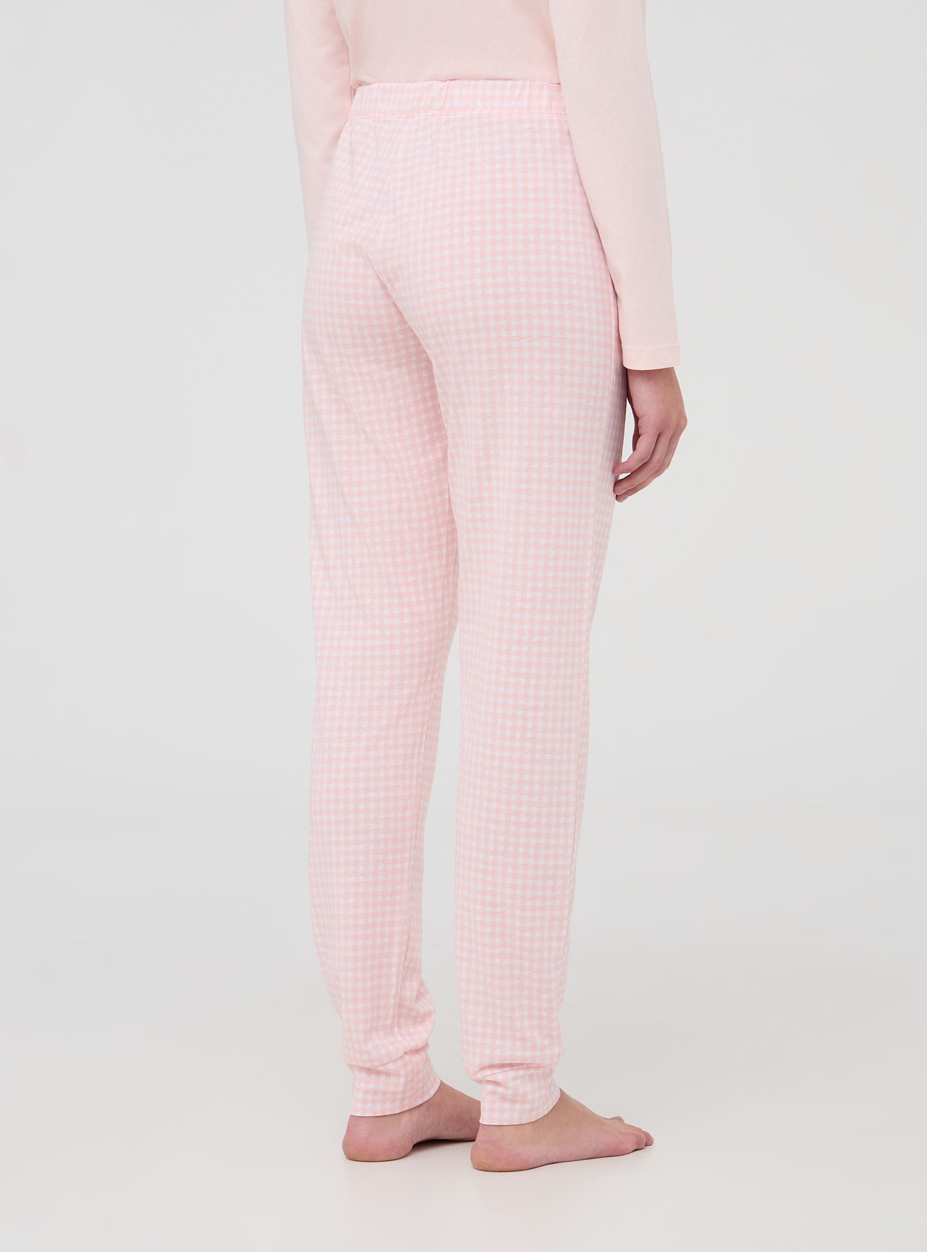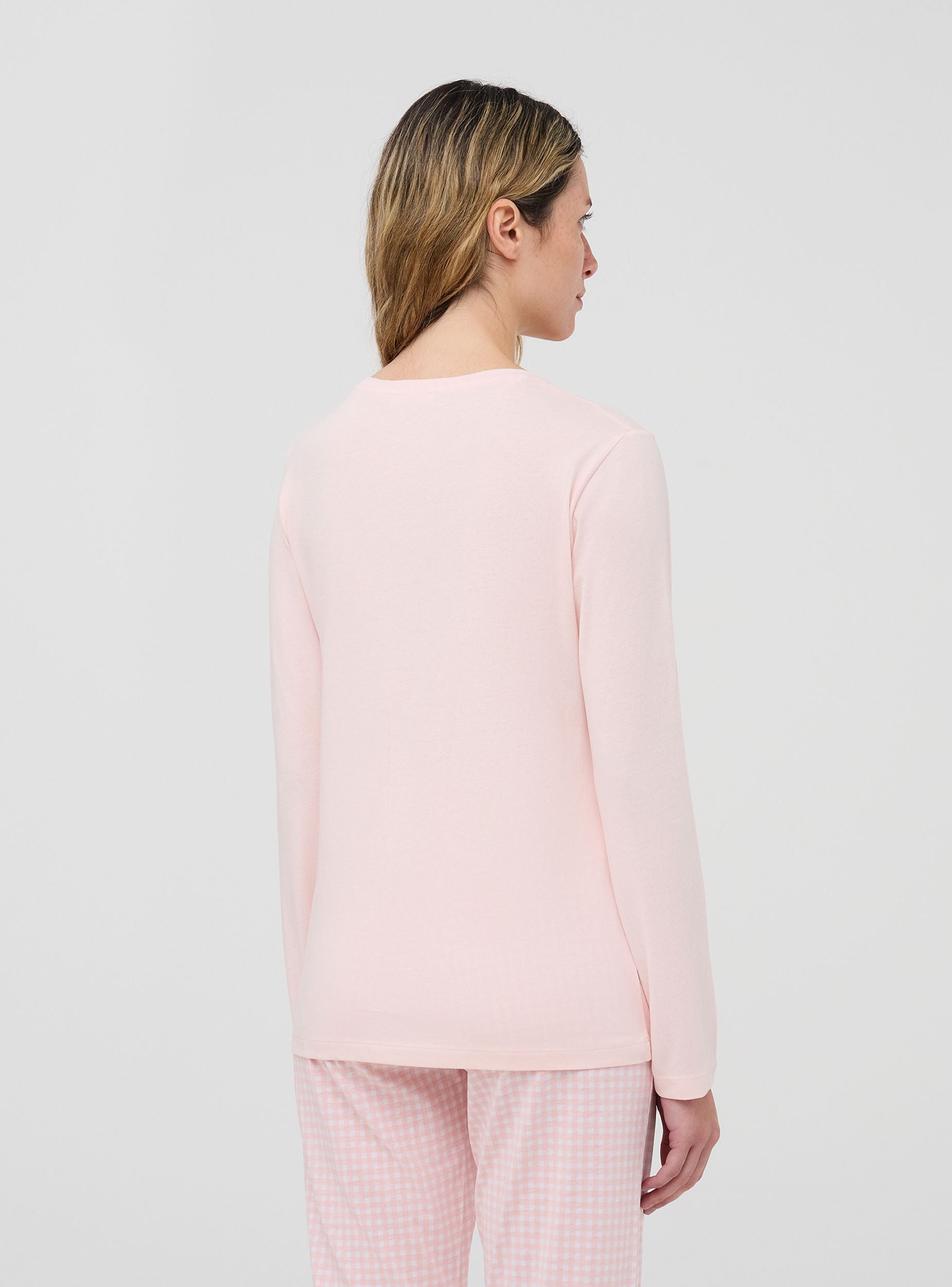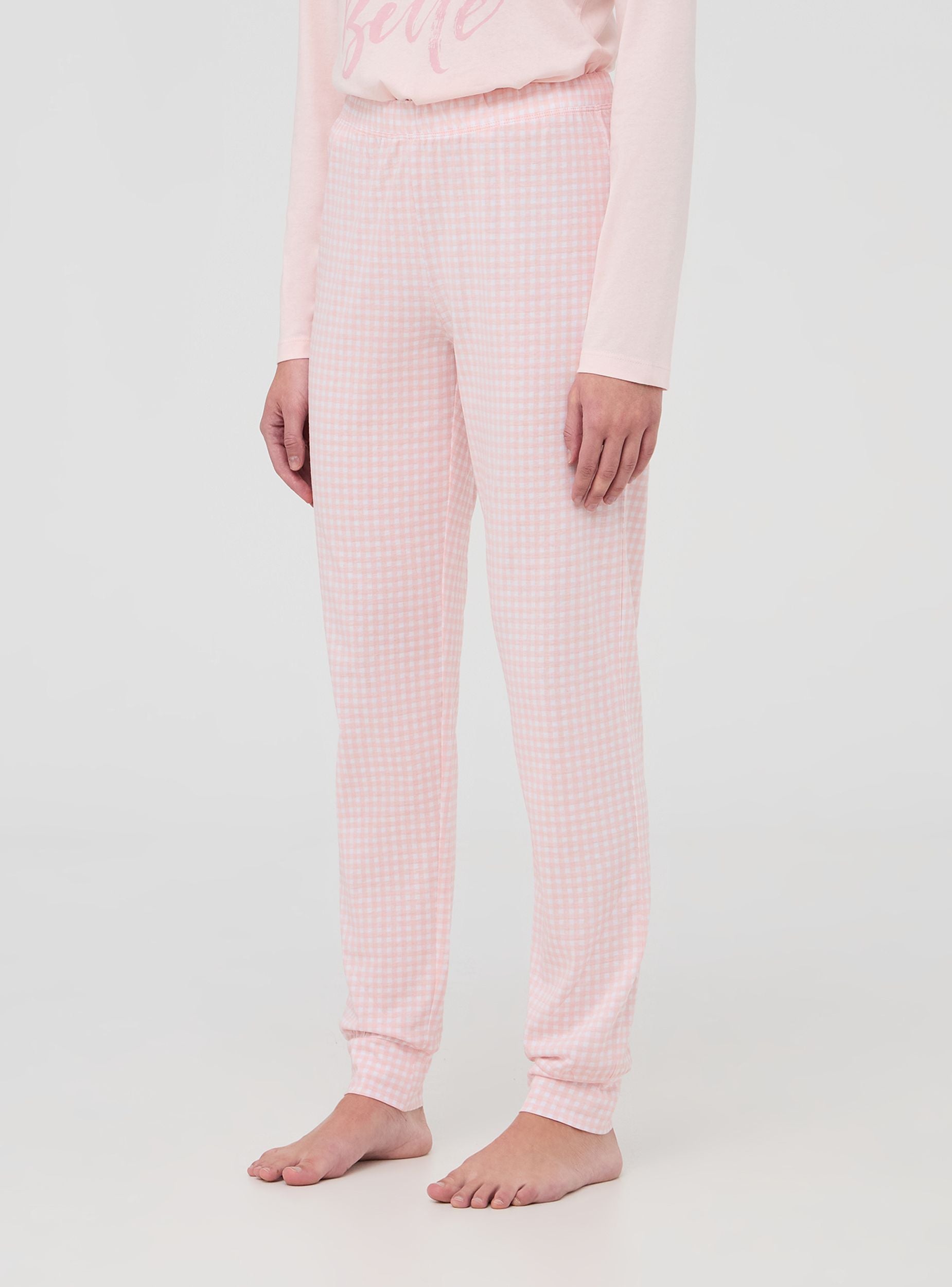 Pigiama da donna composto da una maglia a maniche lunghe con girocollo e scritta decorativa sul davanti, dal carattere romantico e delicato. I pantaloni abbinati presentano un motivo a quadretti, con vita elasticizzata e polsini al fondo per una vestibilità pratica e confortevole. Un set ideale per un look rilassato e femminile, perfetto per i momenti di riposo.Dettagli