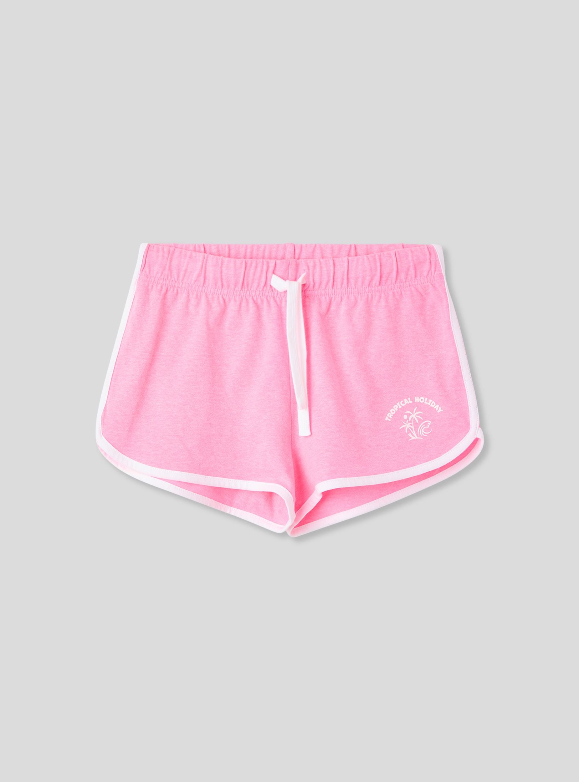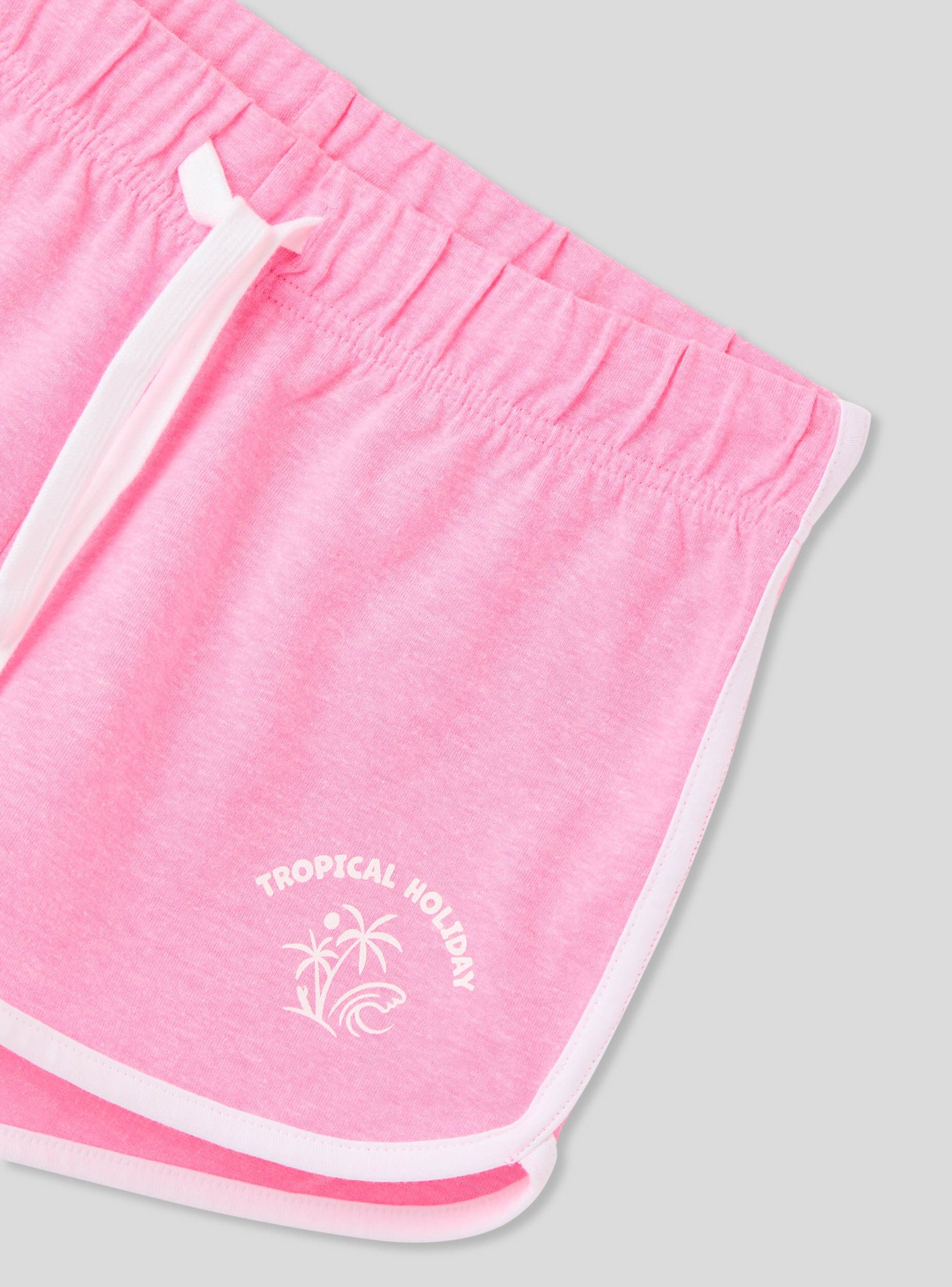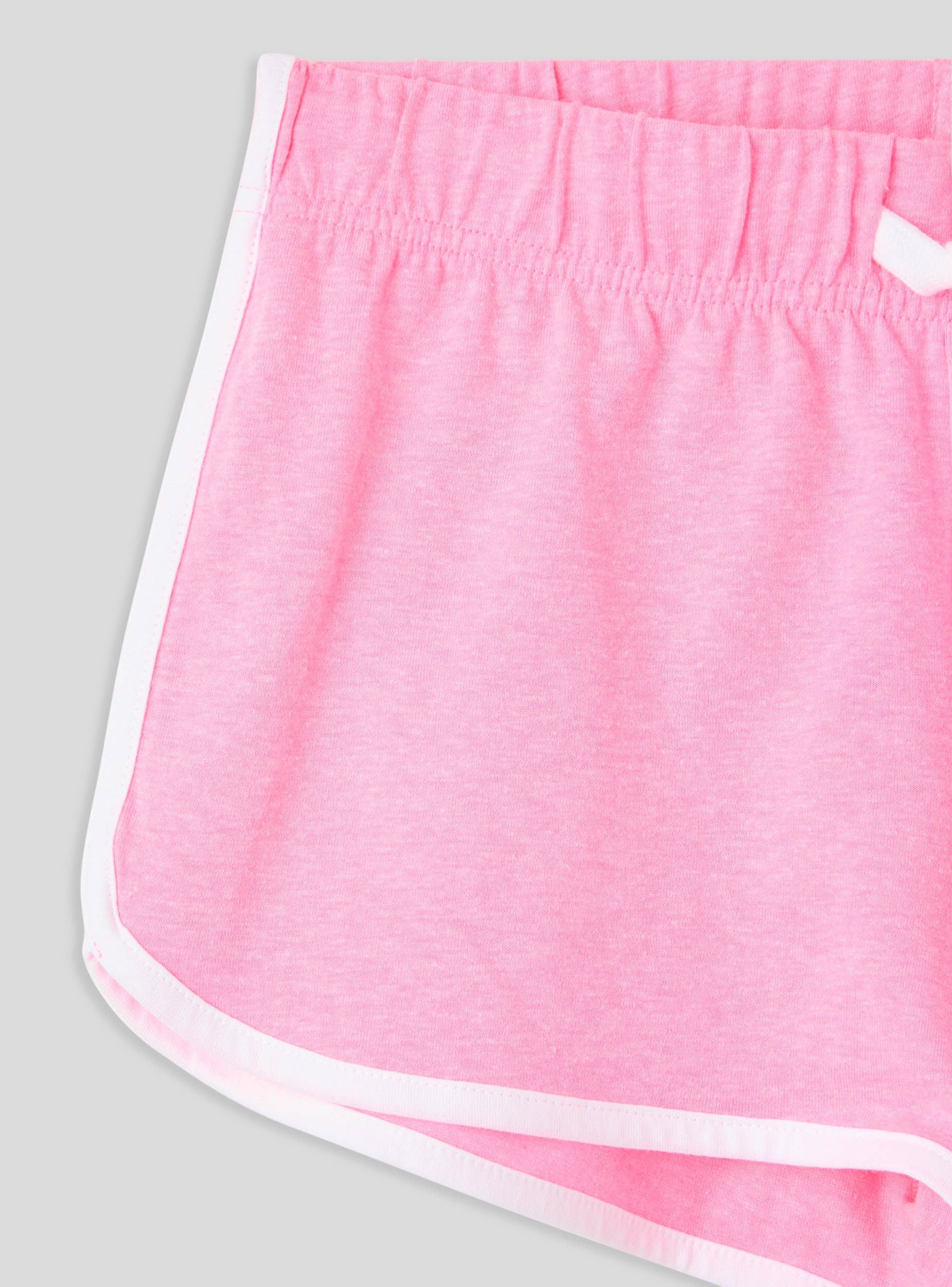 Pantaloncini da bambina con una vivace stampa frontale, caratterizzati da un design semplice e pratico. Il modello presenta una comoda coulisse in vita per una vestibilità regolabile, ideale per il massimo comfort durante il gioco o le attività quotidiane. I profili a contrasto lungo i bordi donano un tocco di stile, rendendo il capo più dinamico e adatto ad abbinamenti casual. Il taglio corto e la linea morbida garantiscono libertà di movimento, perfetti per le giornate estive.Dettagli