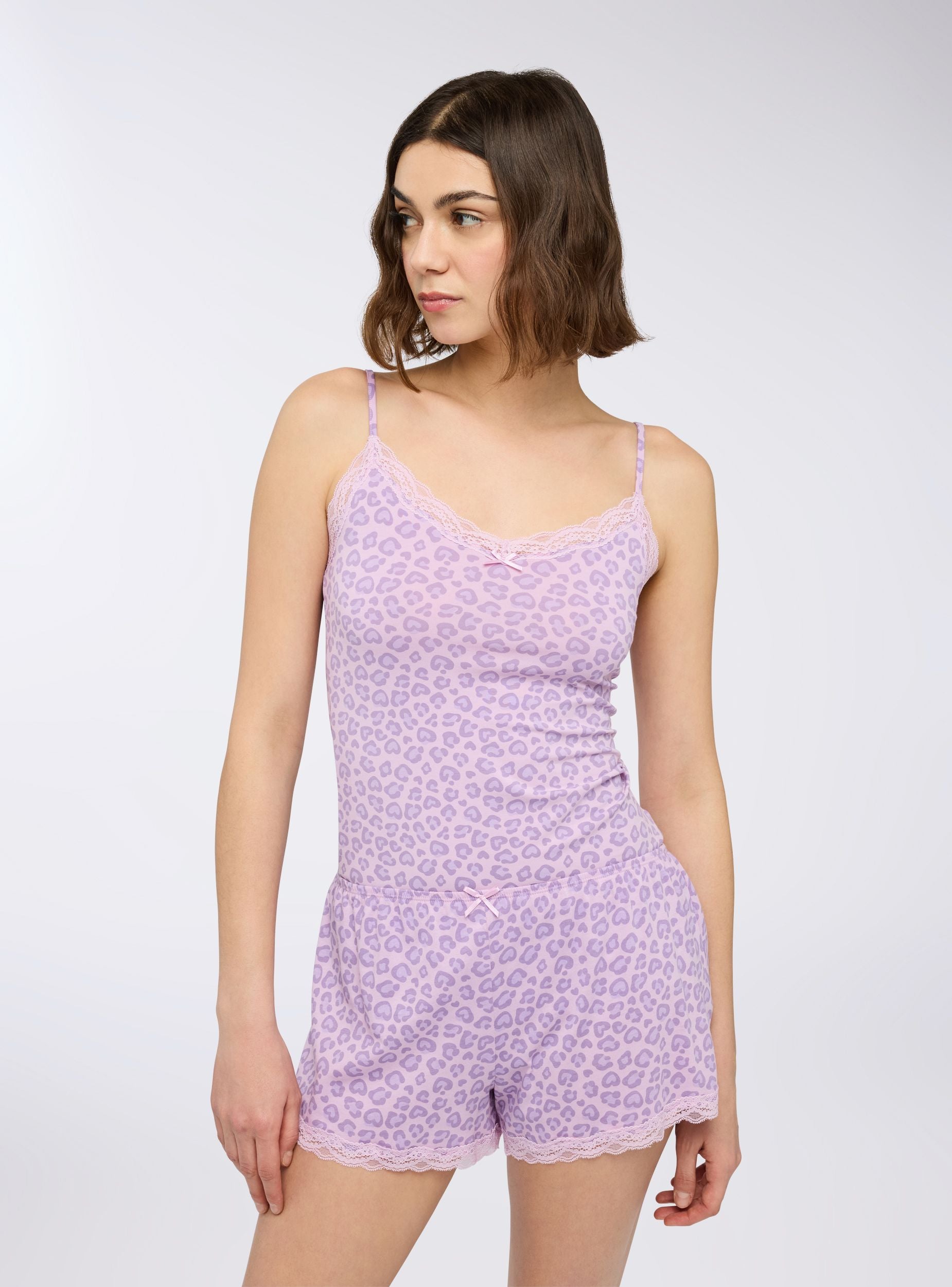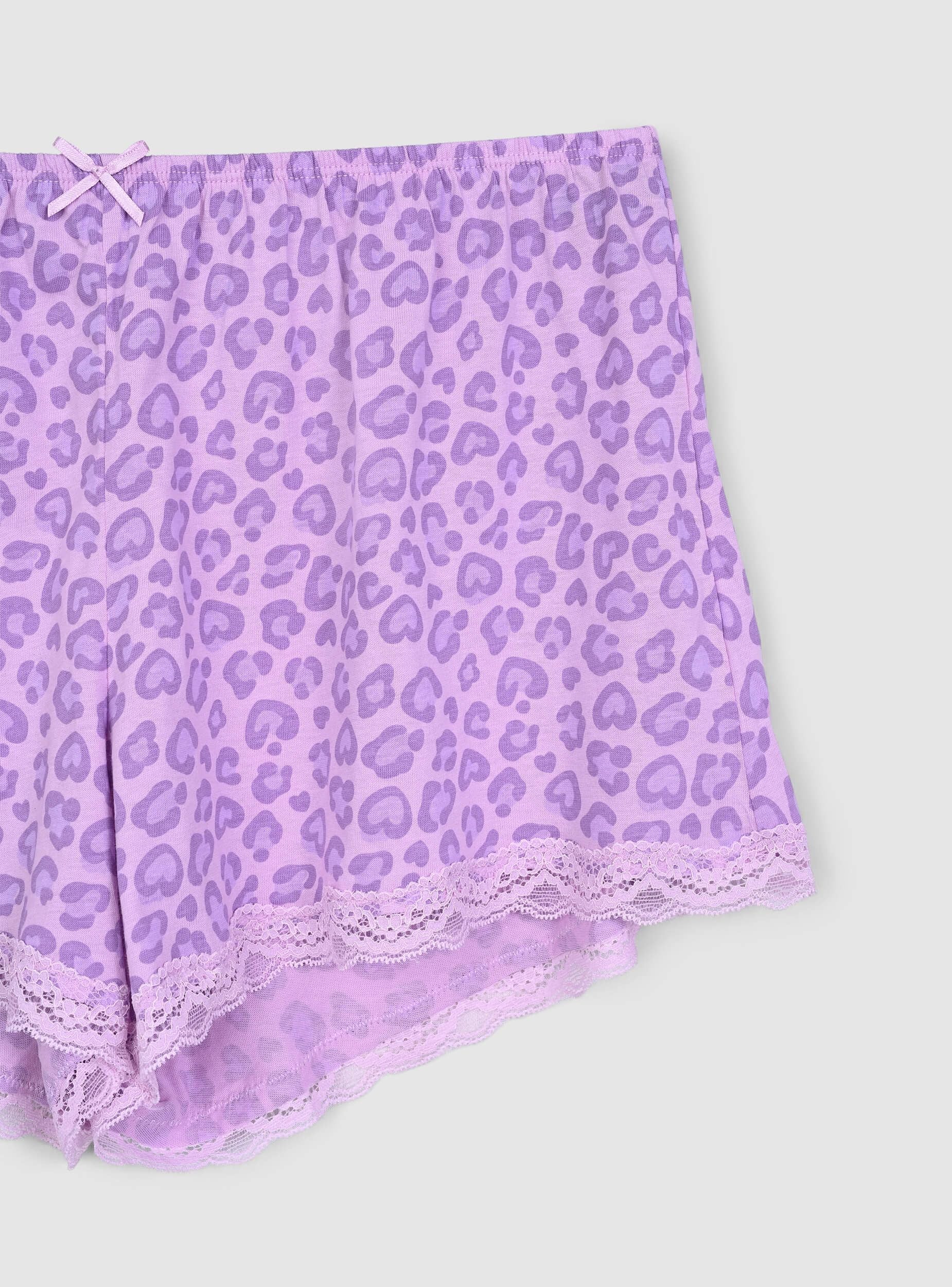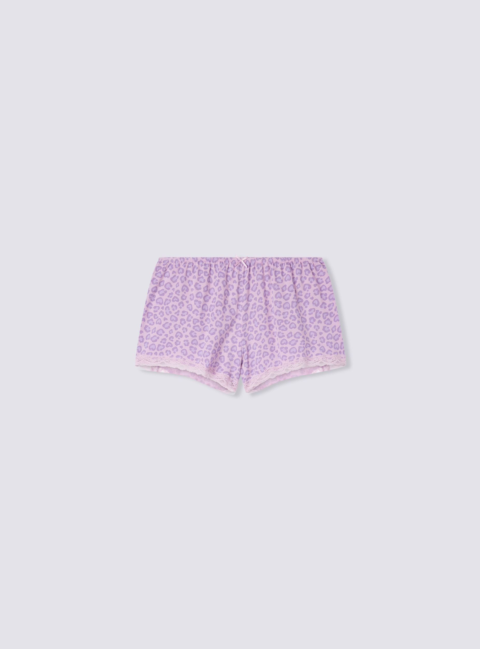 Pantaloncini del pigiama da donna dal taglio corto, perfetti per un look femminile e accattivante. Caratterizzati da una vivace stampa maculata, aggiungono un tocco di grinta al design. Il delicato bordo in pizzo esalta la raffinatezza del capo, mentre il piccolo fiocchetto in vita dona un dettaglio romantico e curato. Ideali per chi cerca comfort e stile, unendo sensualità e morbidezza nei momenti di relax.