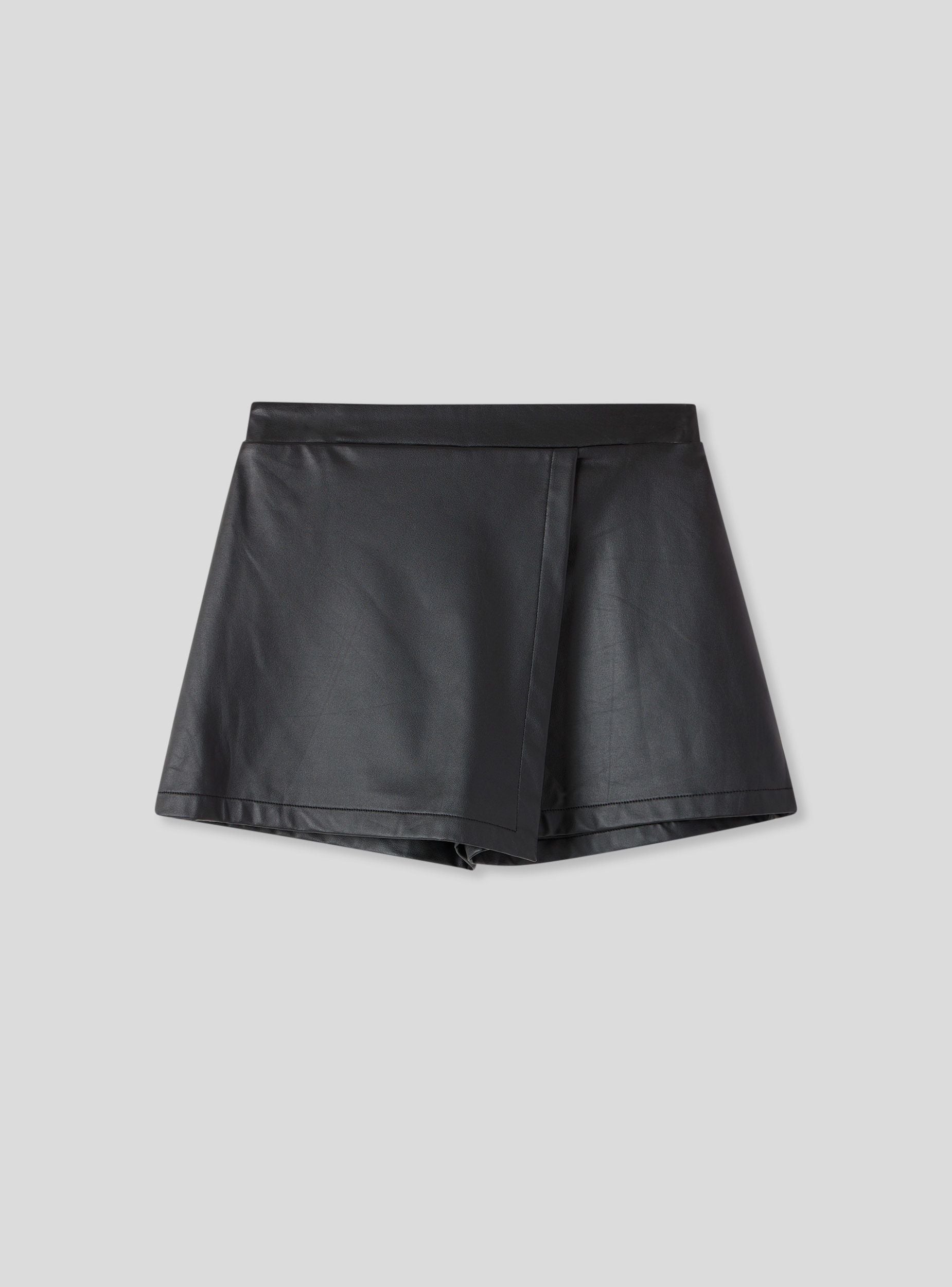 Pantaloncini-gonna da bambina ideali per look moderni e versatili. Il design corto e la linea pulita li rendono perfetti per abbinamenti con t-shirt o maglie. La vestibilità regolare assicura comfort nei movimenti, mentre la similpelle a tinta unita valorizza la semplicità del capo. Un'opzione trendy per outfit quotidiani o occasioni informali.Dettagli