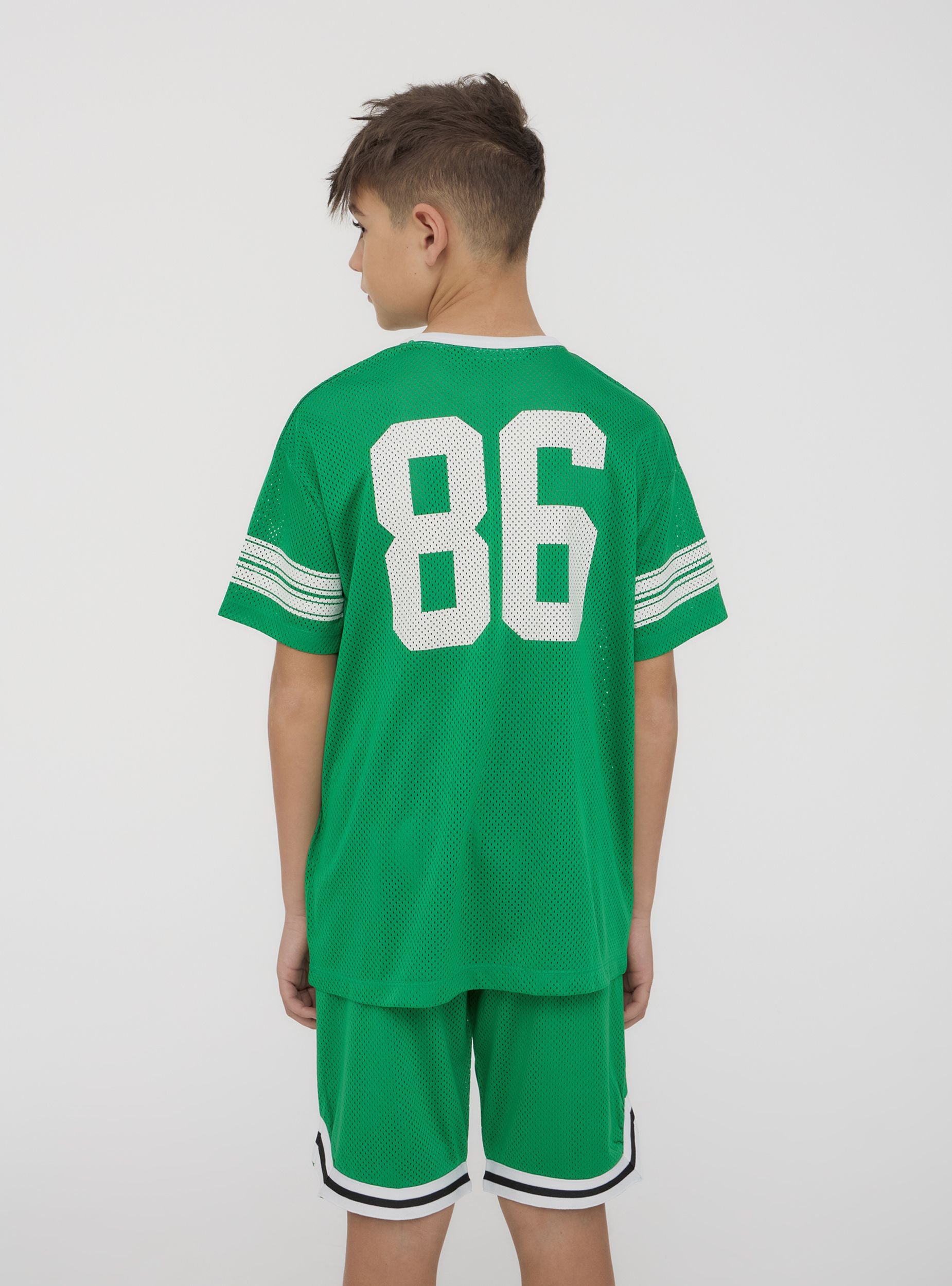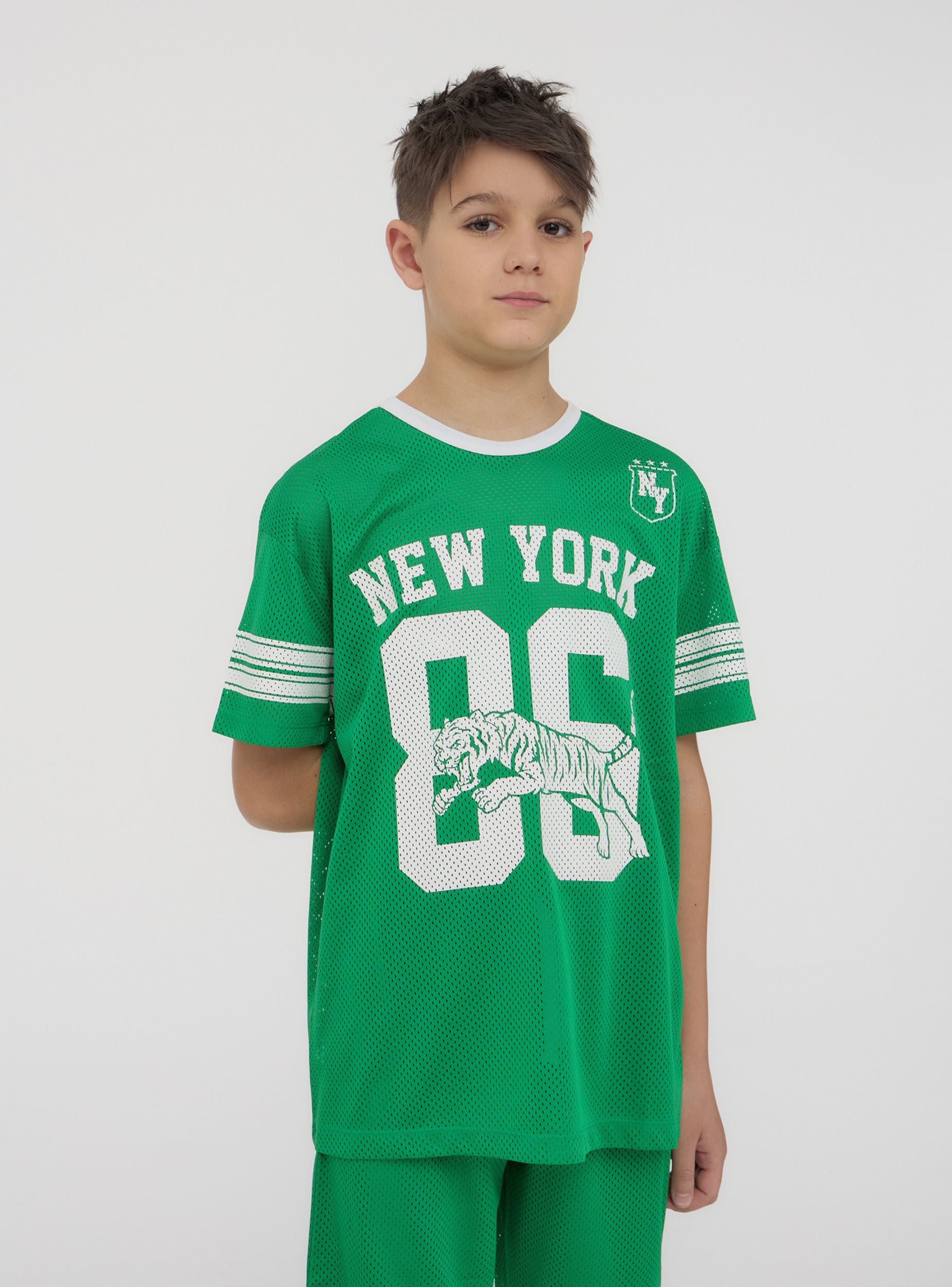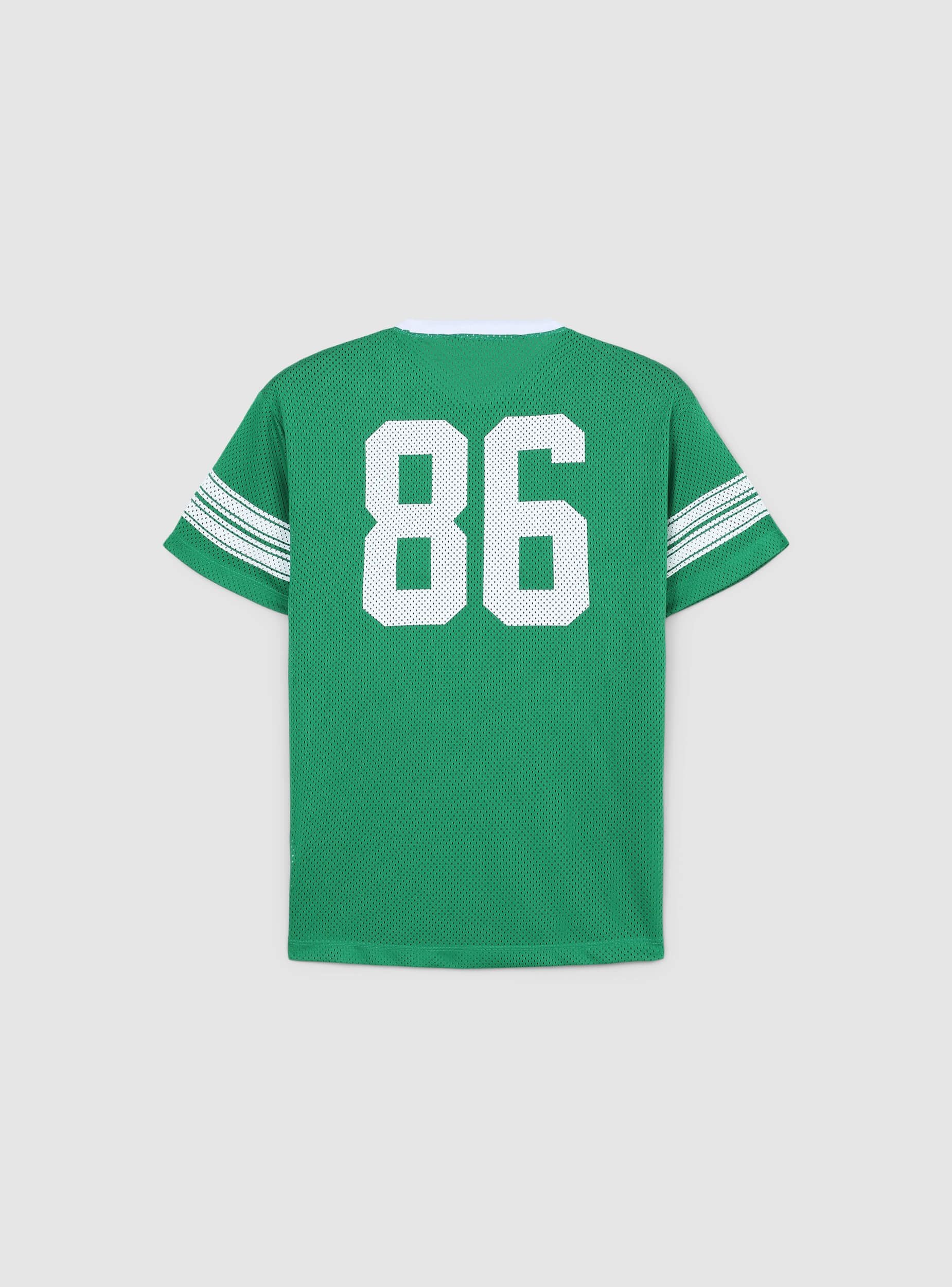 Maglietta da bambino ideale per un look sportivo e dinamico, perfetta per il tempo libero o per attività all'aperto. Caratterizzata da una vestibilità regolare, presenta una stampa grafica accattivante e dettagli a righe sulle maniche. Un capo versatile e comodo per ogni occasione casual.Dettagli