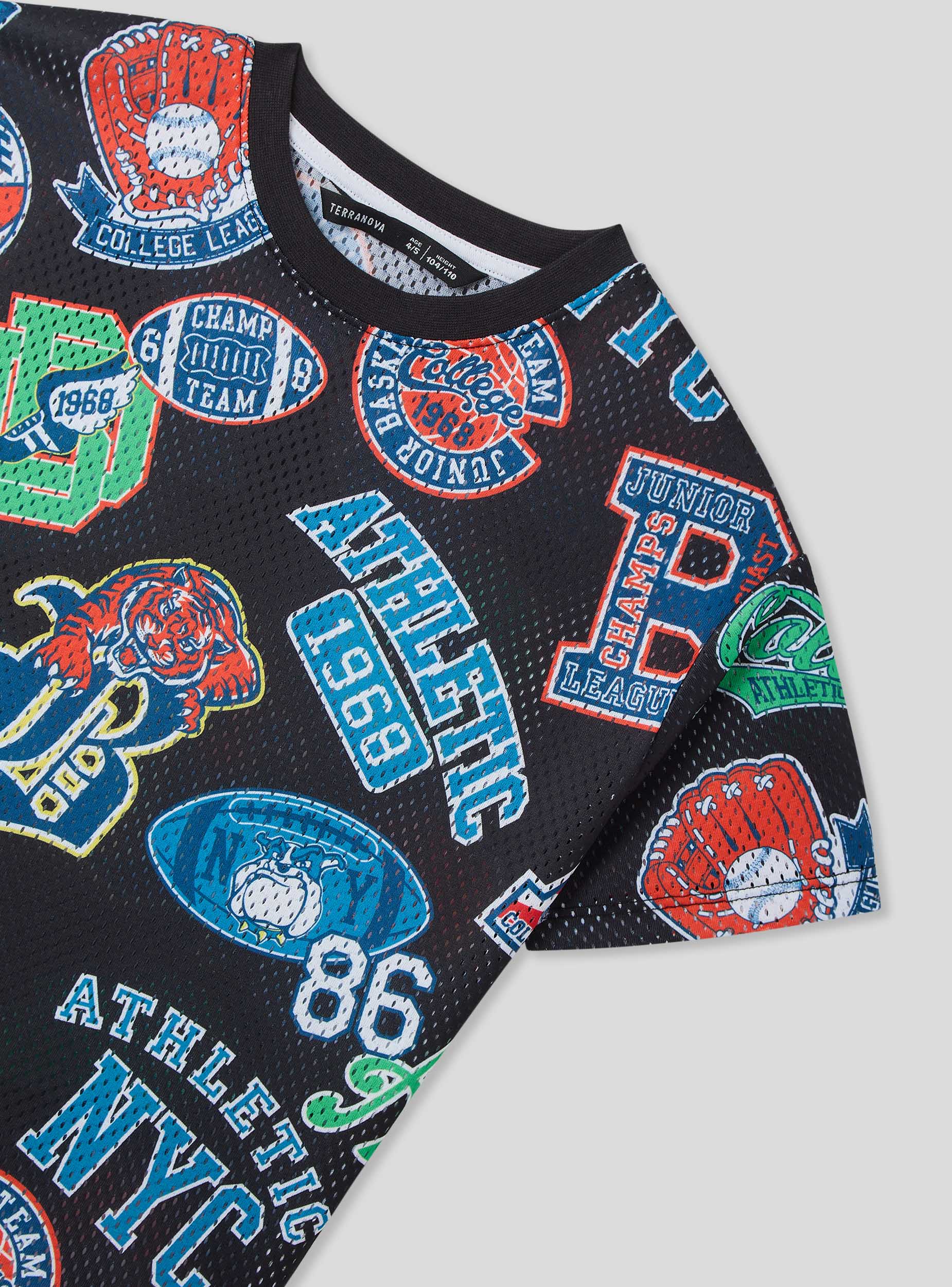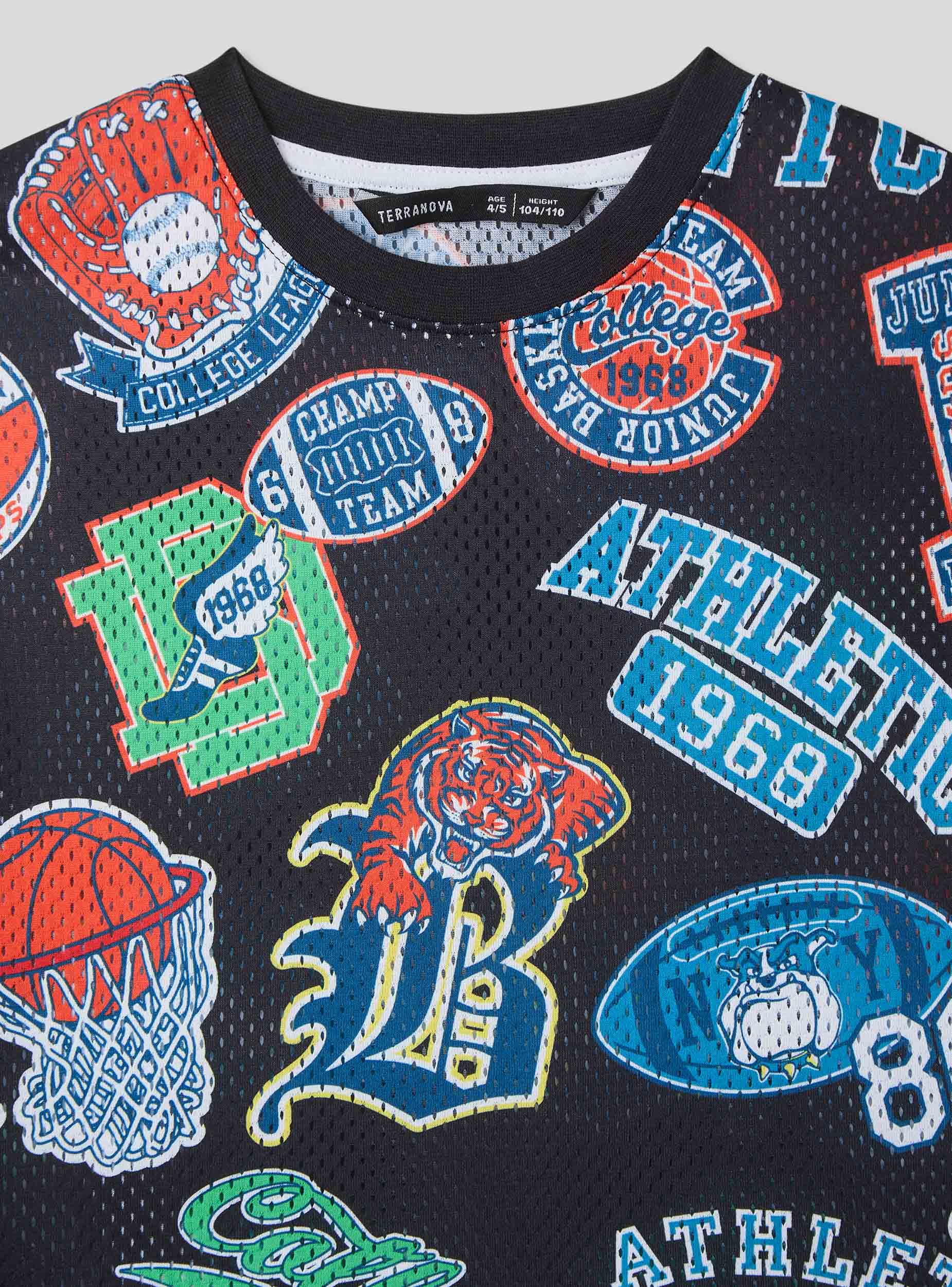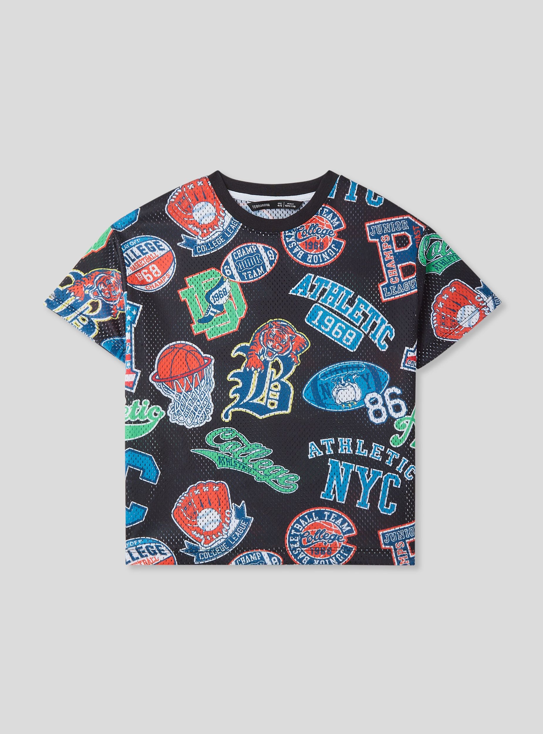 Maglietta da bambino dallo stile sportivo e grintoso, perfetta per un look dinamico e alla moda. Il modello con maniche corte e girocollo offre comfort e libertà di movimento, mentre il tessuto in rete aggiunge un tocco fresco. Le stampe ispirate al mondo dello sport donano un'energia unica, ideale per abbinamenti con jeans, joggers o shorts, perfetta per scuola, gioco e tempo libero.Dettagli