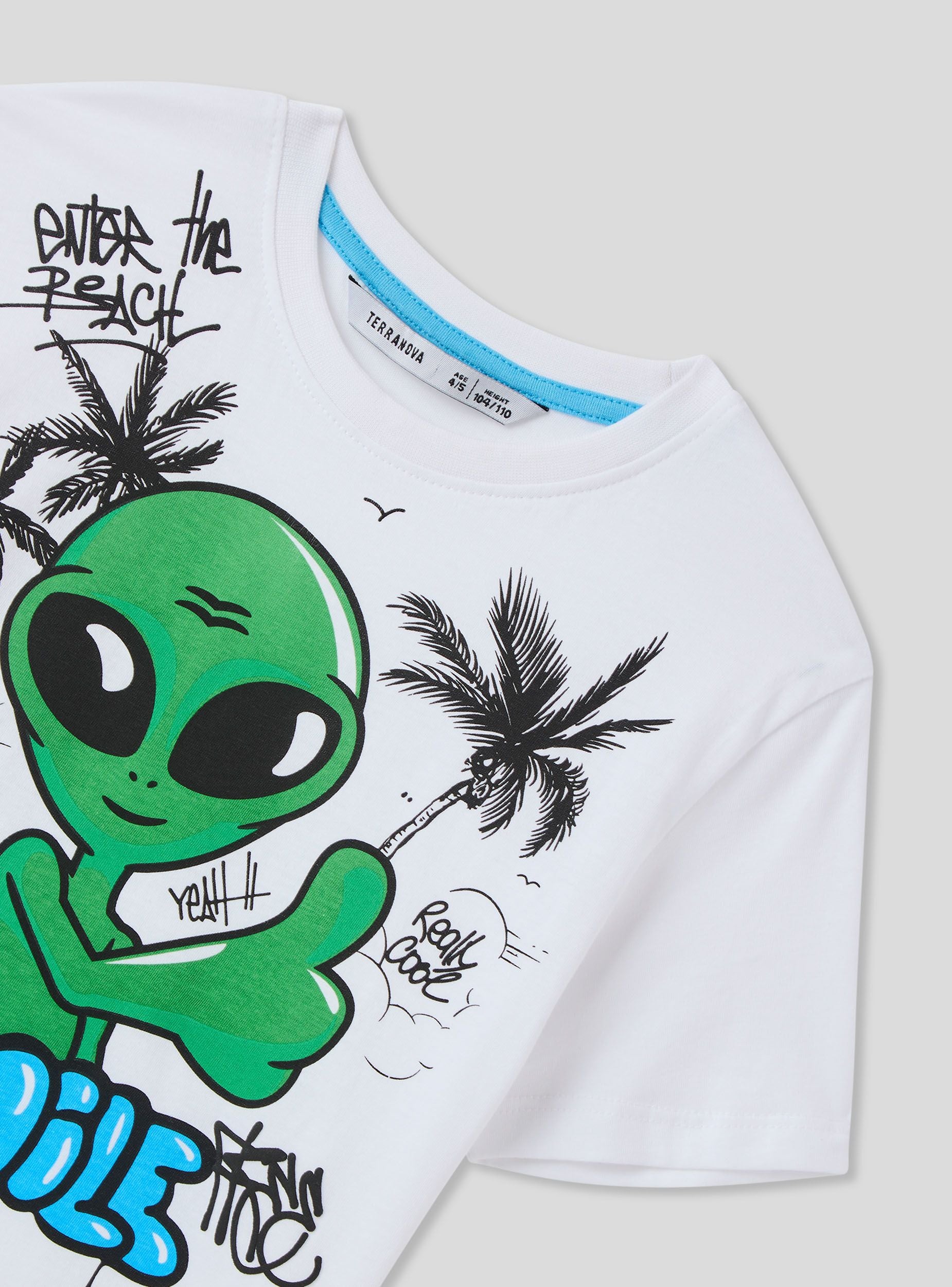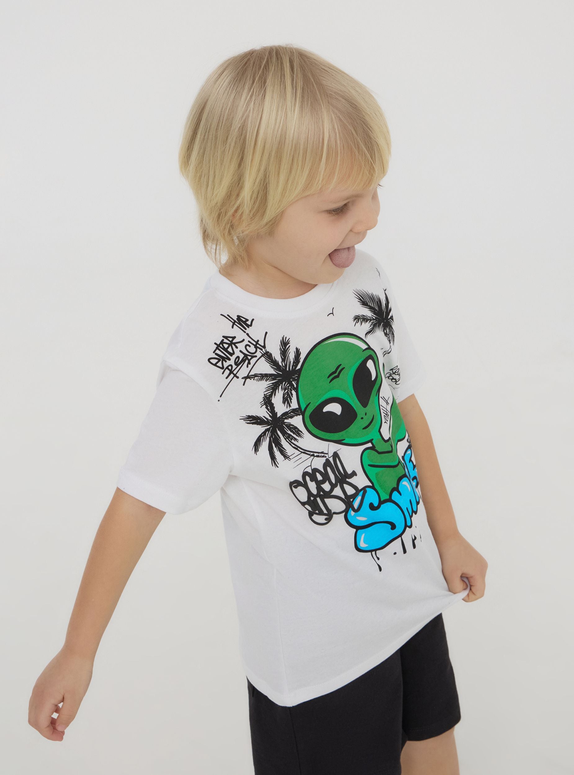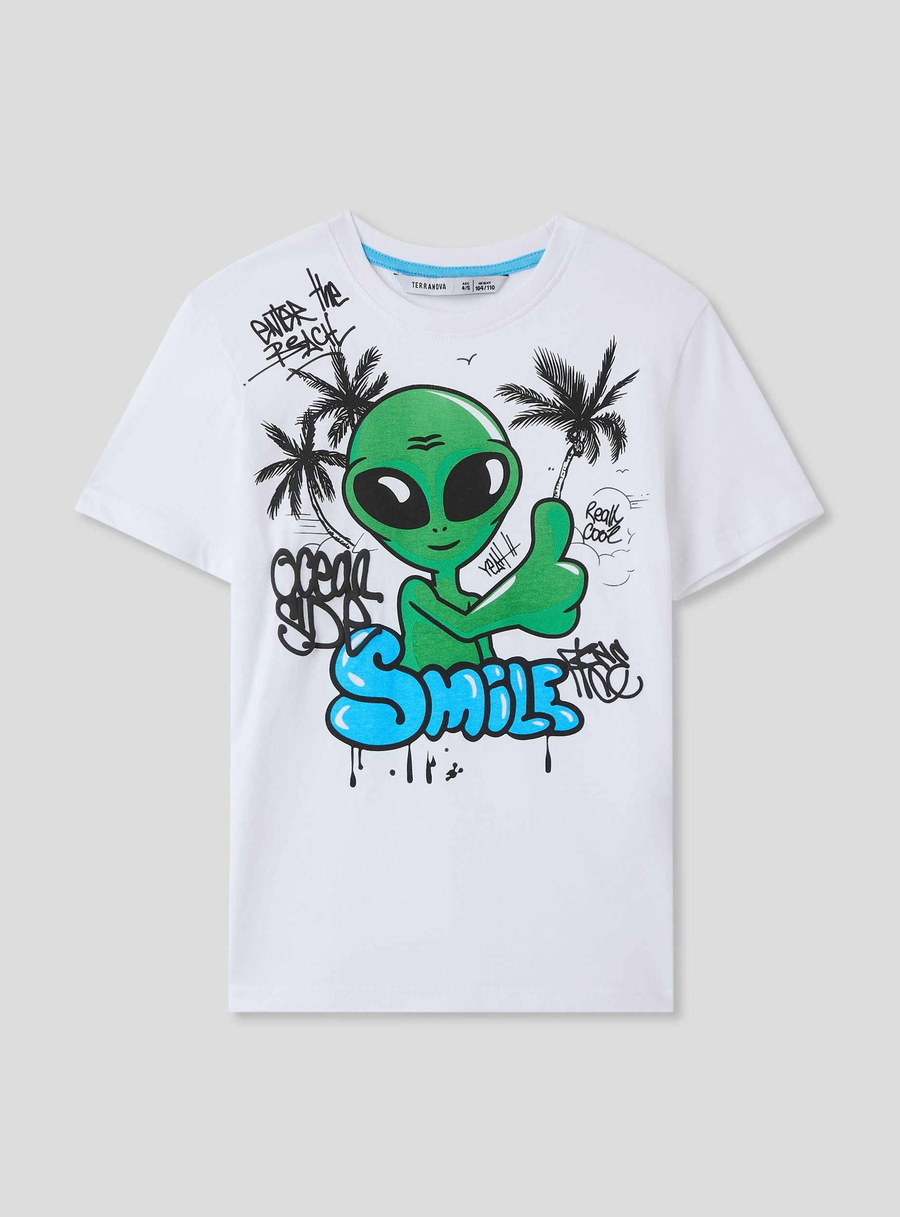 Maglietta da bimbo perfetta per un look originale e divertente. Il modello a maniche corte e girocollo assicura comfort e libertà di movimento, ideale per le giornate di scuola, il tempo libero e le avventure all'aria aperta. La vivace stampa con alieno aggiunge un tocco giocoso e cosmico, perfetto da abbinare a jeans, bermuda o joggers per uno stile urbano e alla moda.Dettagli