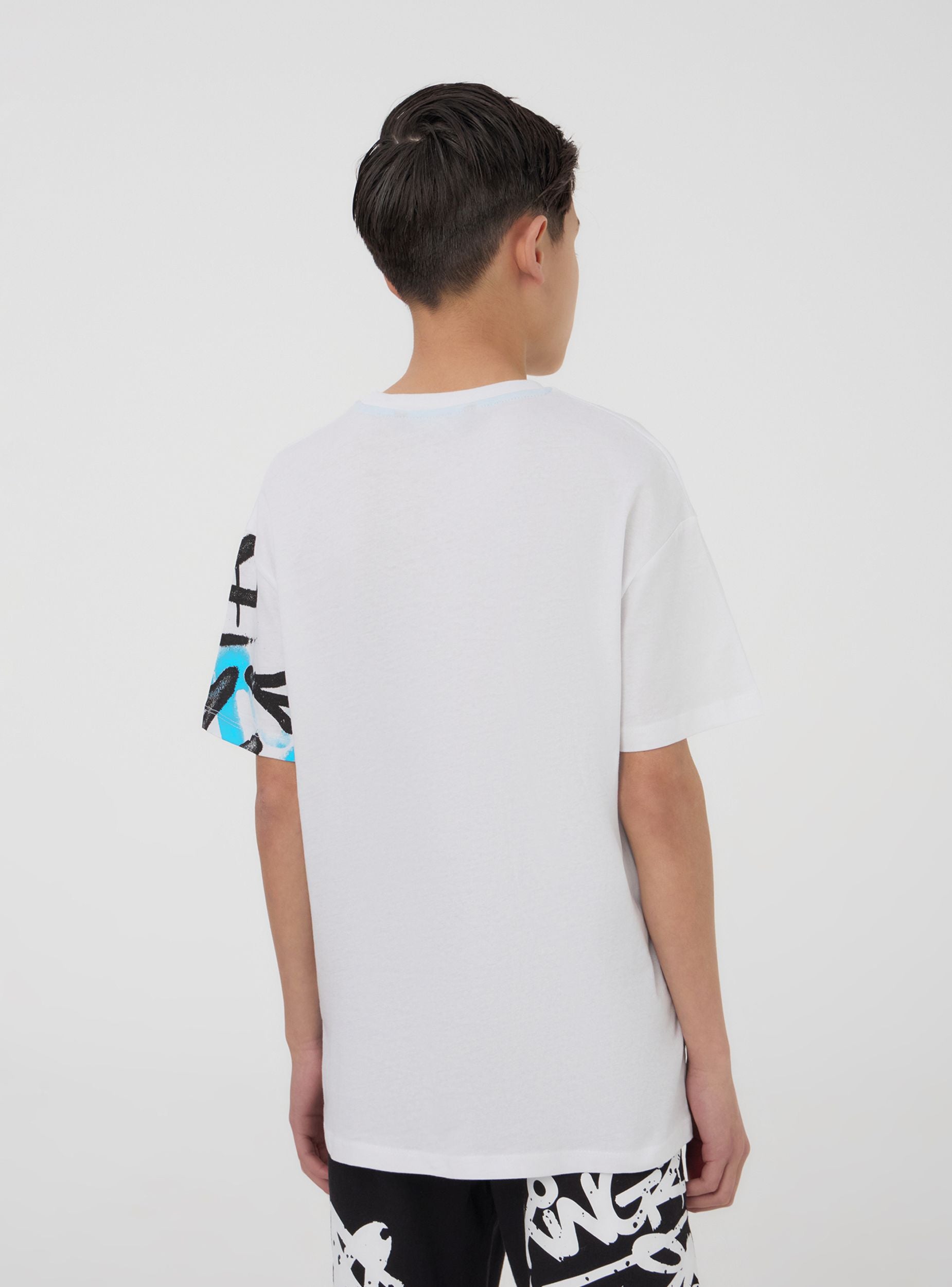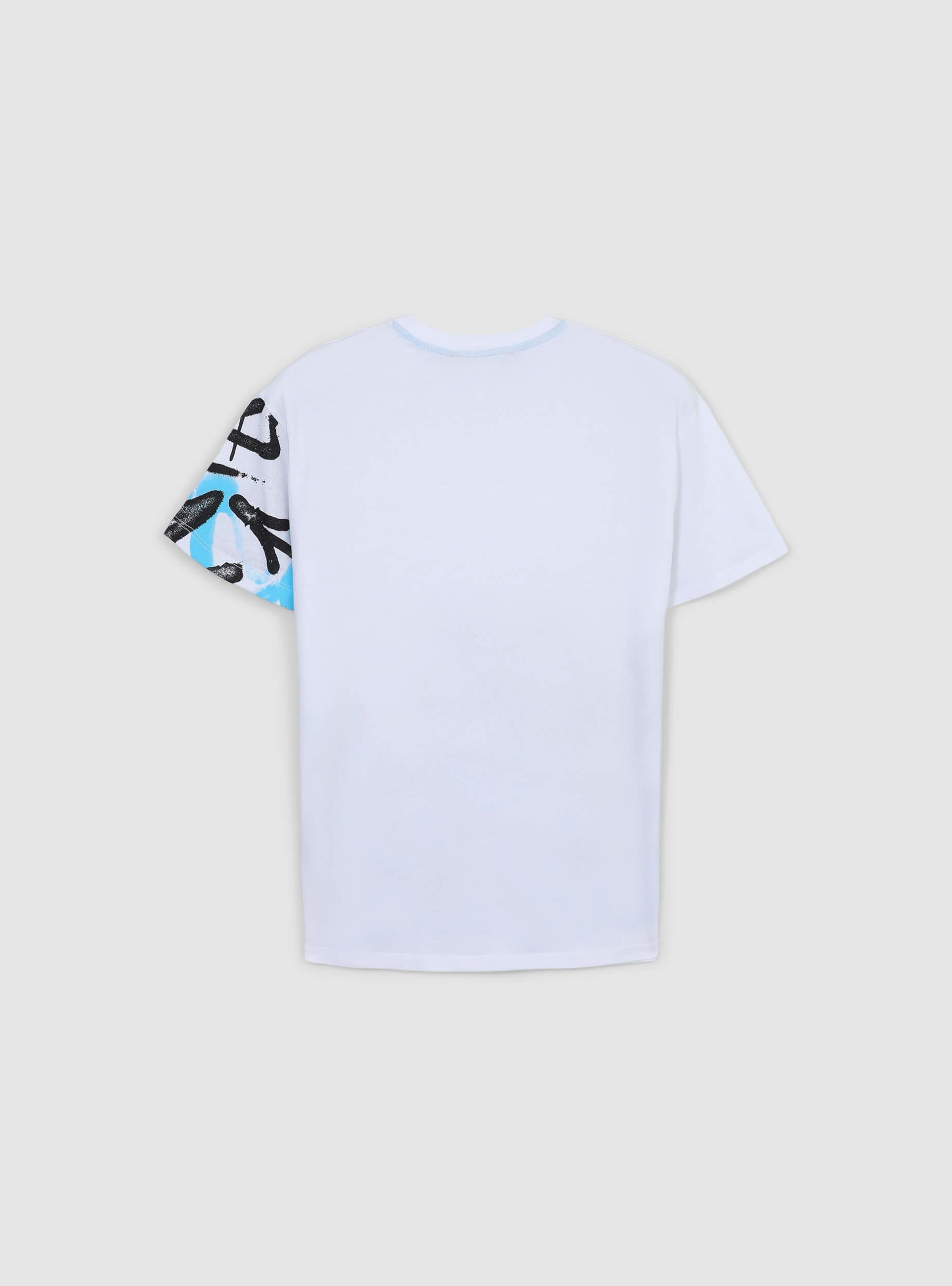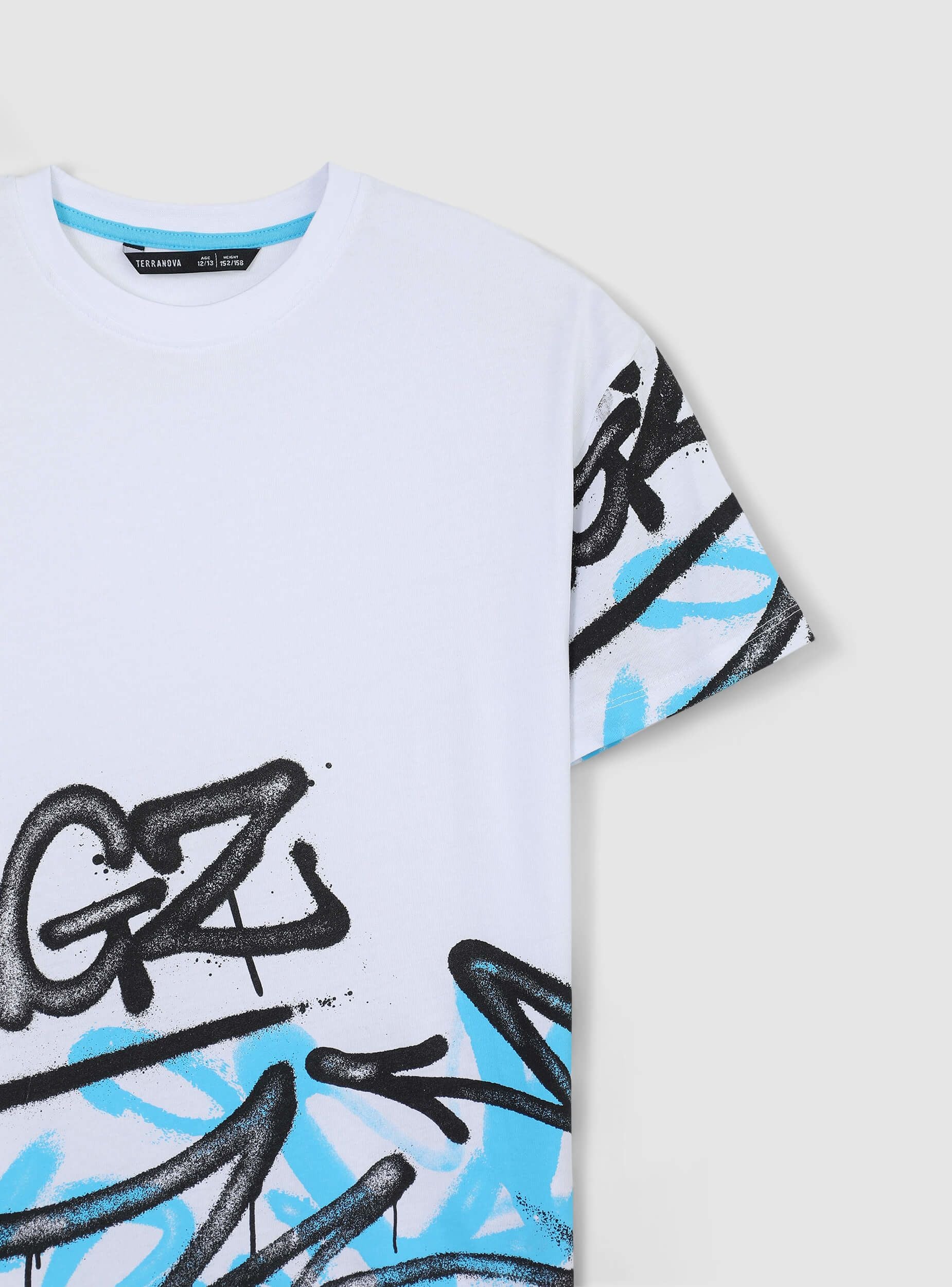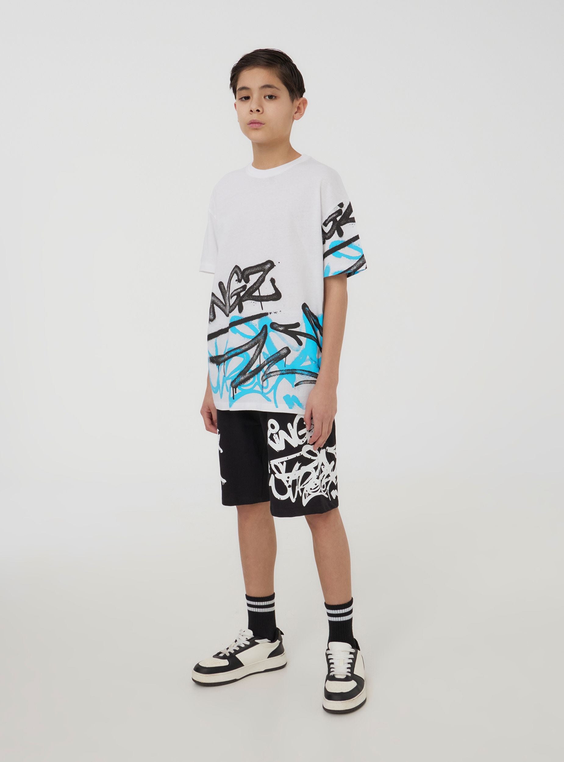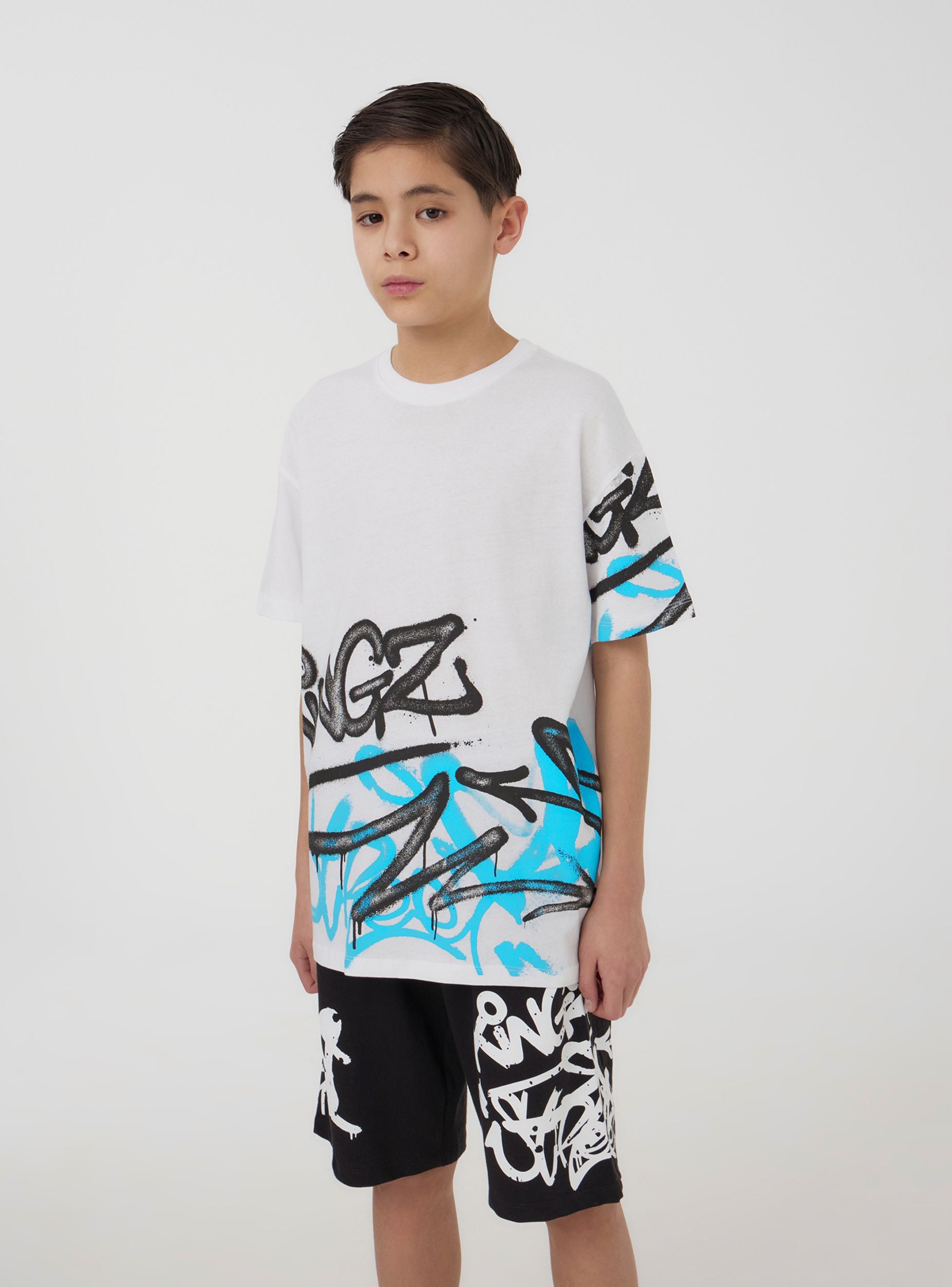 Maglietta da bambino dal design urban perfetta per chi ama lo stile streetwear. Il modello con maniche corte e girocollo assicura comfort e versatilità, mentre la stampa graffiti aggiunge un tocco originale e di tendenza. Ideale per il tempo libero, si abbina facilmente a jeans, joggers o bermuda per un look dinamico e alla moda, perfetto per la scuola o le uscite con gli amici.Dettagli