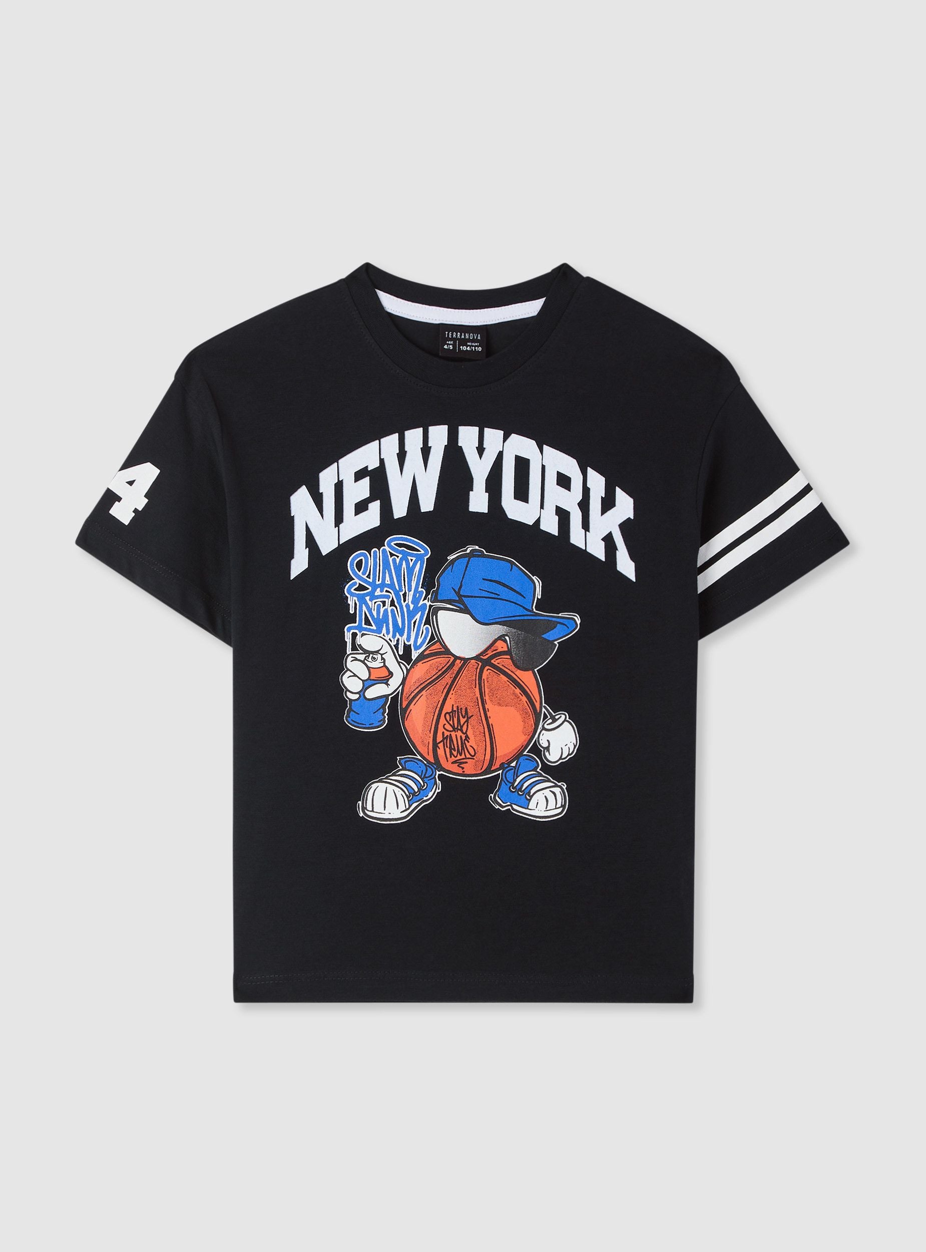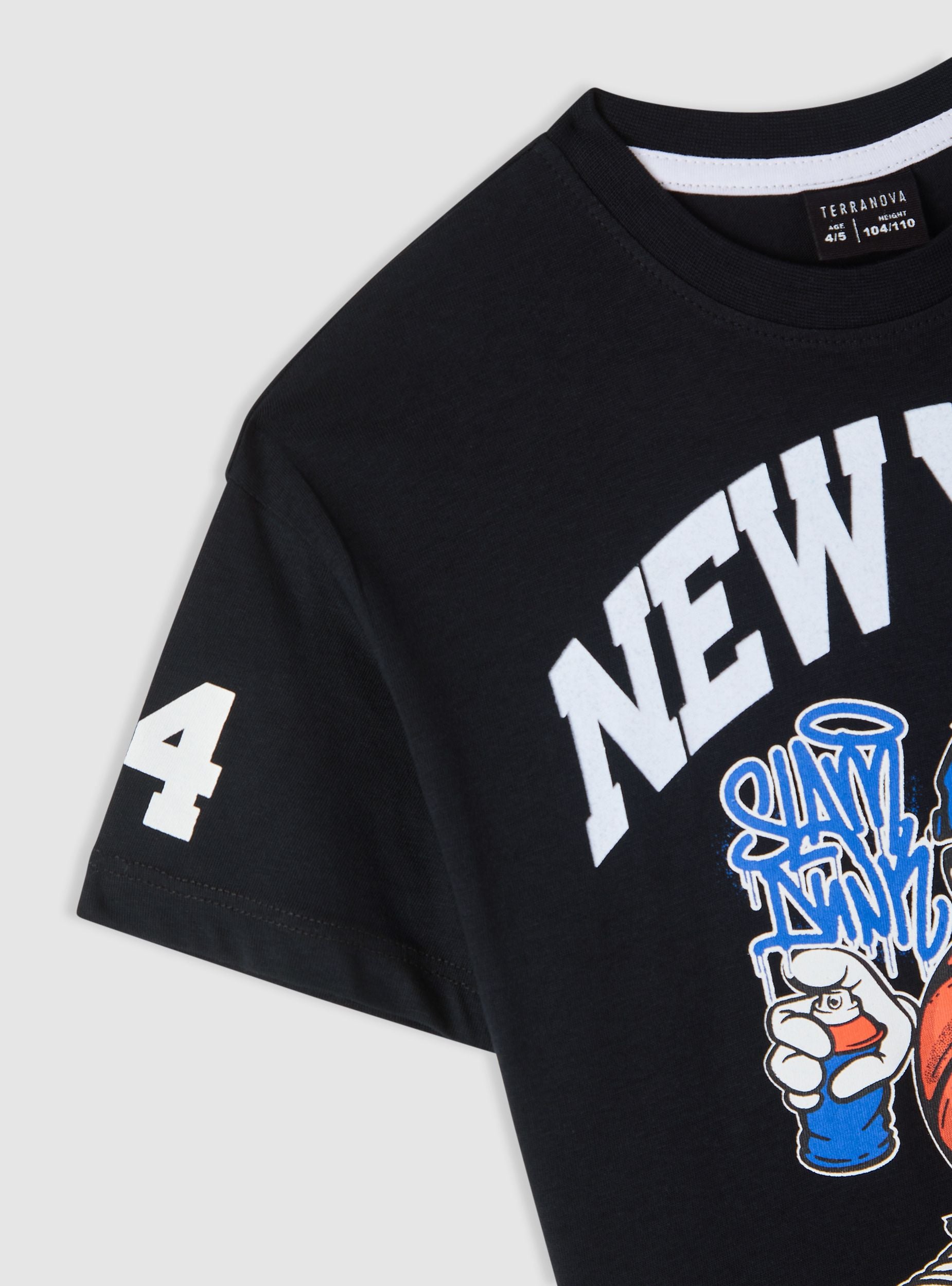 Maglietta da bimbo con stampa grafica ispirata a New York. Modello a maniche corte con girocollo, ideale per un look casual e sportivo. Perfetta per abbinamenti con jeans o pantaloncini per un outfit comodo e alla moda. La stampa vivace aggiunge un tocco di personalità, rendendola adatta per il tempo libero e le attività quotidiane.