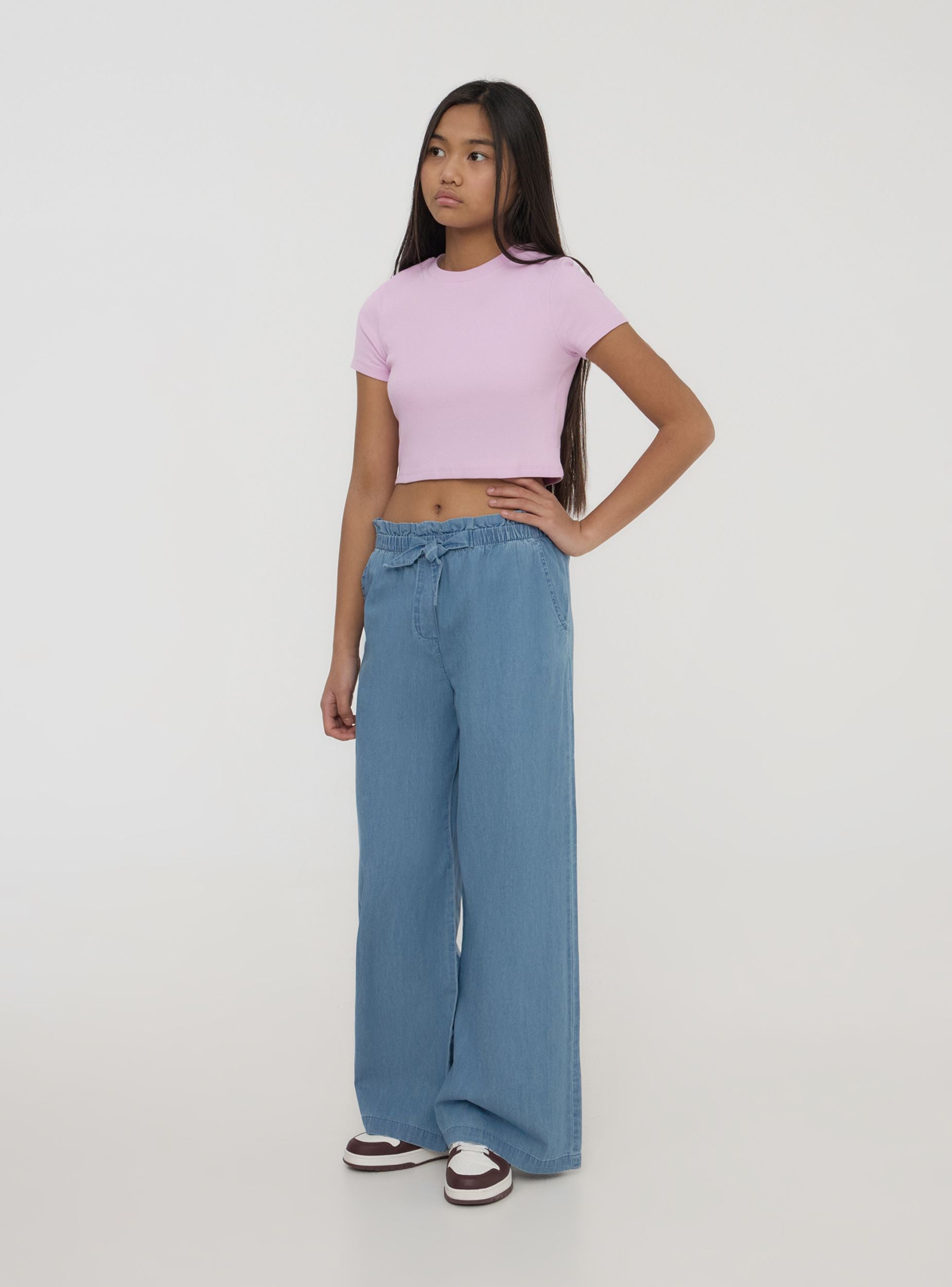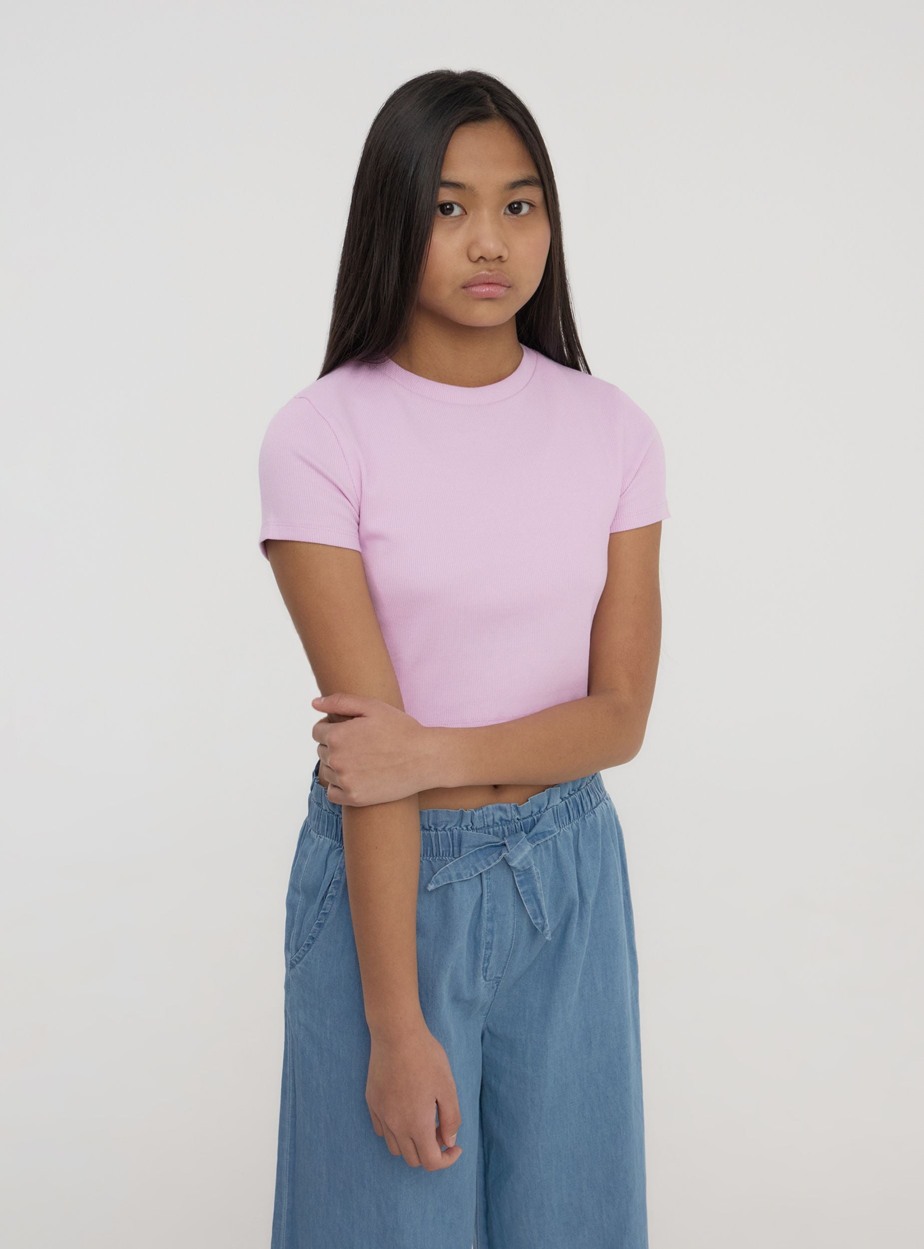 Maglietta da bambina perfetta per completare un look casual e alla moda, ideale per scuola o tempo libero. Con maniche corte e girocollo, il modello crop a tinta unita si distingue per il tessuto a costine che aggiunge un tocco di stile contemporaneo. Versatile e comoda, adatta a ogni occasione.