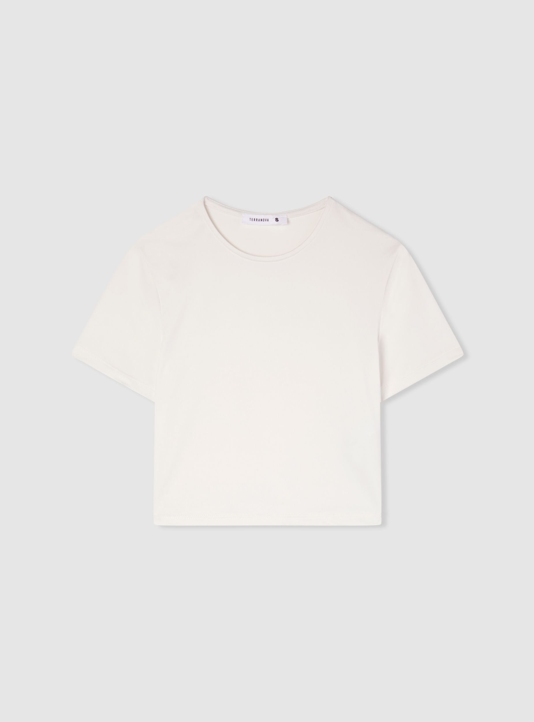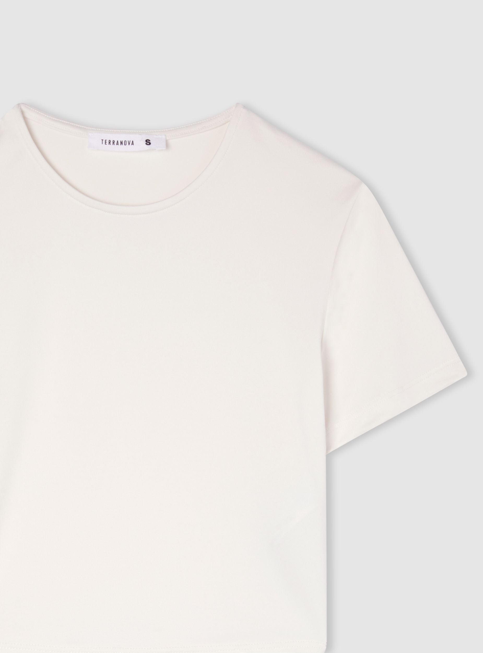 Maglietta da donna con design crop e maniche corte, realizzata in tessuto elasticizzato a tinta unita, ideale per un look casual e moderno. Presenta una vestibilità aderente che valorizza la figura, perfetta per essere abbinata a jeans o pantaloni a vita alta. Il girocollo aggiunge un tocco di semplicità e versatilità, rendendola adatta a diverse occasioni, dal tempo libero alle uscite informali.Dettagli