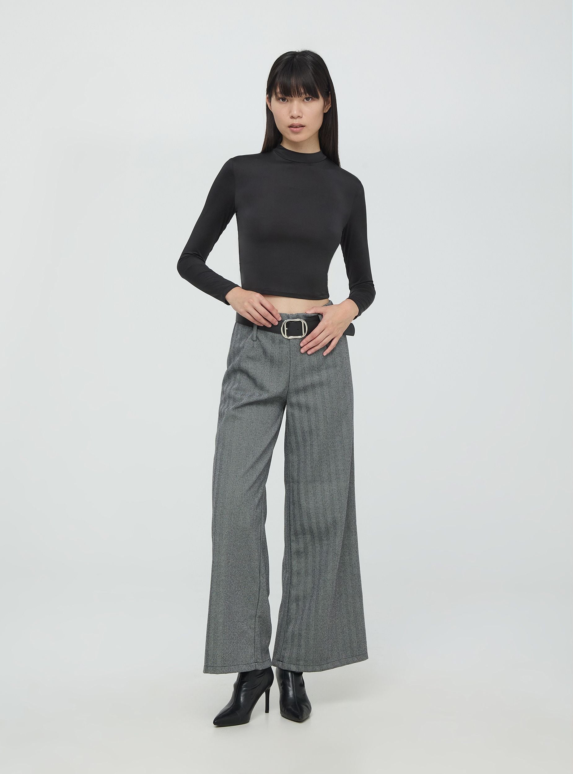 Maglia da donna a tinta unita. Capo basic che si adatta facilmente a qualsiasi outfit. Il design minimalista è esaltato da un collo alto e maniche lunghe, per un look pulito e sofisticato. La vestibilità aderente e crop la rende ideale sia per outfit casual chic.