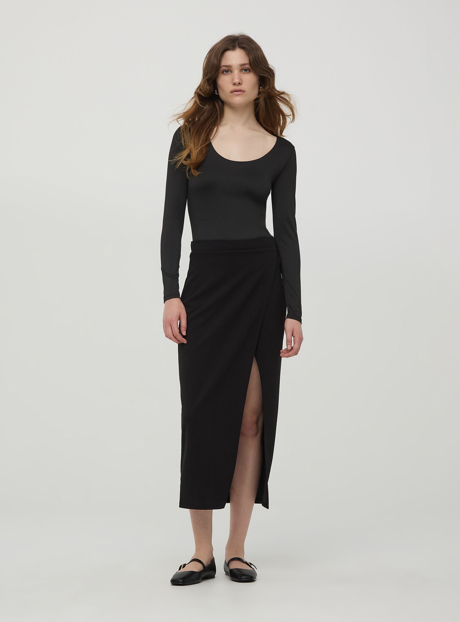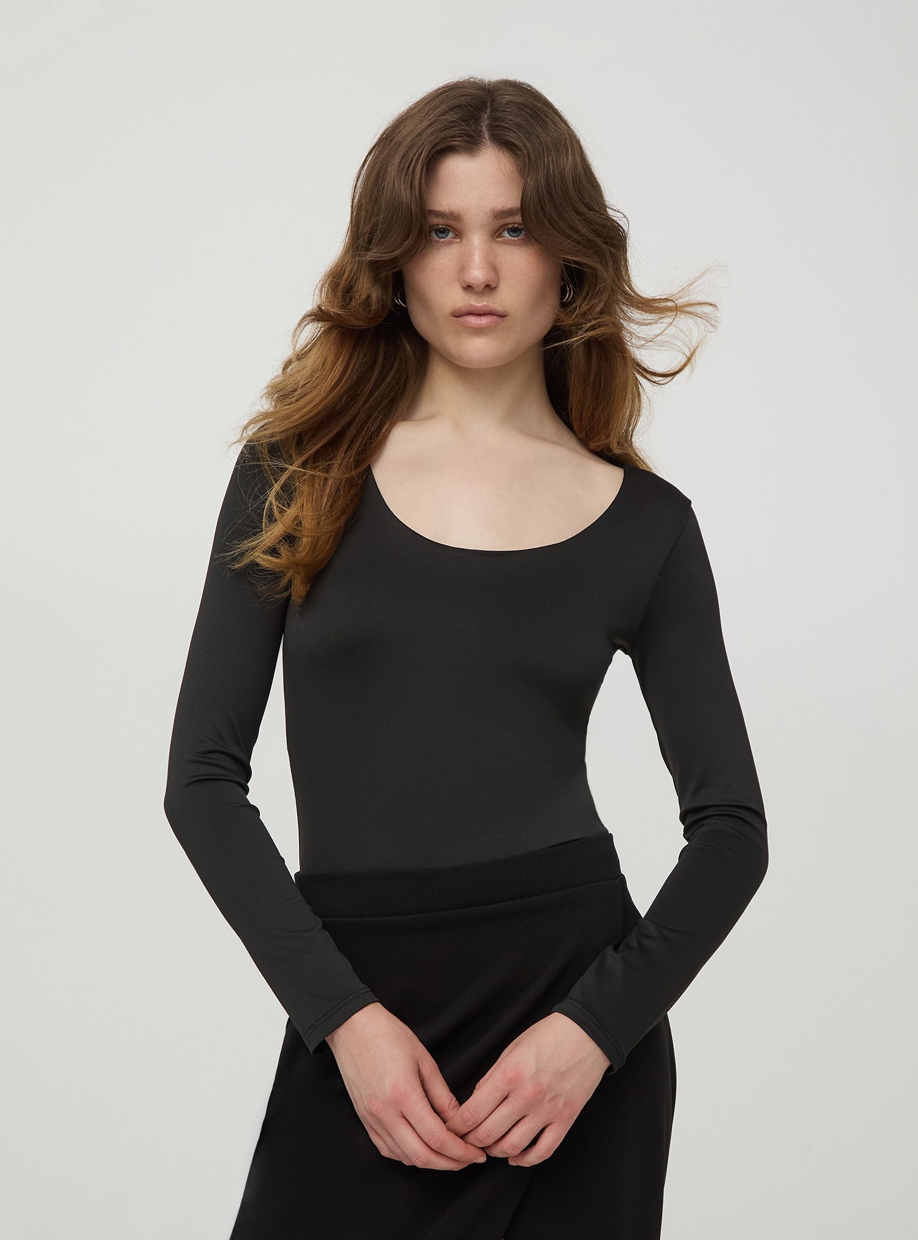 Maglietta da donna a manica lunga realizzata in tessuto elasticizzato e lucido tinta unita. Il design è caratterizzato da una vestibilità aderente che esalta la silhouette, completata da una scollatura ampia che aggiunge un tocco di femminilità al capo. Questa maglietta è ideale per chi cerca un abbigliamento che combini comfort e stile.