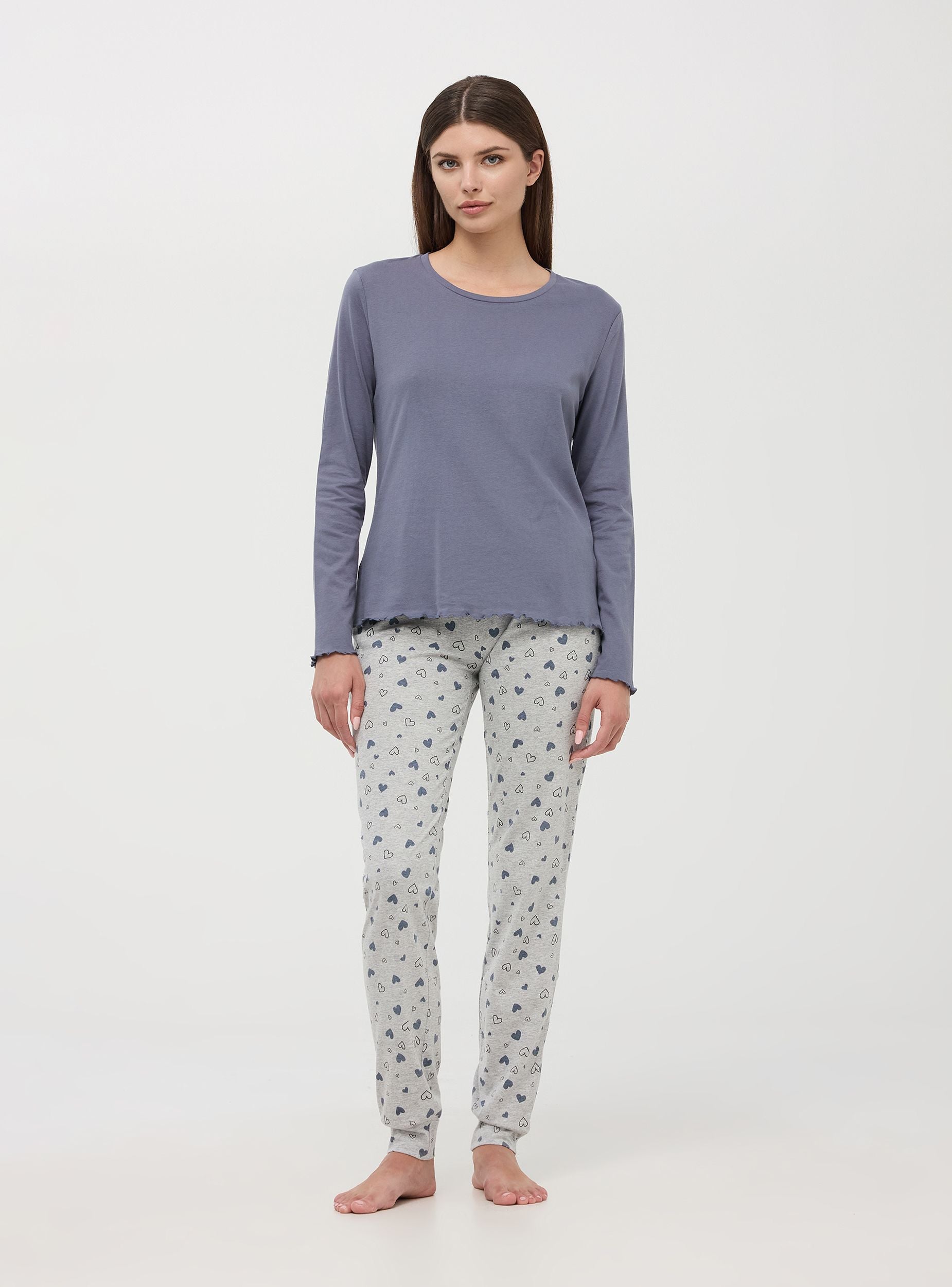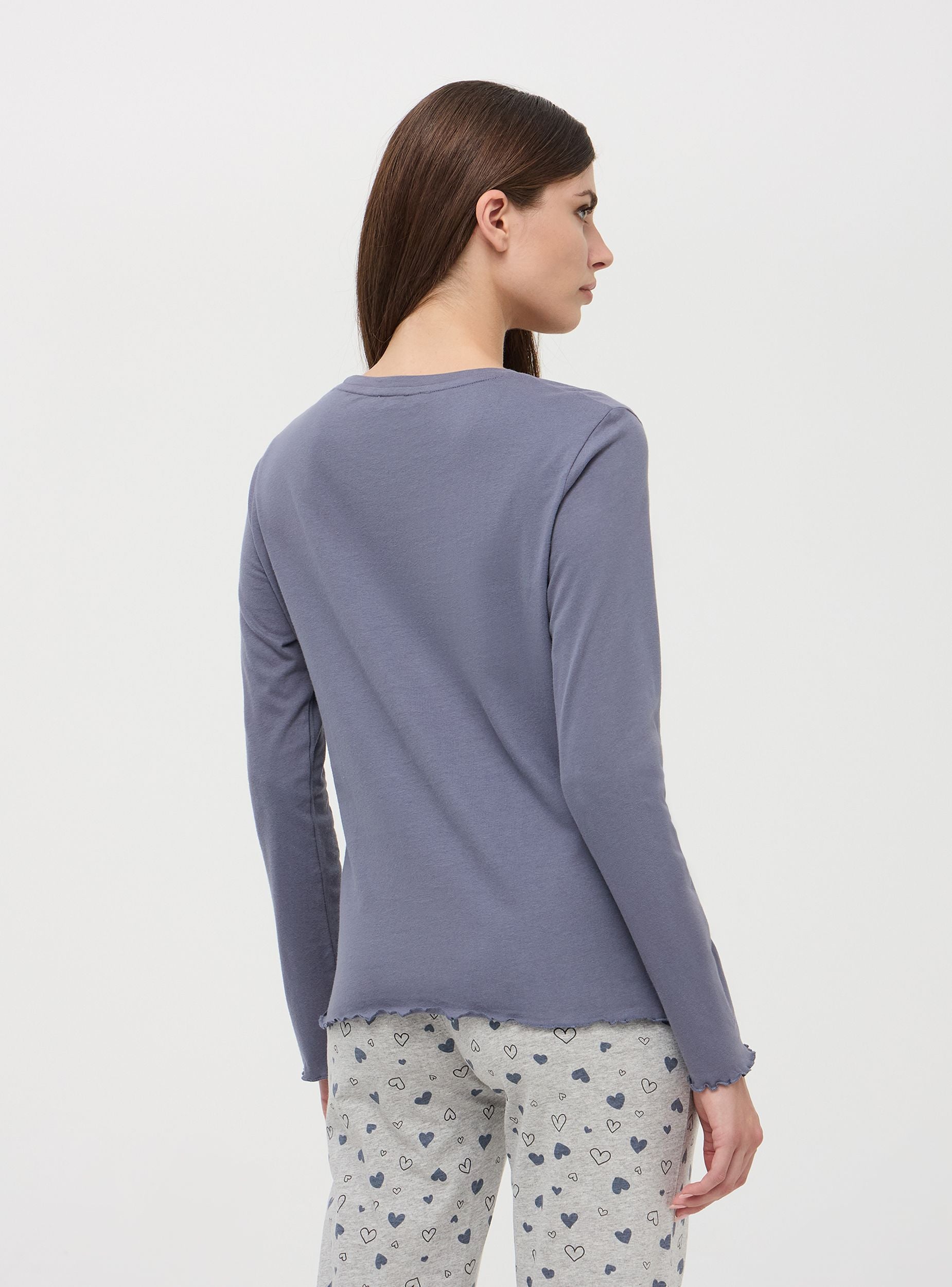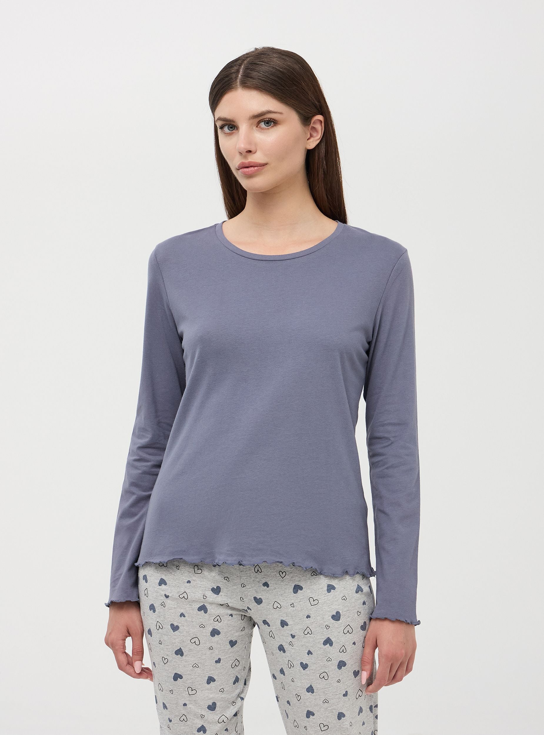 Maglia pigiama da donna a maniche lunghe in tessuto di cotone e viscosa a tinta unita. Questa maglia offre una vestibilità rilassata e confortevole, perfetta per la notte e le giornate trascorse a casa . Il design semplice con scollo rotondo e orlo leggermente ondulato aggiunge un tocco di femminilitàDettagli