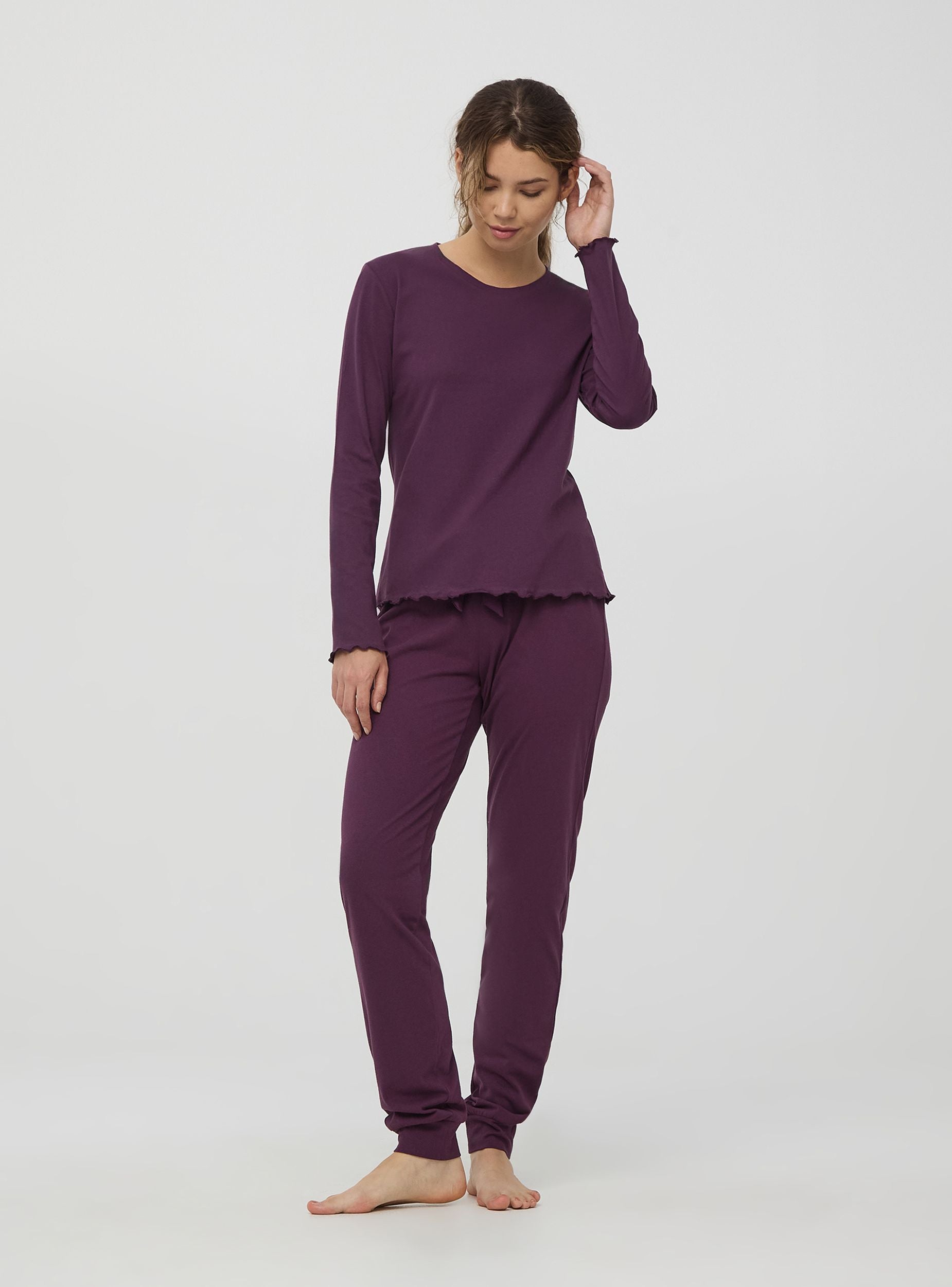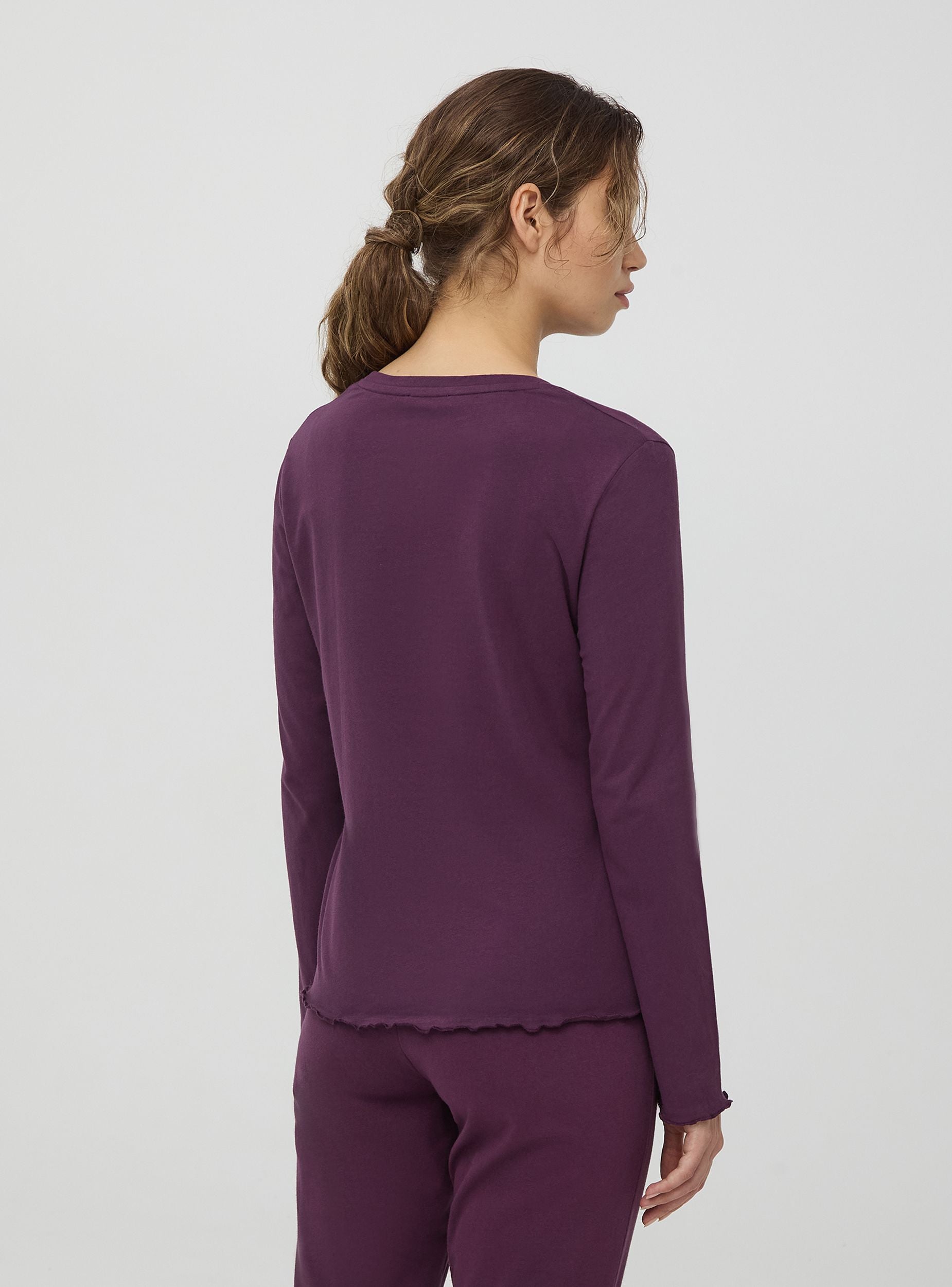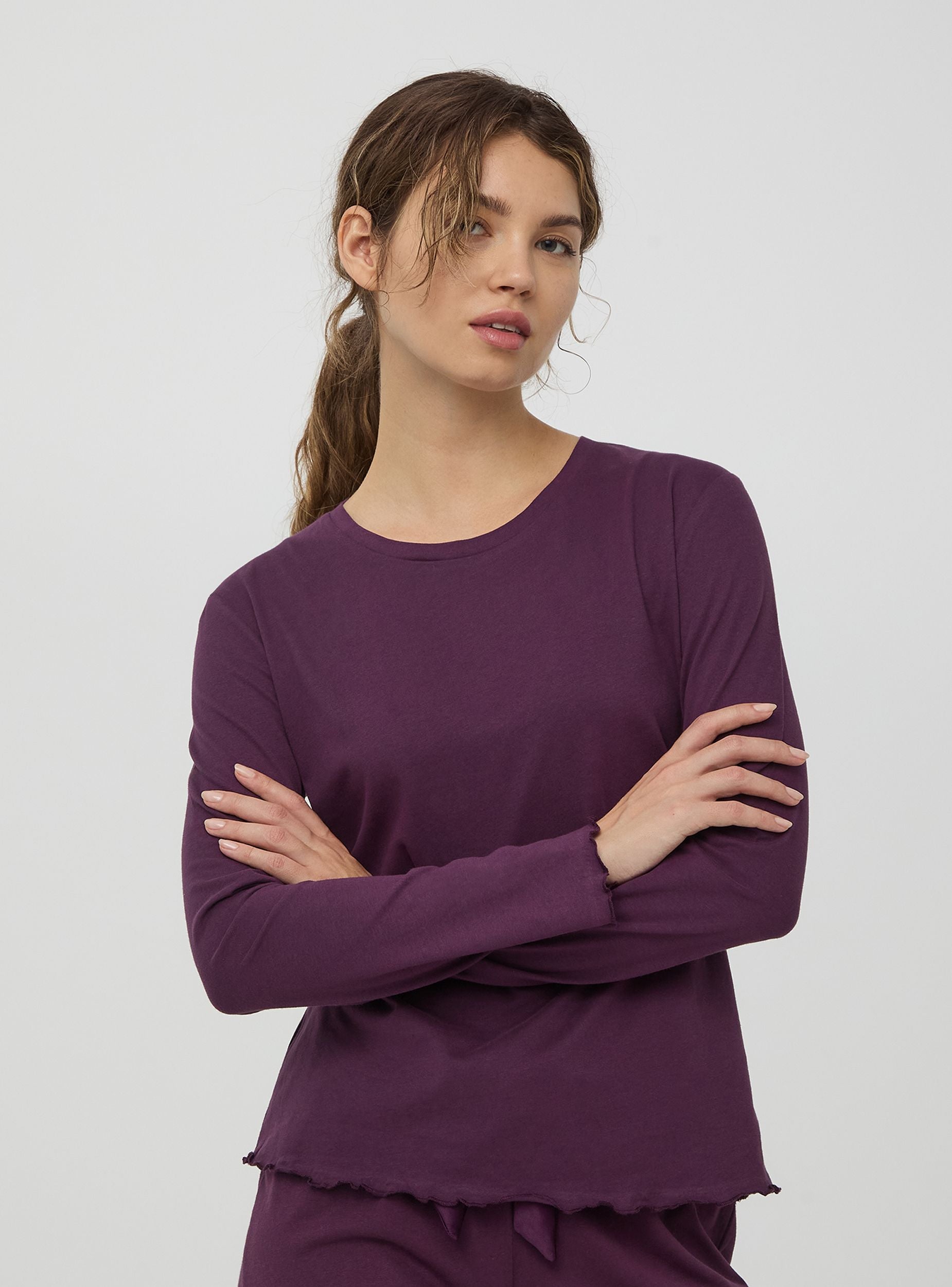 Maglia pigiama da donna a maniche lunghe in tessuto di cotone e viscosa a tinta unita. Questa maglia offre una vestibilità rilassata e confortevole, perfetta per la notte e le giornate a casa. Il design semplice con scollo rotondo e orlo leggermente ondulato aggiunge un tocco di femminilità al tuo look.