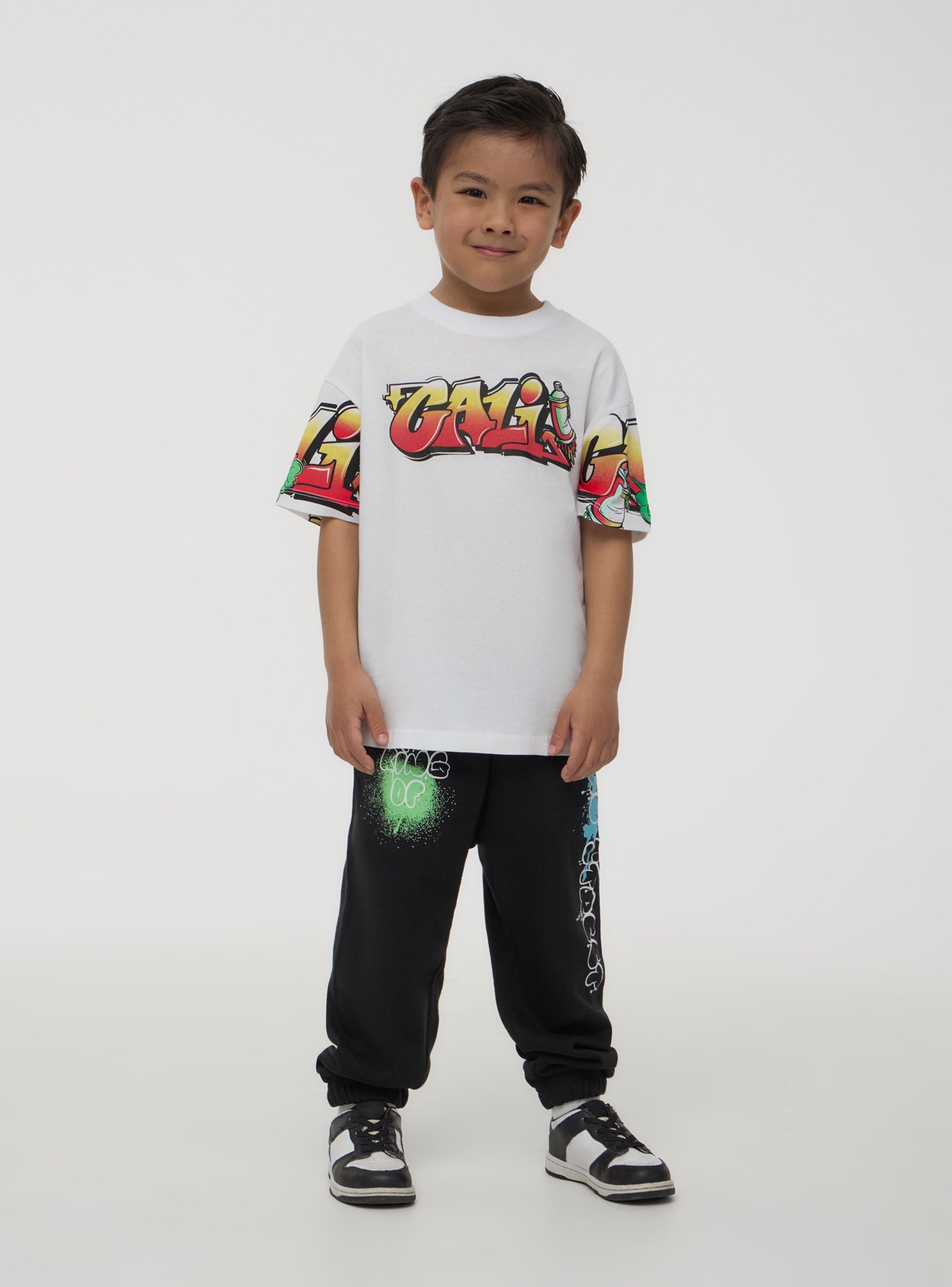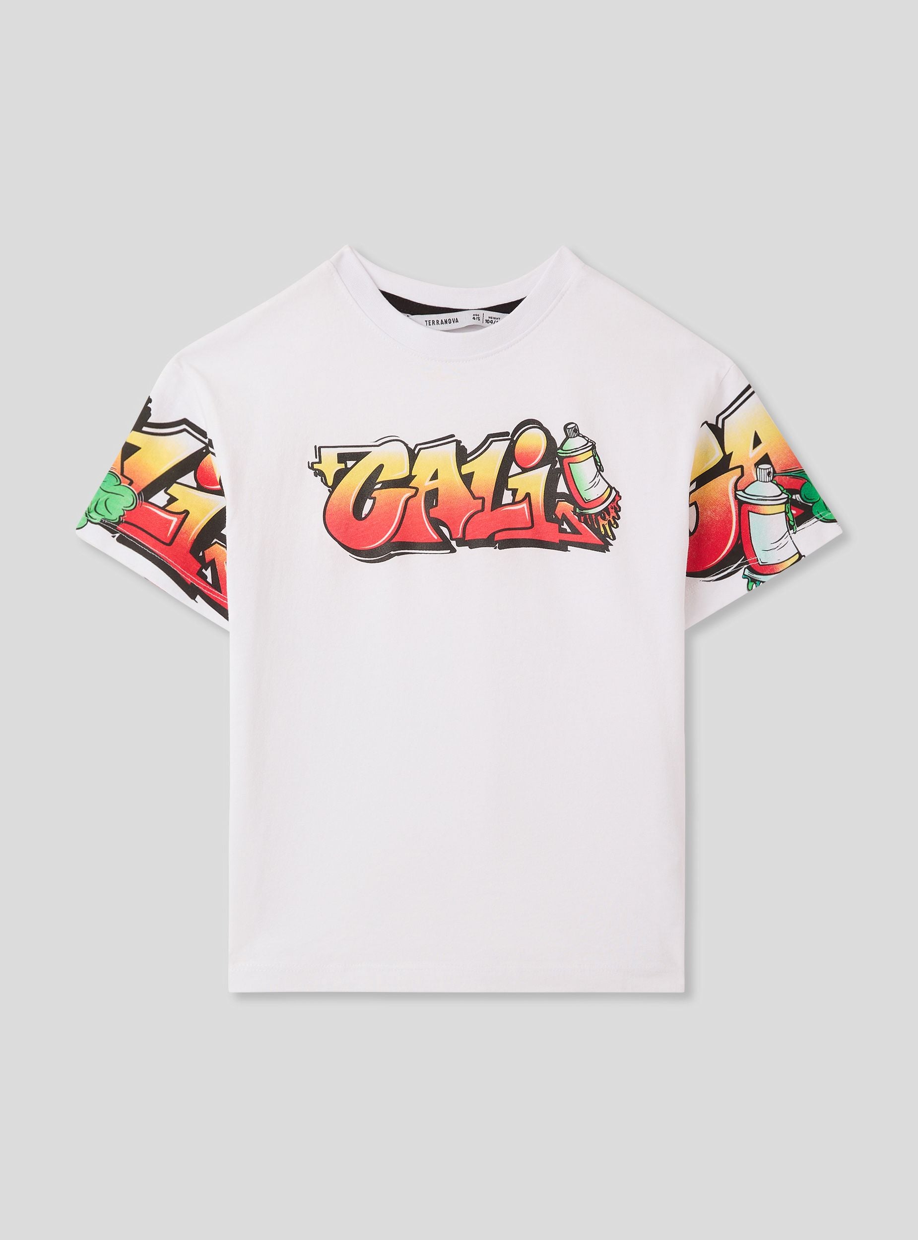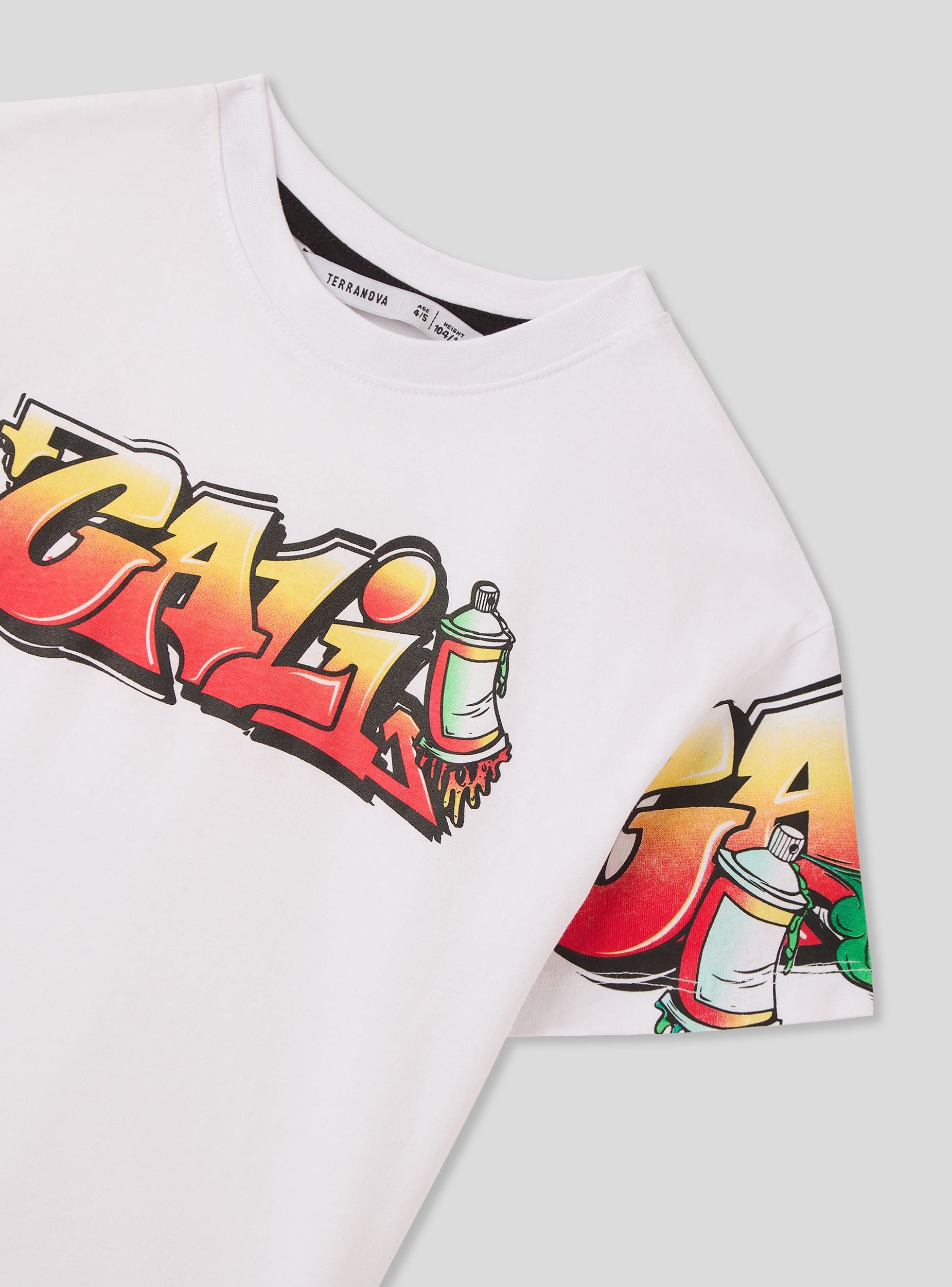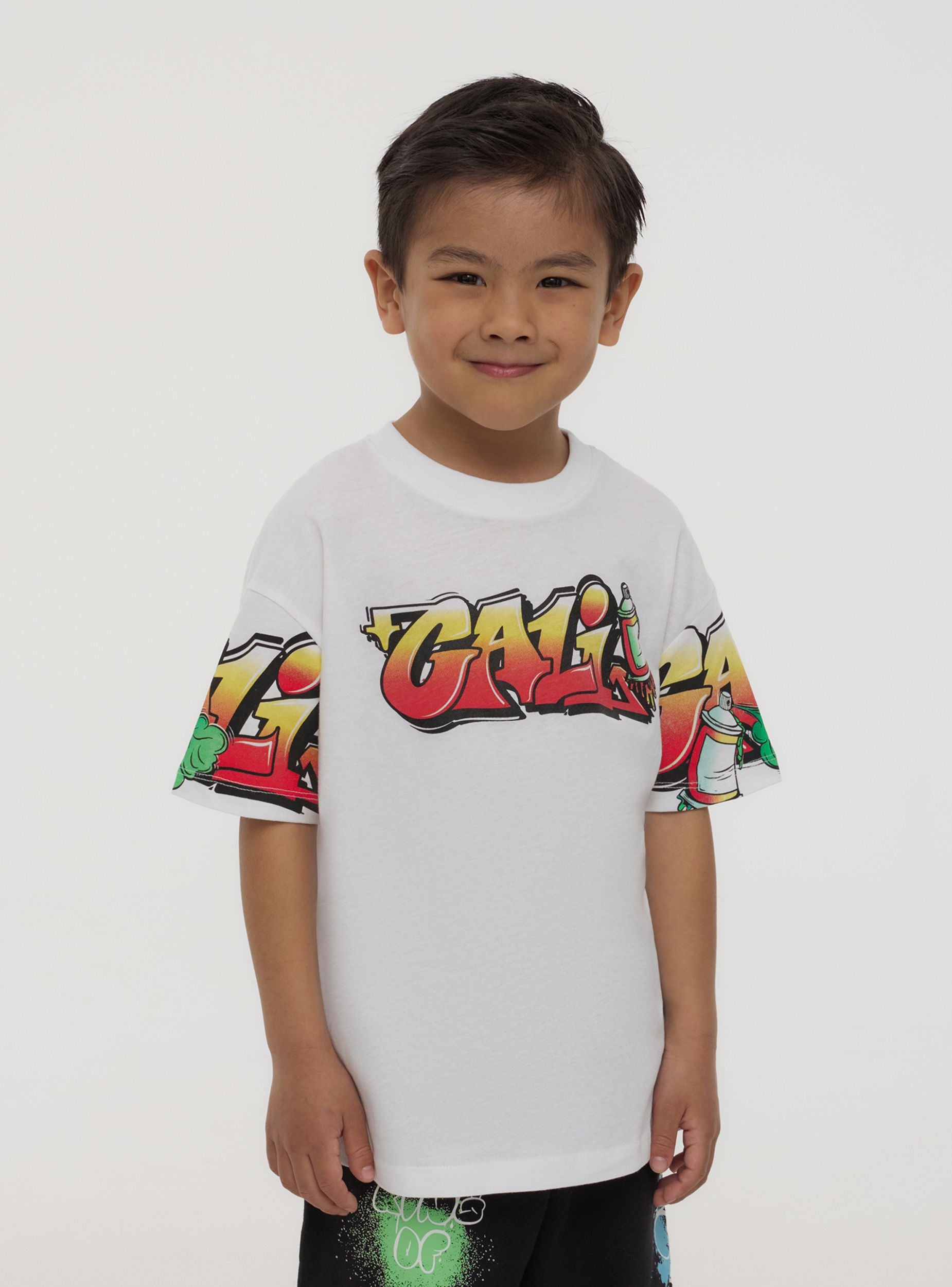 Maglietta da bimbo dallo stile urbano e grintoso, perfetta per aggiungere un tocco streetwear ai look quotidiani. Il modello presenta maniche corte e girocollo per un comfort ottimale, mentre la stampa graffiti sulle maniche e sul petto dona un aspetto energico e creativo. Ideale per il tempo libero, si abbina facilmente a jeans, joggers o bermuda per un outfit fresco e alla moda, perfetto per ogni avventura.Dettagli