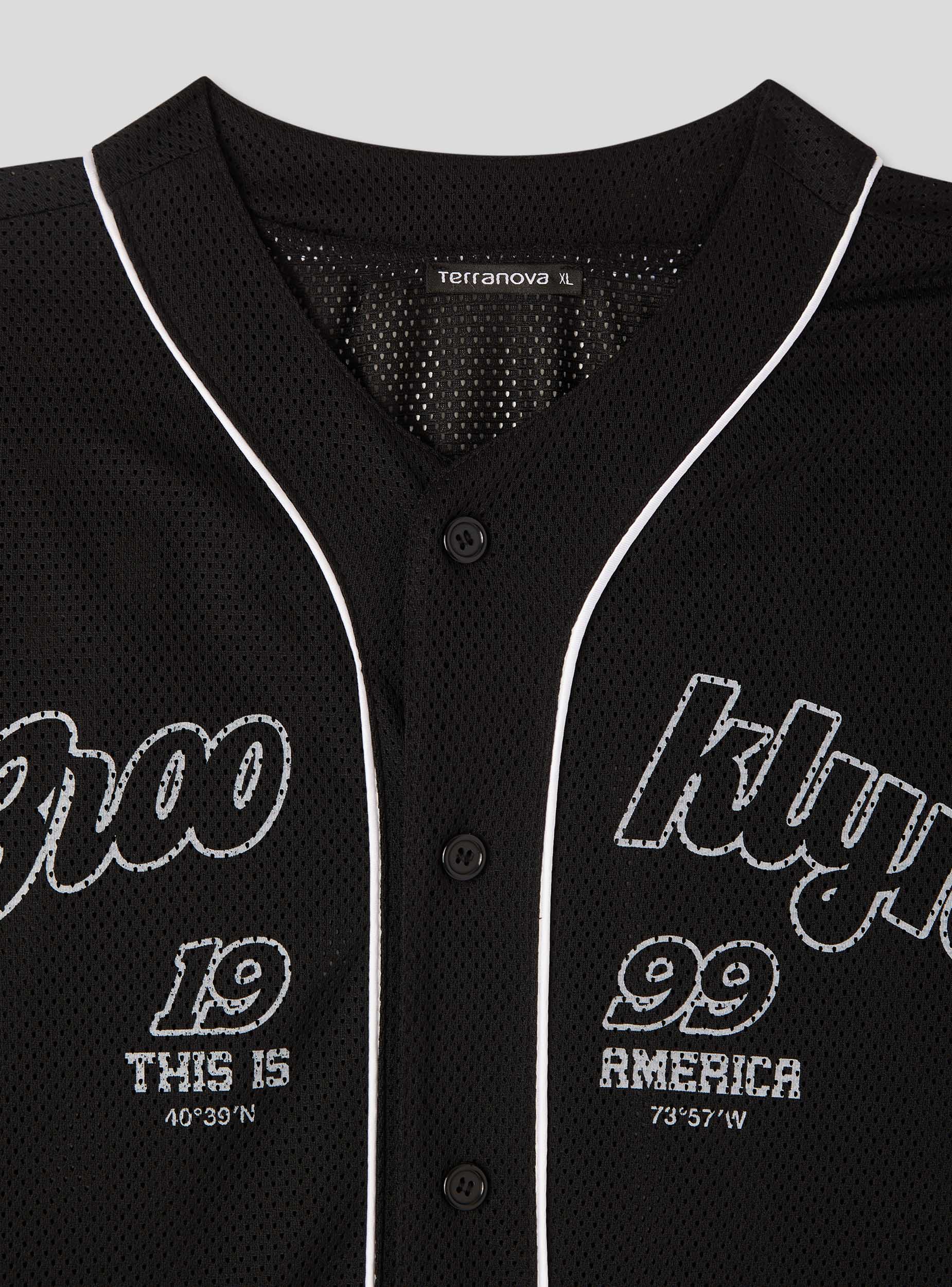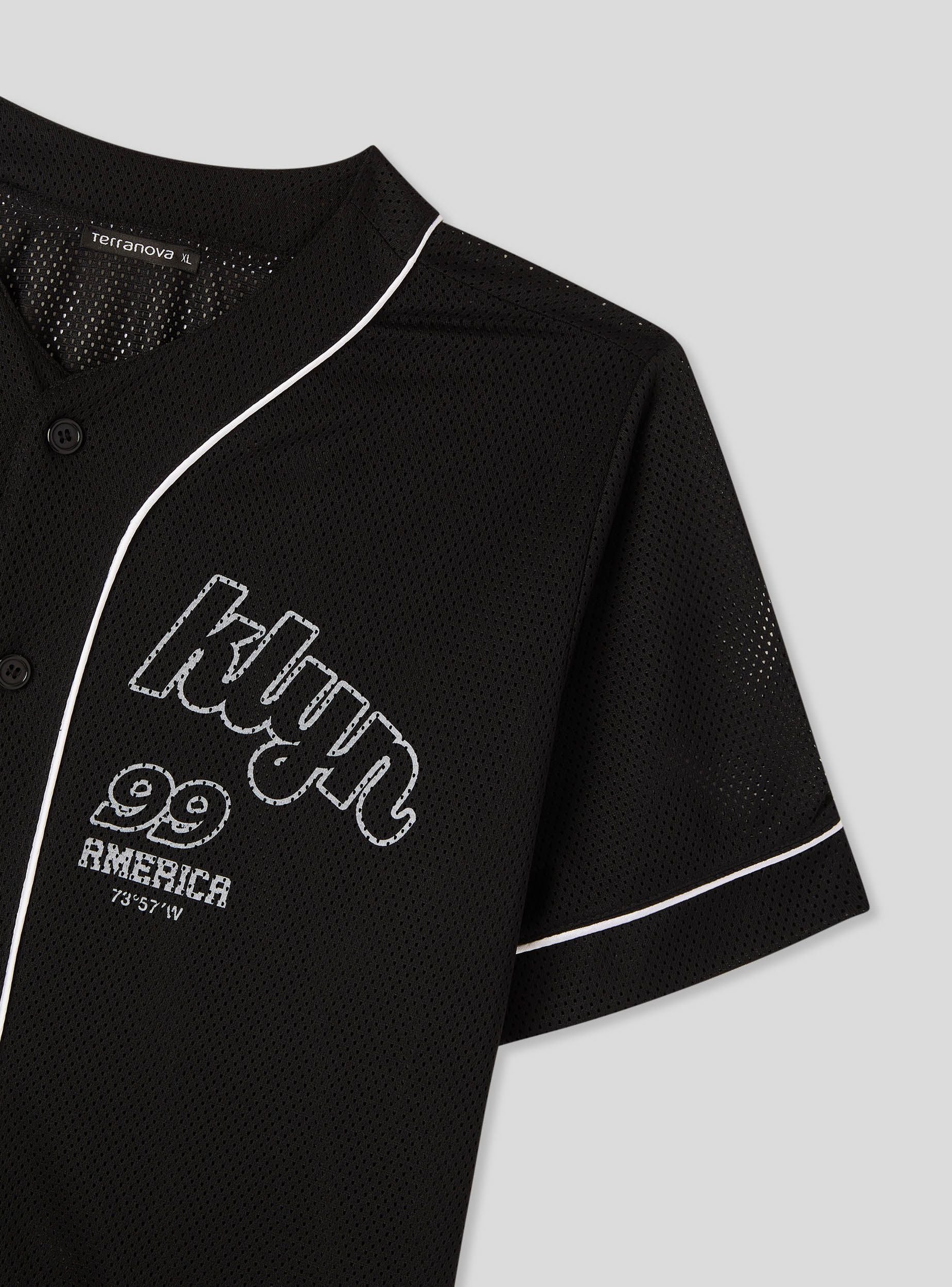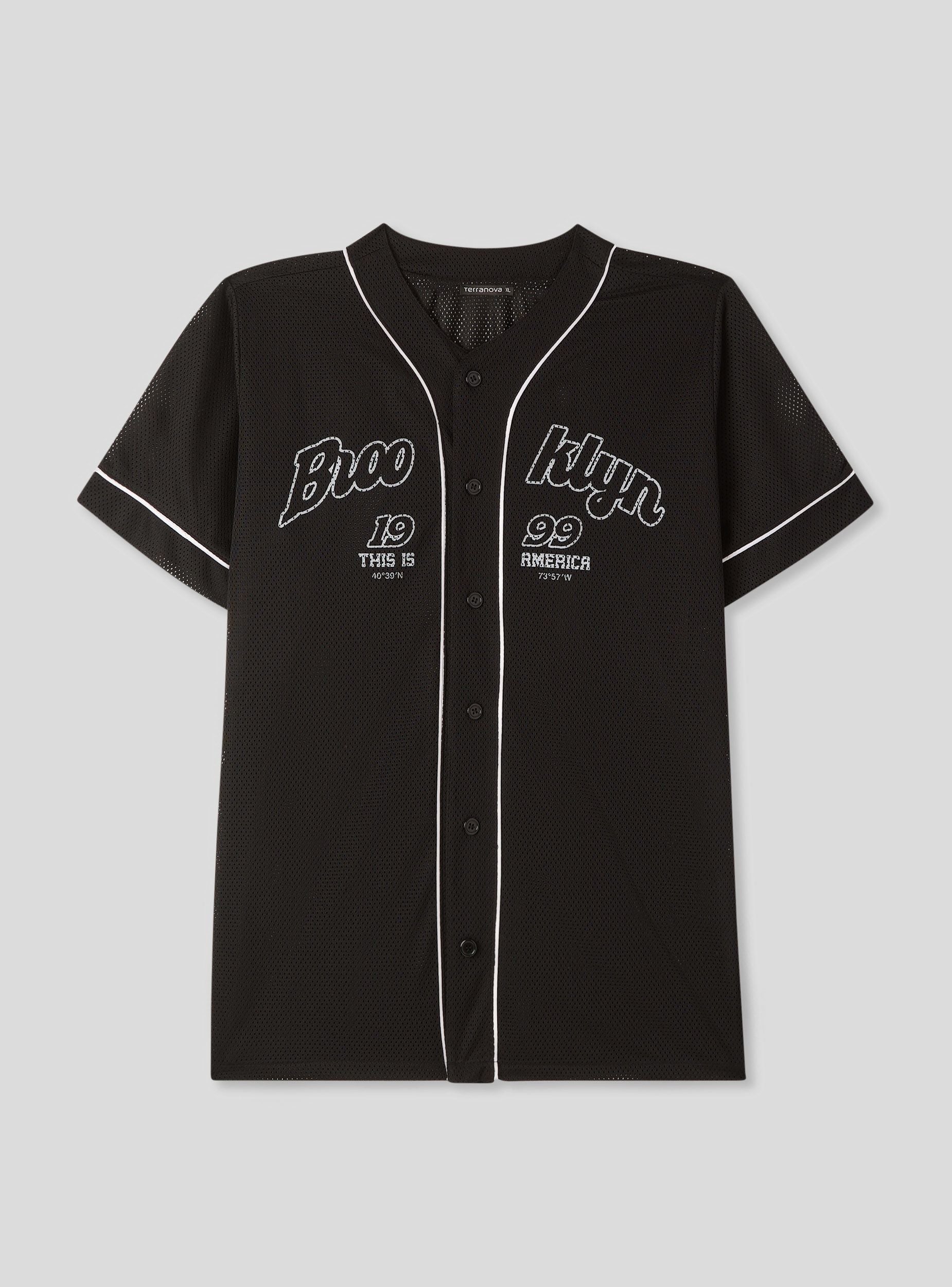 Maglietta da uomo con scritta stile baseball, ideale per un look casual e sportivo. Presenta una chiusura con bottoni e un design a maniche corte, perfetto per la stagione estiva. Il tessuto leggero a rete garantisce comfort durante l'uso. Ottima da abbinare a jeans o pantaloncini per un outfit dinamico e alla moda.