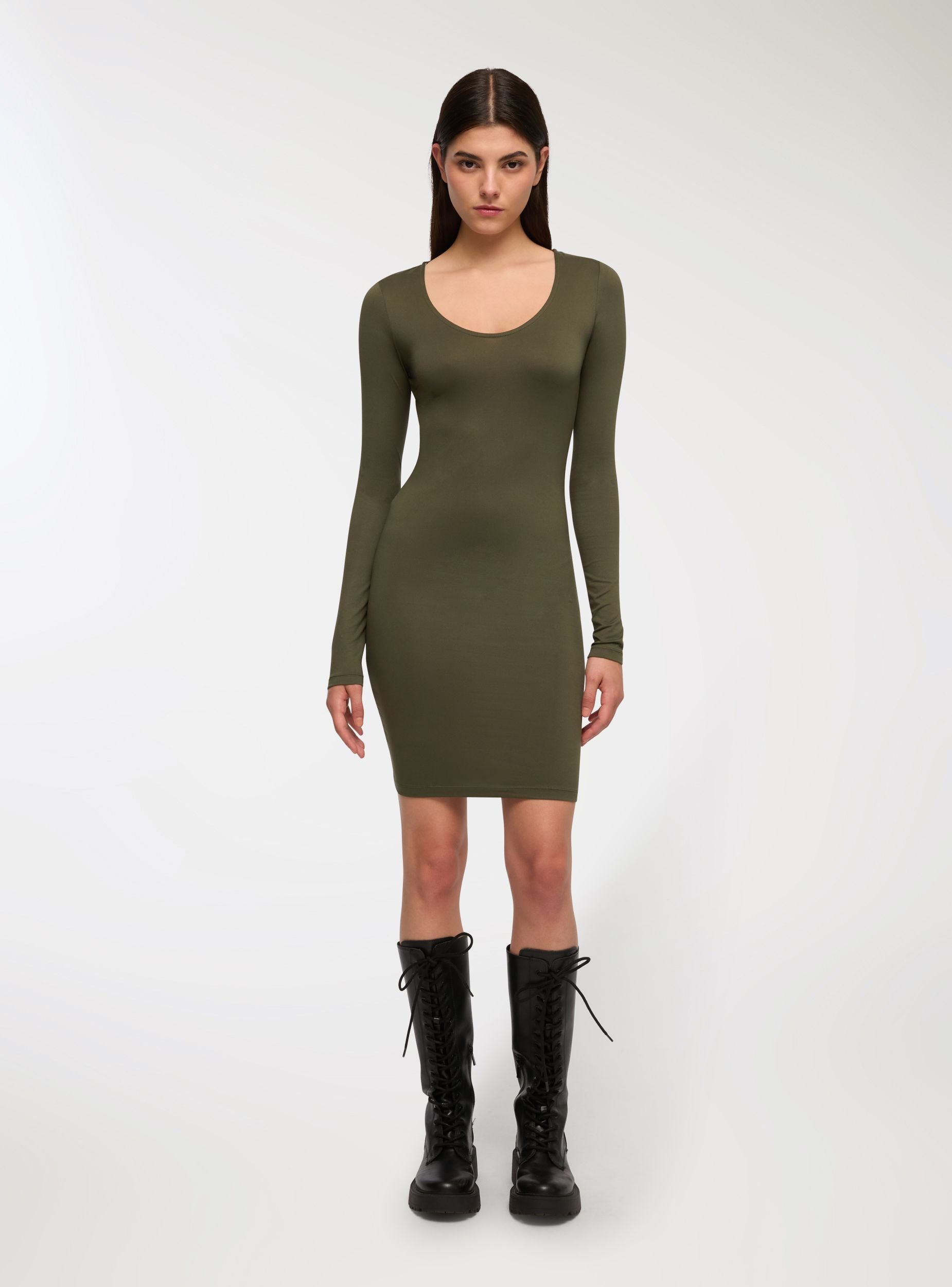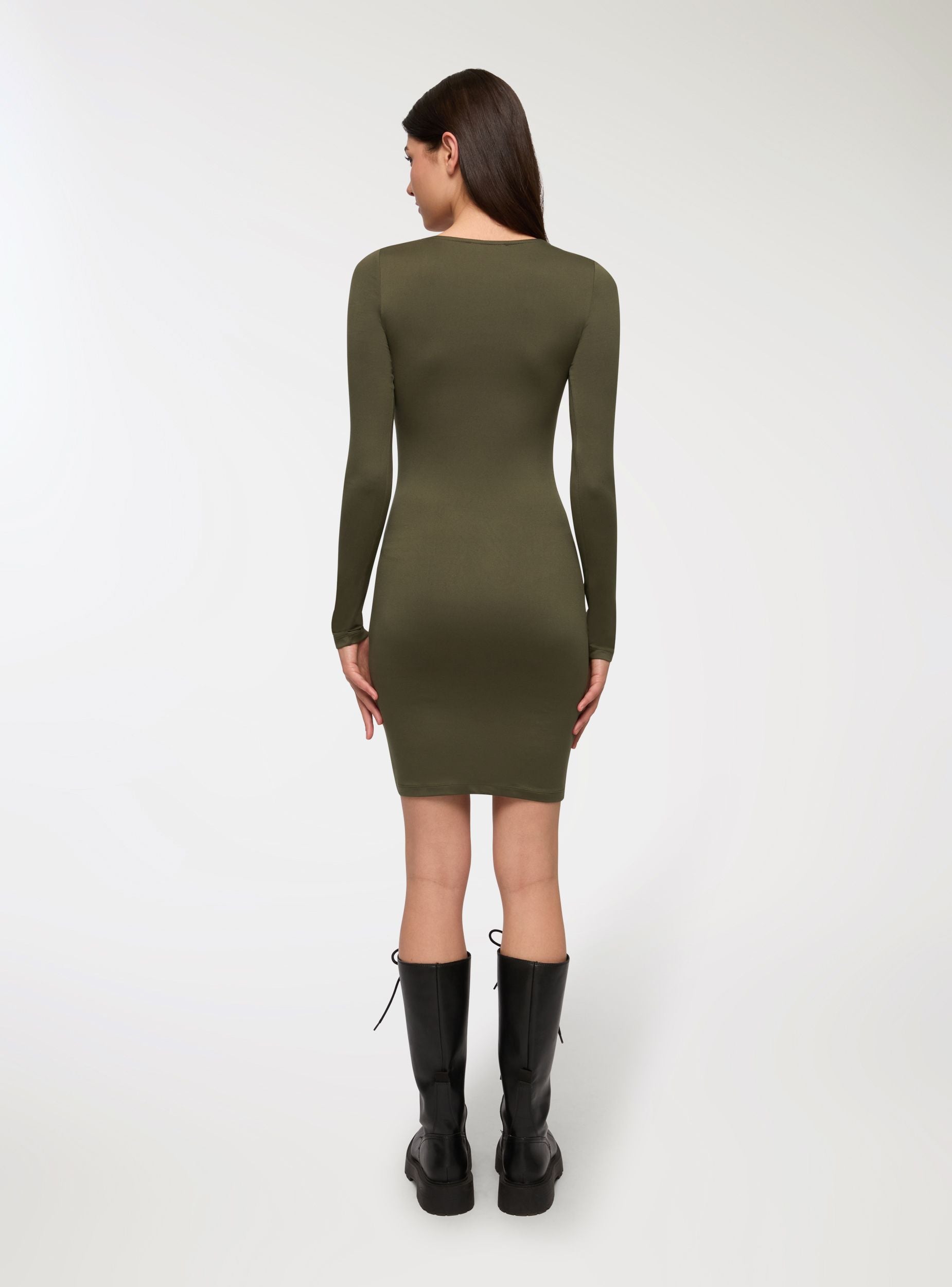 Tessuto caldo. Abito da donna modello bodydress con maniche lunghe e scollo ampio, pensato per valorizzare la silhouette con eleganza e semplicità. Il design aderente abbraccia le forme con femminilità, mentre il tessuto regala una sensazione morbida e vellutata sulla pelle. Perfetto per look versatili da giorno o da sera, si abbina facilmente a stivali o décolleté per uno stile contemporaneo.