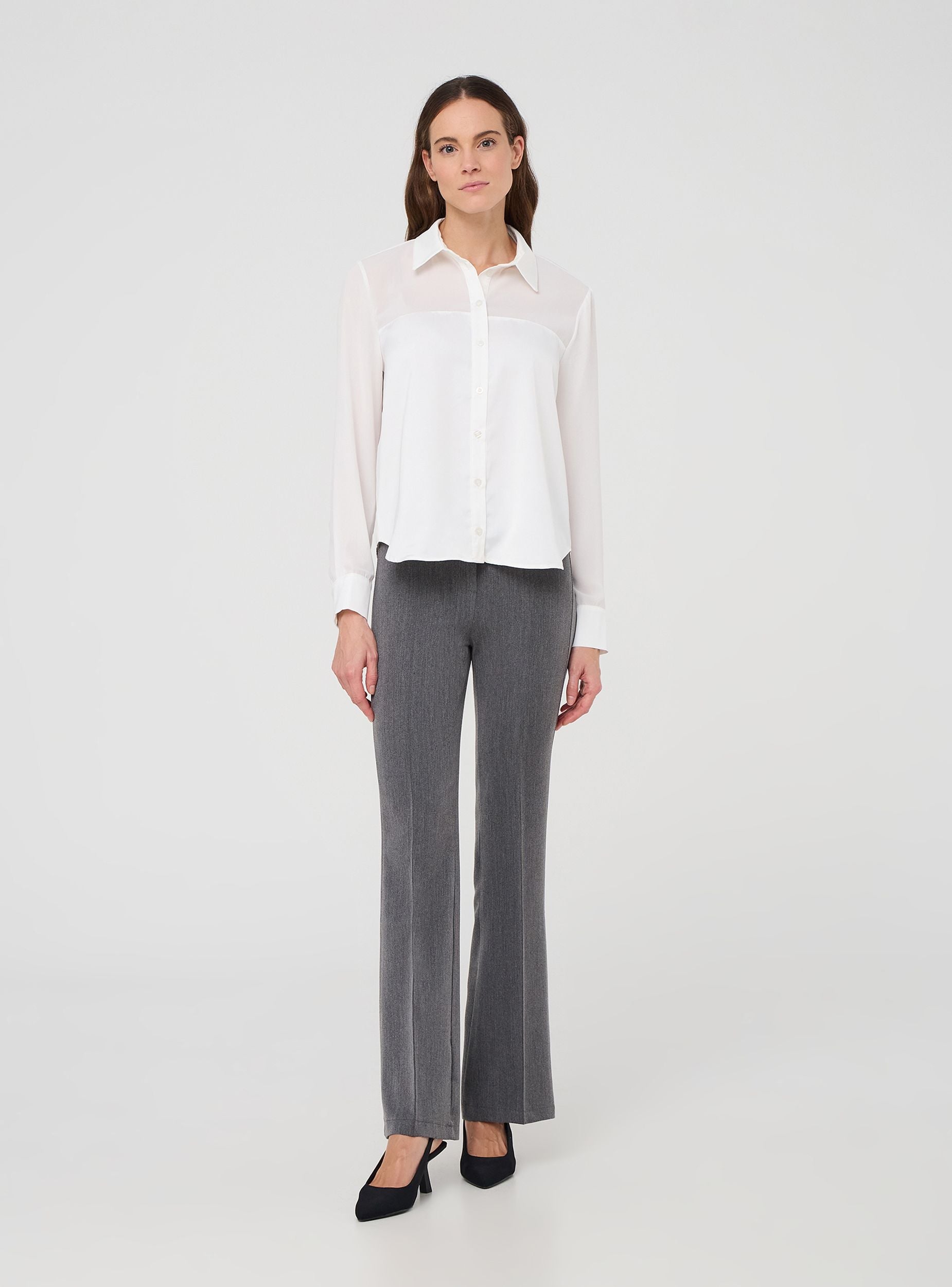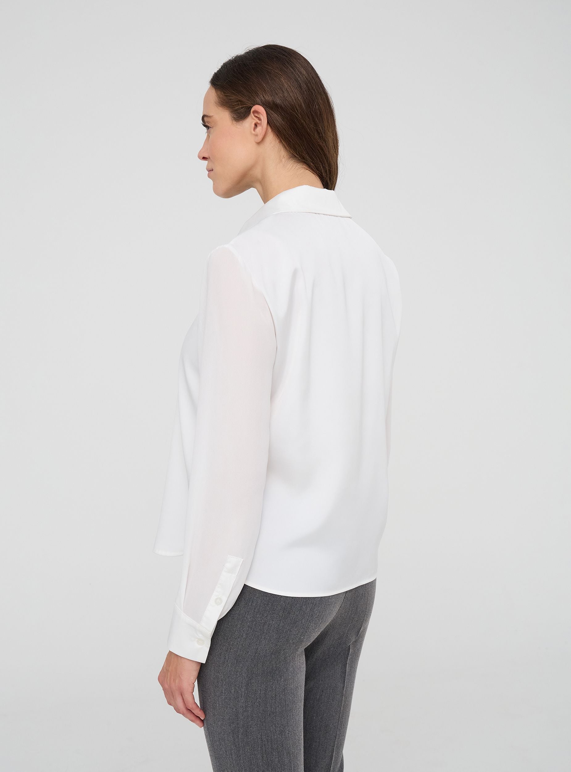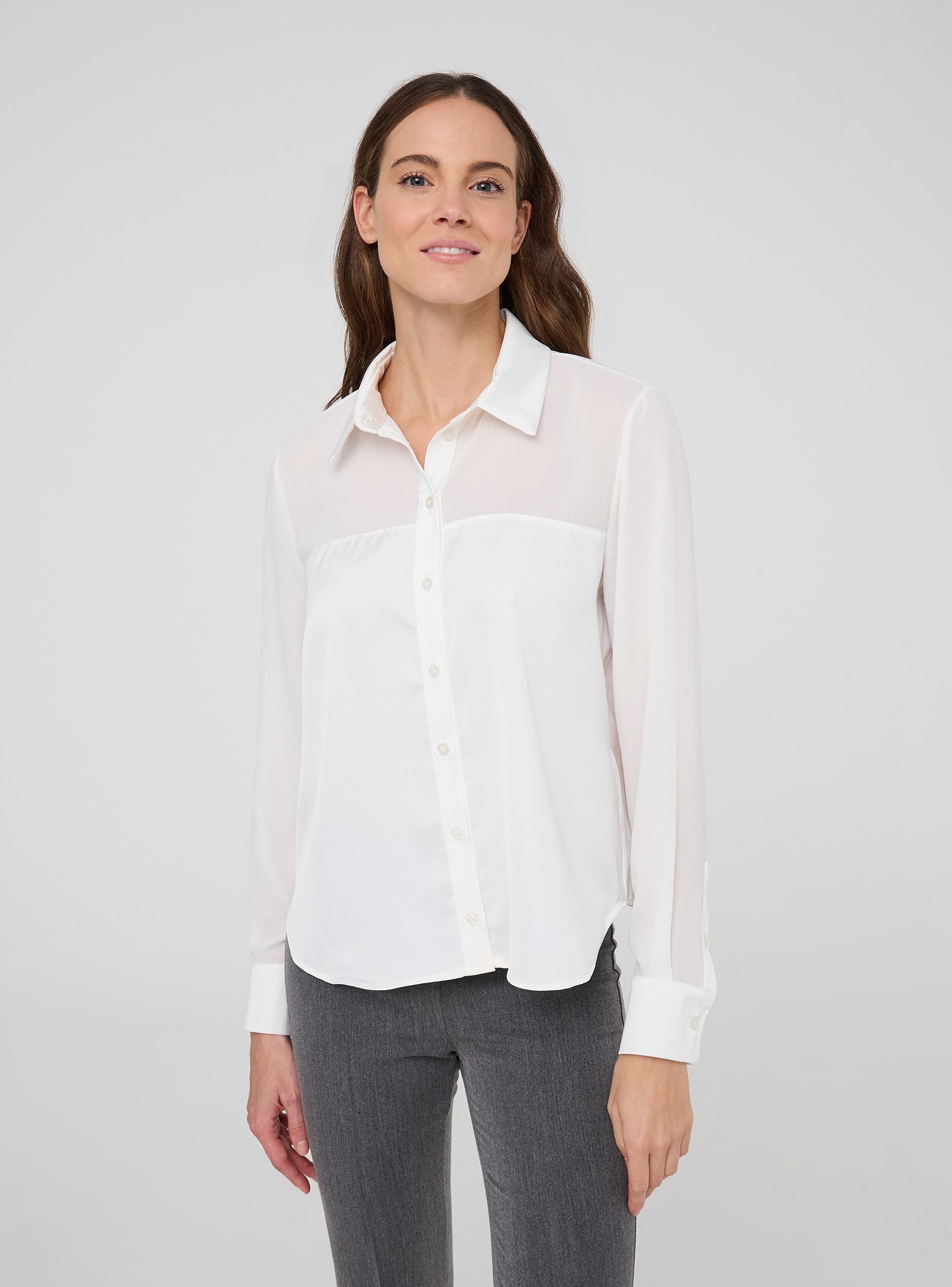Camicia da donna in bitessuto a tinta unita con trasparenze. Coletto classico a camicia, chiusura frontale con bottoni. Perfetta per outfit chic e ricercati.