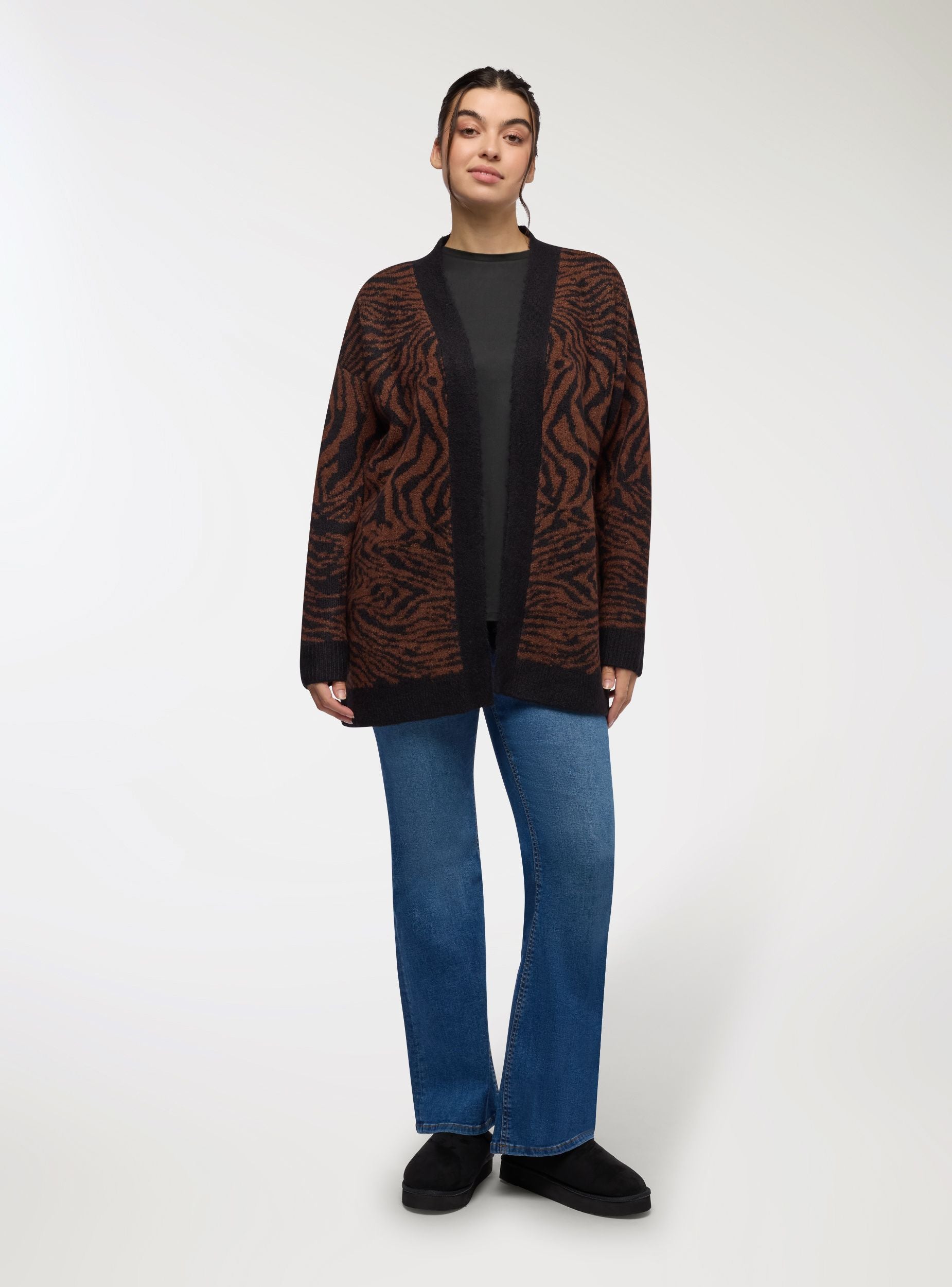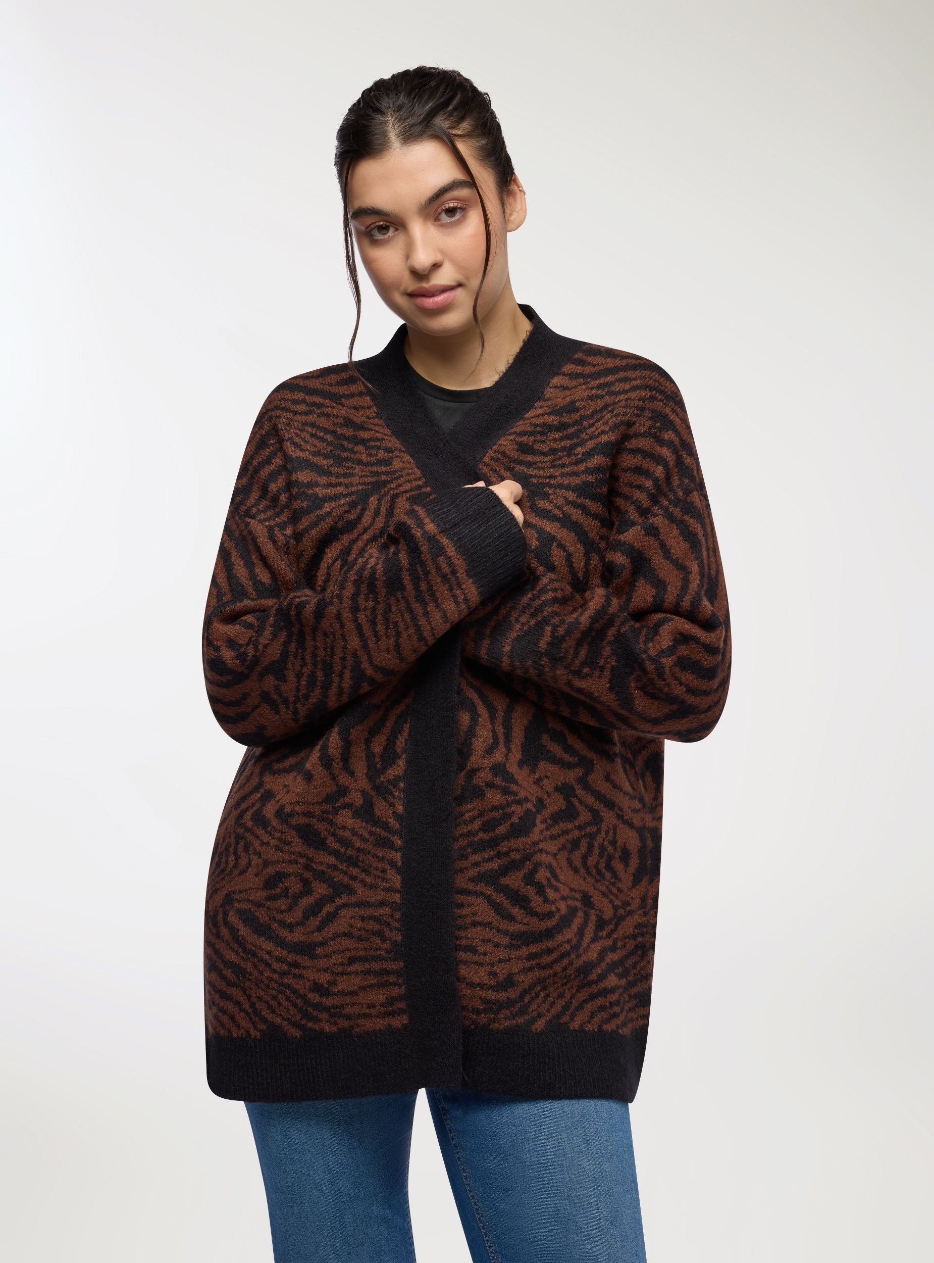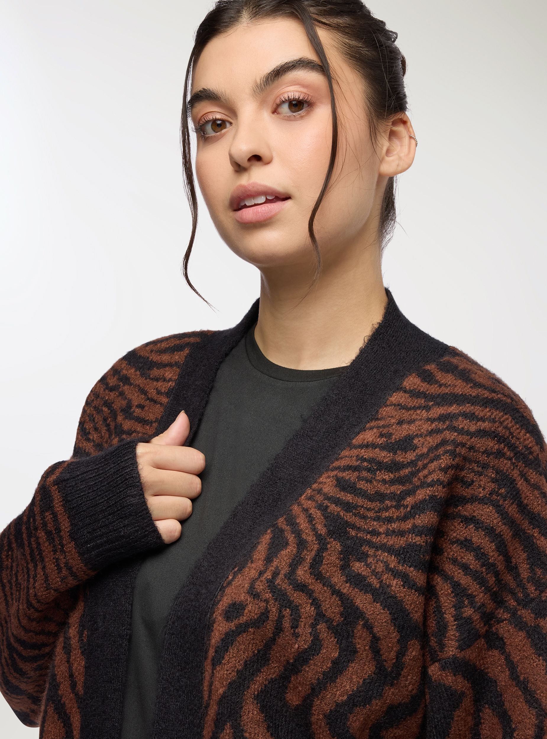 Cardigan da donna aperto con maniche lunghe e fantasia animalier dal forte impatto visivo. Il design senza chiusura lo rende perfetto da indossare con disinvoltura sopra look casual o più ricercati, mentre il motivo zebrato dona grinta e personalità al tuo stile. Ideale per affrontare la stagione con comfort e carattere, è il capo perfetto per chi ama distinguersi senza rinunciare alla praticità.