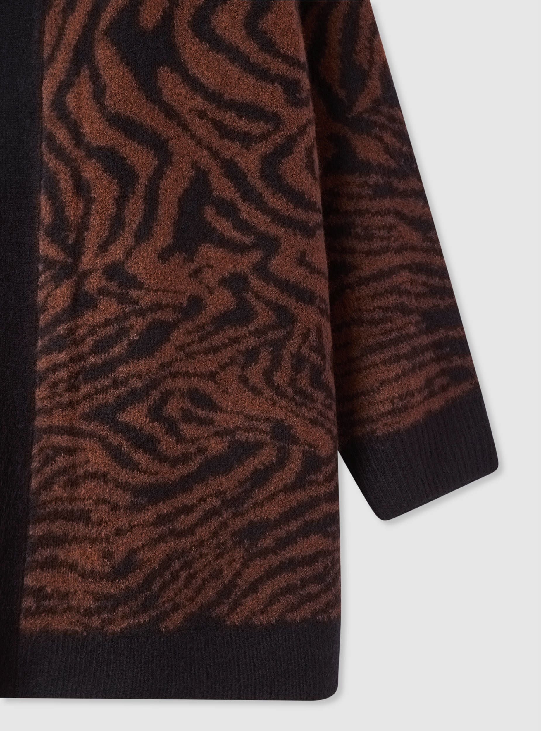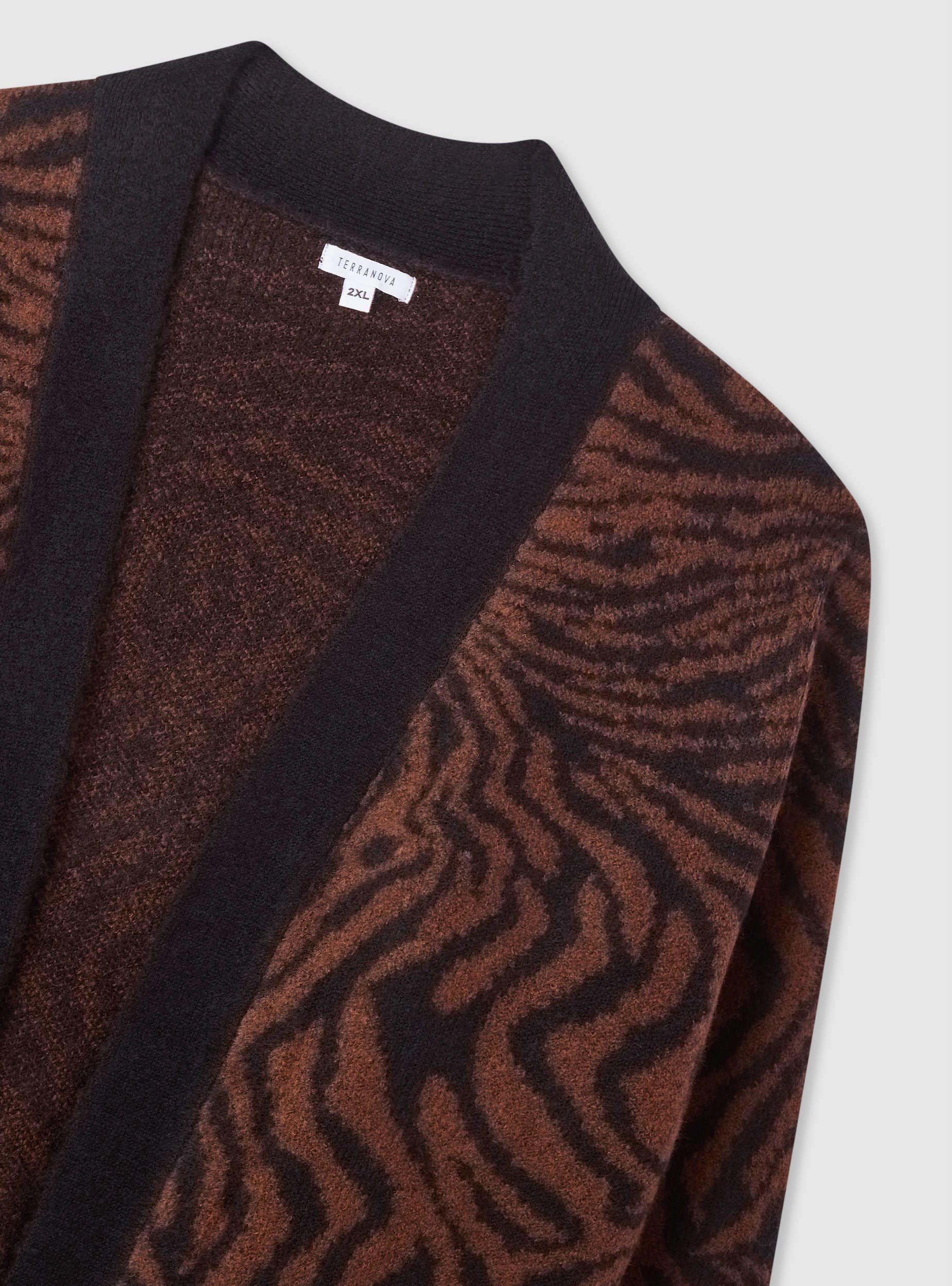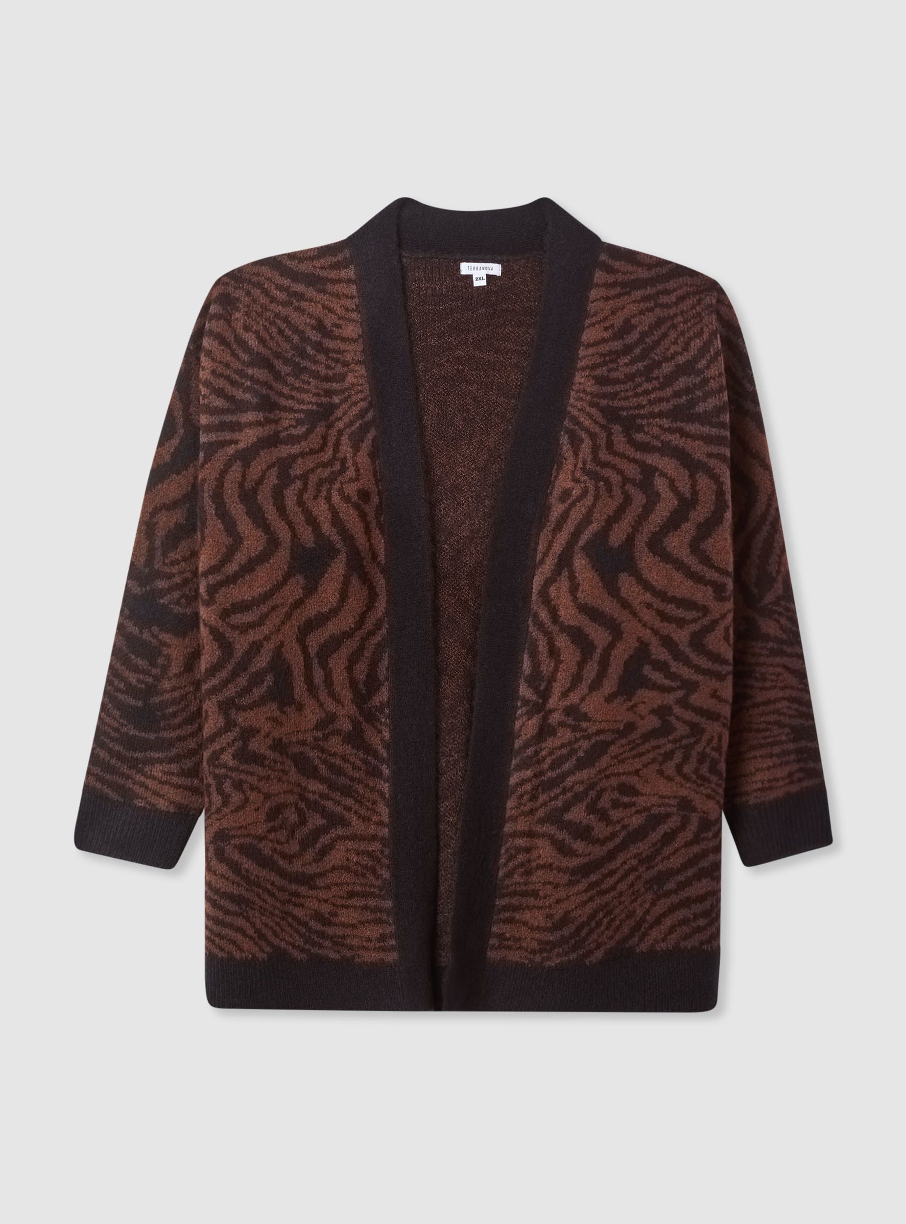 Cardigan da donna aperto con maniche lunghe e fantasia animalier dal forte impatto visivo. Il design senza chiusura lo rende perfetto da indossare con disinvoltura sopra look casual o più ricercati, mentre il motivo zebrato dona grinta e personalità al tuo stile. Ideale per affrontare la stagione con comfort e carattere, è il capo perfetto per chi ama distinguersi senza rinunciare alla praticità.
