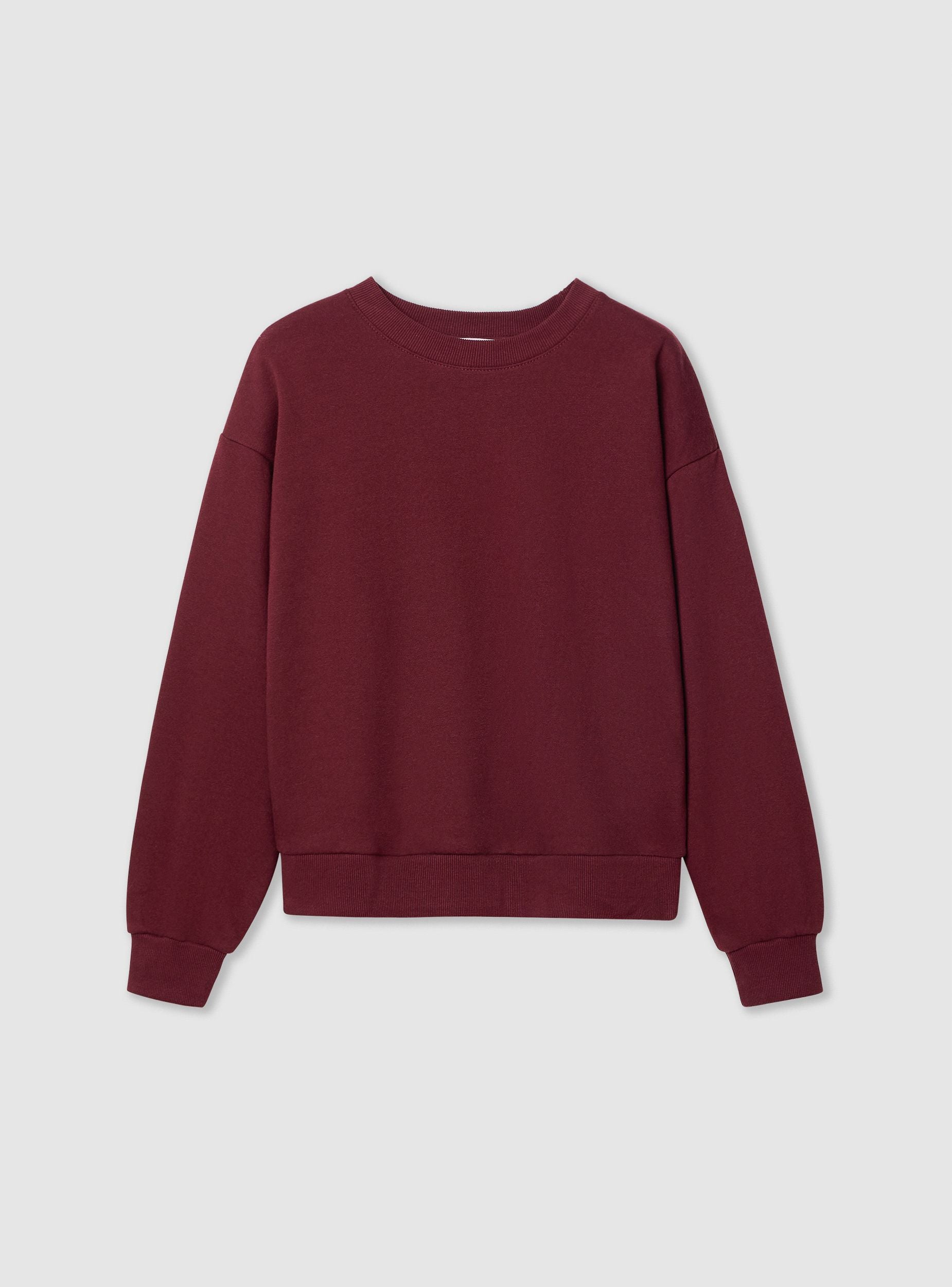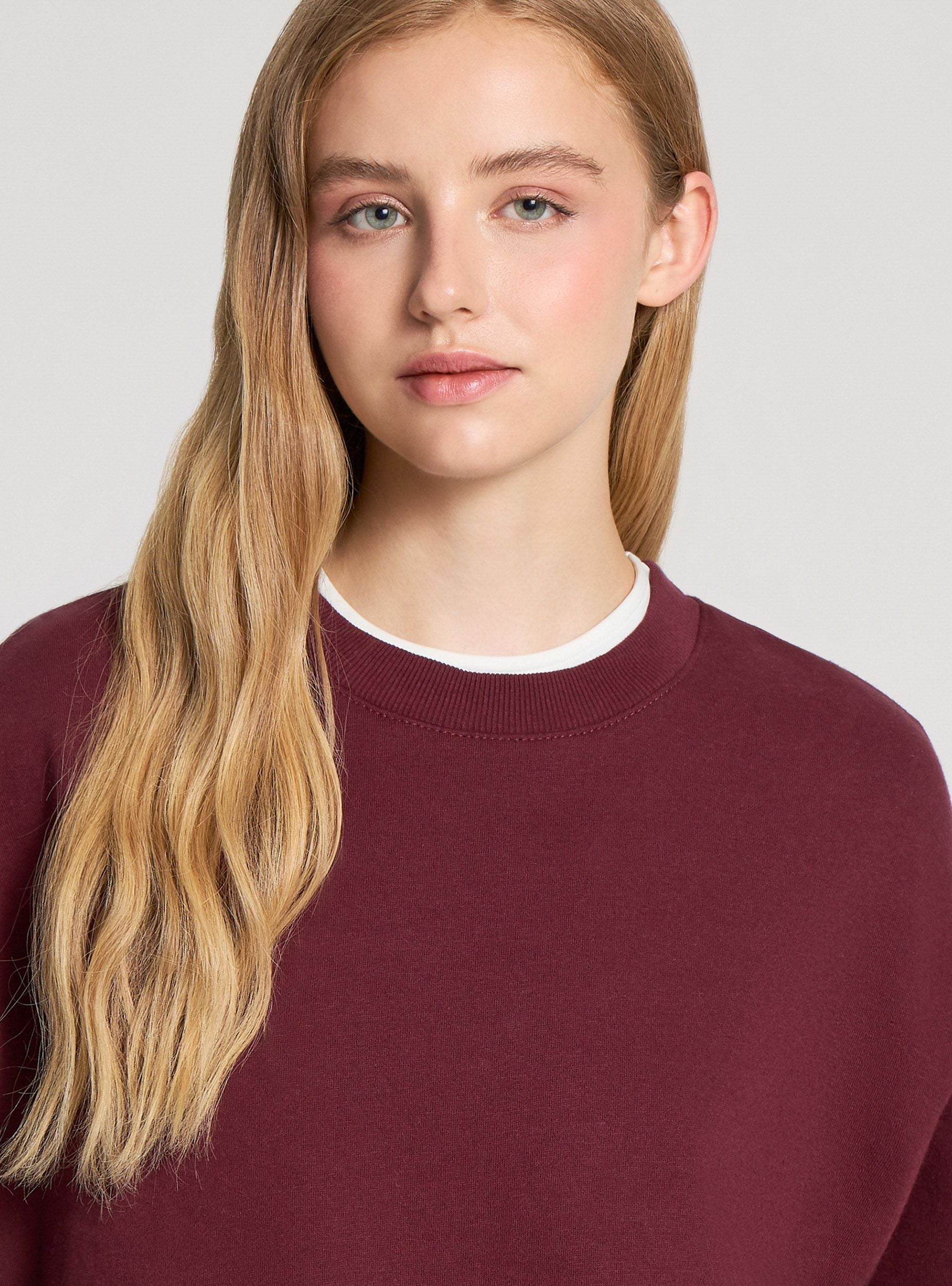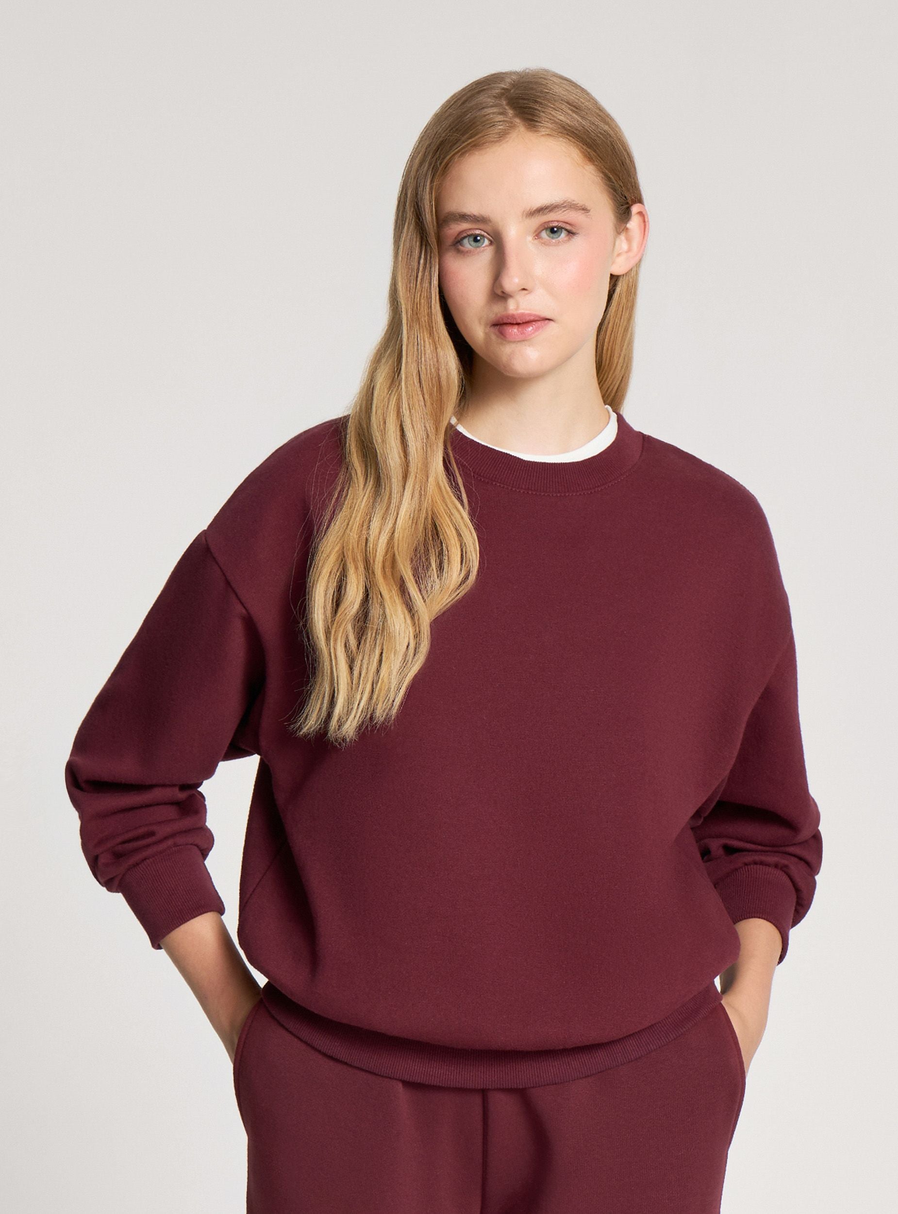 Felpa pesante da donna perfetta per le giornate più fredde. Modello tinta unita senza cappuccio e senza zip, con maniche lunghe e finiture a costine su collo, polsi e fondo. Un capo basic e versatile, ideale da indossare nel tempo libero o per un look casual e confortevole.