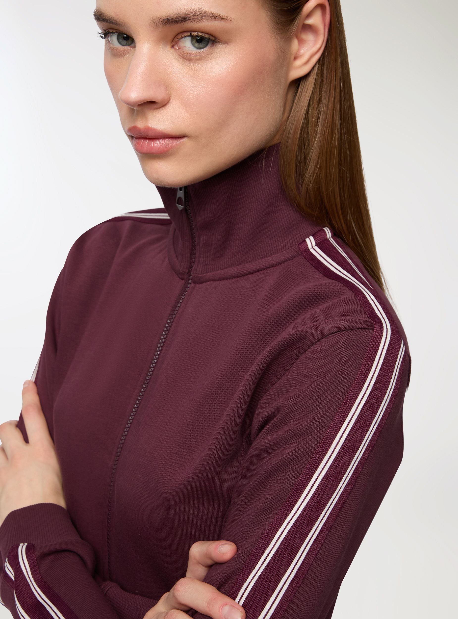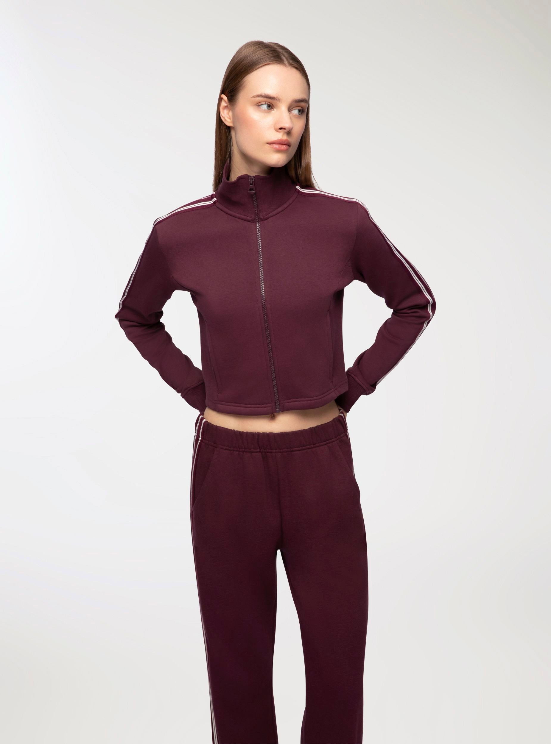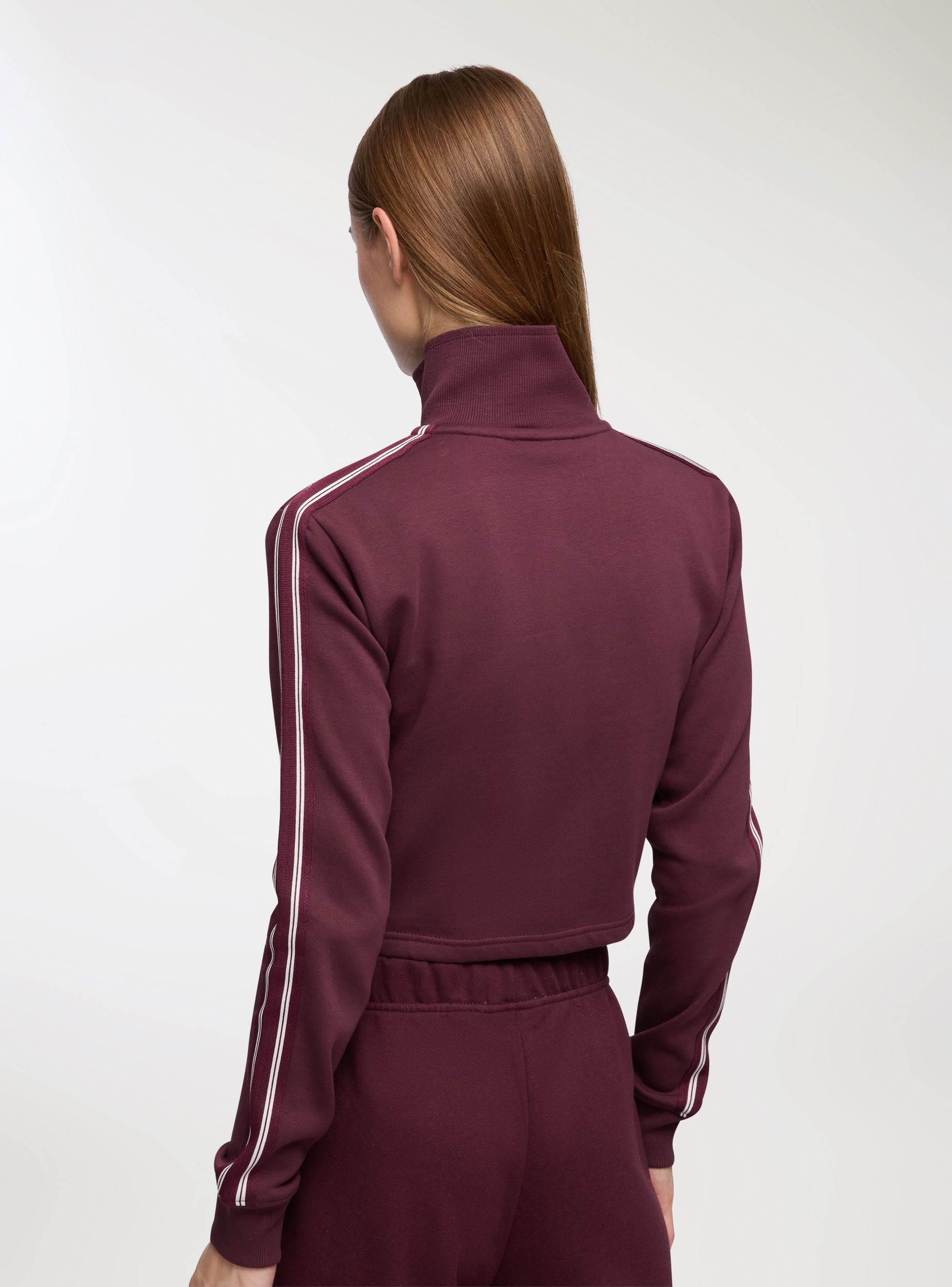 Felpa pesante da donna con taglio crop e bande laterali lungo le maniche per un look sportivo. Modello senza cappuccio, con zip frontale e tasche laterali. Il tessuto pesante garantisce calore e comfort ideali per l’inverno. Collo alto e finiture in costina completano il design.