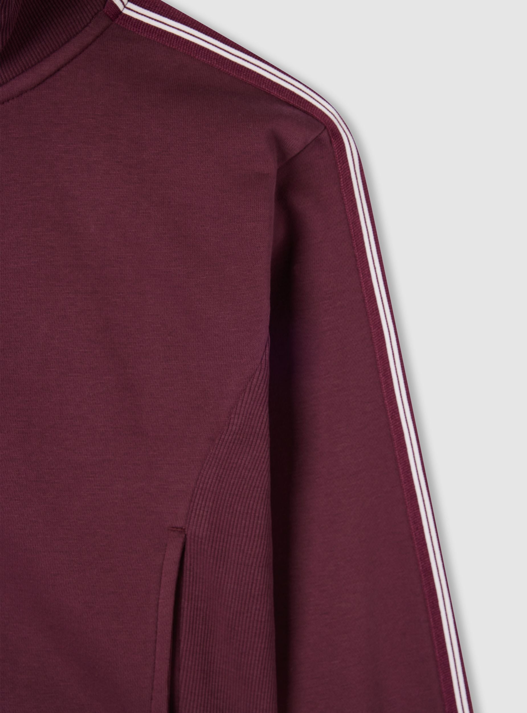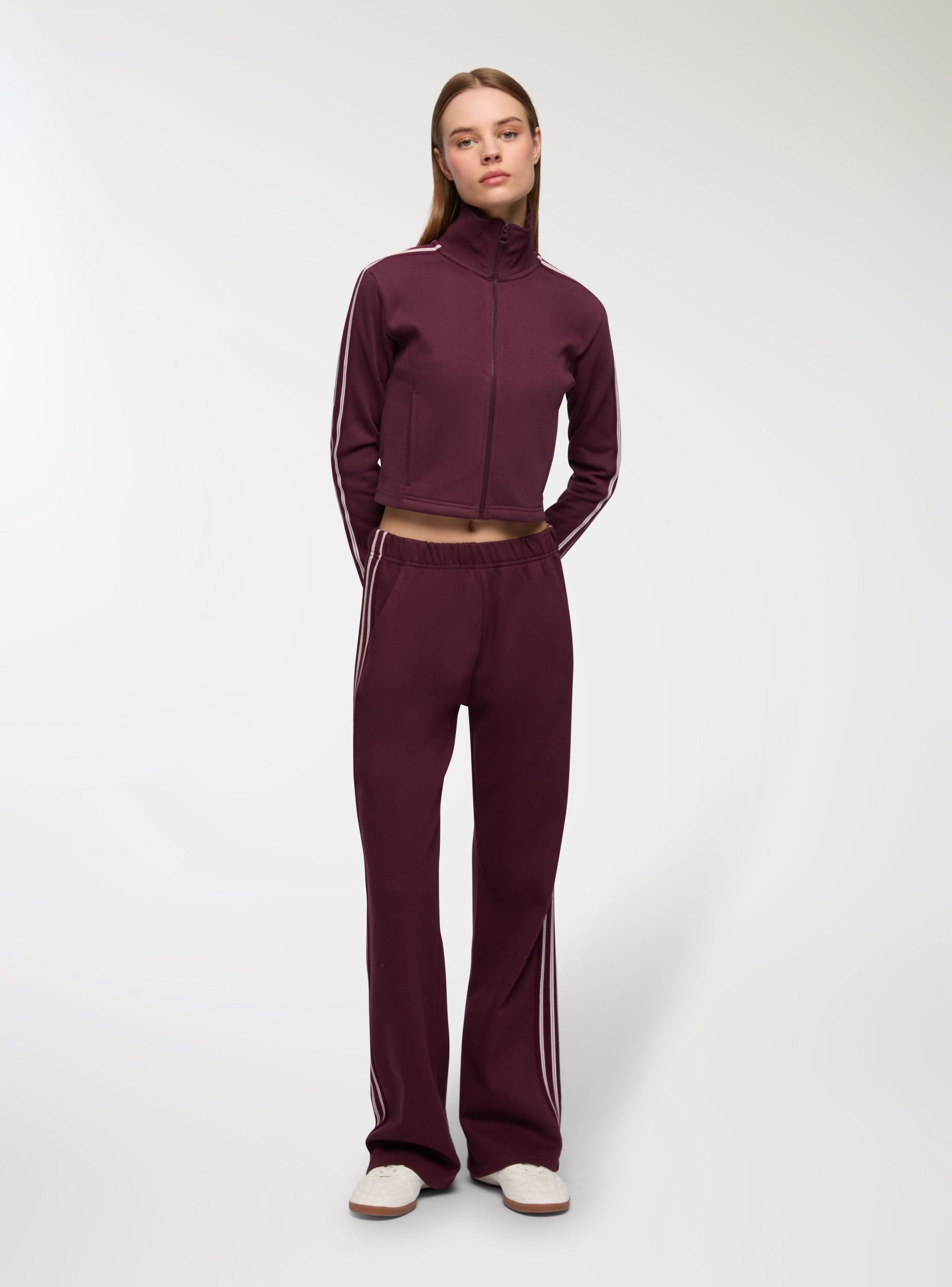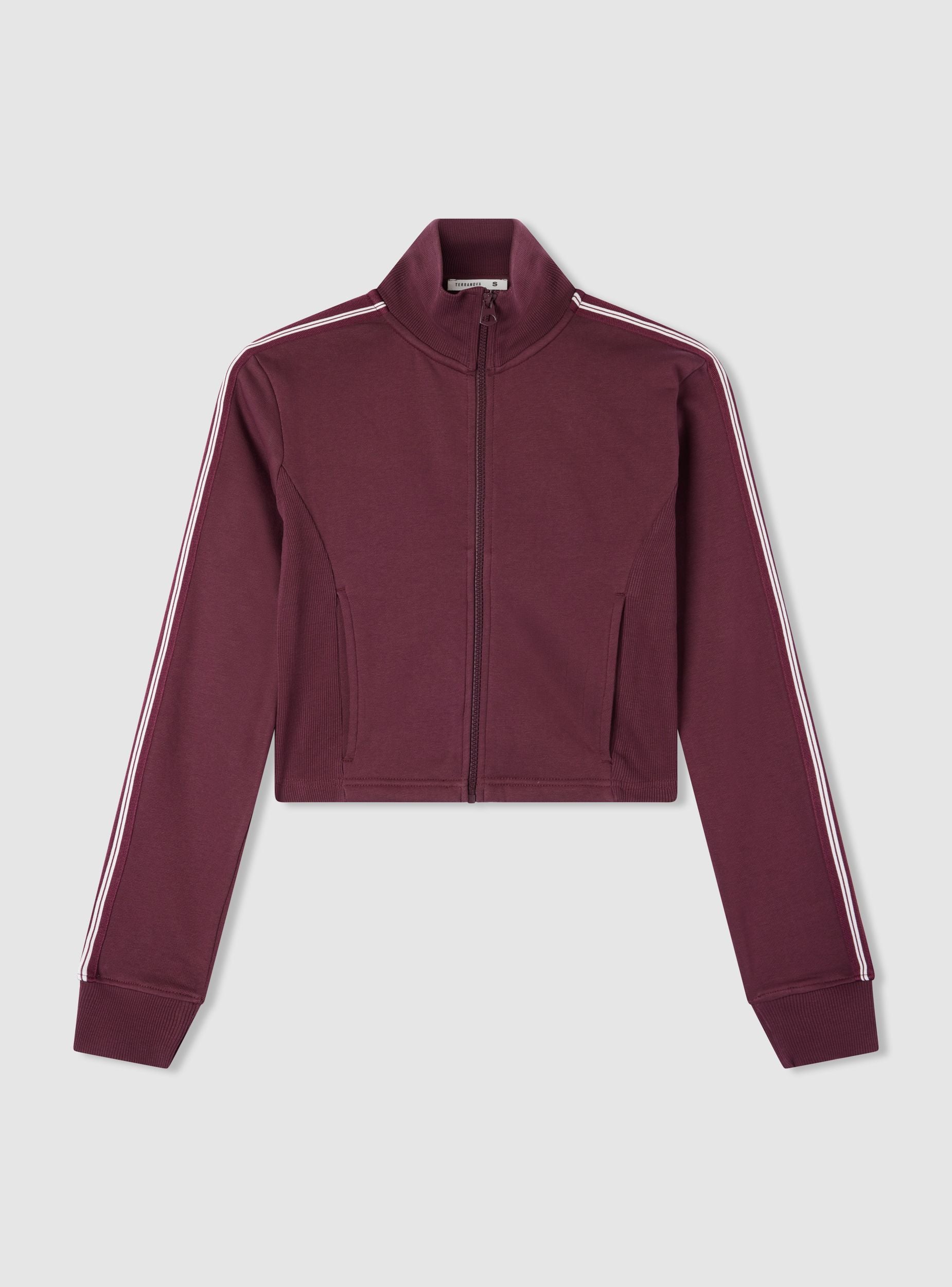 Felpa pesante da donna con taglio crop e bande laterali lungo le maniche per un look sportivo. Modello senza cappuccio, con zip frontale e tasche laterali. Il tessuto pesante garantisce calore e comfort ideali per l’inverno. Collo alto e finiture in costina completano il design.