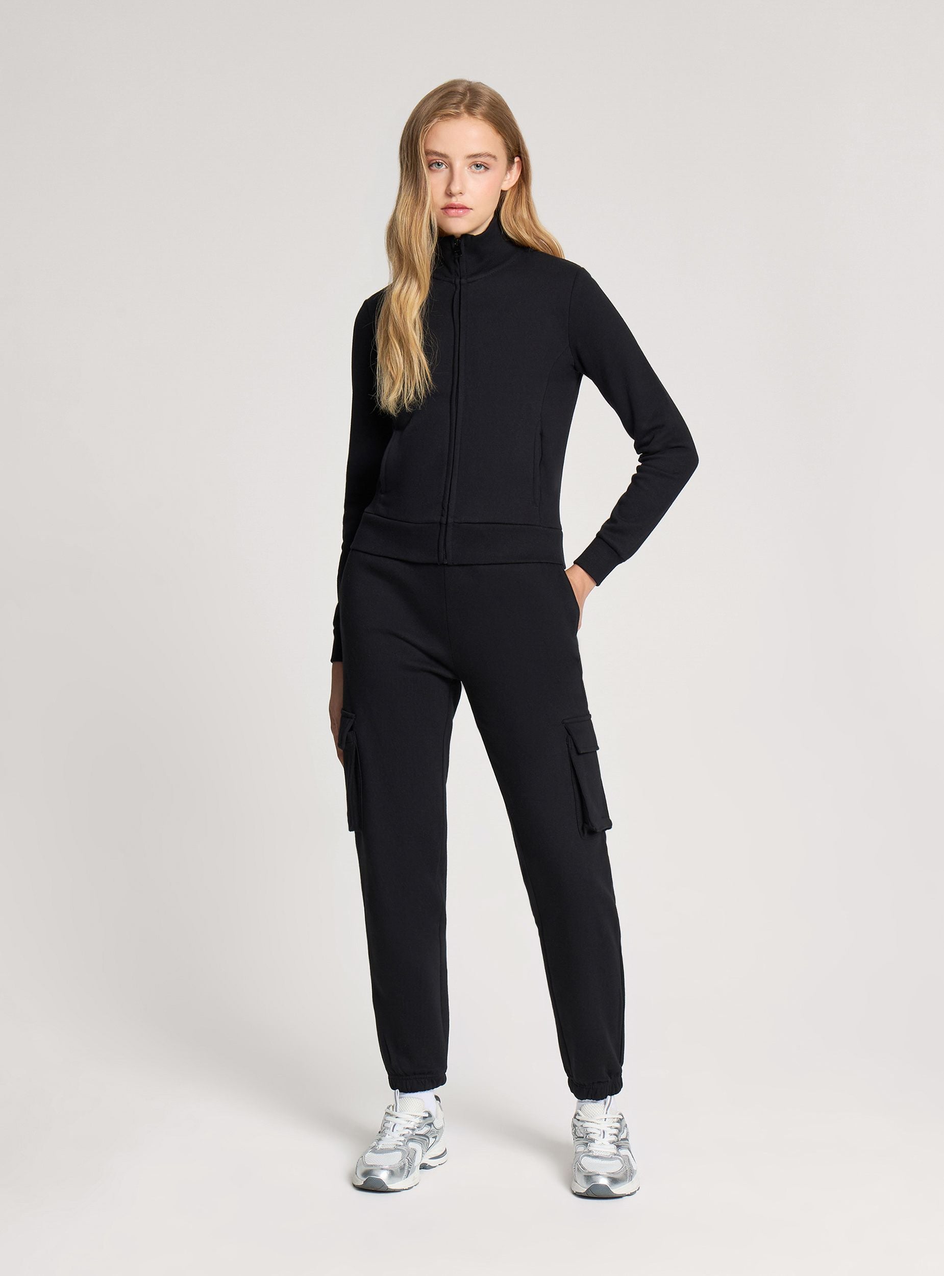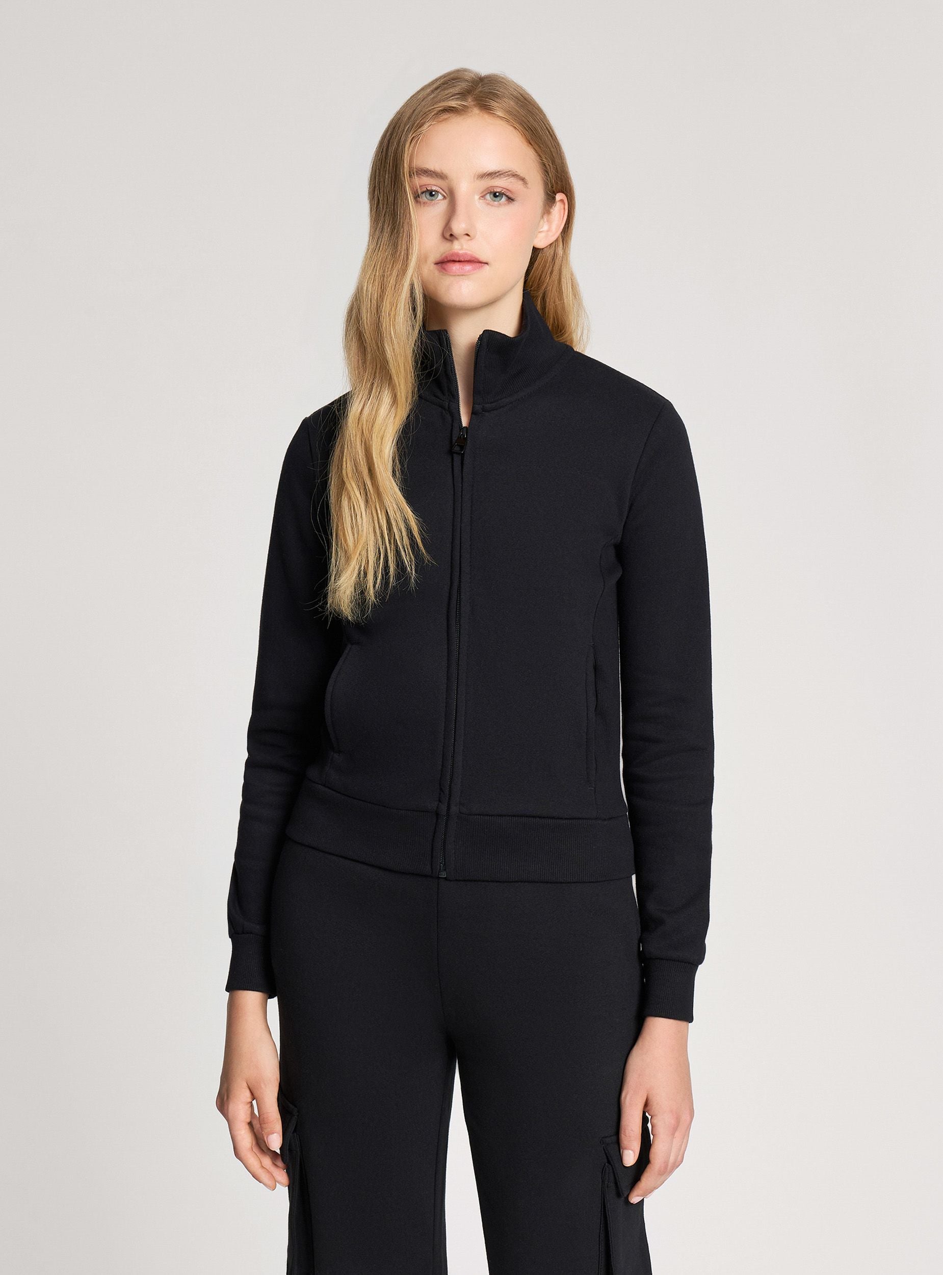 Felpa da donna con zip frontale e collo alto, pensata per offrire comfort e versatilità nelle giornate più fredde. Realizzata in tessuto pesante è perfetta per un look sportivo ma curato. Il design senza cappuccio ne valorizza la linea pulita a tinta unita, mentre le tasche laterali aggiungono praticità. Ideale per il tempo libero, si abbina facilmente a jeans o joggers per uno stile casual e contemporaneo.