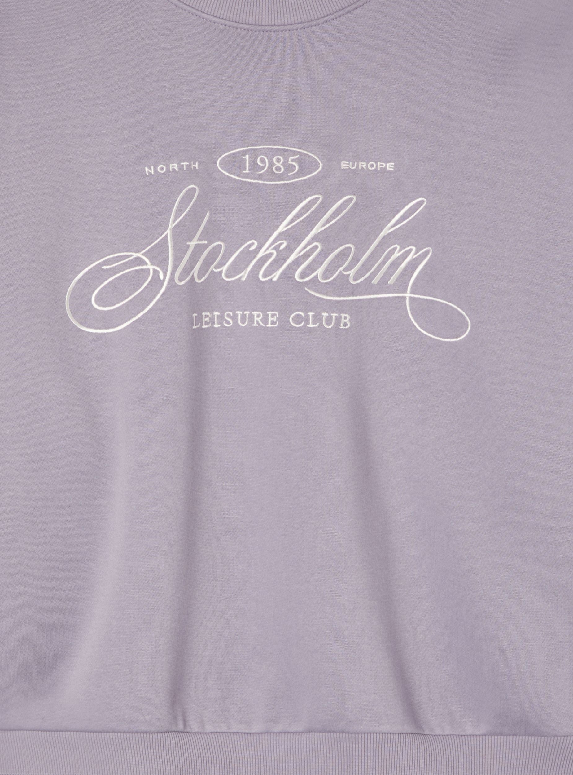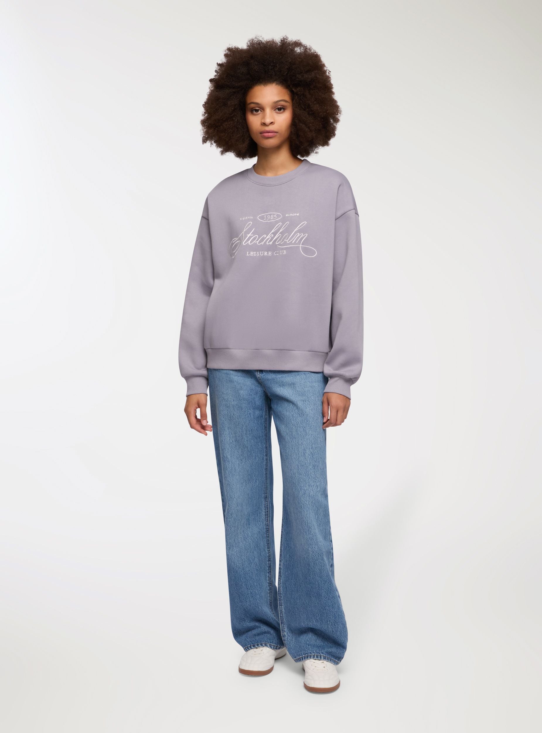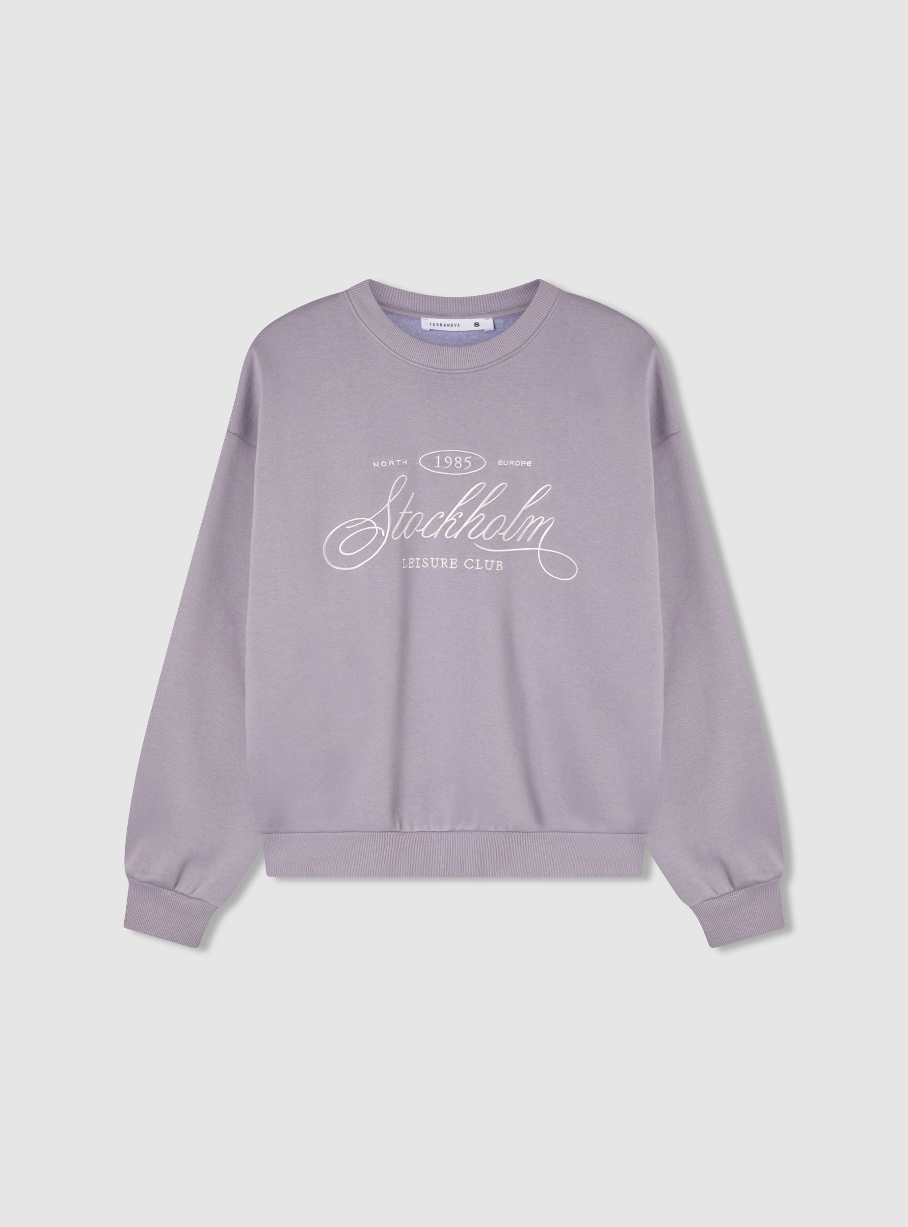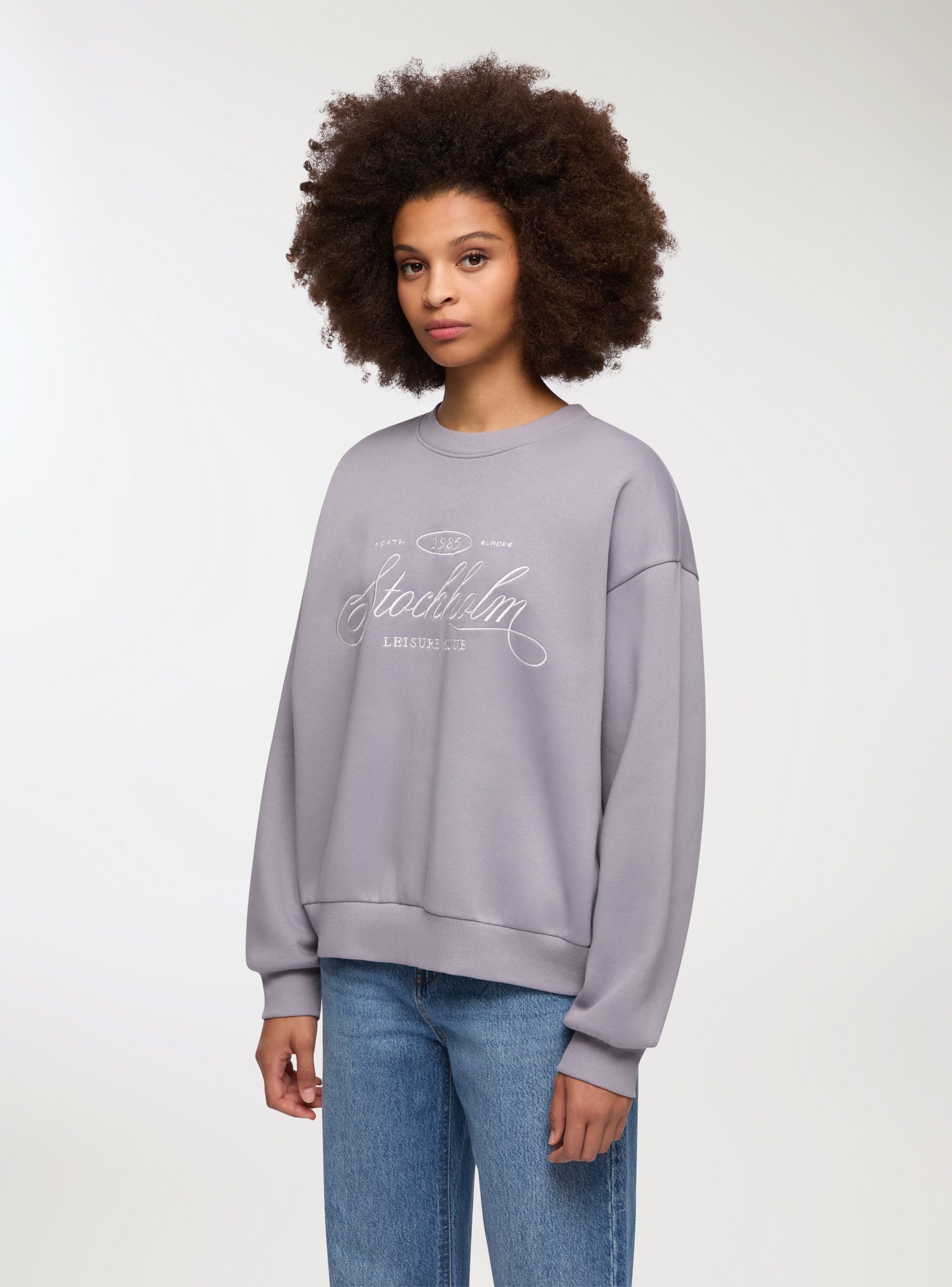 Felpa pesante da donna in stile college con scritta frontale “Stockholm” e altre scritte ricamate. Il fit ampio con spalle scese e fondo a costine garantisce comfort e libertà di movimento, ideale per uno stile casual e contemporaneo. Perfetta per l’inverno, si abbina facilmente a jeans, joggers o pantaloni cargo per creare outfit rilassati ma curati, adatti al tempo libero o alla città.