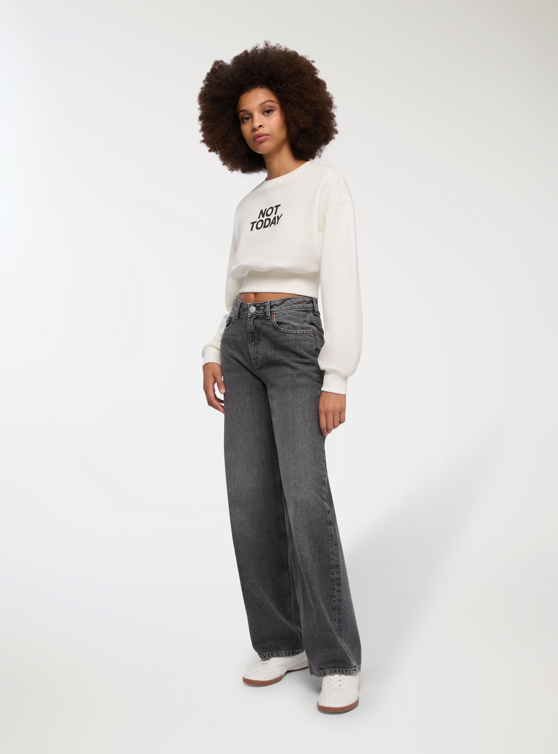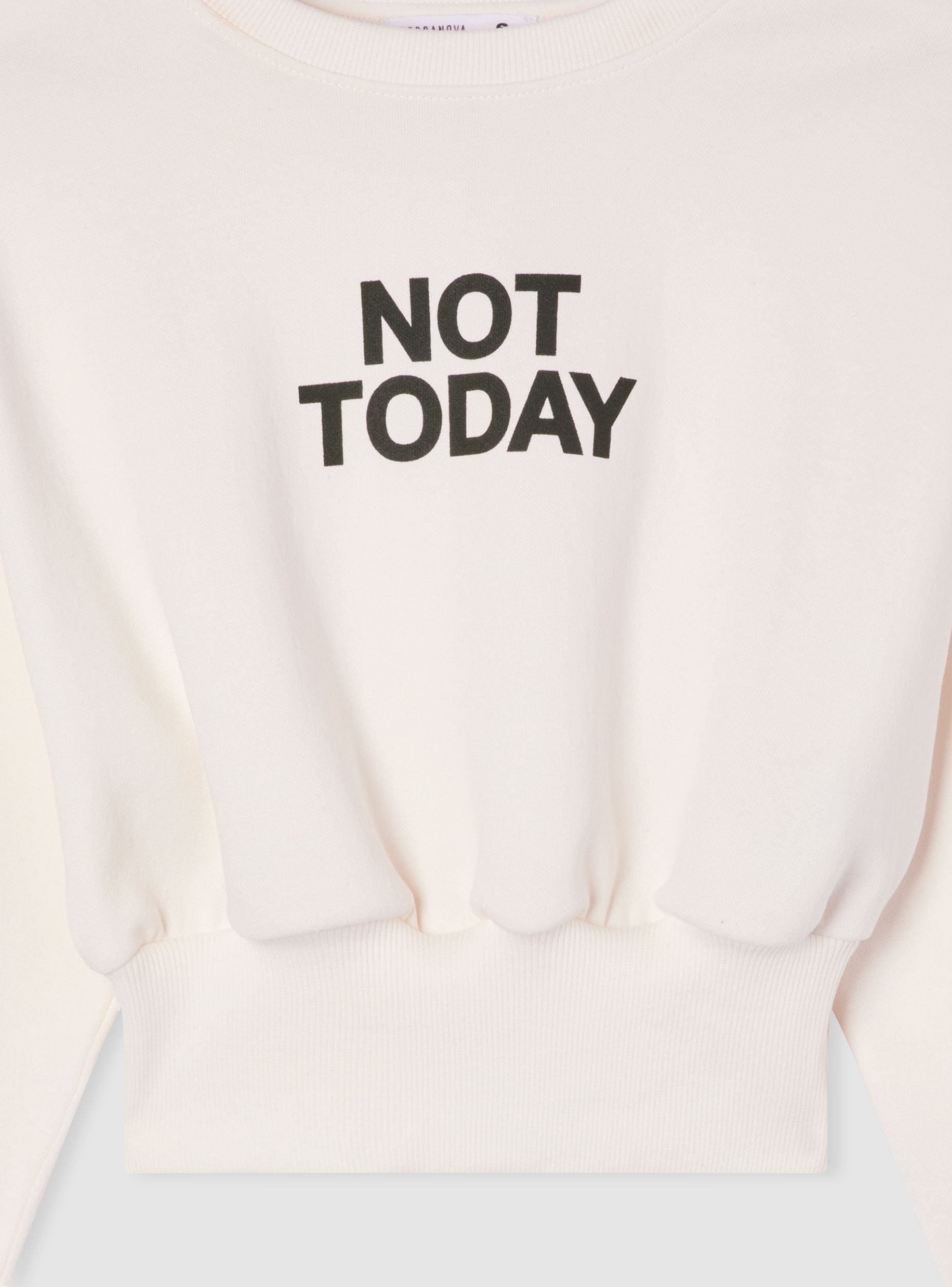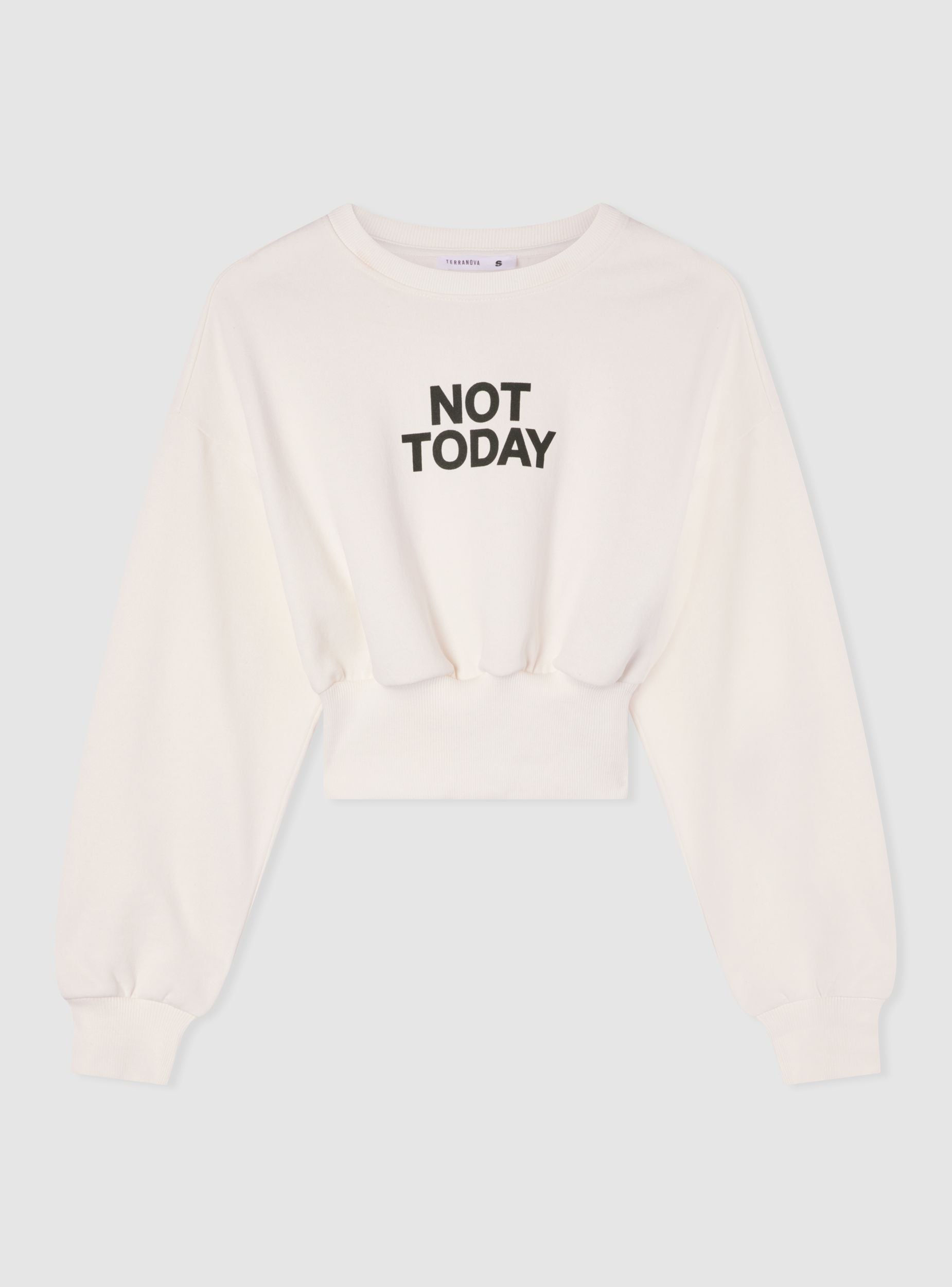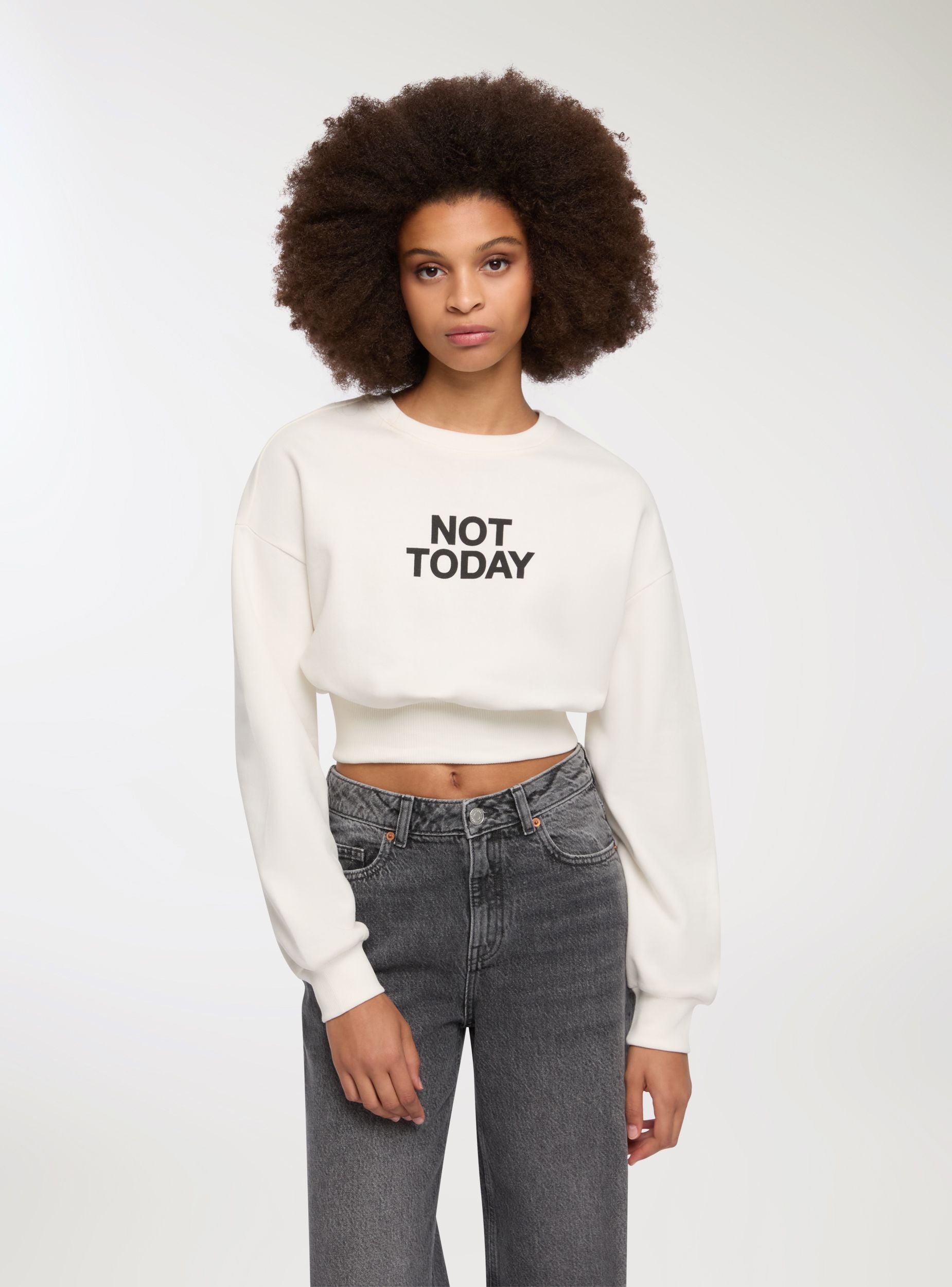 Felpa pesante da donna con scritta “Not Today” stampata sul davanti, perfetta per uno stile ironico e grintoso. Il modello cropped con fascia ampia in vita e polsi a costine valorizza la silhouette e offre una vestibilità confortevole. Realizzata in tessuto felpato è ideale per la stagione invernale. Da indossare con jeans o pantaloni relaxed per un look casual e deciso.
