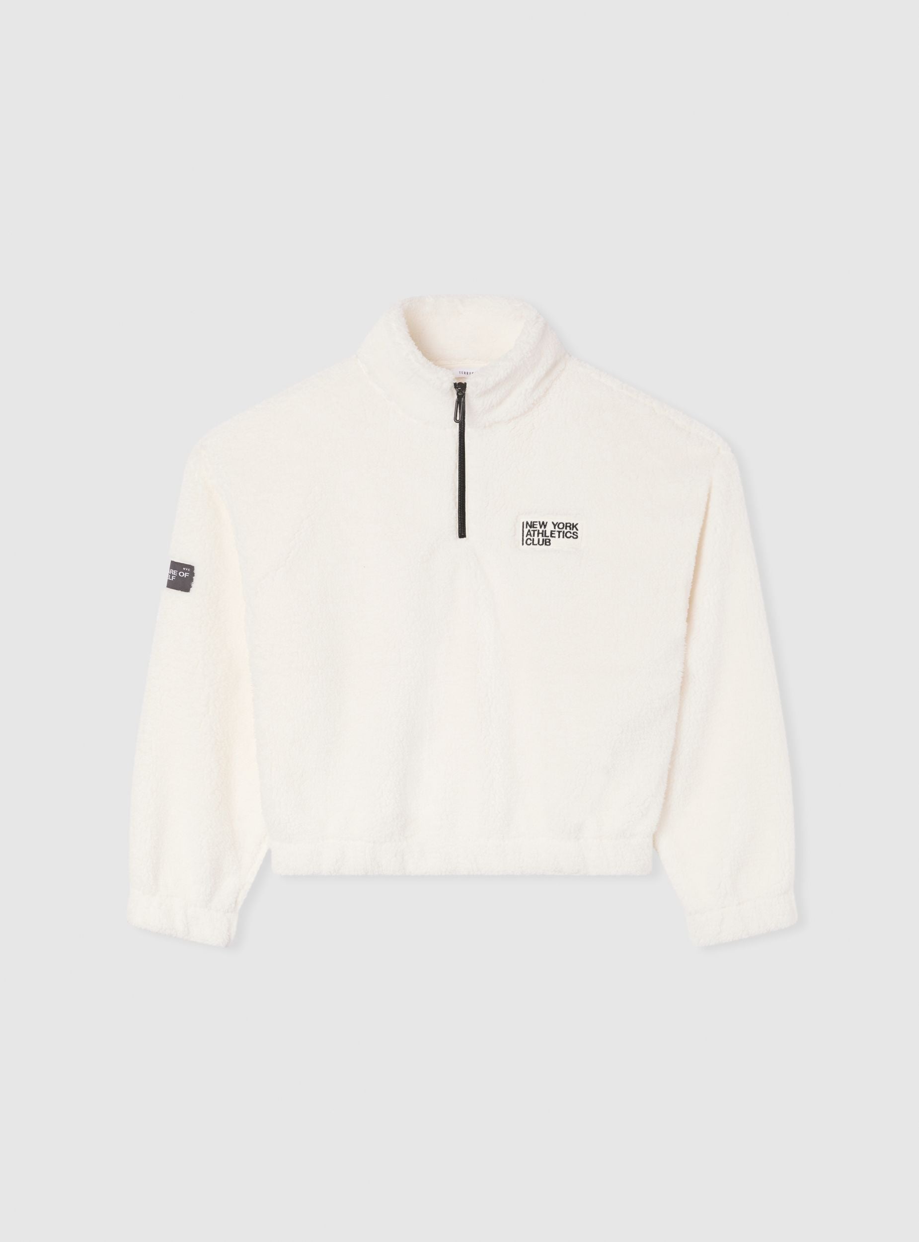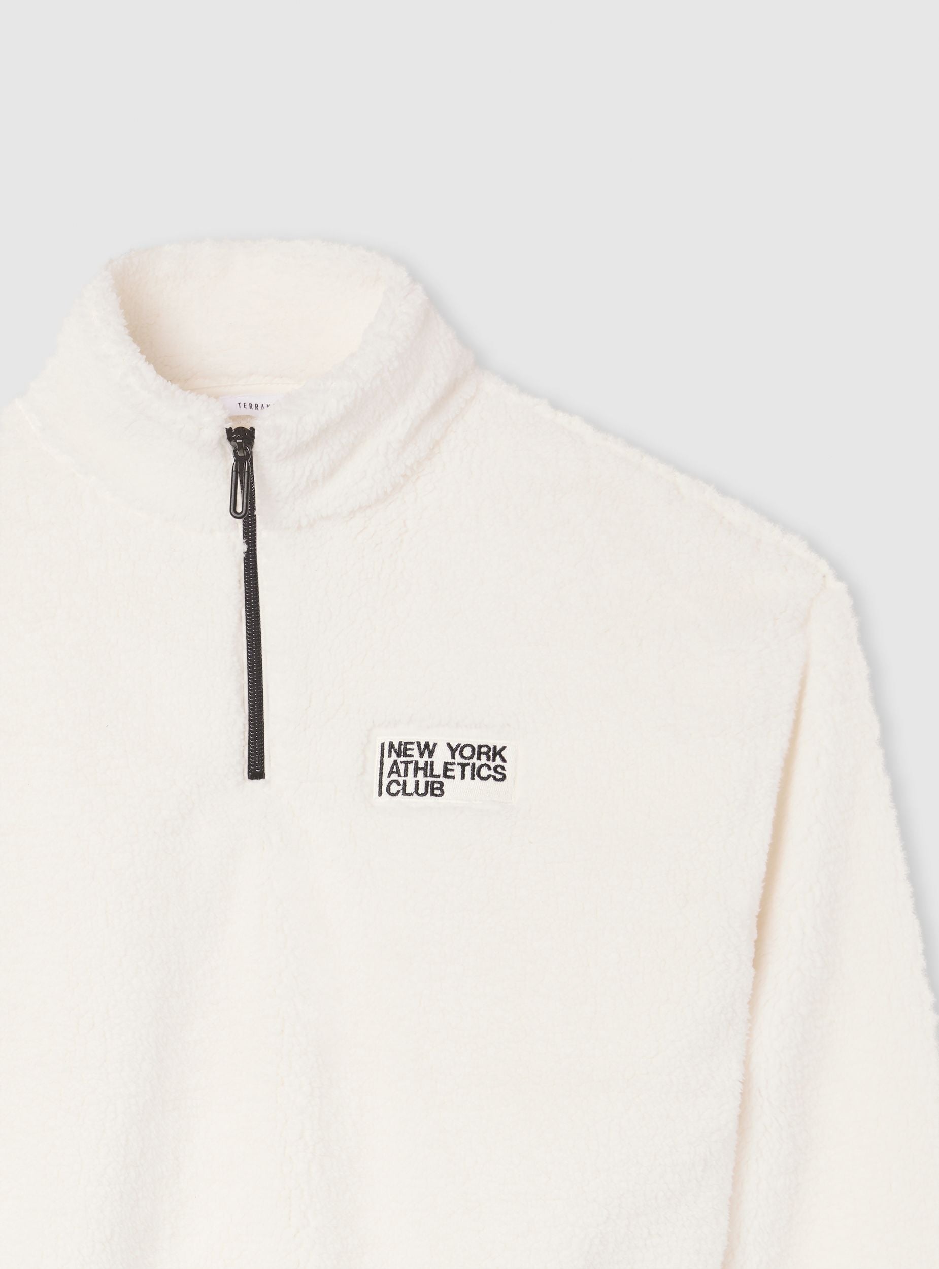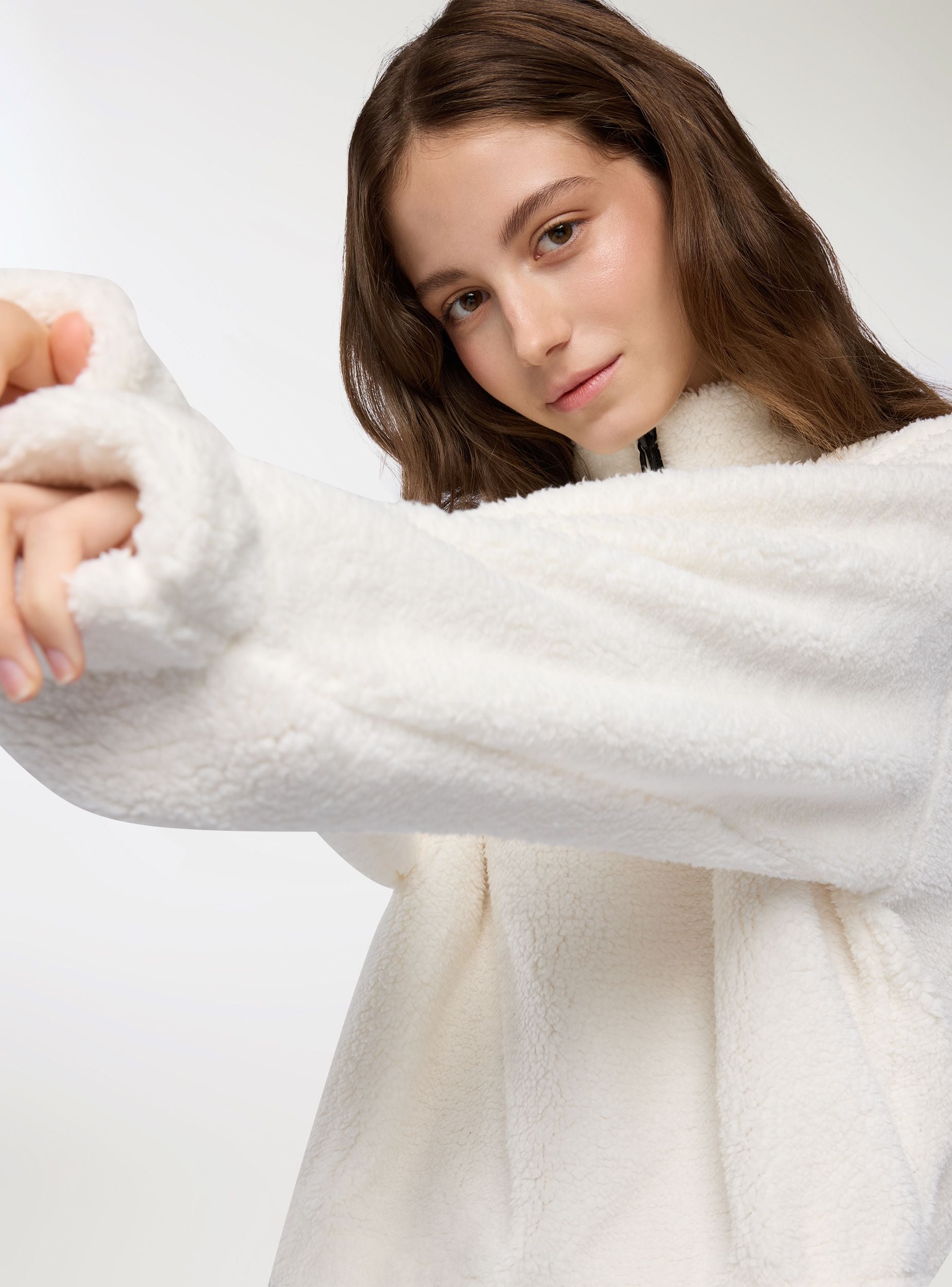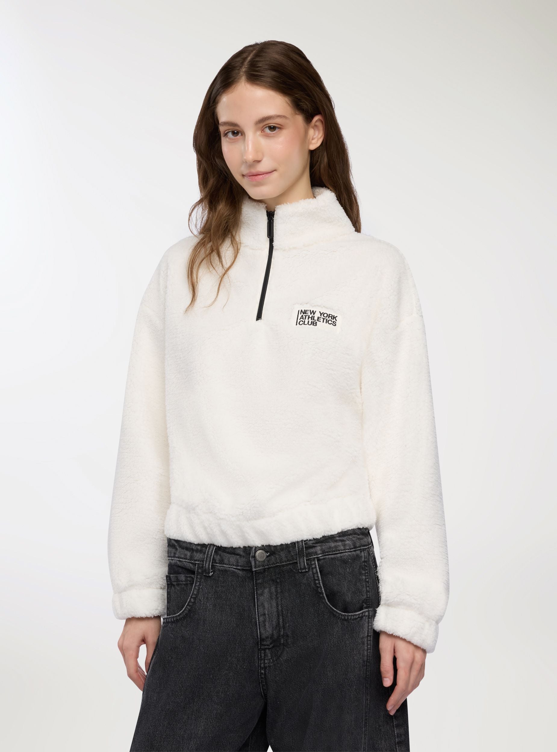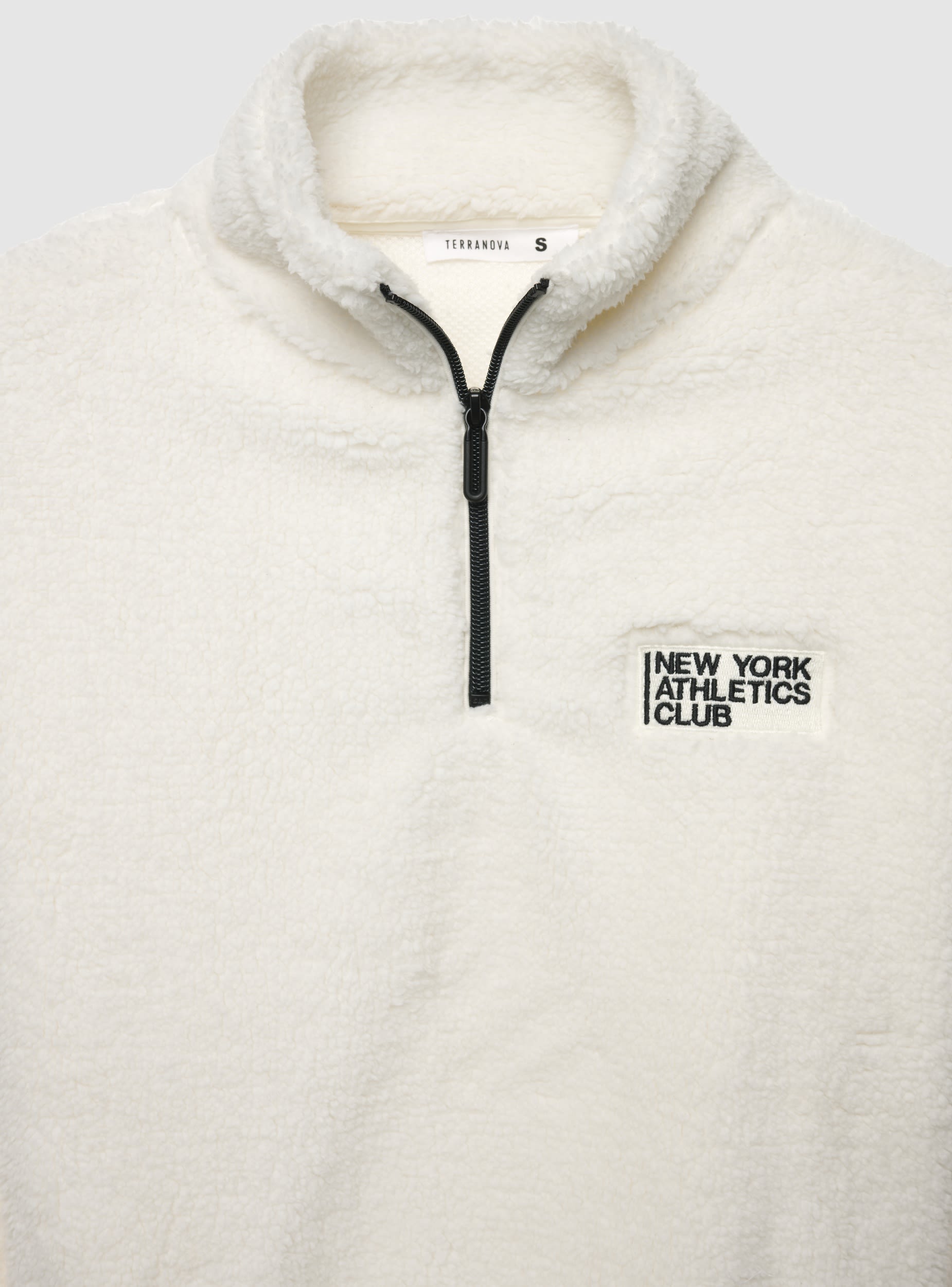 Felpa da donna in morbido sherpa, perfetta per affrontare le giornate più fredde con stile e comfort. Il design presenta una pratica chiusura half zip e un ricamo discreto sul petto che dona un tocco sportivo e contemporaneo. Il taglio regolare e il colletto alto garantiscono protezione dal freddo, rendendola ideale per il tempo libero e i look casual. Un capo caldo e di tendenza per la stagione invernale.