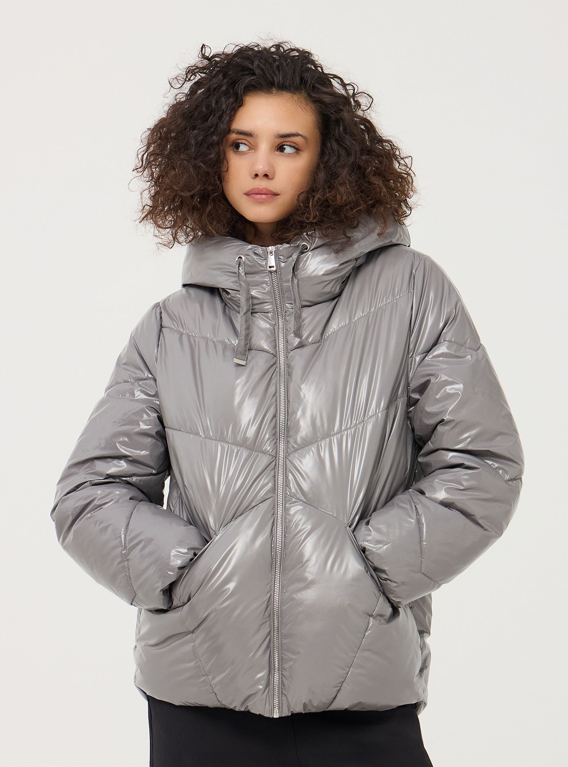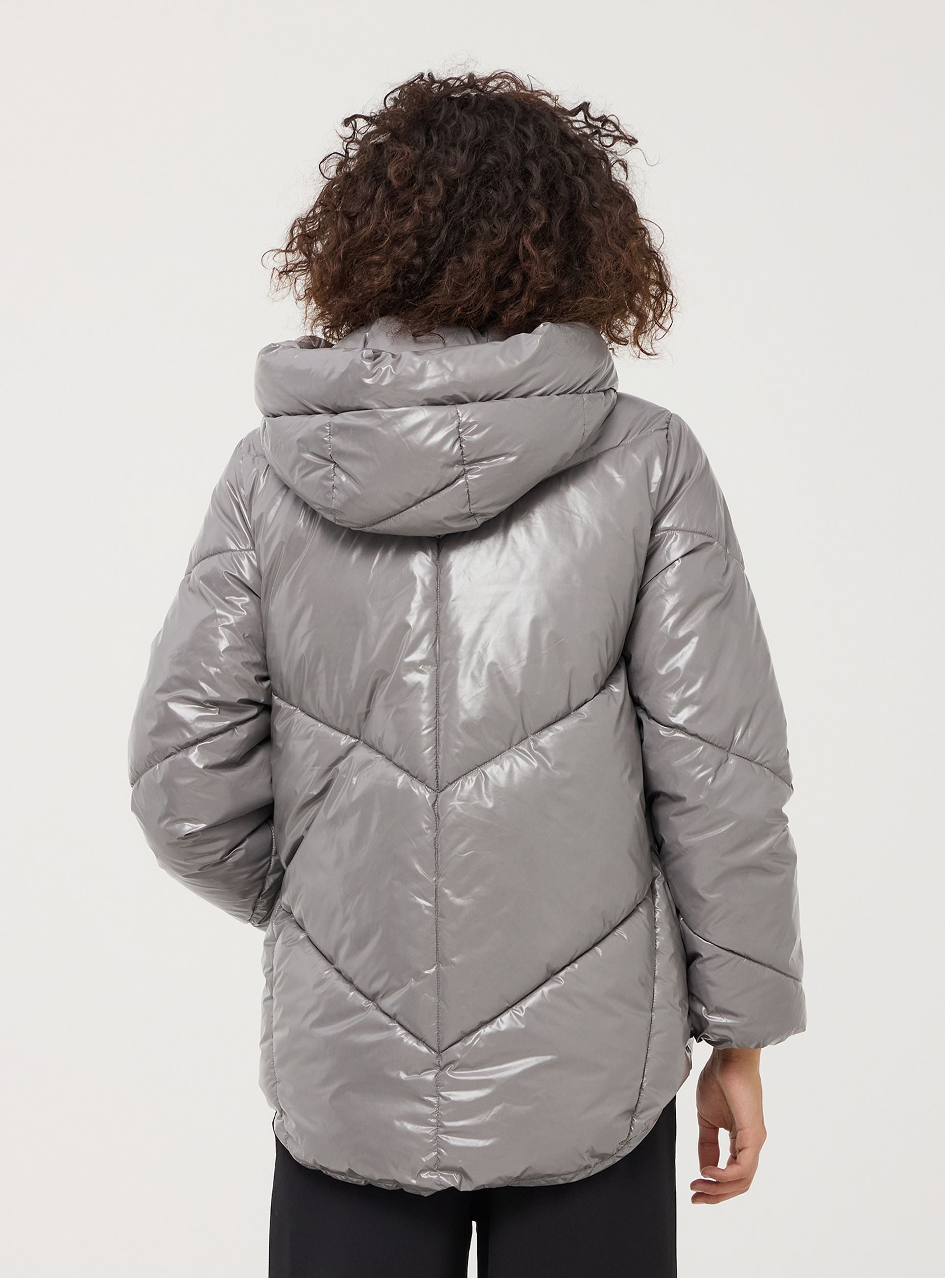 Giubbotto da donna in nylon imbottito con trapuntature a chevron. Tessuto a tinta unita effetto lucido. Modello più lungo sul retro, collo alto e cappuccio, coulisse regolabile, chiusura frontale con zip metallica. Tasche orizzontali invisibili con bottone a pressione. Questo tipo di trapuntatura valorizza la silhouette slanciando particolarmente la figura. Vestibilità oversize.
