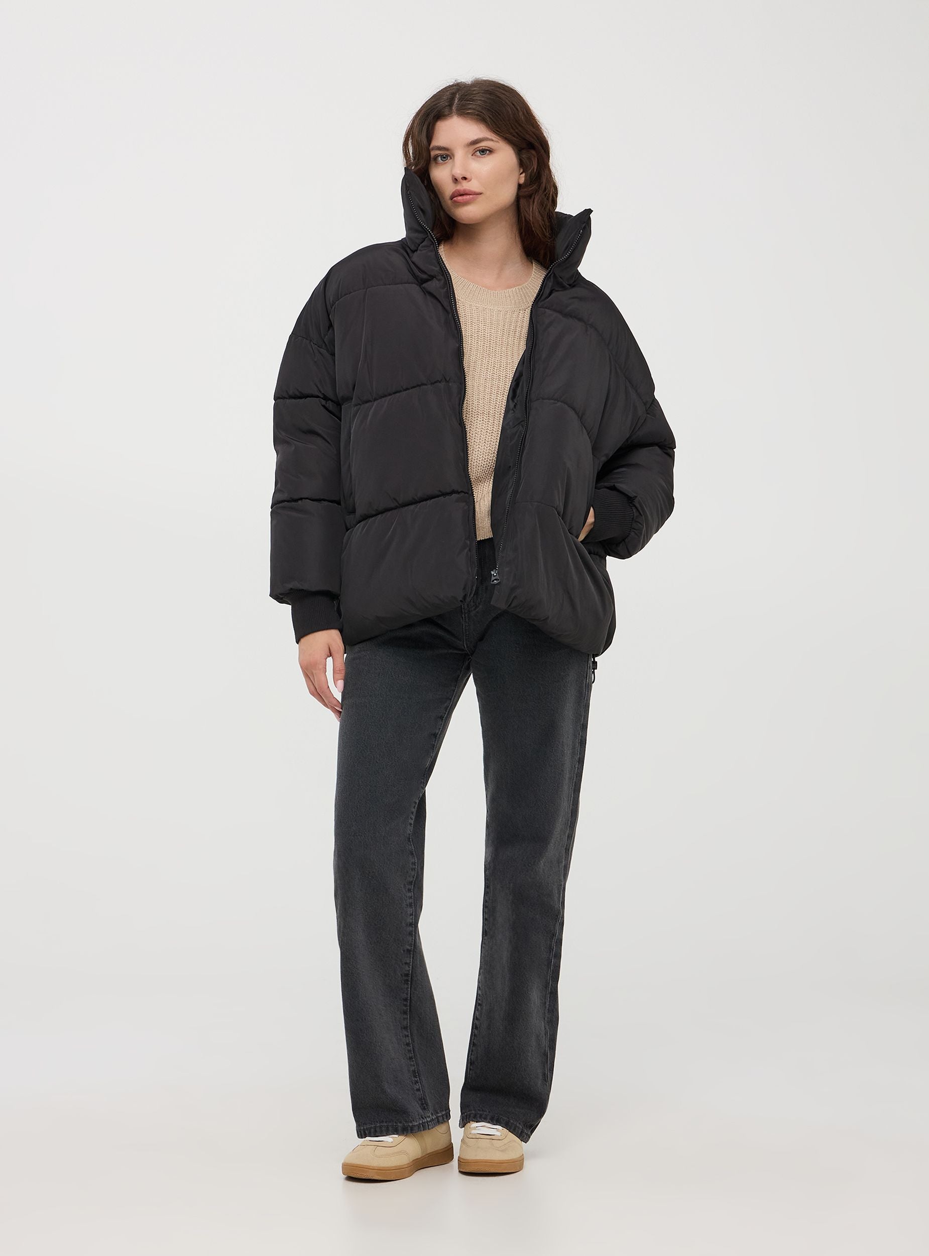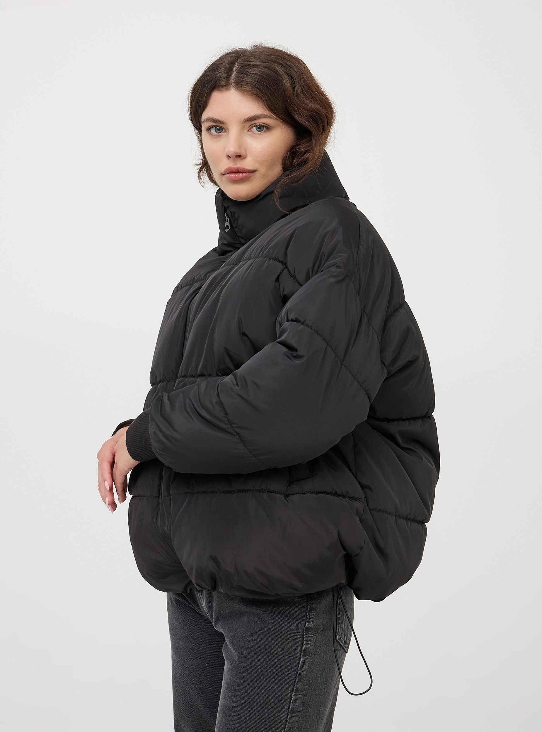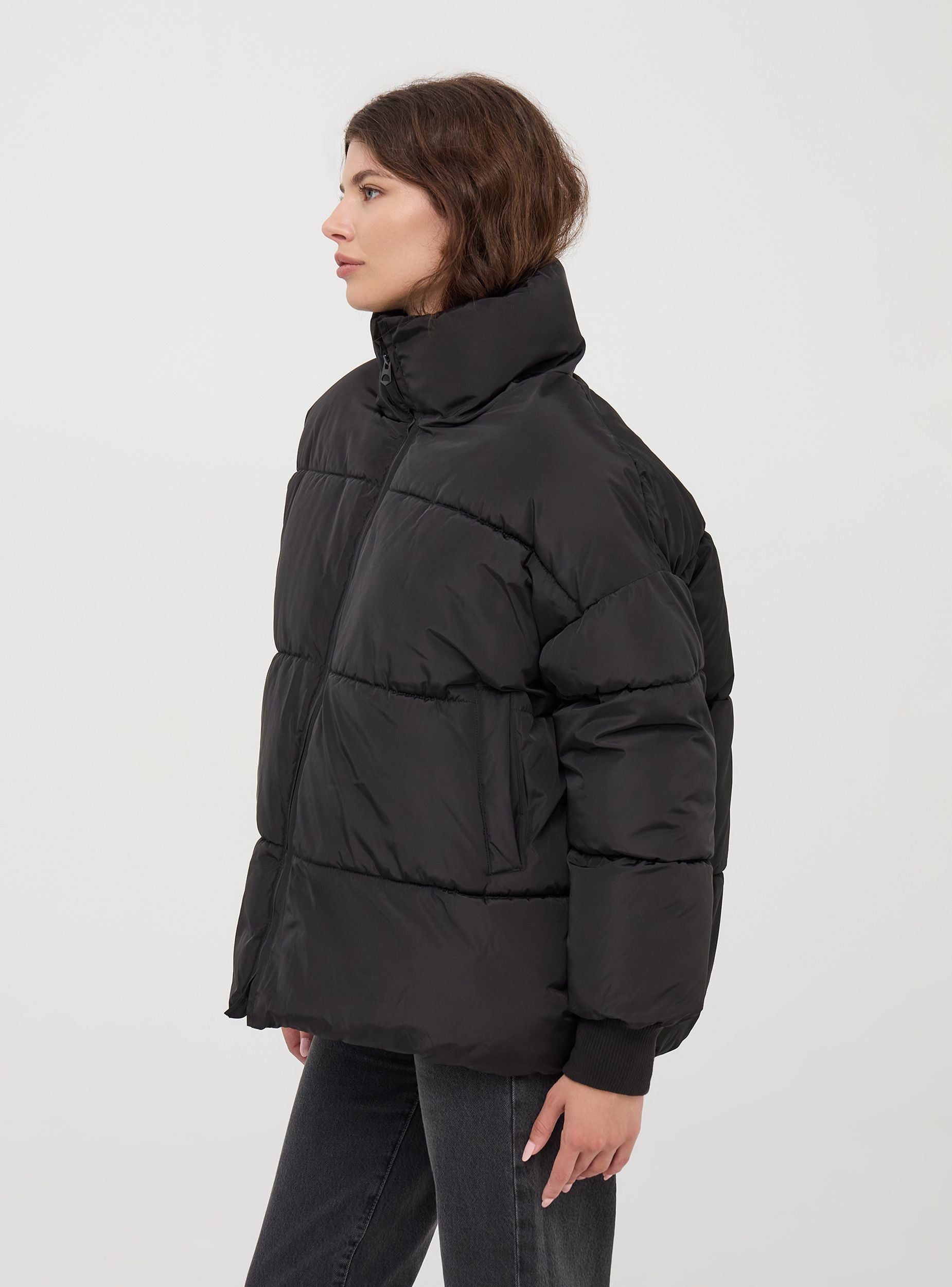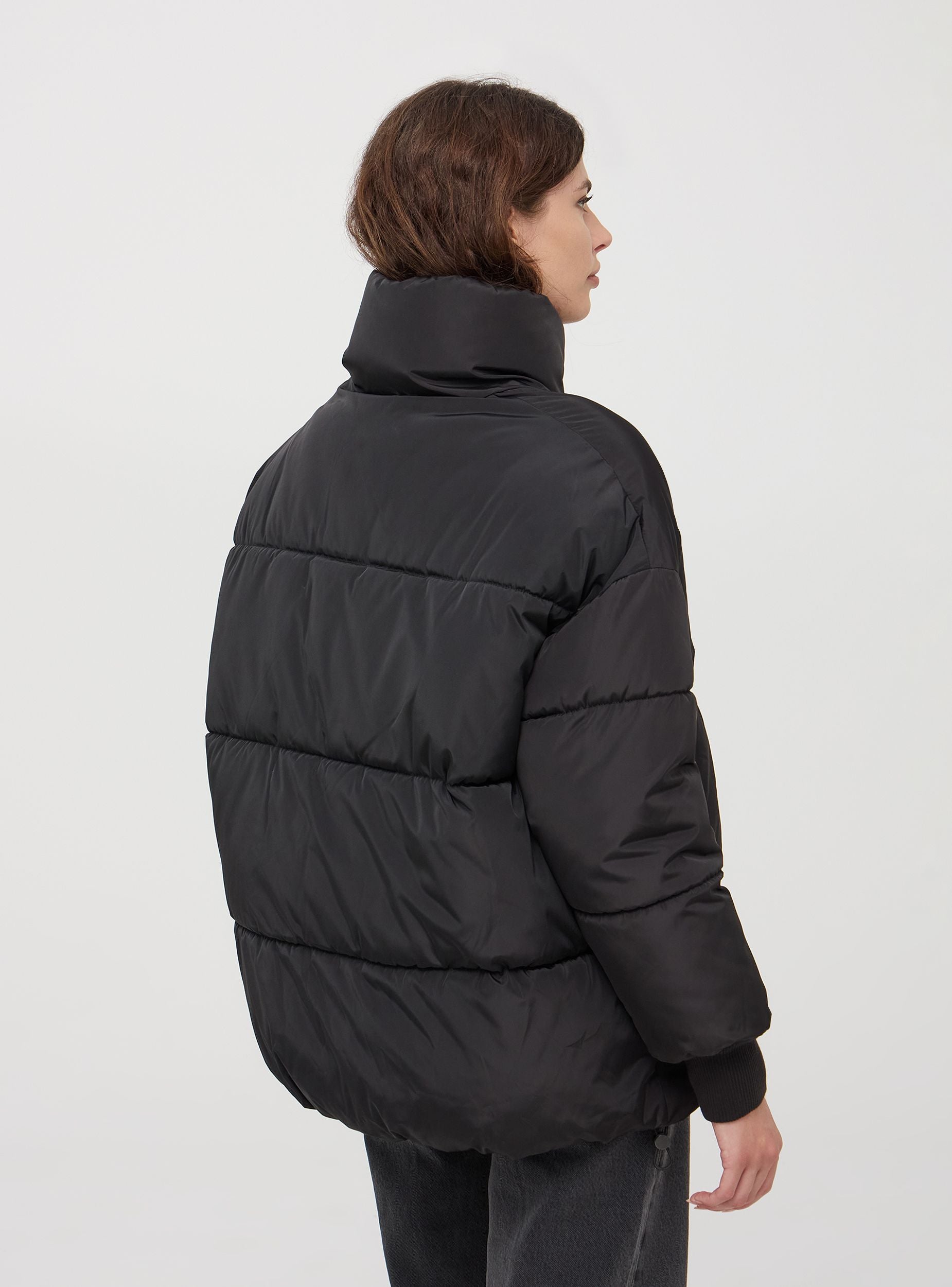 Giubbotto da donna imbottito con collo alto. Chiusura con cerniera tono su tono, tasche a filetto con fodera in pile sono pensate per tenere le tue mani al caldo, offrendo un comfort superiore e un rifugio morbido dal freddo. Maniche lunghe con polsino in maglia a costine. Bordo inferiore con coulisse e stopper. Il taglio oversize offre una silhouette moderna e rilassata, perfetta per stratificare e aggiungere un tocco di stile streetwear al tuo outfit invernale. L'imbottitura generosa e l'effetto puff non solo garantiscono un calore eccezionale, ma creano anche un look voluminoso e accattivante, ideale per affrontare le giornate più fredde con stile. Ideale per affrontare le fredde giornate in città o per un weekend fuori porta, questo giubbotto ti manterrà calda e stilosa in ogni occasione.Dettagli