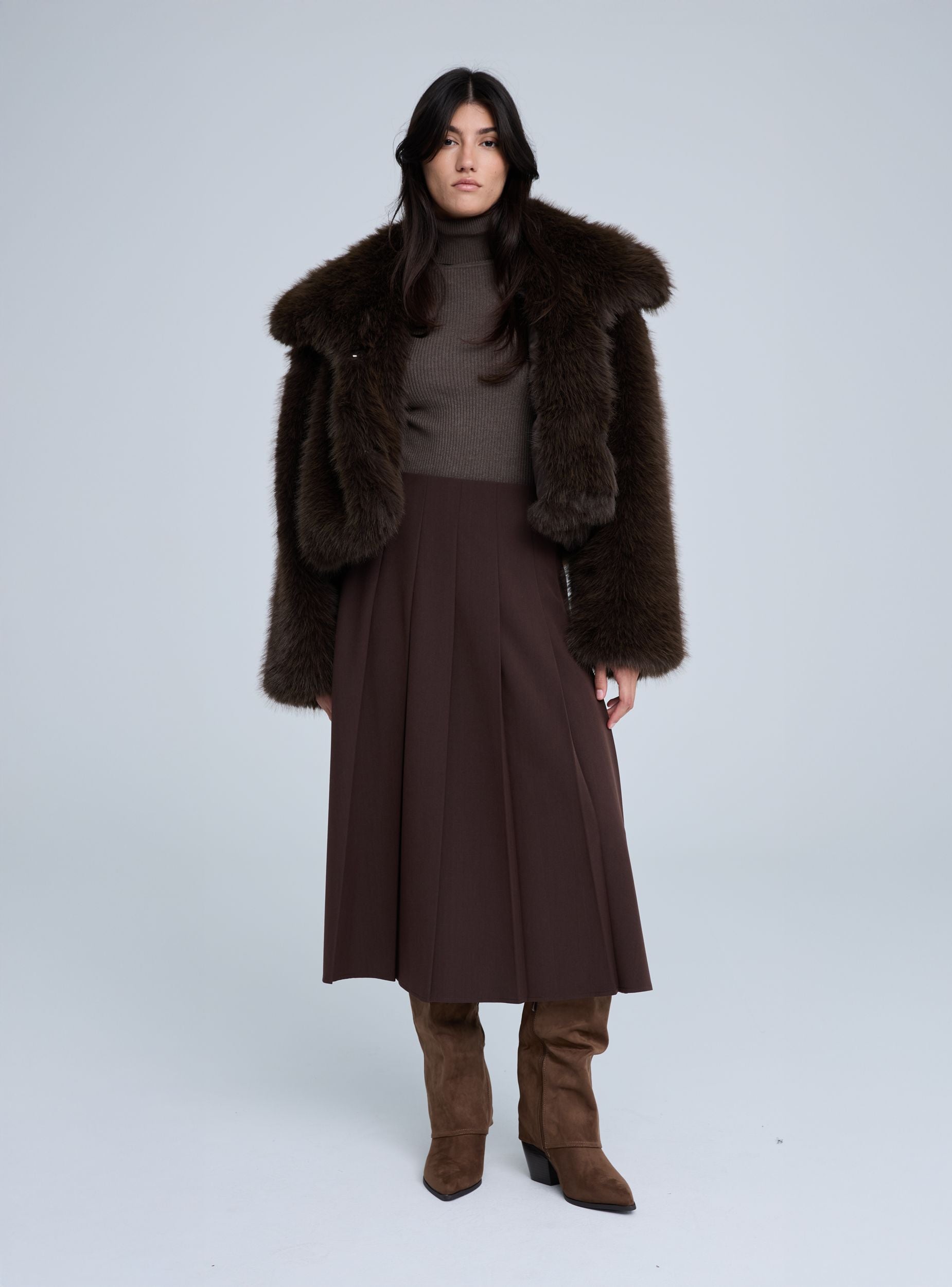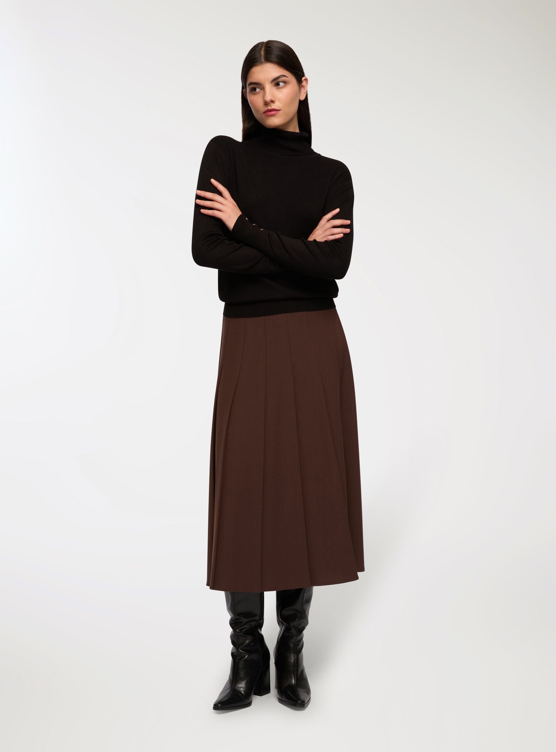 Gonna da donna lunga con pieghe, ideale per occasioni formali o lavorative. La vestibilità regolare e il design a pieghe donano un tocco elegante e sofisticato. Perfetta da abbinare a camicie o maglie aderenti e scarpe con tacco per un look raffinato. Dotata di chiusura con zip laterale. La lunghezza e il taglio la rendono versatile per diverse stagioni e situazioni.