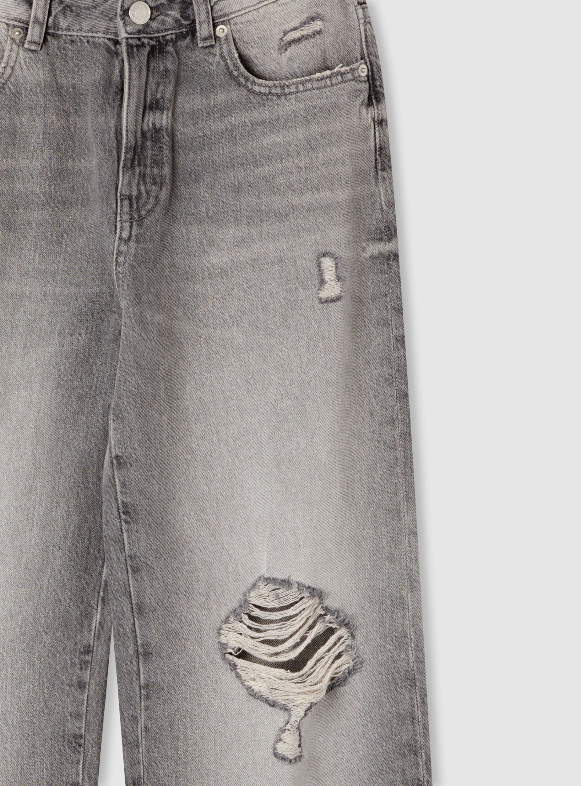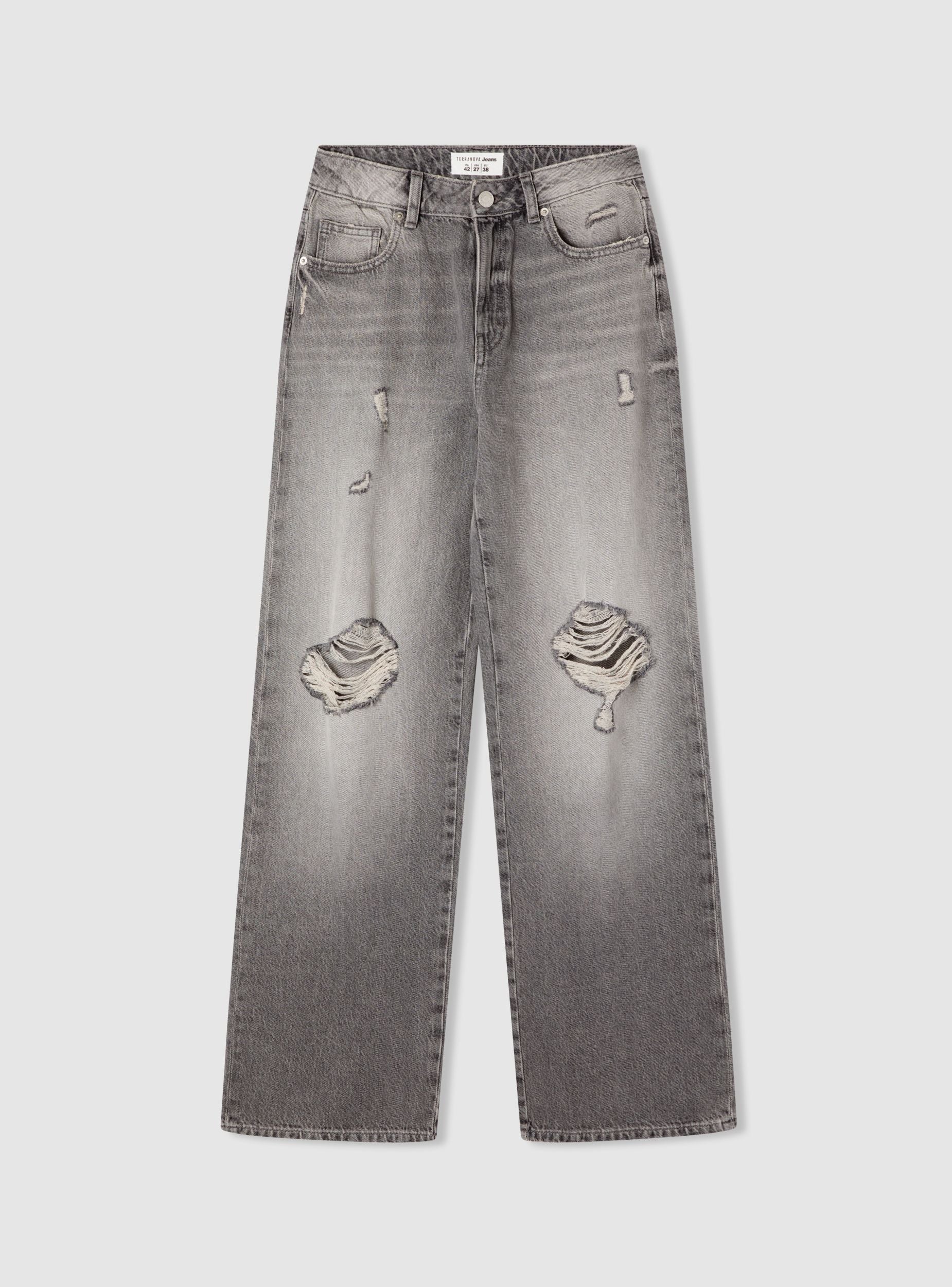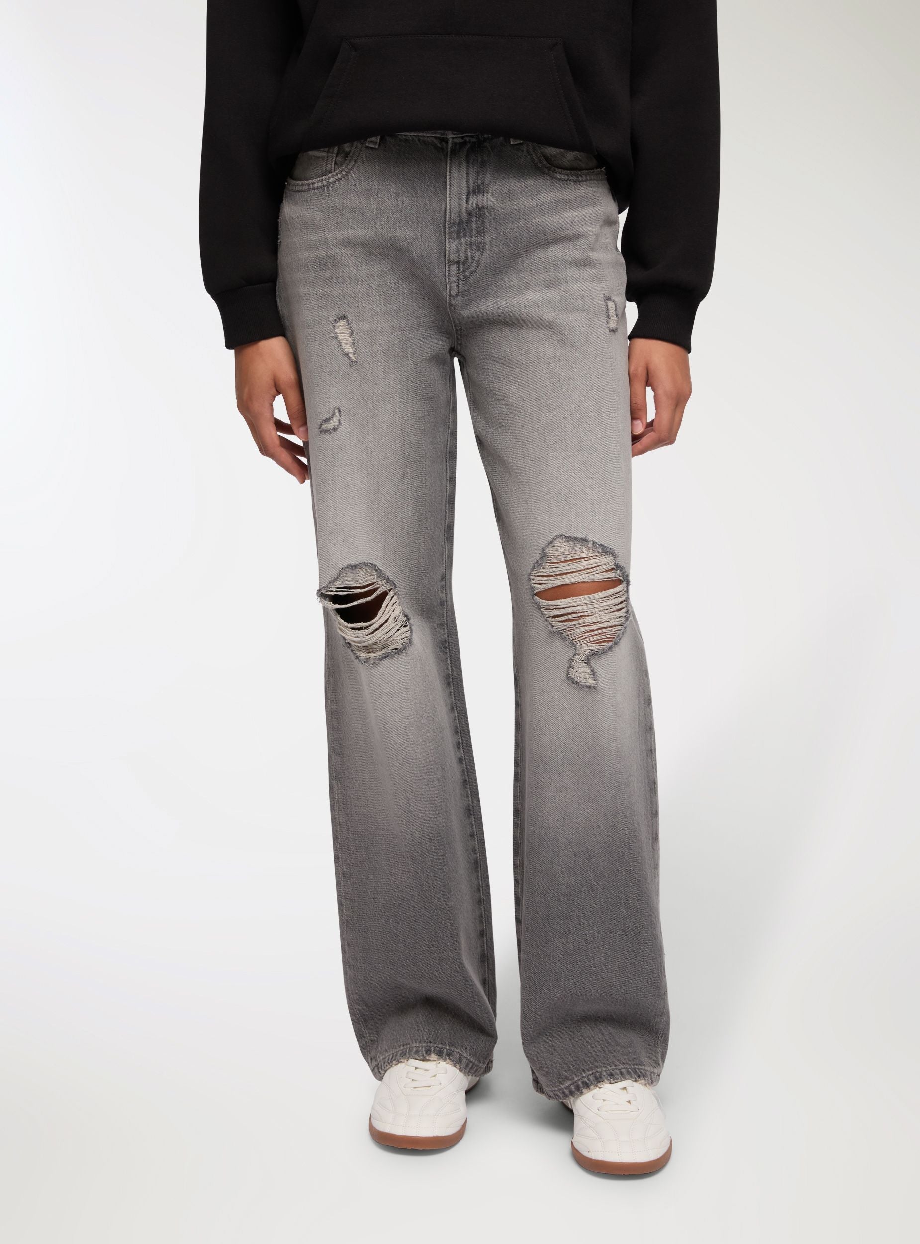 Jeans da donna con vestibilità ampia e design moderno. Presentano una vita media e strappi decorativi per un look urbano e alla moda. Dotati di tasche anteriori e posteriori, sono ideali per abbinamenti casual con magliette o camicie. Perfetti per creare outfit versatili e di tendenza, adatti a diverse occasioni informali.