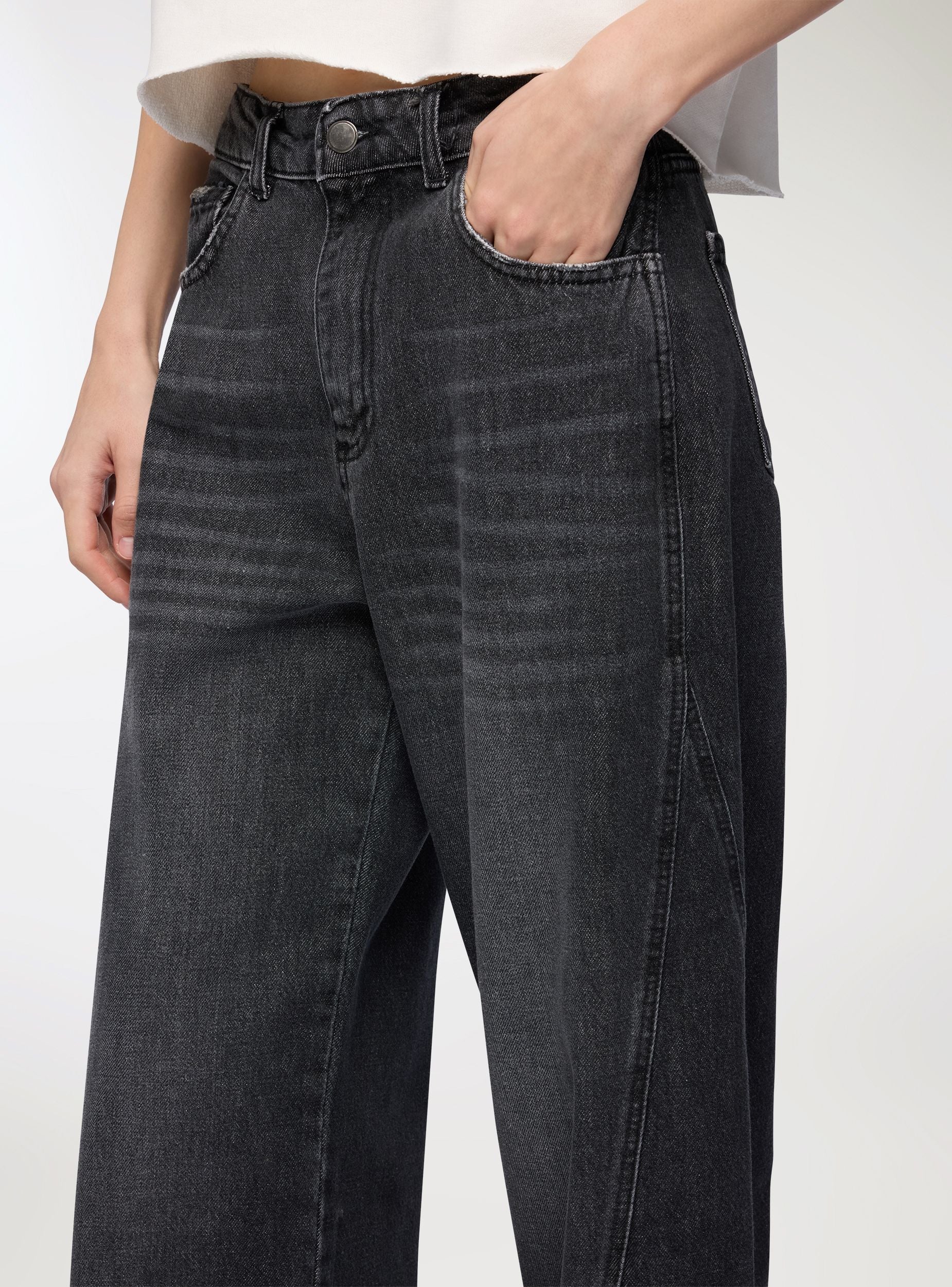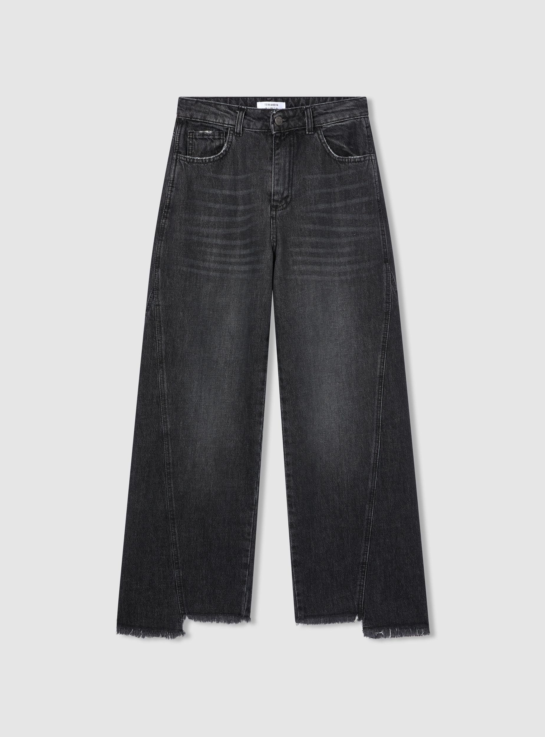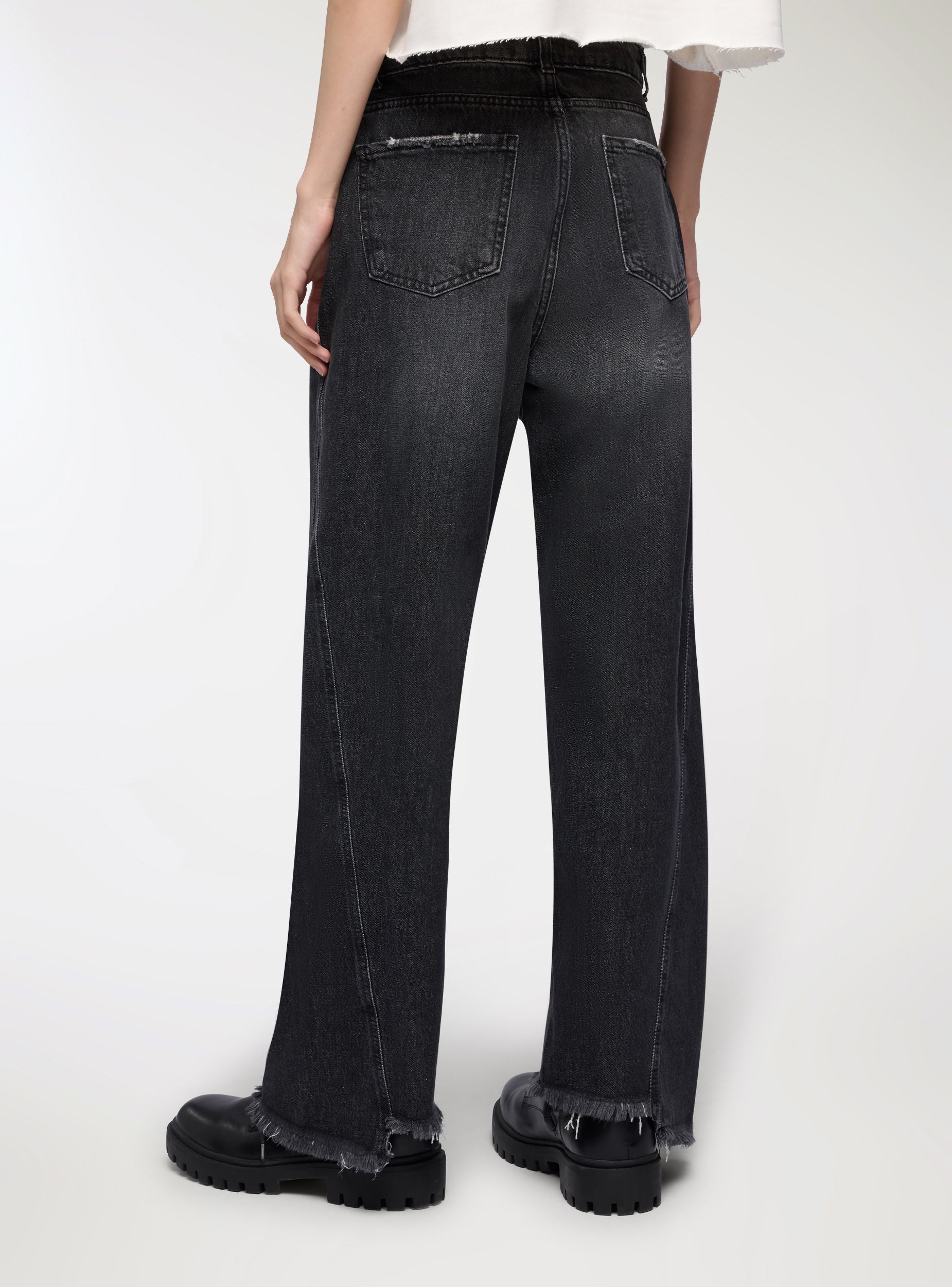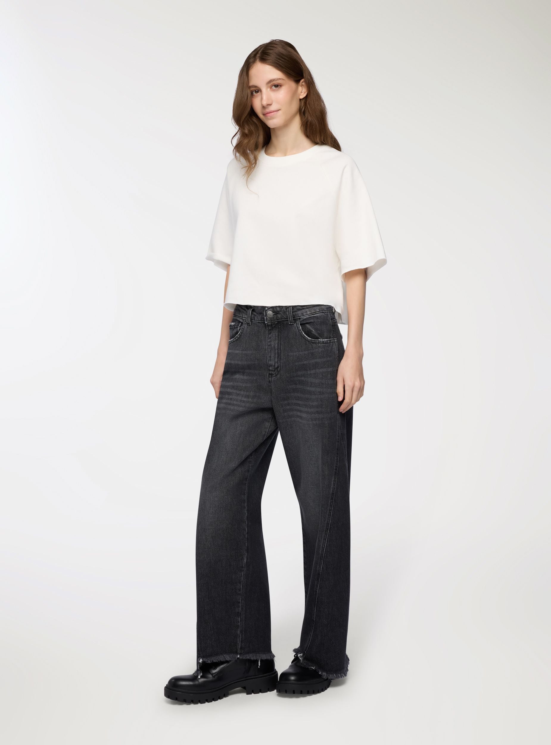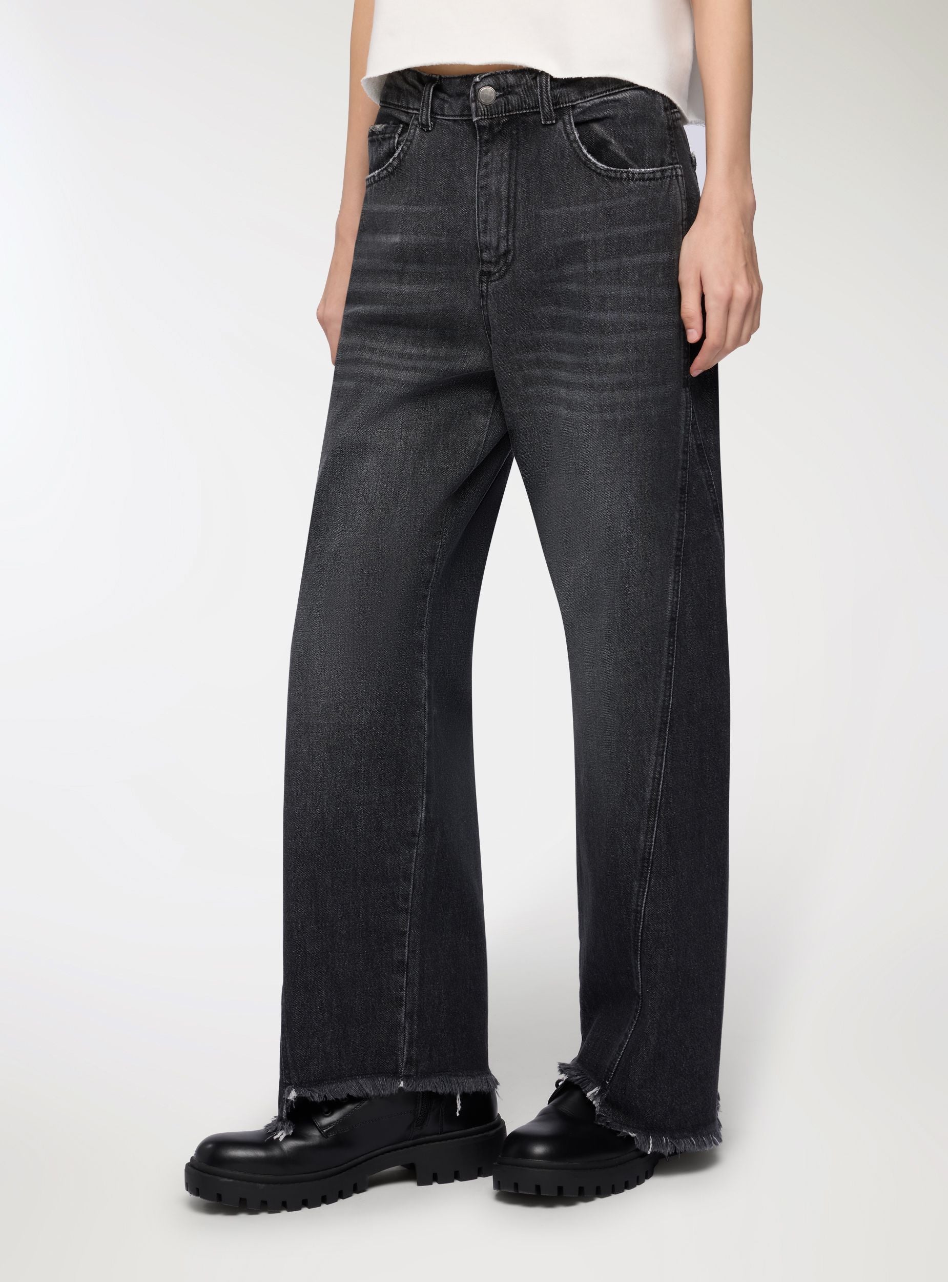 Jeans da donna a gamba ampia, pensati per look casual e urban. Modello lungo con vita media, chiusura con bottone e zip e cinque tasche. Linee dritte e ampie valorizzano la silhouette e garantiscono comfort, mentre l’orlo sfrangiato e le cuciture frontali aggiungono carattere. Ideali con sneakers o stivaletti e una maglietta o felpa per outfit quotidiani.