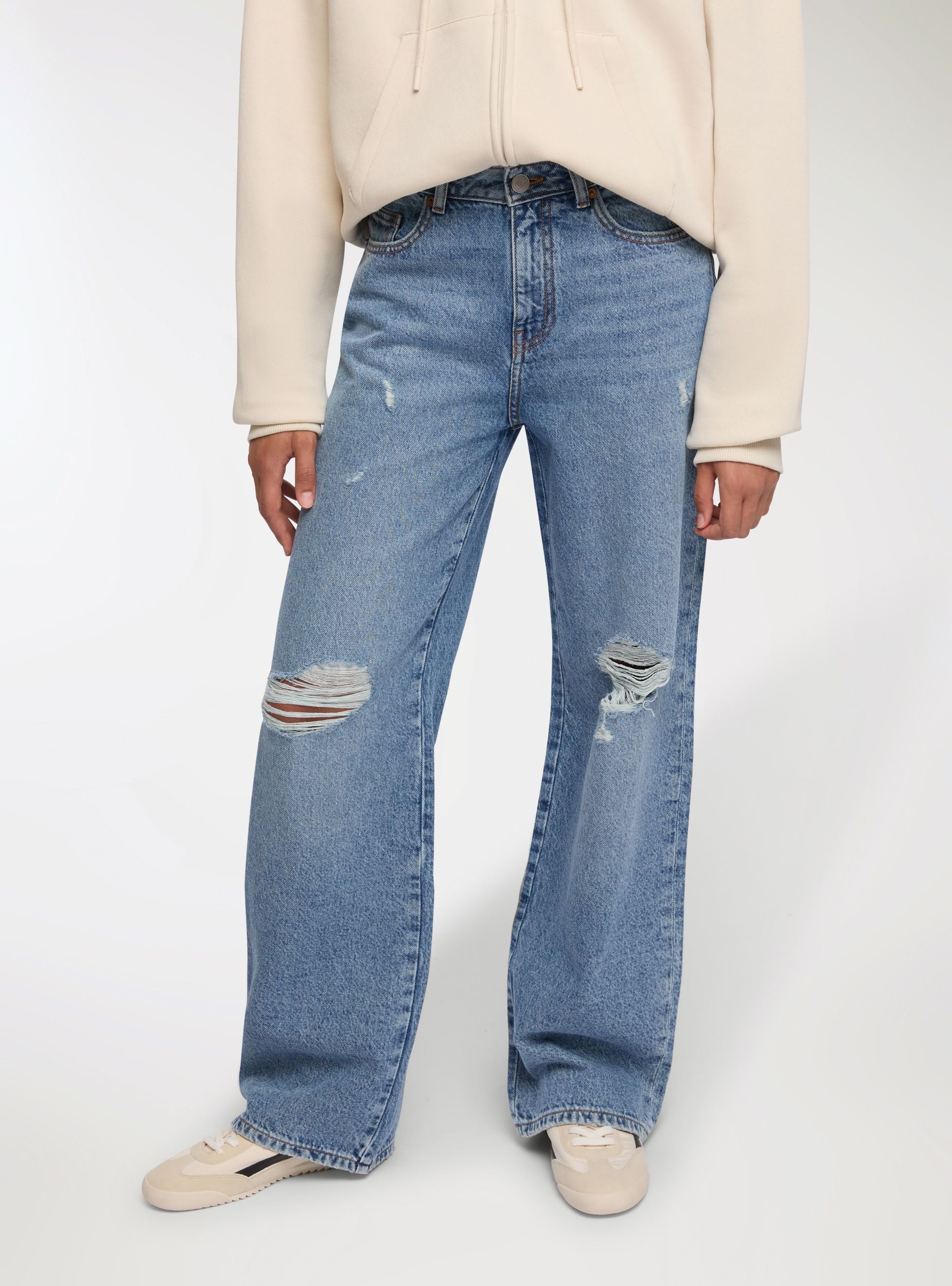 Jeans da donna con vestibilità ampia e design moderno. Presentano una vita media e strappi decorativi per un look casual e alla moda. Dotati di tasche anteriori e posteriori, sono ideali per abbinamenti con magliette o camicie per un outfit urbano e versatile. Perfetti per occasioni informali e giornate di relax.