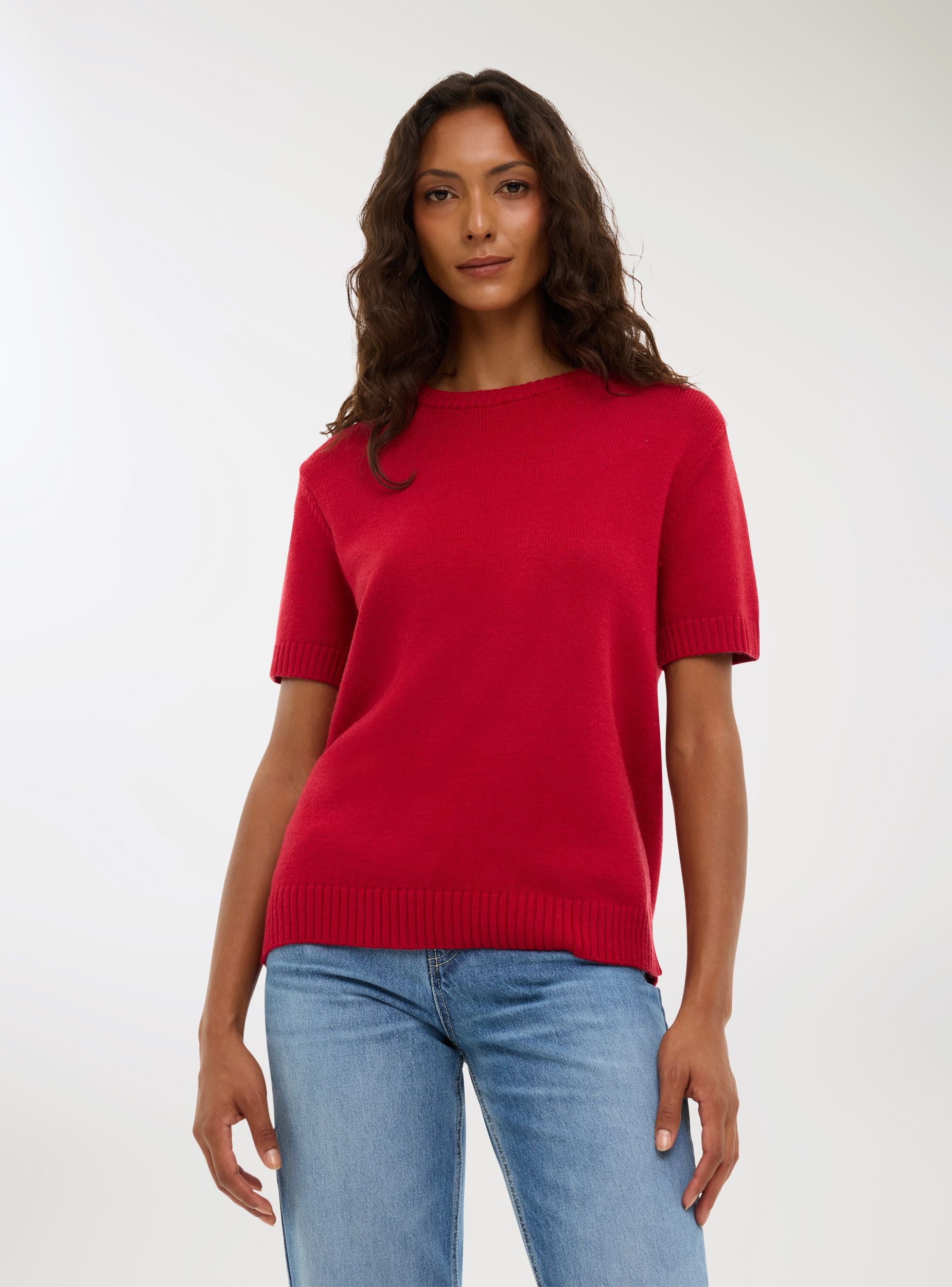 Maglia da donna a maniche corte, perfetta per un look pulito e versatile. Il design a tinta unita è valorizzato da finiture a costine su fondo, maniche e girocollo, per un tocco casual ma curato. Il taglio regolare e la struttura in maglia la rendono ideale sia da sola sia come sottogiacca. Un capo essenziale, pratico e facile da abbinare per l’ufficio o il tempo libero.Dettagli