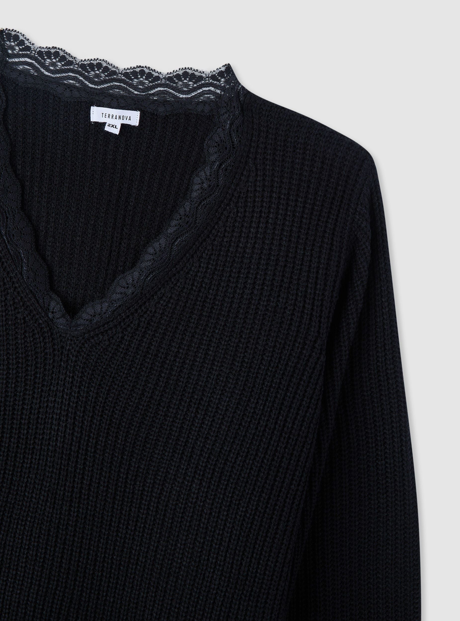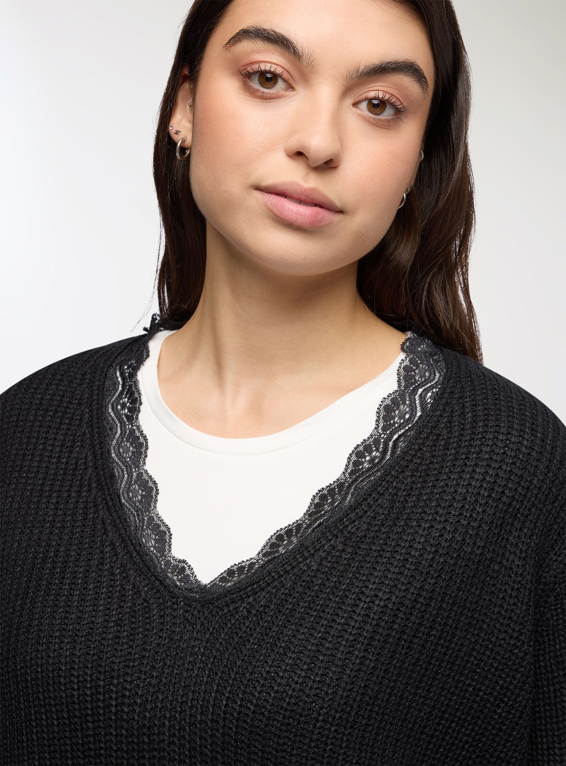 Maglia da donna a manica lunga, ideale per un look casual e versatile. Presenta un design tinta unita con un elegante inserto in pizzo sullo scollo a V, che aggiunge un tocco femminile e raffinato. Perfetta per essere abbinata a jeans o pantaloni per un outfit quotidiano o per occasioni informali. La vestibilitá comoda la rende adatta a diverse silhouette.