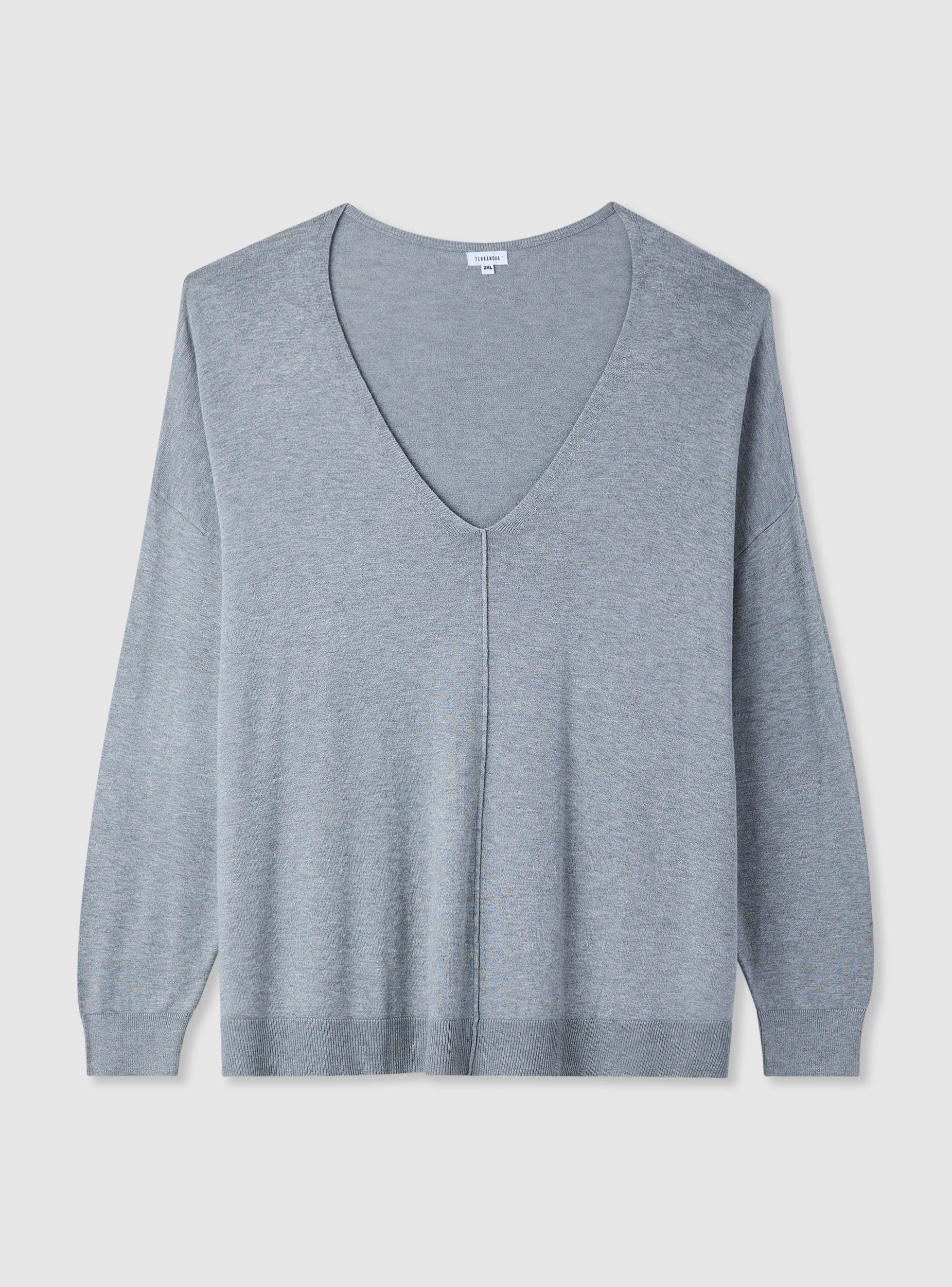 Maglia da donna con maniche lunghe e scollo a V, caratterizzata da un design tinta unita che la rende versatile e adatta a molteplici occasioni. La vestibilità comoda e il taglio semplice ma elegante la rendono ideale per essere abbinata a jeans o pantaloni eleganti, perfetta per il lavoro o il tempo libero. Un capo essenziale per un look casual e raffinato.
