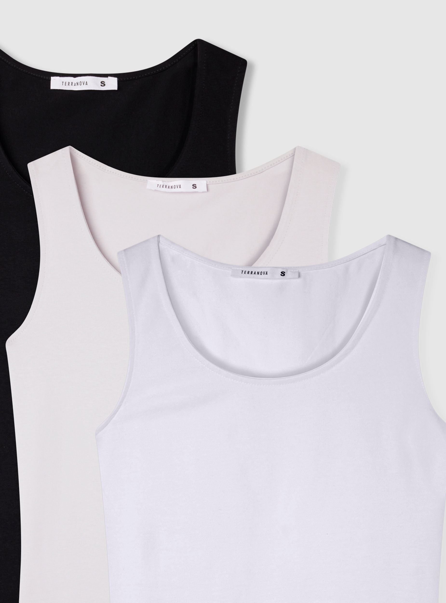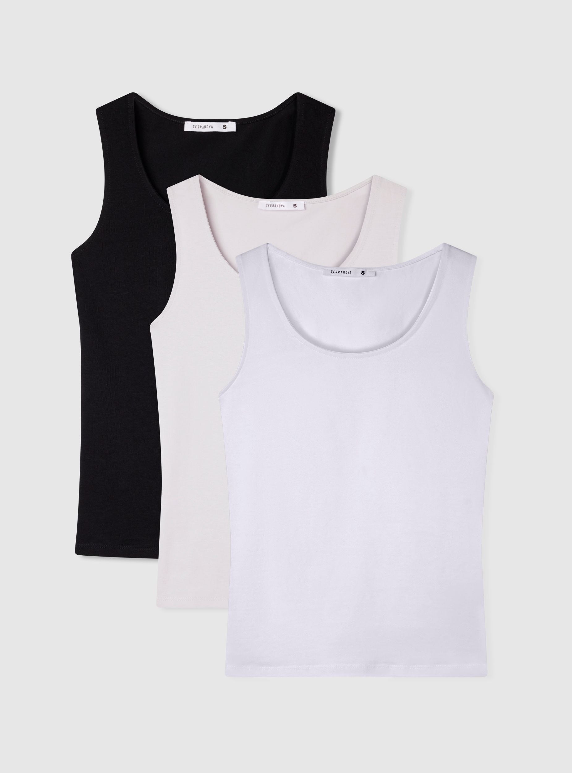 Confezione composta da tre canotte da donna, realizzate in morbido tessuto di cotone elasticizzato a tinta unita. Ogni canottiera offre un comfort eccezionale grazie alla traspirabilità e alla morbidezza del cotone, ideale per un utilizzo quotidiano. Il design senza maniche e il fit aderente esaltano la silhouette, rendendole perfette da indossare sia da sole che sotto altri capi. Aggiungi versatilità al tuo guardaroba con questo pratico pack di tre canottiere basic.