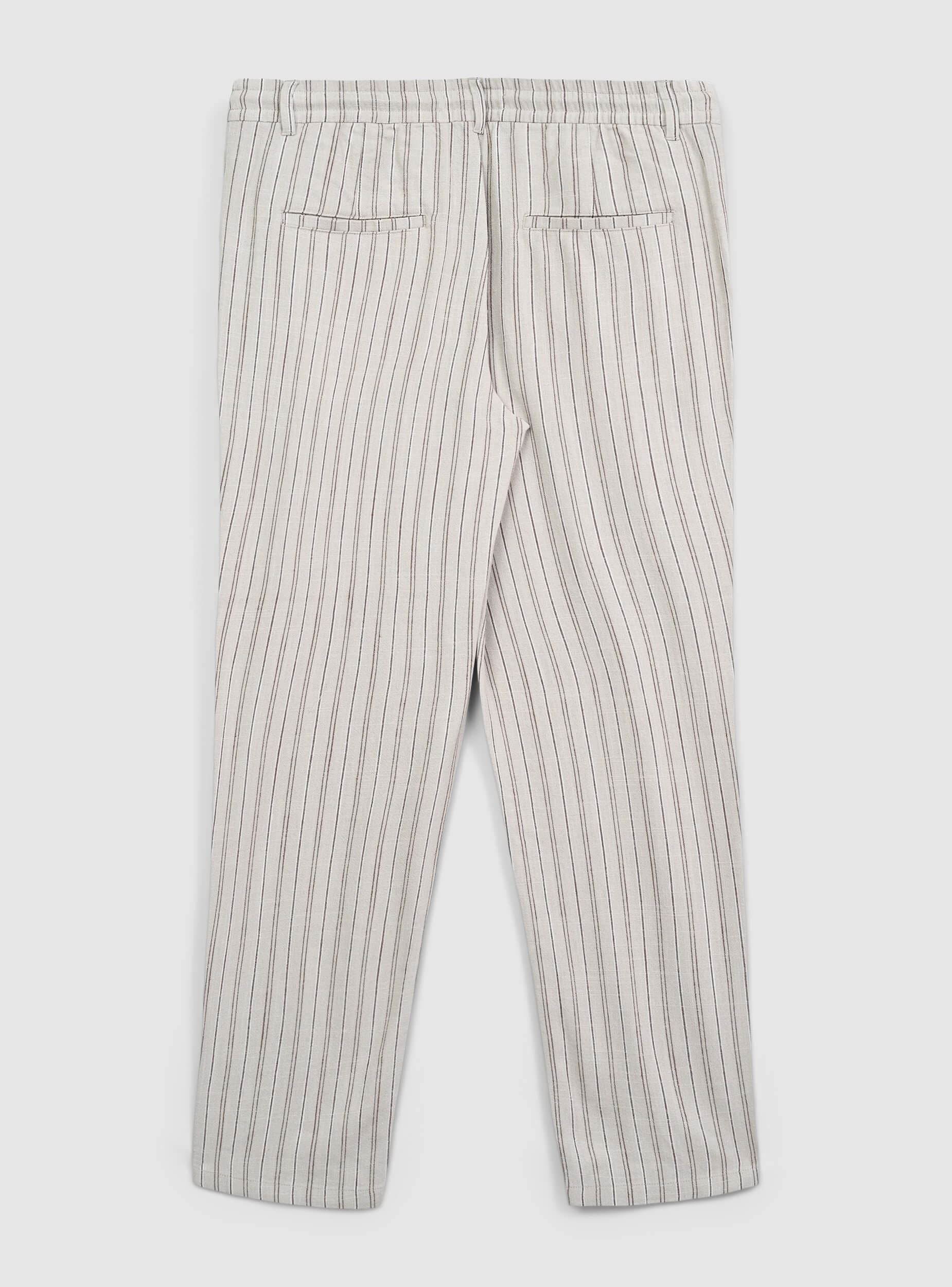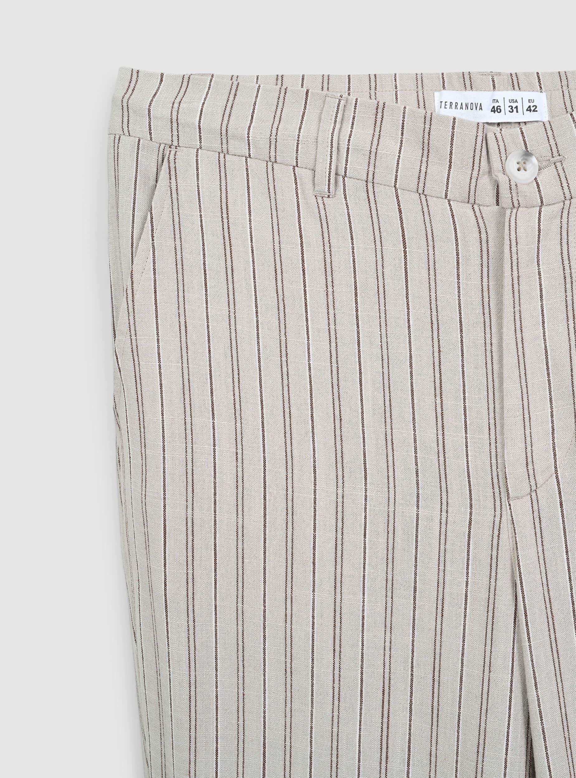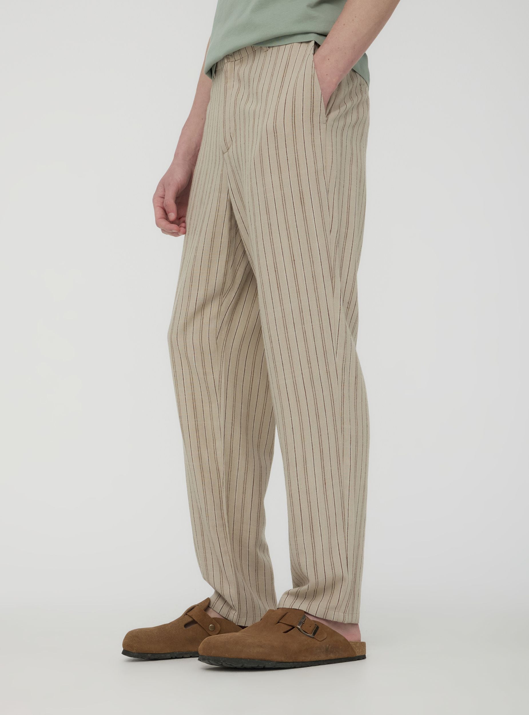 Pantaloni chino da uomo ideali per un look casual e versatile, perfetti per il tempo libero o per un outfit informale. Caratterizzati da un tessuto in misto lino e da una vestibilità regolare, presentano un design a righe con tasche laterali e chiusura con bottone. Un capo pratico e comodo, adatto a diverse occasioni.