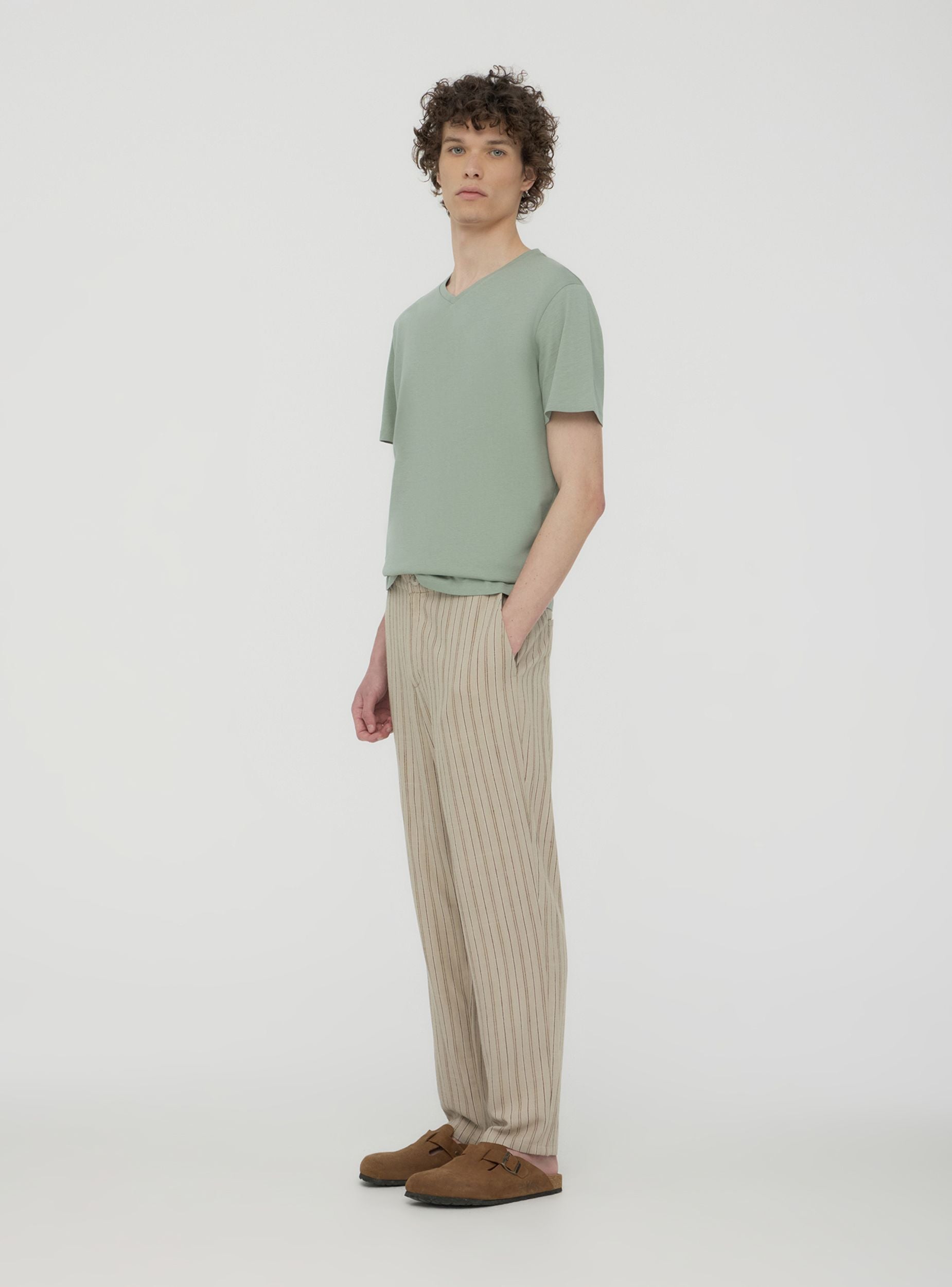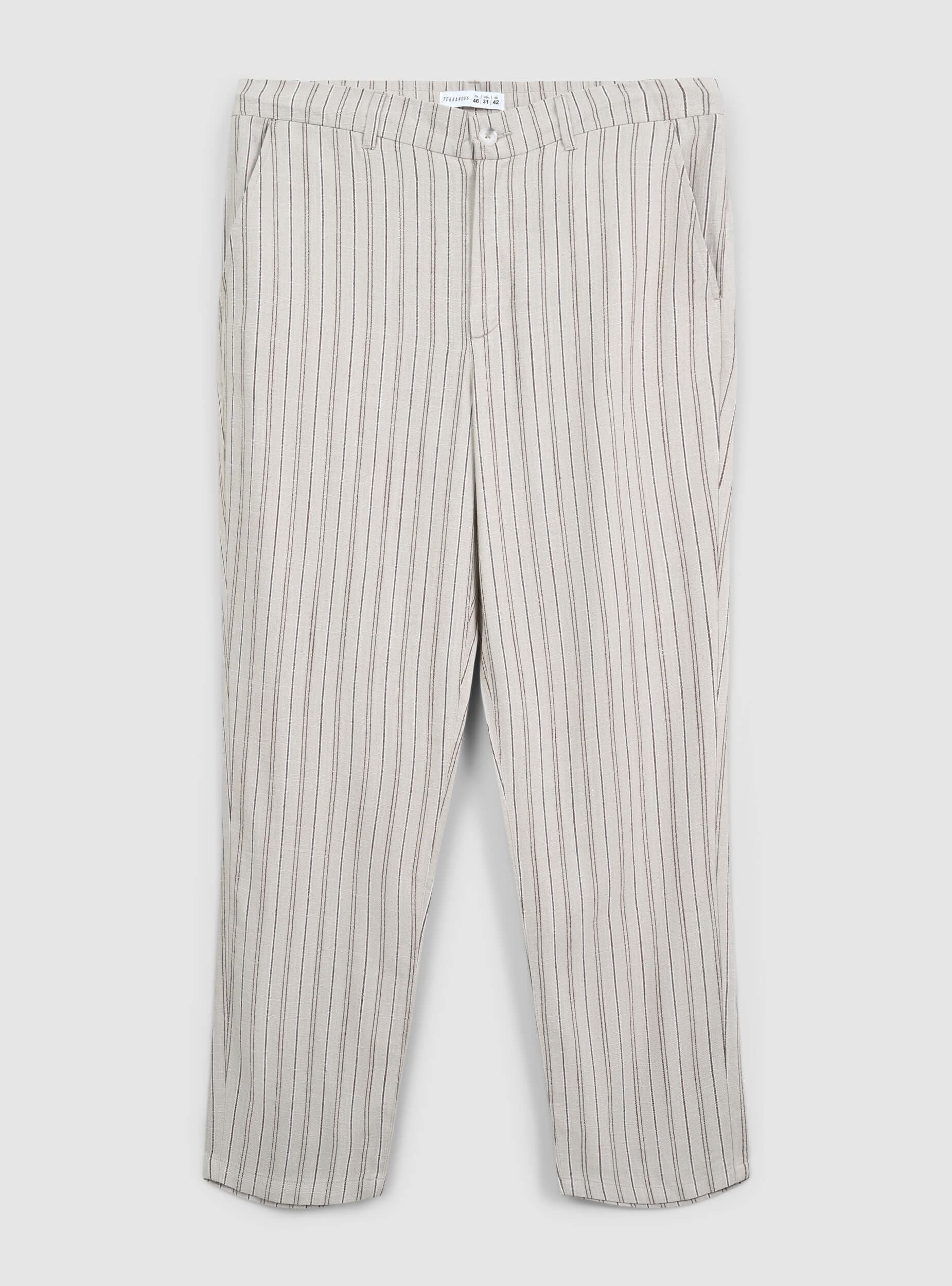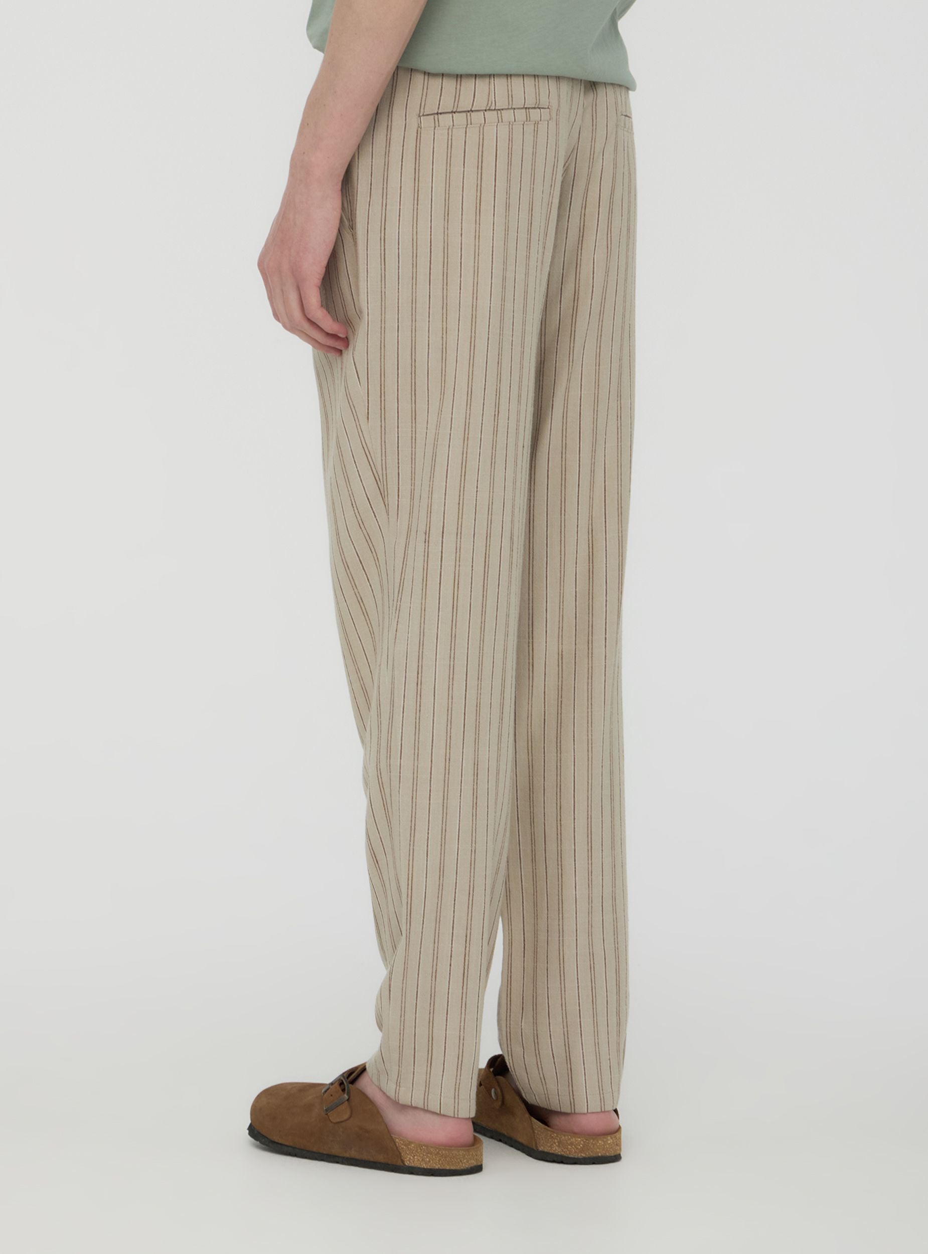 Pantaloni chino da uomo ideali per un look casual e versatile, perfetti per il tempo libero o per un outfit informale. Caratterizzati da un tessuto in misto lino e da una vestibilità regolare, presentano un design a righe con tasche laterali e chiusura con bottone. Un capo pratico e comodo, adatto a diverse occasioni.