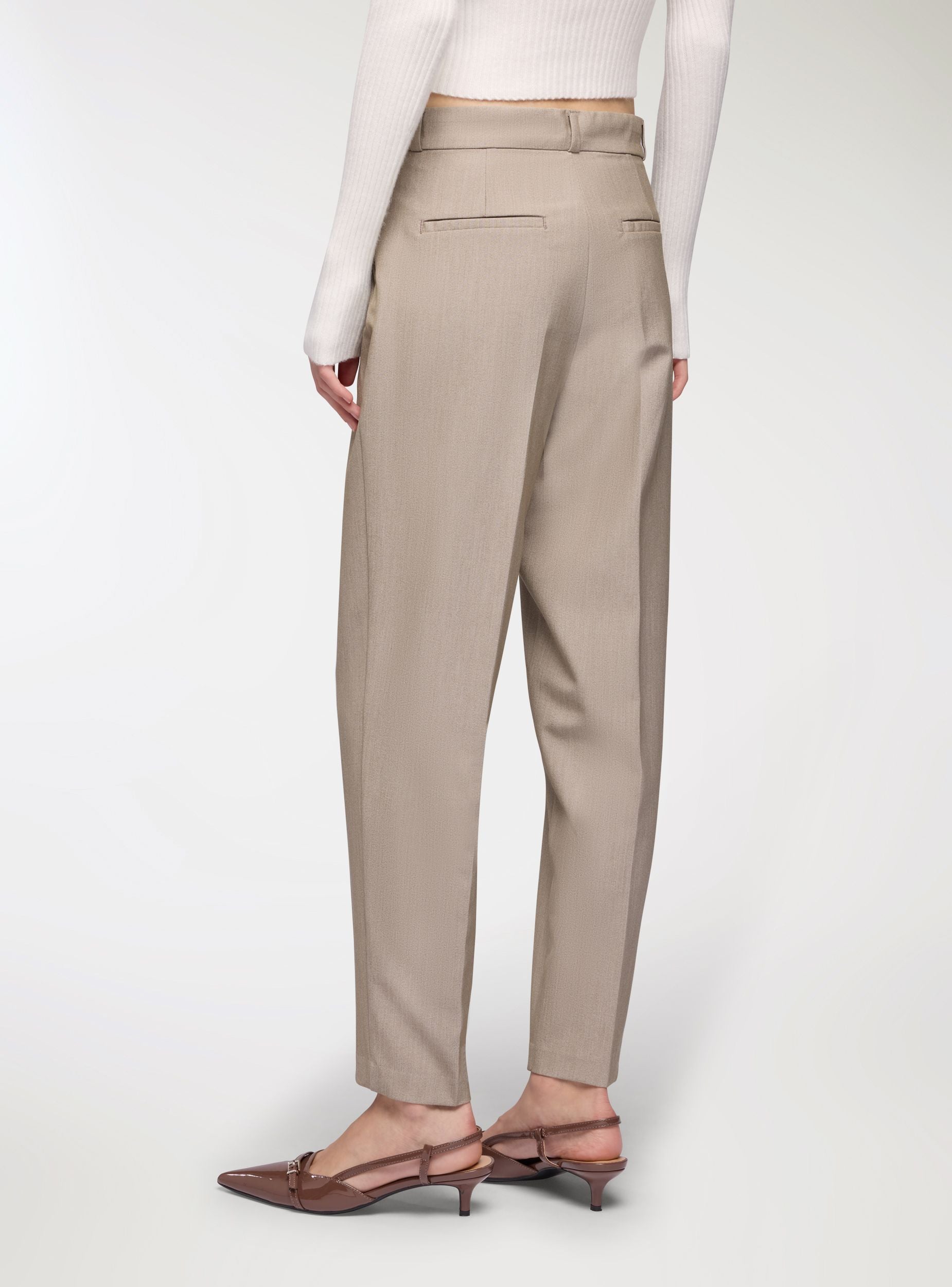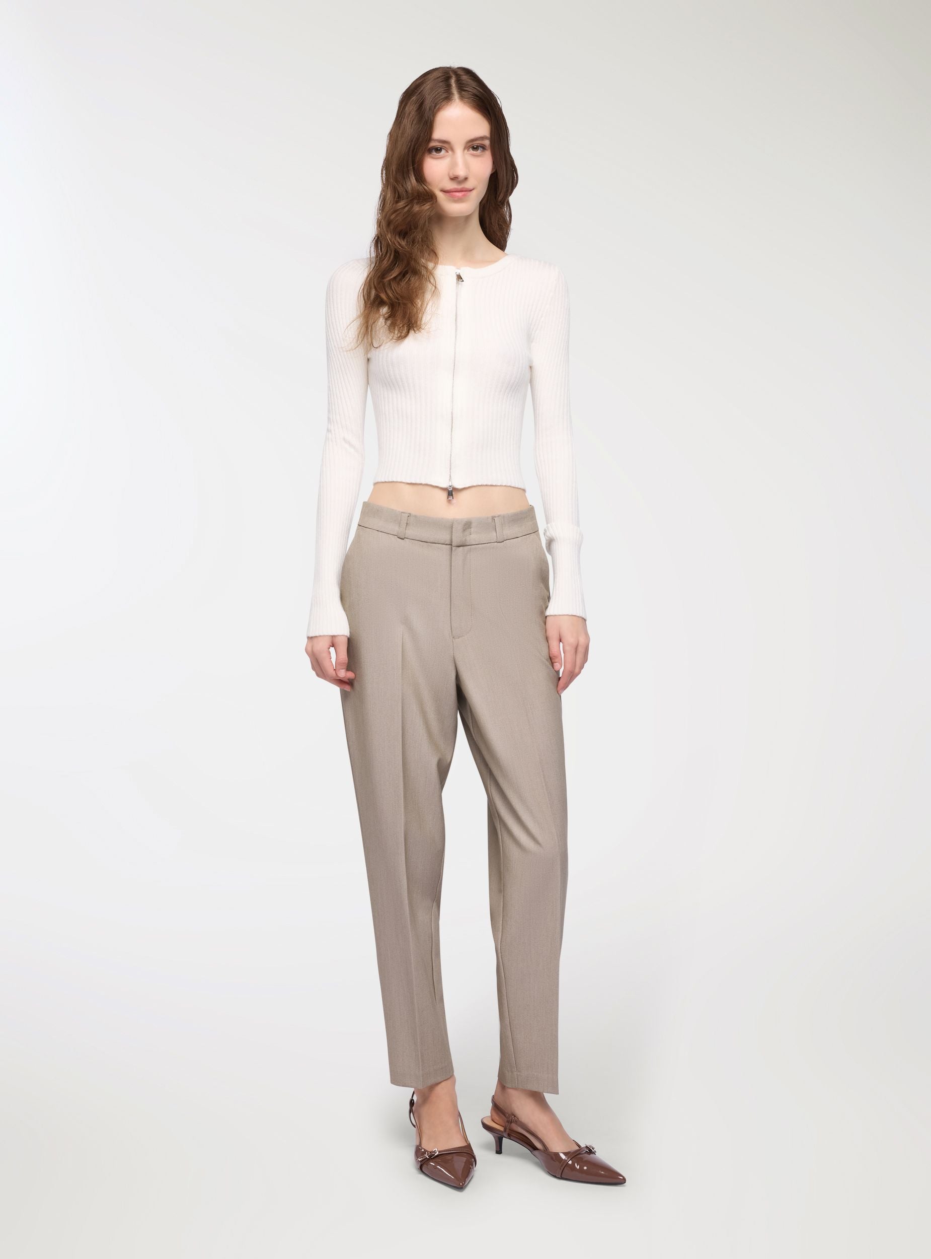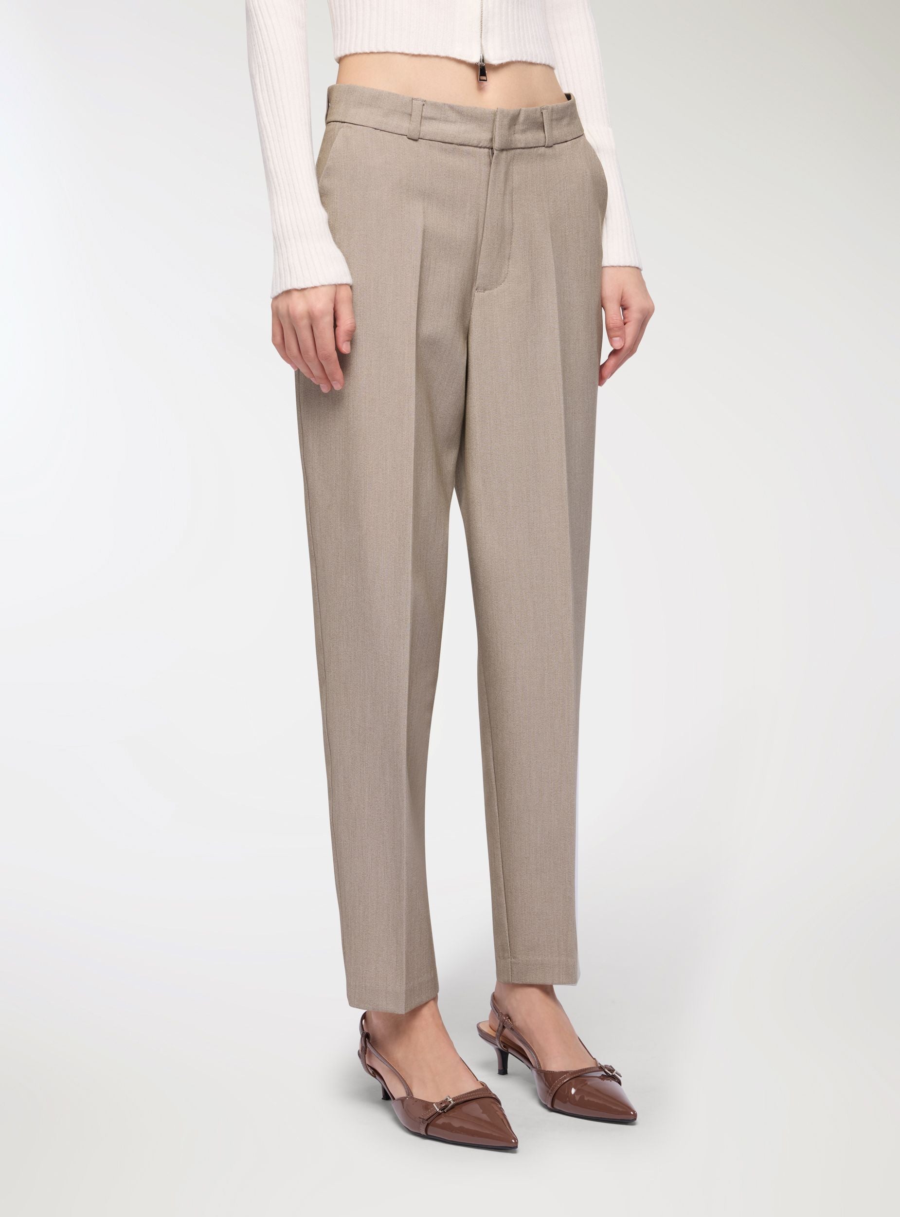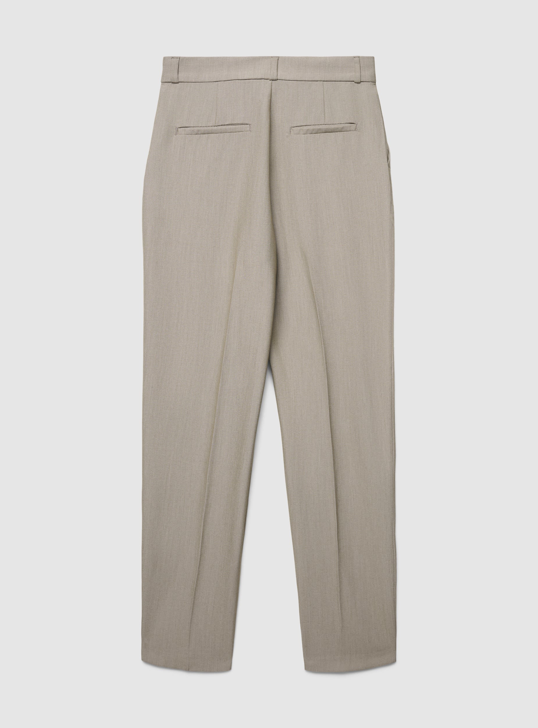 Tessuto caldo. Pantaloni lunghi da donna in tinta unita, taglio dritto con piega stirata sulla gamba e ispirazione chino. Vita con passanti, chiusura anteriore nascosta, tasche alla francese e posteriori a filetto per una linea pulita. Il materiale pesante li rende perfetti per le giornate autunnali e invernali. Vestibilità comoda con vita elasticizzata che valorizza senza costringere. Perfetti per l’ufficio e il tempo libero, si abbinano a camicie e blazer oppure a maglioncini e sneakers per look più casual.