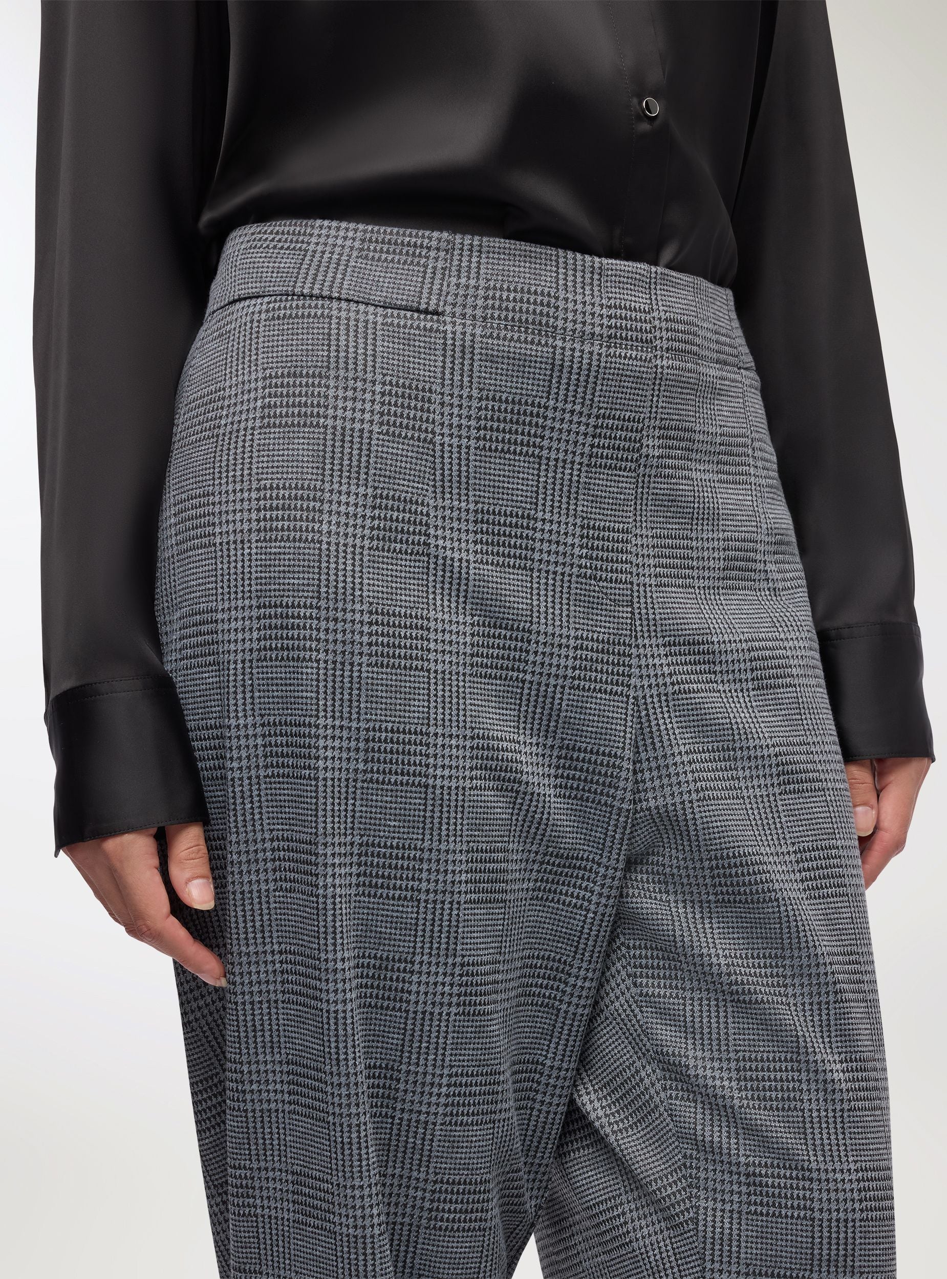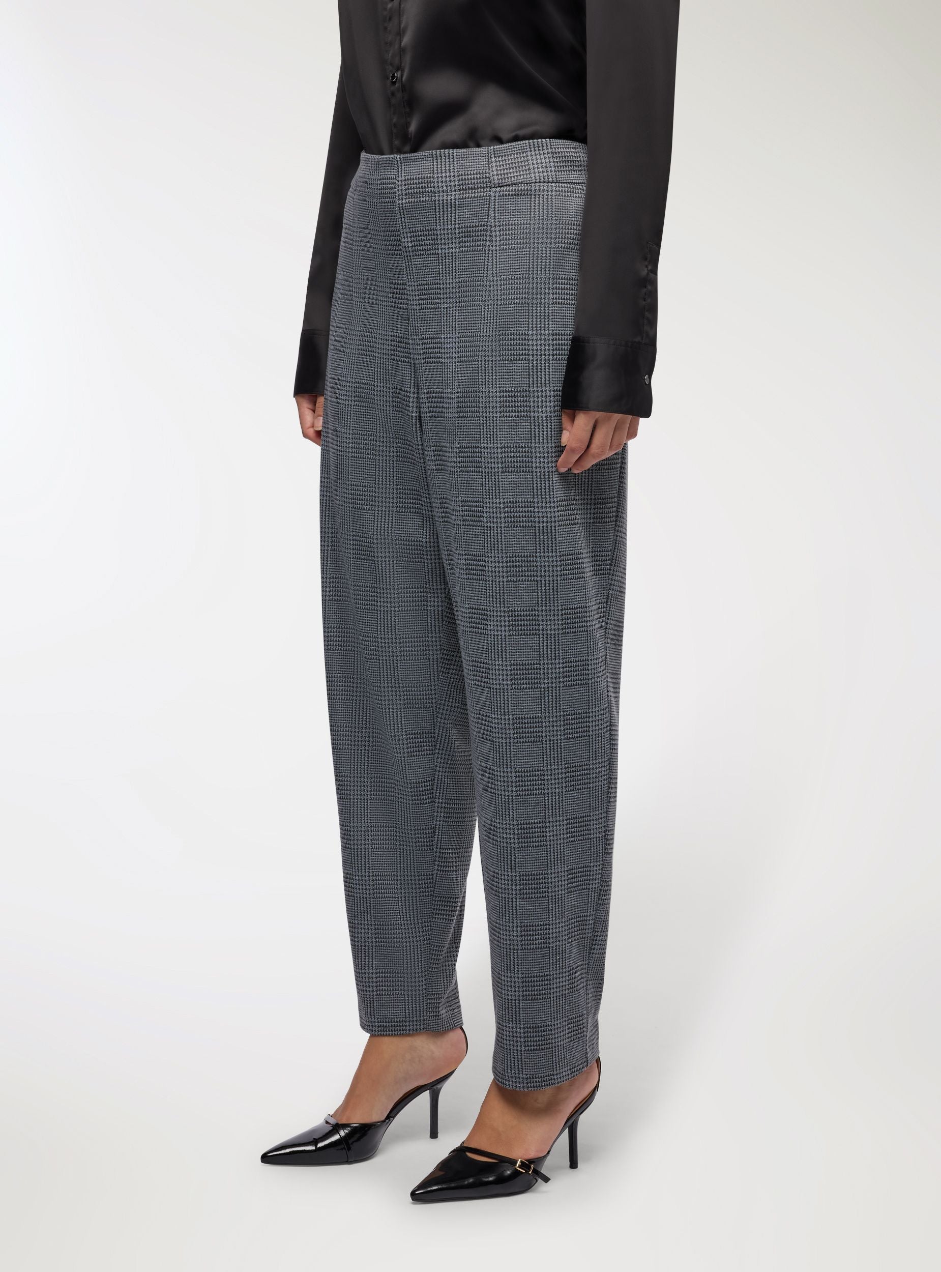 Pantaloni lunghi da donna con vestibilità regolare, ideali per occasioni formali o per l'ufficio. Presentano una fantasia principe di Galles che aggiunge un tocco sofisticato al design. Dotati di vita elasticizzata sul retro. Perfetti da abbinare a camicie o bluse per un look professionale. La lunghezza è completa e il taglio è dritto, garantendo comfort e stile.