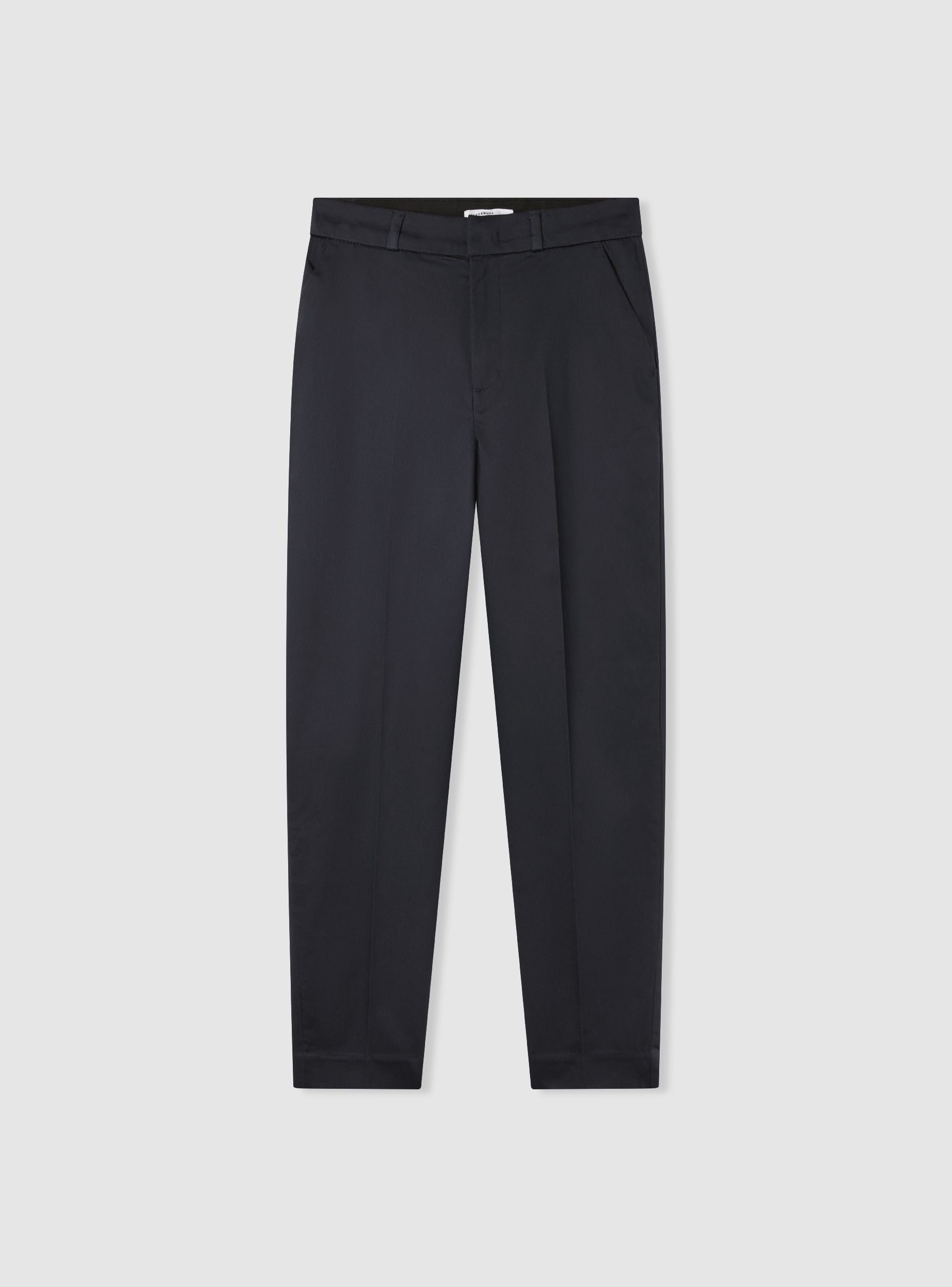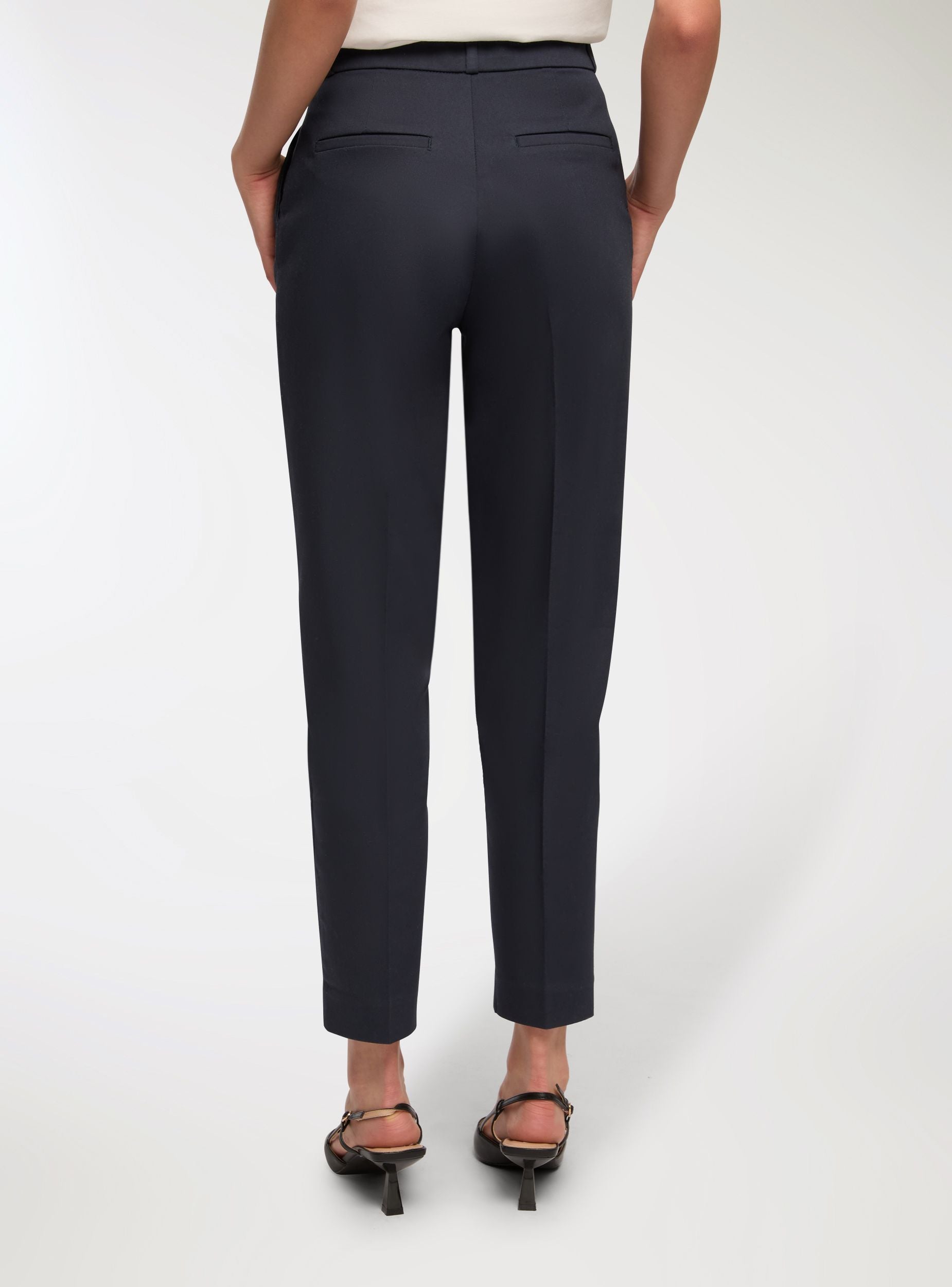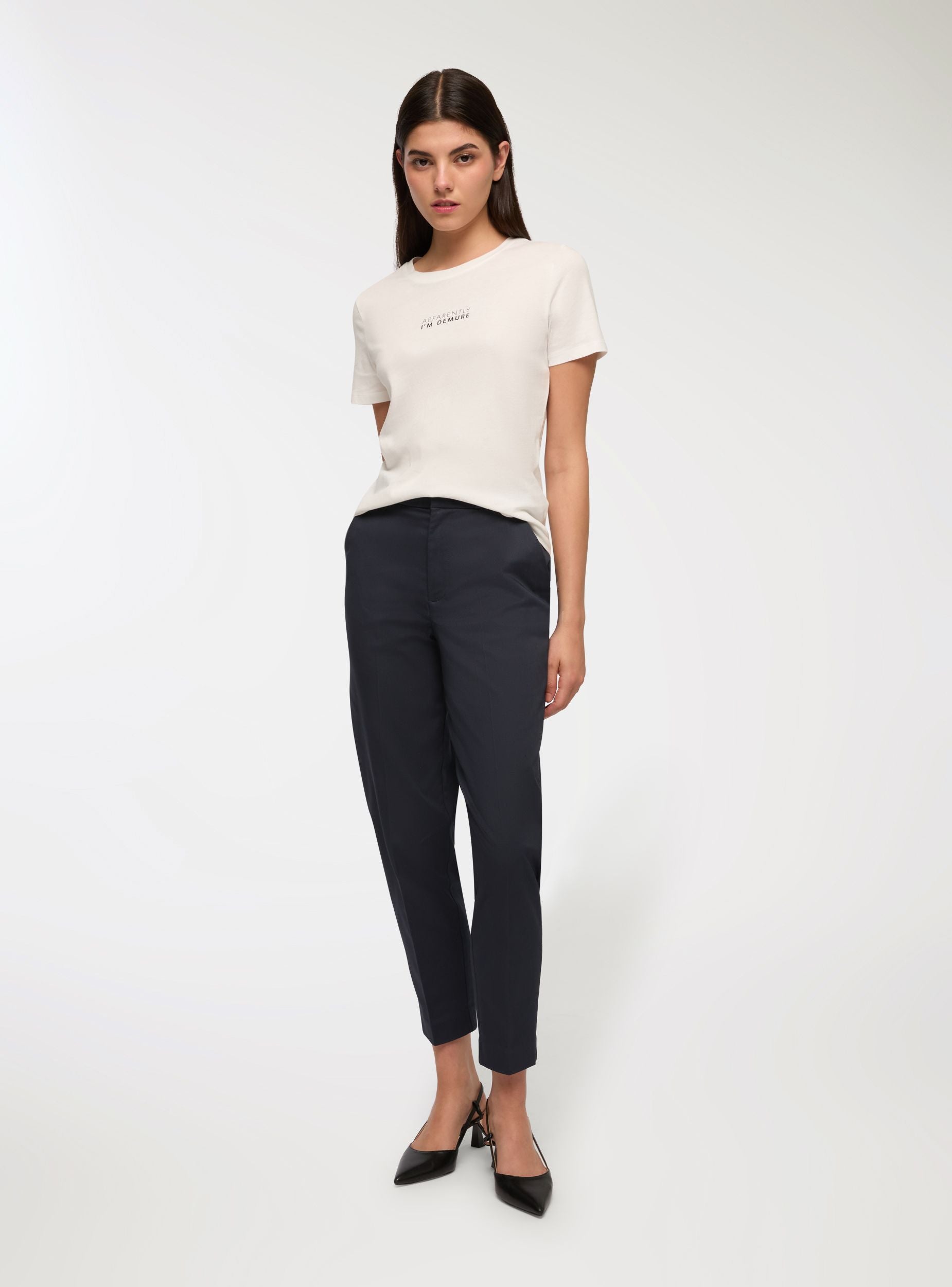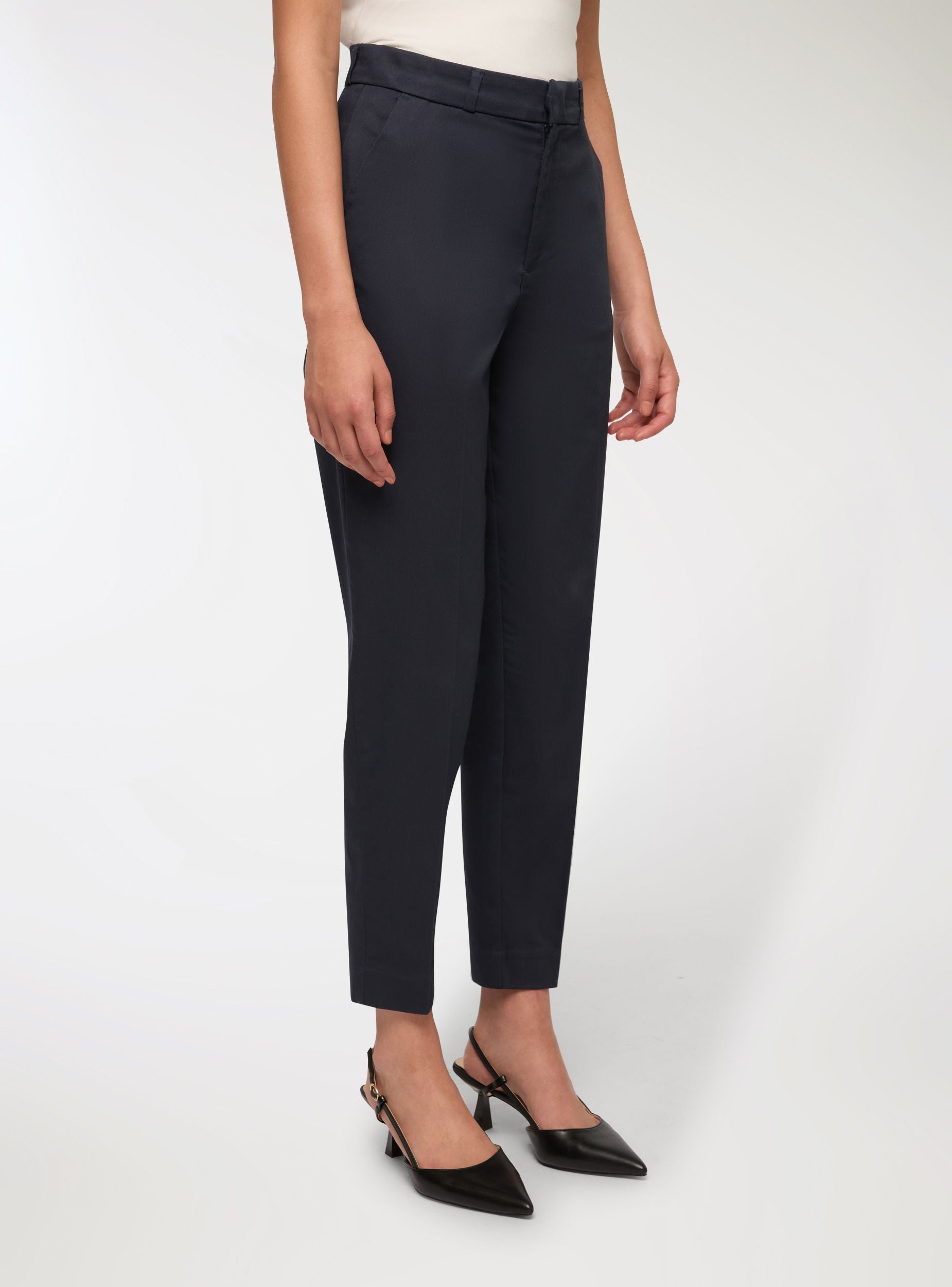 Pantaloni lunghi da donna, modello chino, con vestibilità regolare, ideali per un look formale o casual. Dotati di chiusura con bottone, zip e gancio, presentano tasche laterali e passanti per cintura. Il design a sigaretta valorizza la silhouette, rendendoli perfetti per essere abbinati a camicie o bluse per un outfit da ufficio o occasioni eleganti. La loro versatilità li rende un capo indispensabile nel guardaroba.