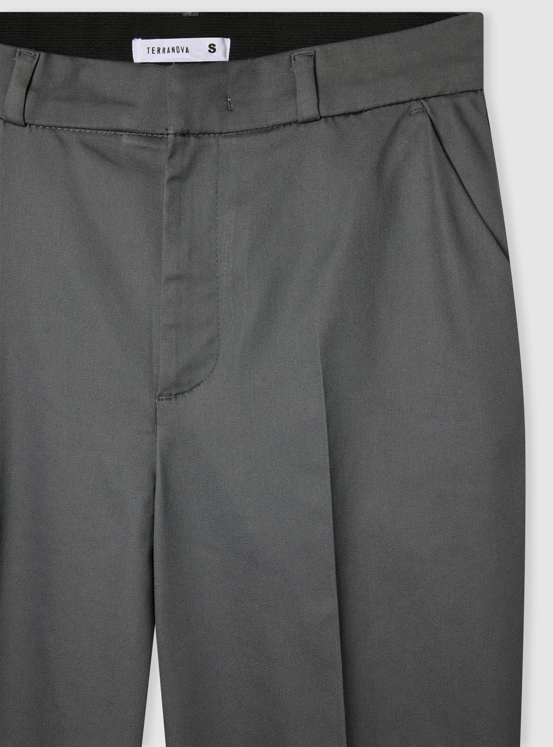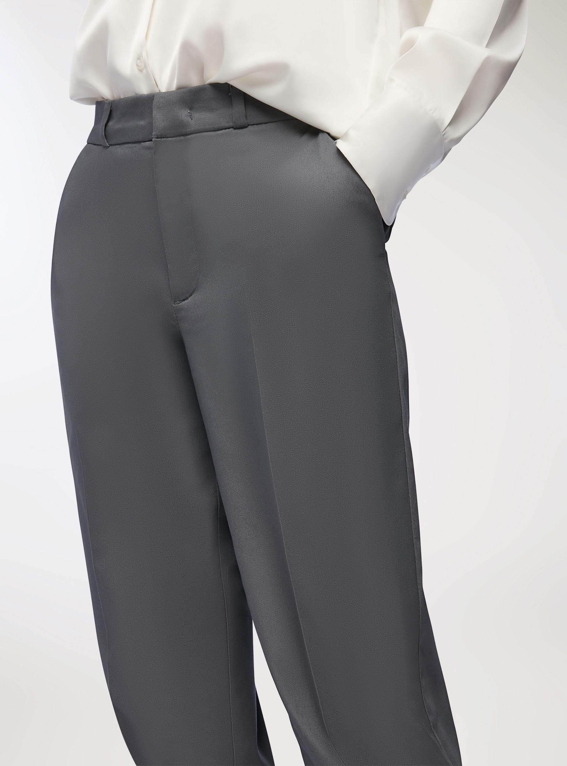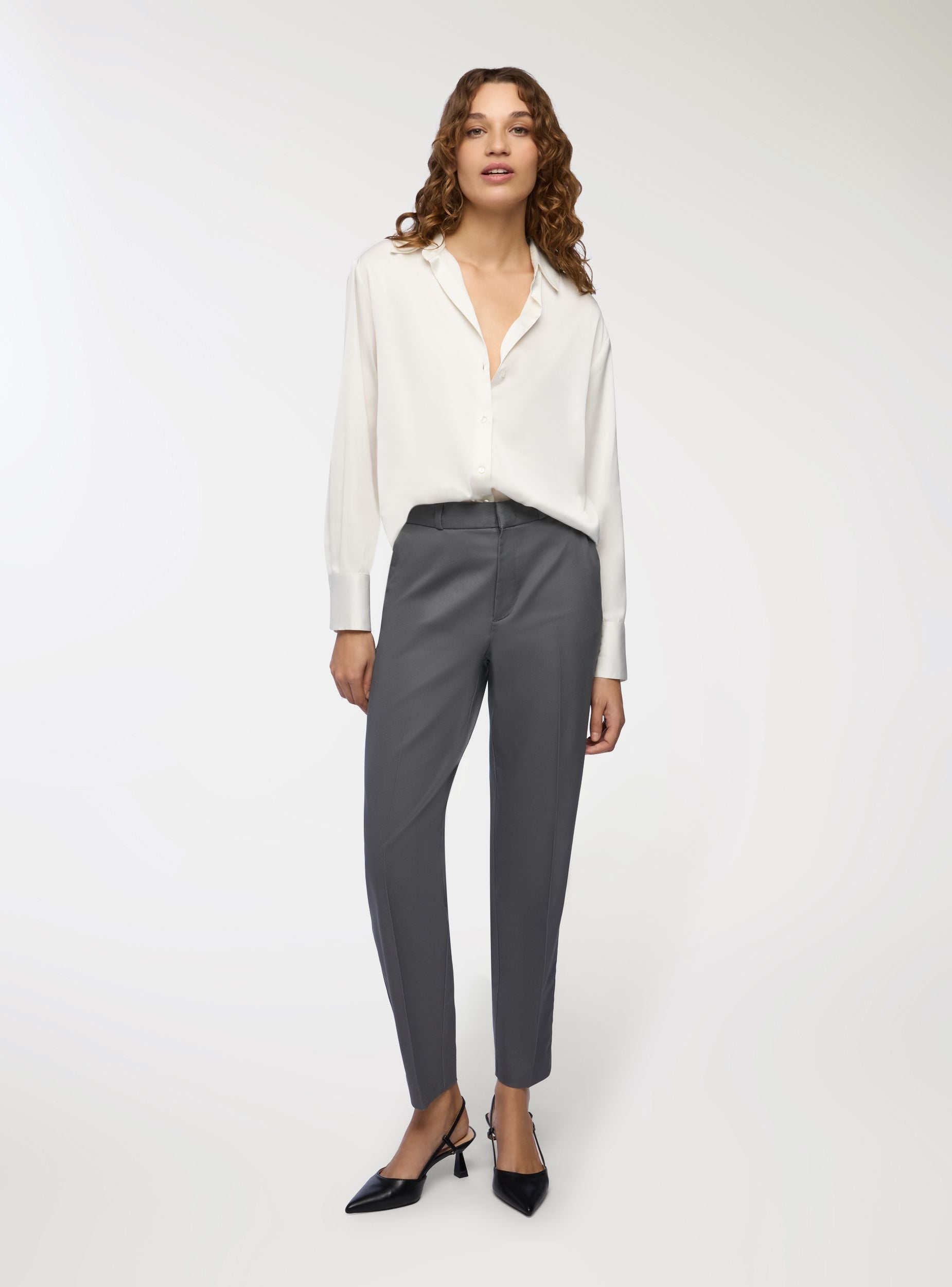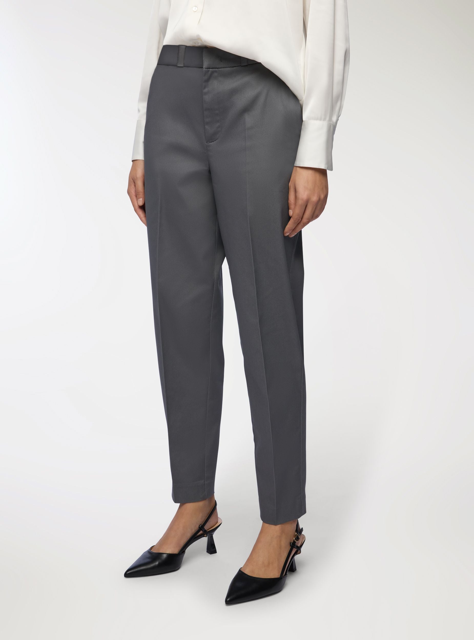 Pantaloni lunghi da donna, modello chino, con vestibilità regolare, ideali per un look formale o casual. Dotati di chiusura con bottone, zip e gancio, presentano tasche laterali e passanti per cintura. Il design a sigaretta valorizza la silhouette, rendendoli perfetti per essere abbinati a camicie o bluse per un outfit da ufficio o occasioni eleganti. La loro versatilità li rende un capo indispensabile nel guardaroba.