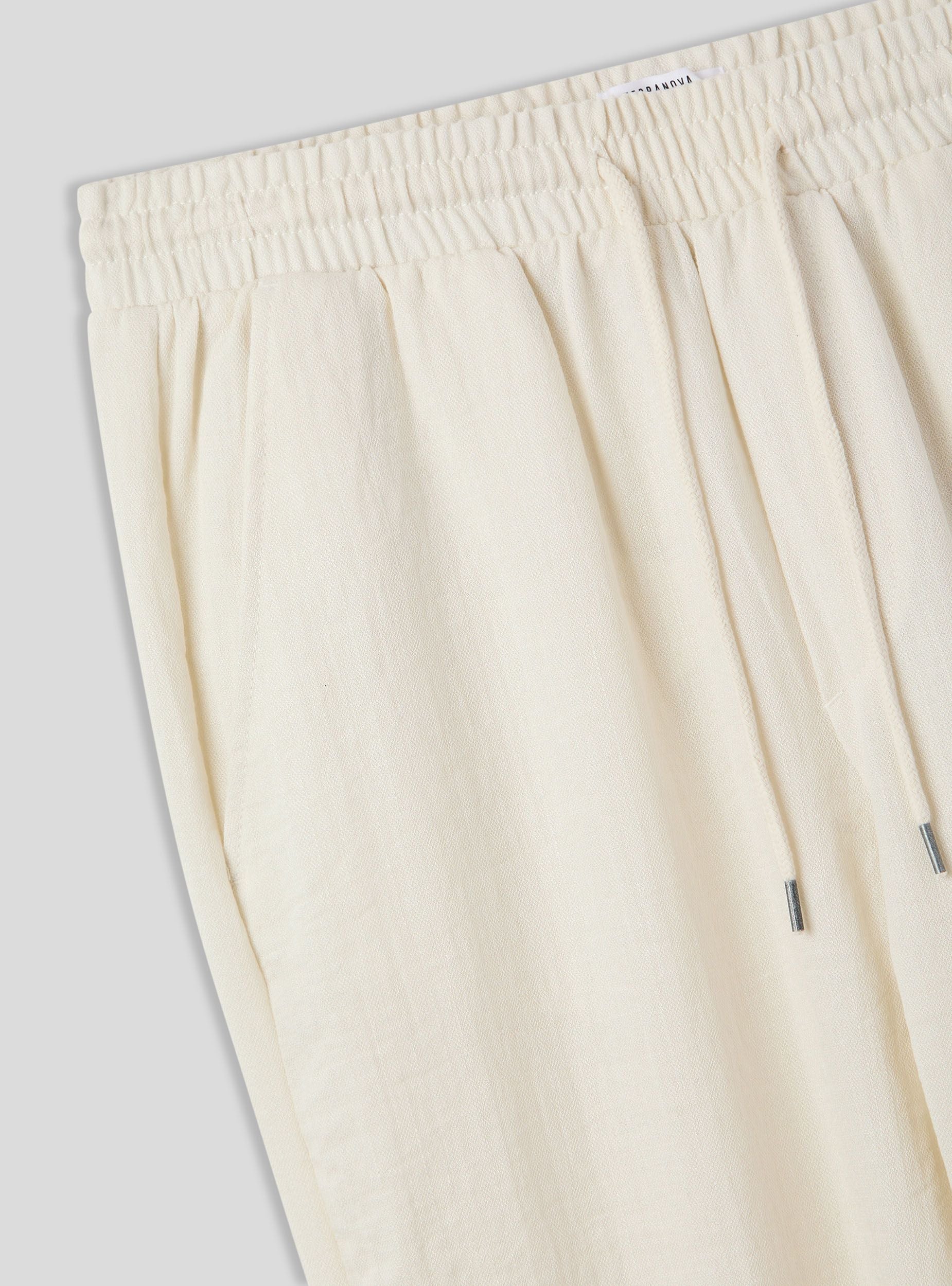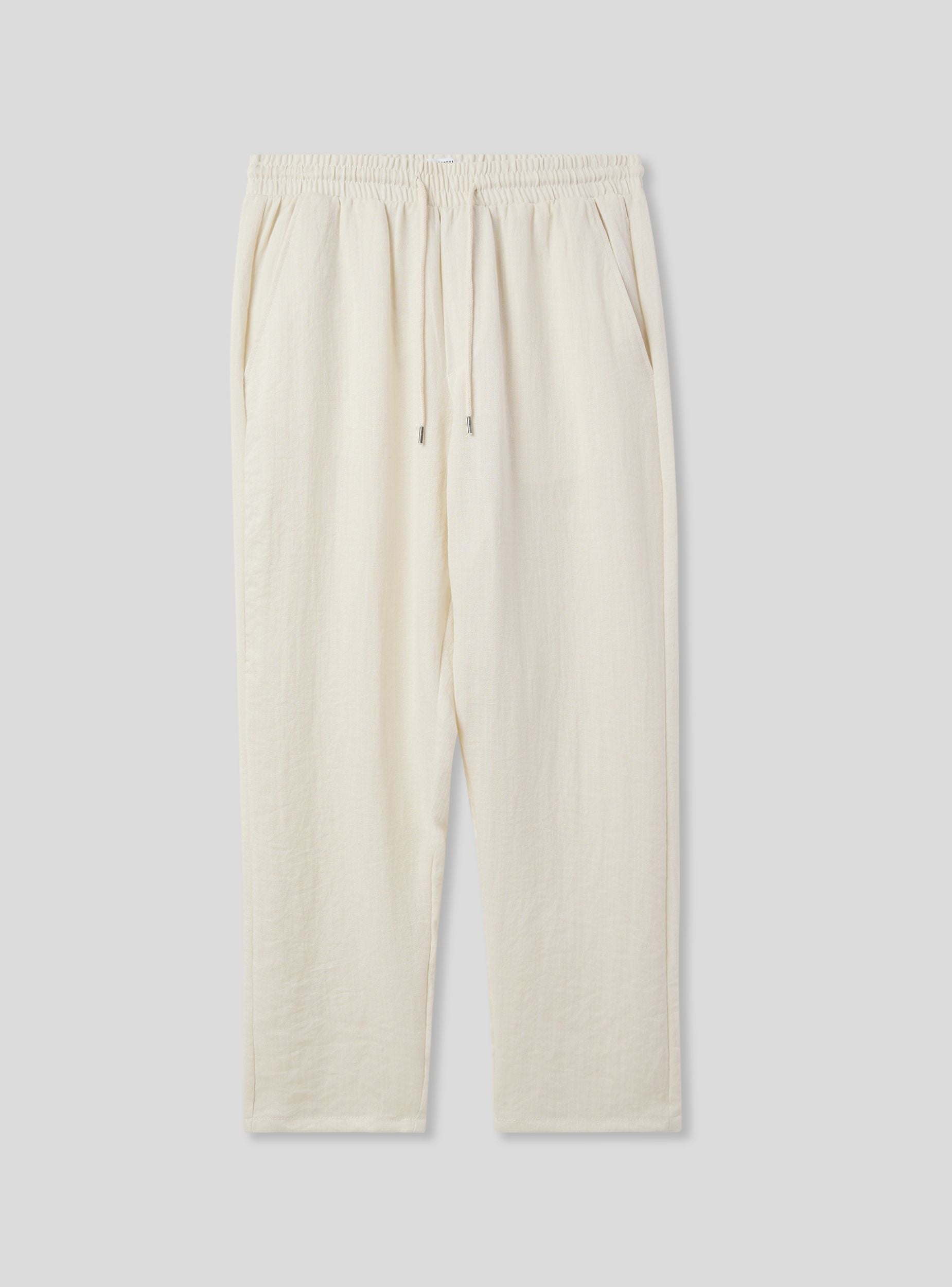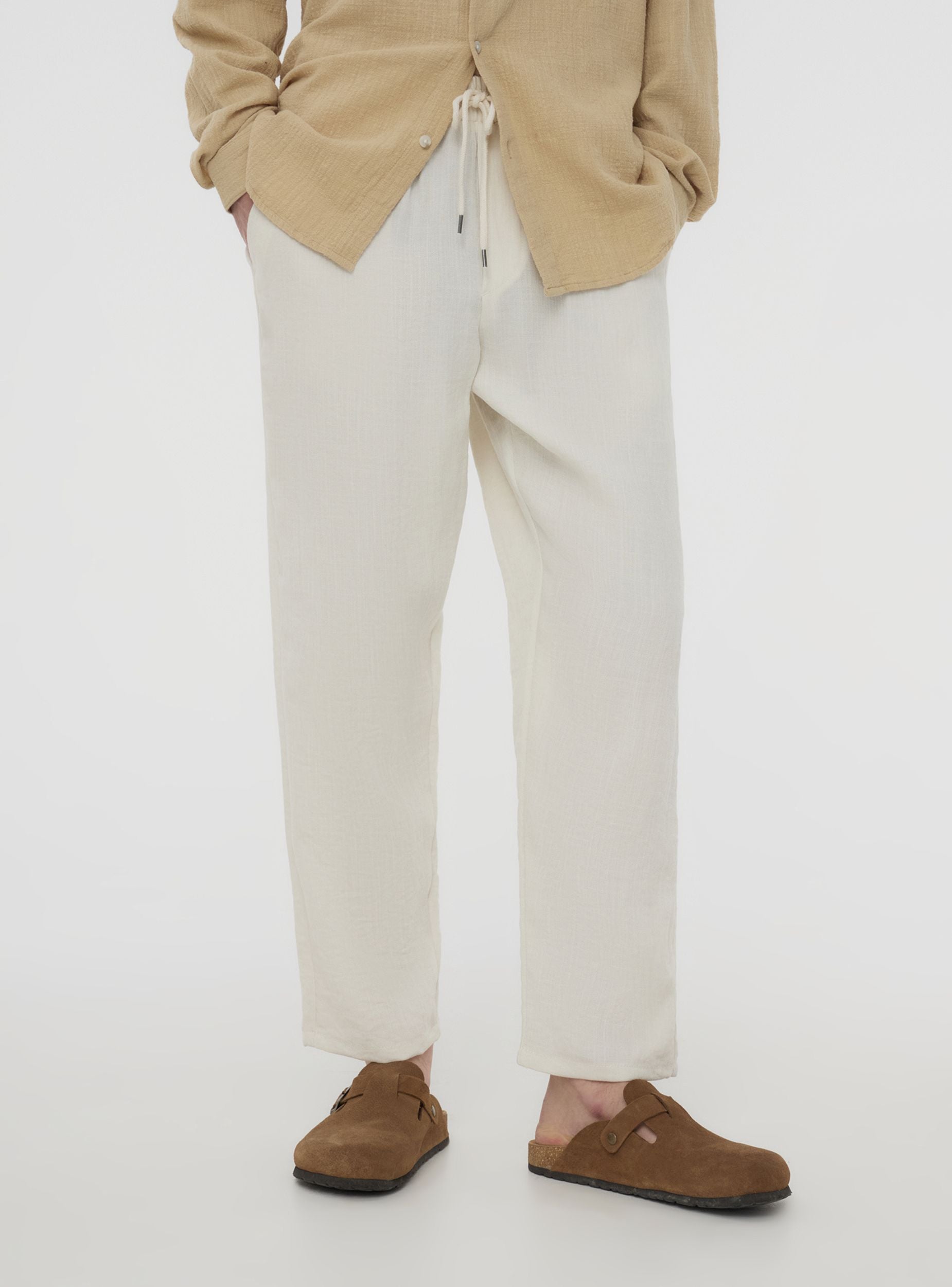 Pantaloni da uomo dallo stile rilassato e raffinato, perfetti per un look casual ma curato. Il tessuto goffrato dona un tocco distintivo, mentre la vestibilità è resa confortevole dalla vita elastica regolabile con coulisse. Le tasche laterali aggiungono praticità, rendendoli ideali per il tempo libero o le giornate più calde. Perfetti da abbinare a camicie leggere e sandali per un outfit estivo, o con sneakers e t-shirt per un look informale.