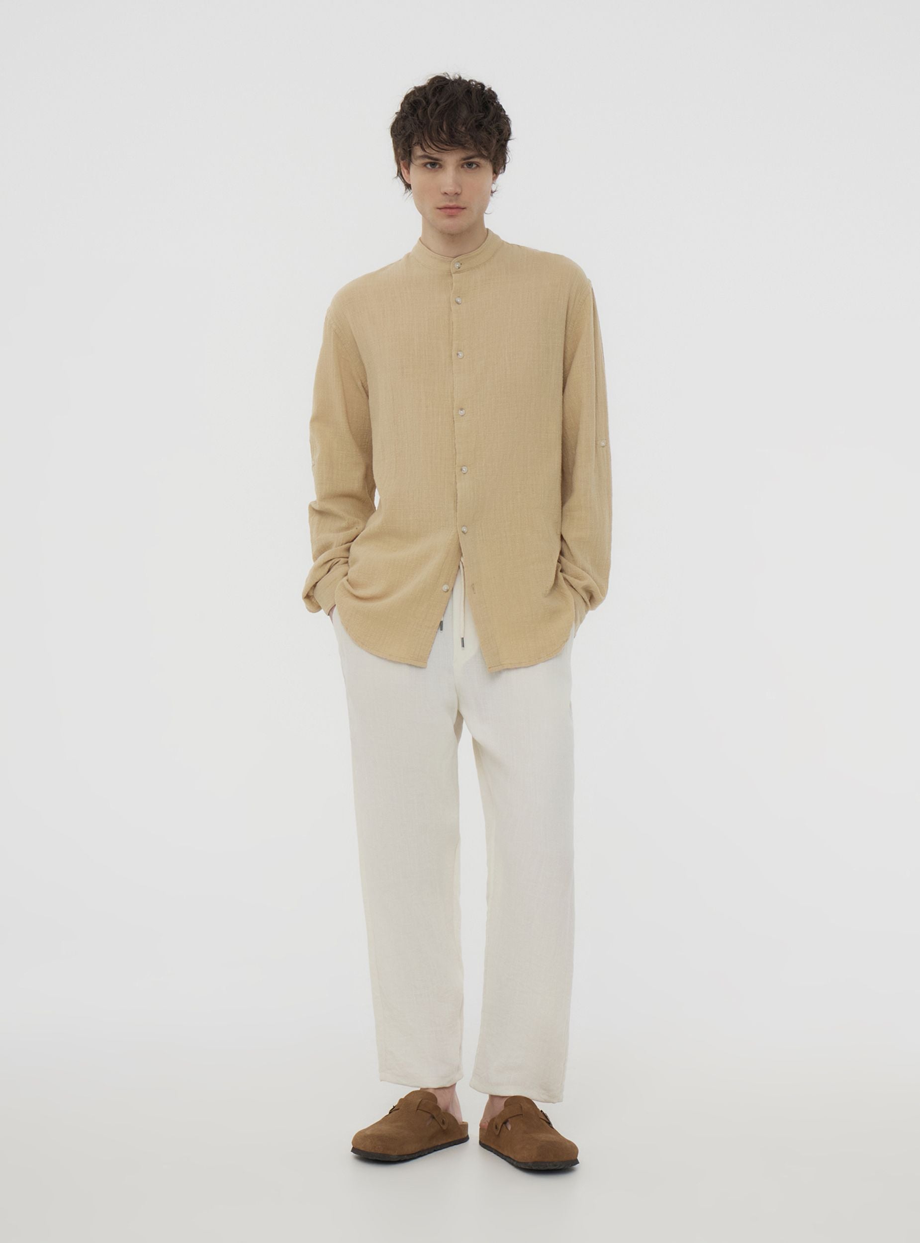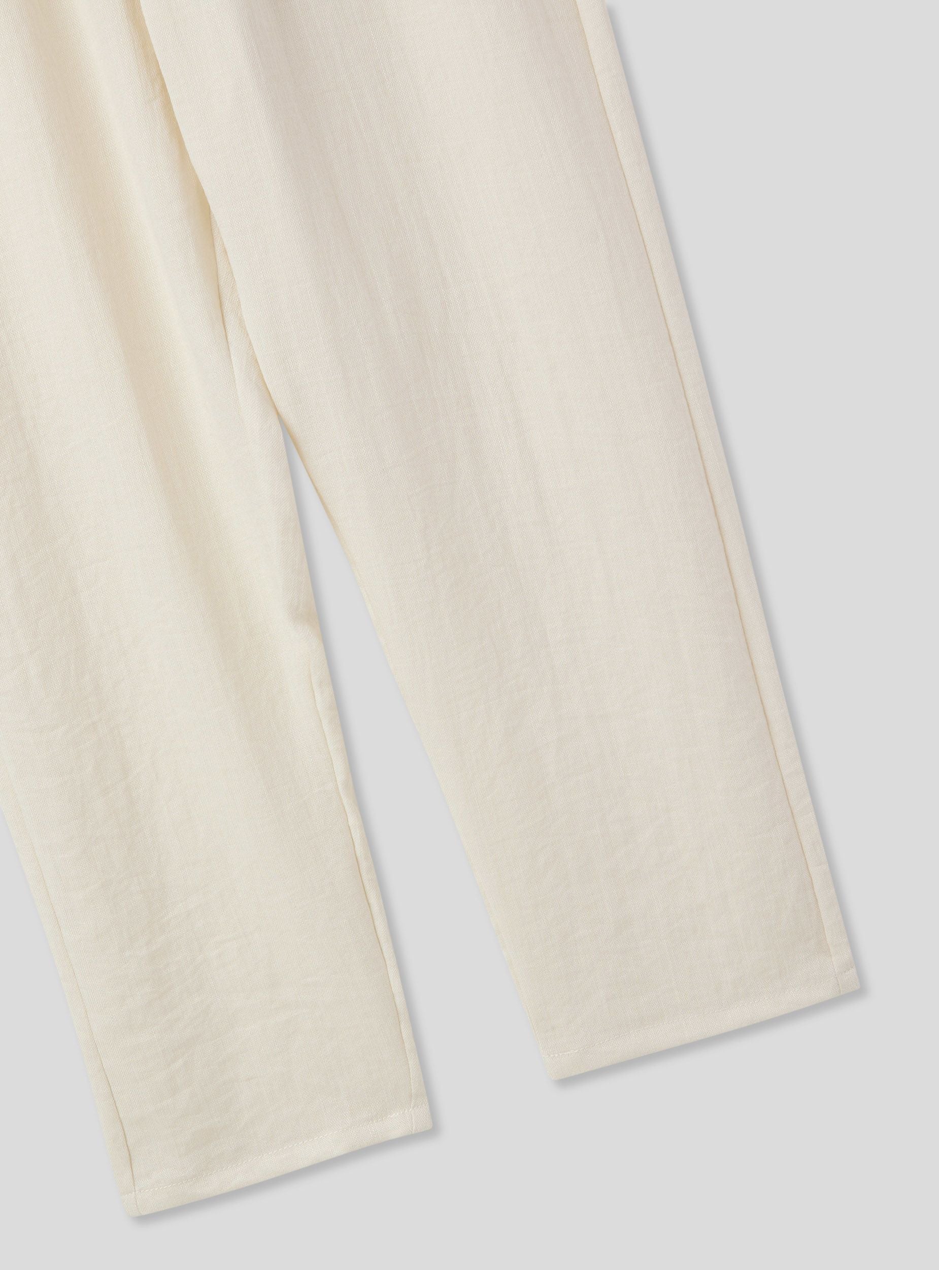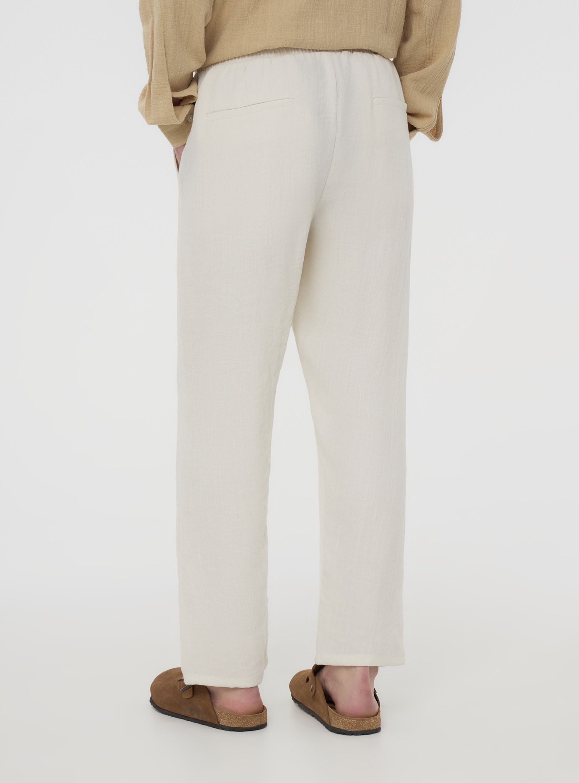 Pantaloni da uomo dallo stile rilassato e raffinato, perfetti per un look casual ma curato. Il tessuto goffrato dona un tocco distintivo, mentre la vestibilità è resa confortevole dalla vita elastica regolabile con coulisse. Le tasche laterali aggiungono praticità, rendendoli ideali per il tempo libero o le giornate più calde. Perfetti da abbinare a camicie leggere e sandali per un outfit estivo, o con sneakers e t-shirt per un look informale.