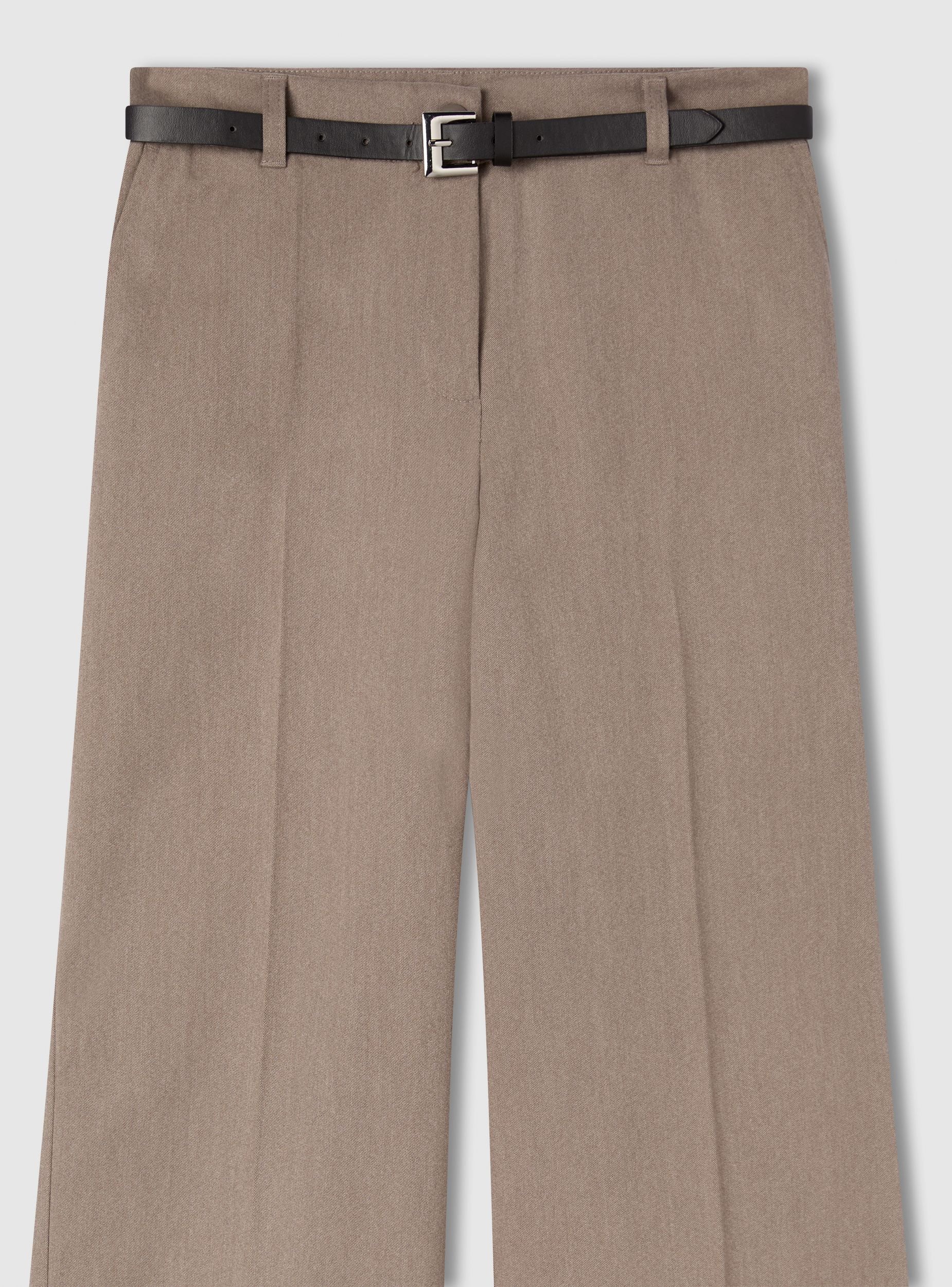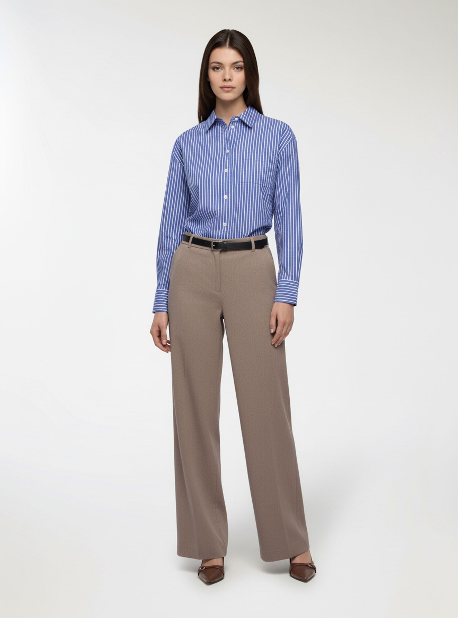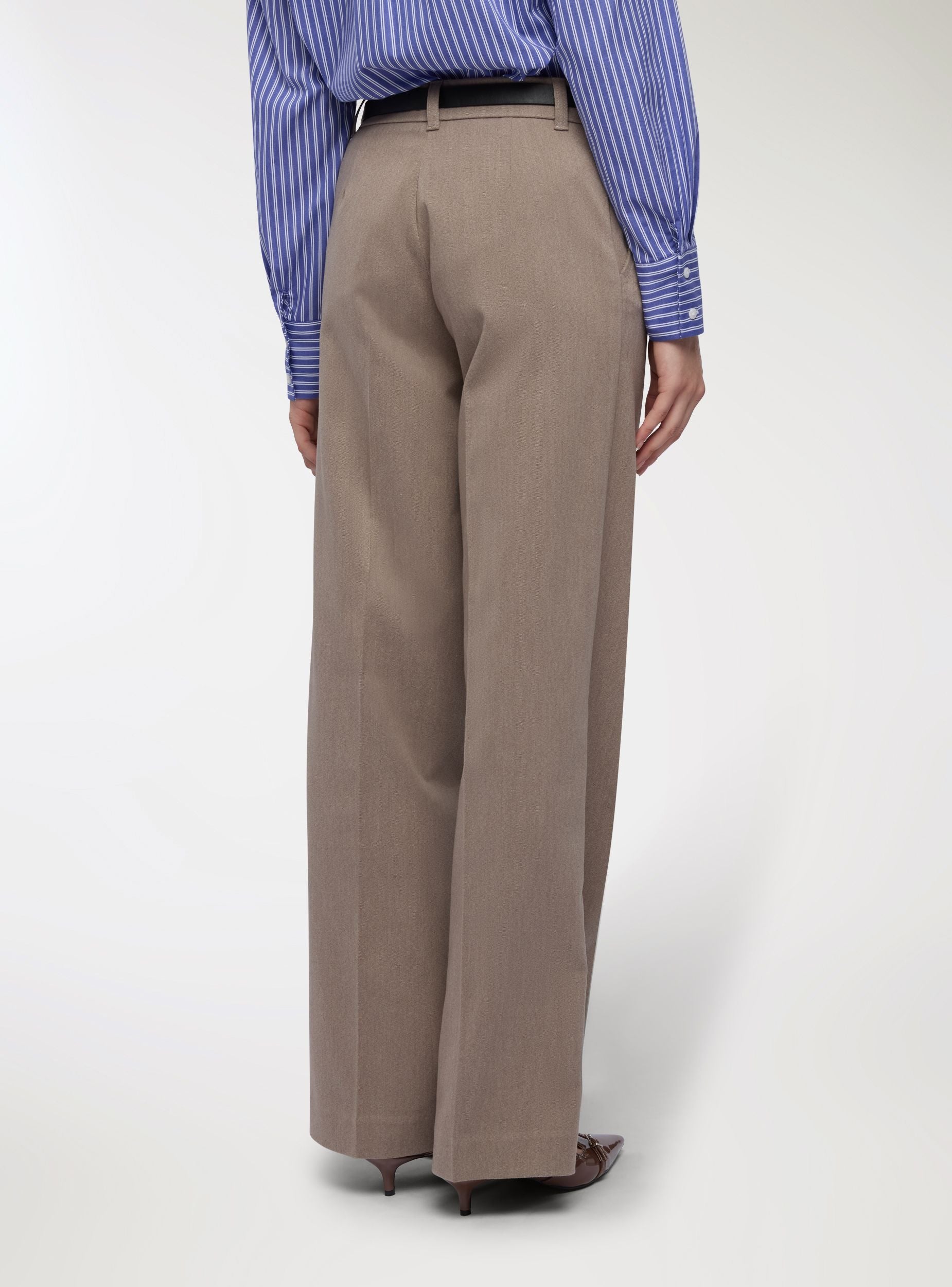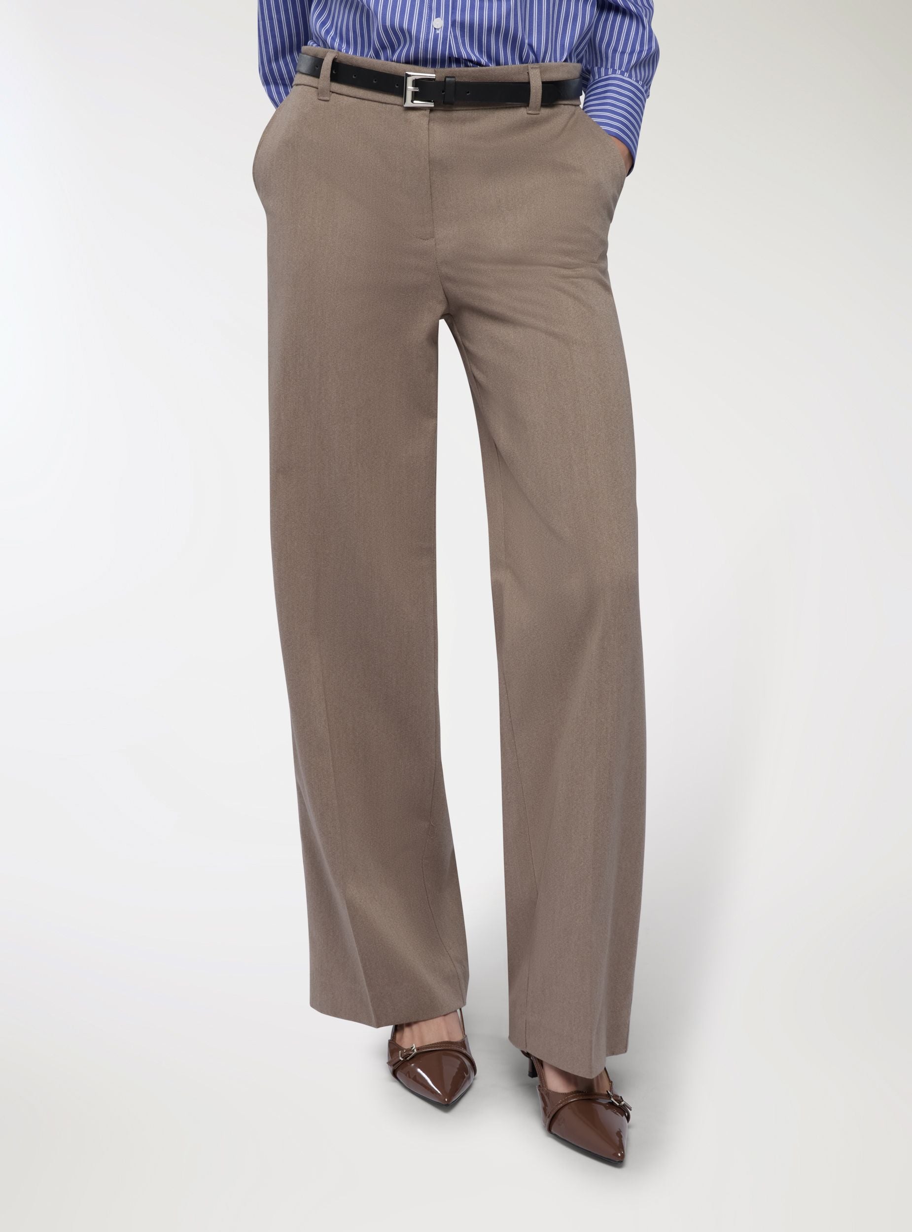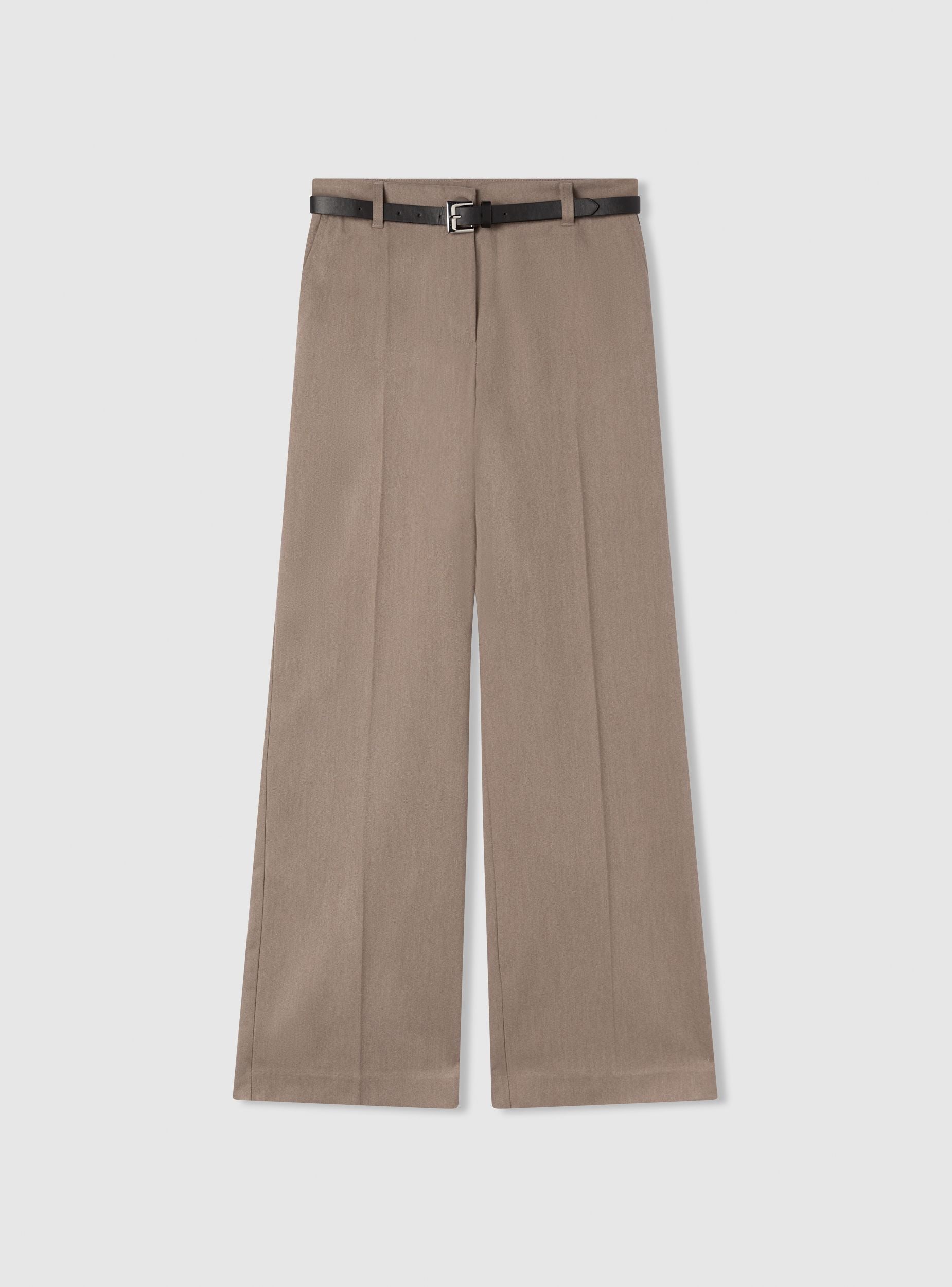 Tessuto caldo. Pantaloni da donna a tinta unita con linea wide leg e vita confortevole, ideali per look da ufficio o tempo libero. Presentano passanti e cintura abbinata con fibbia, chiusura con cerniera e bottone, tasche laterali a filetto. Vestibilità regolare che valorizza il punto vita. Facili da combinare con camicie, blazer o maglioncini per outfit versatili e curati.