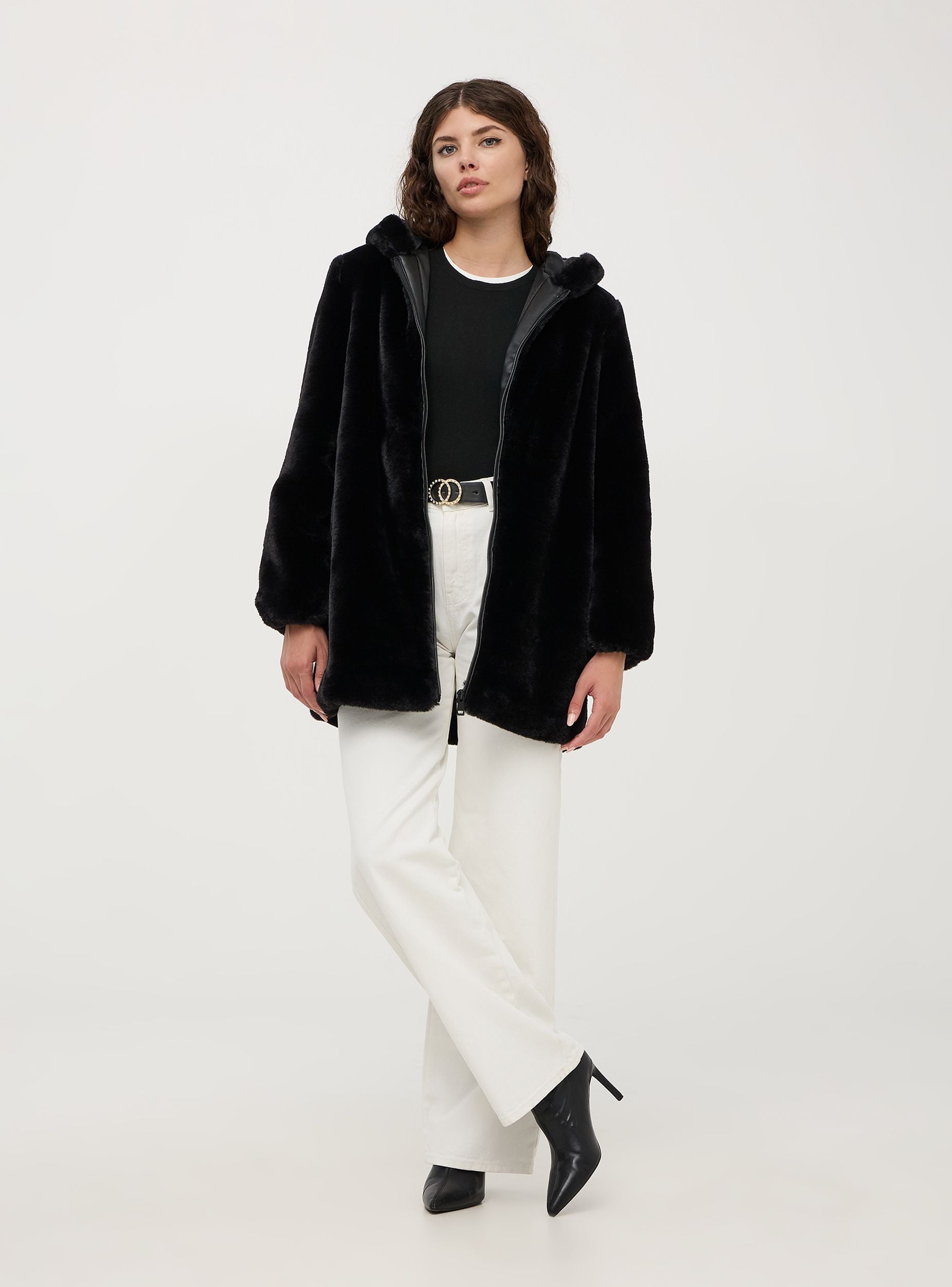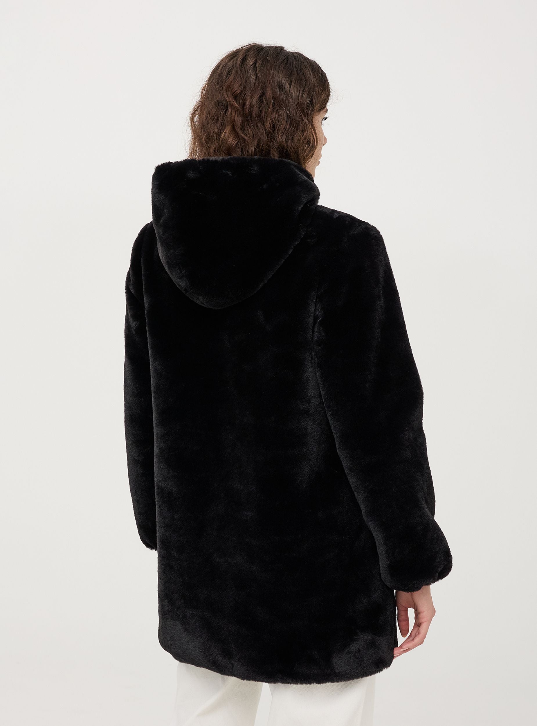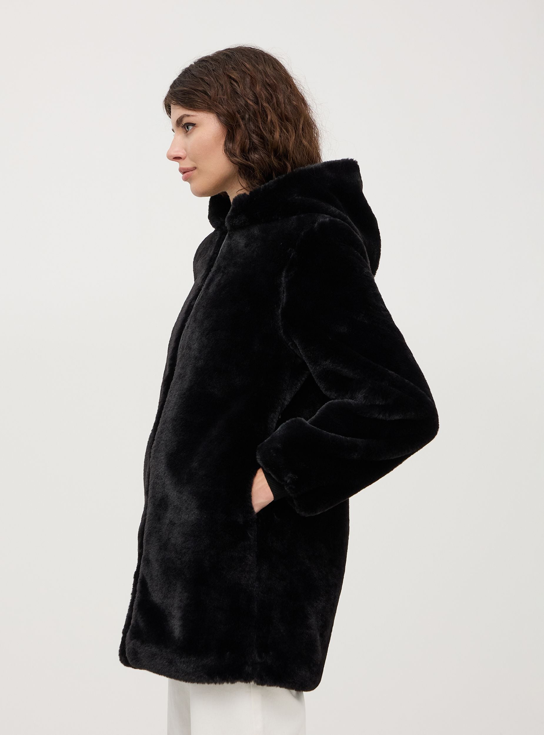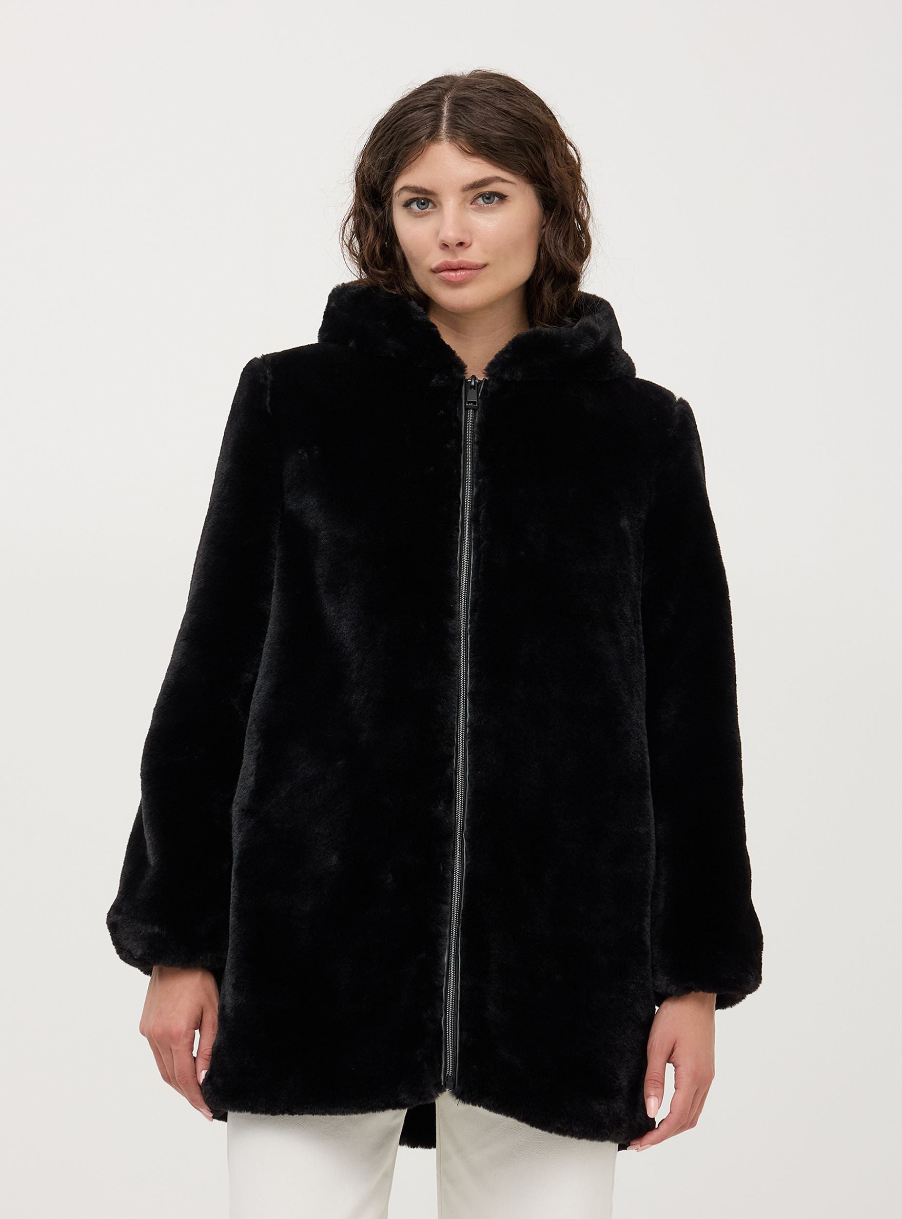 Giubbotto da donna in pelliccia sintetica, modello con cappuccio, tasche laterali, bordo manica con elastico e chiusura frontale con zip tono su tono. Lunghezza media. Vestibilità regular. Realizzata in materiali sintetici di alta qualità, questa pelliccia imita perfettamente l'aspetto e la sensazione al tatto della pelliccia naturale, garantendo al contempo una scelta etica e più sostenibile.