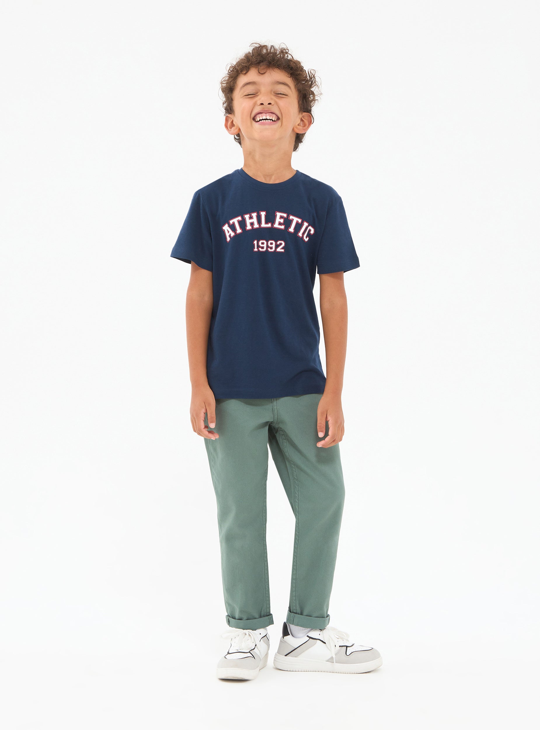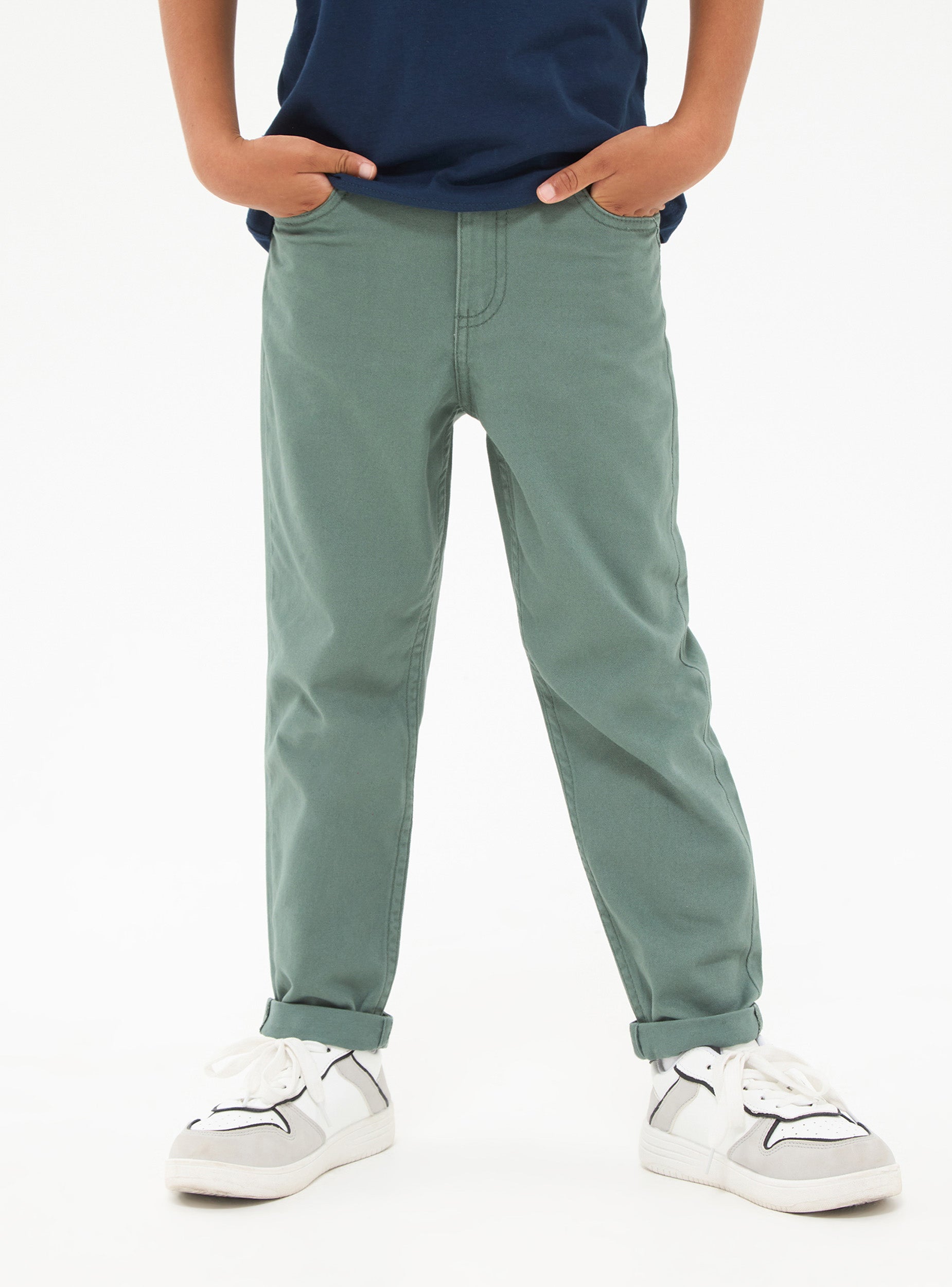 Pantaloni da bambino in cottone elasticizzato tinta unita, vestibilita skinny.Dettagli