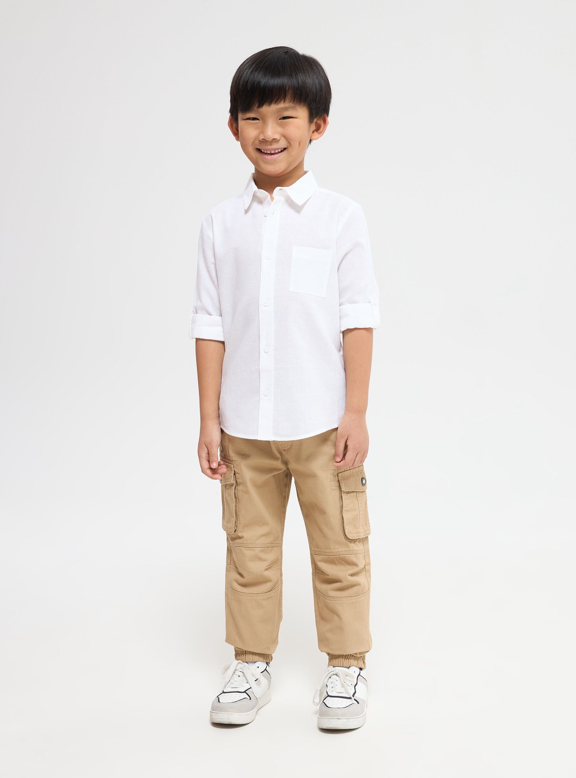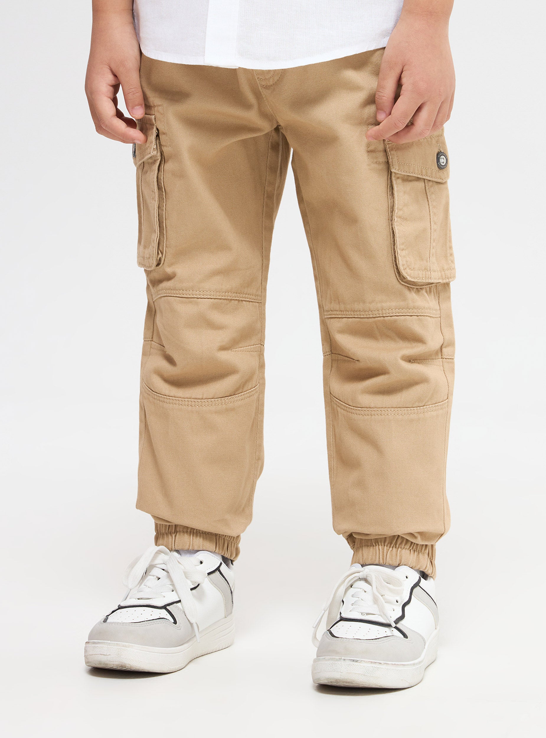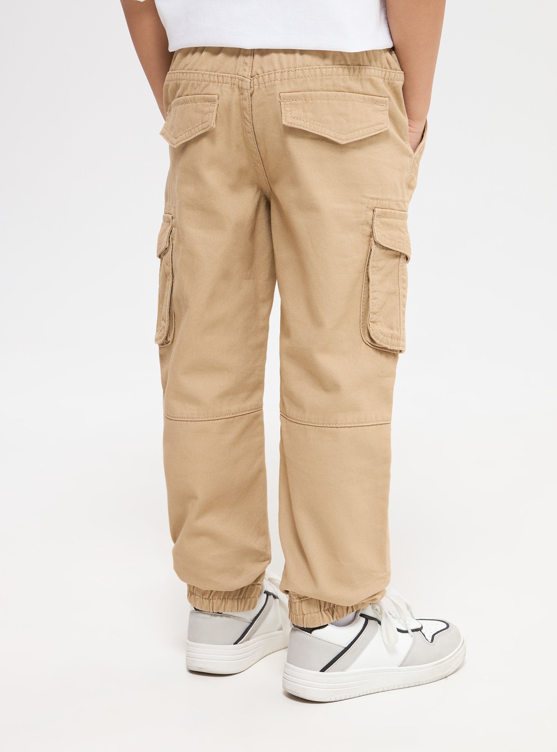 Pantaloni lunghi da bambino modello cargo. Elastico e coulisse in vita, fondo con polsino. Tasconi applicati, tessuto cotone tinta unita.Dettagli